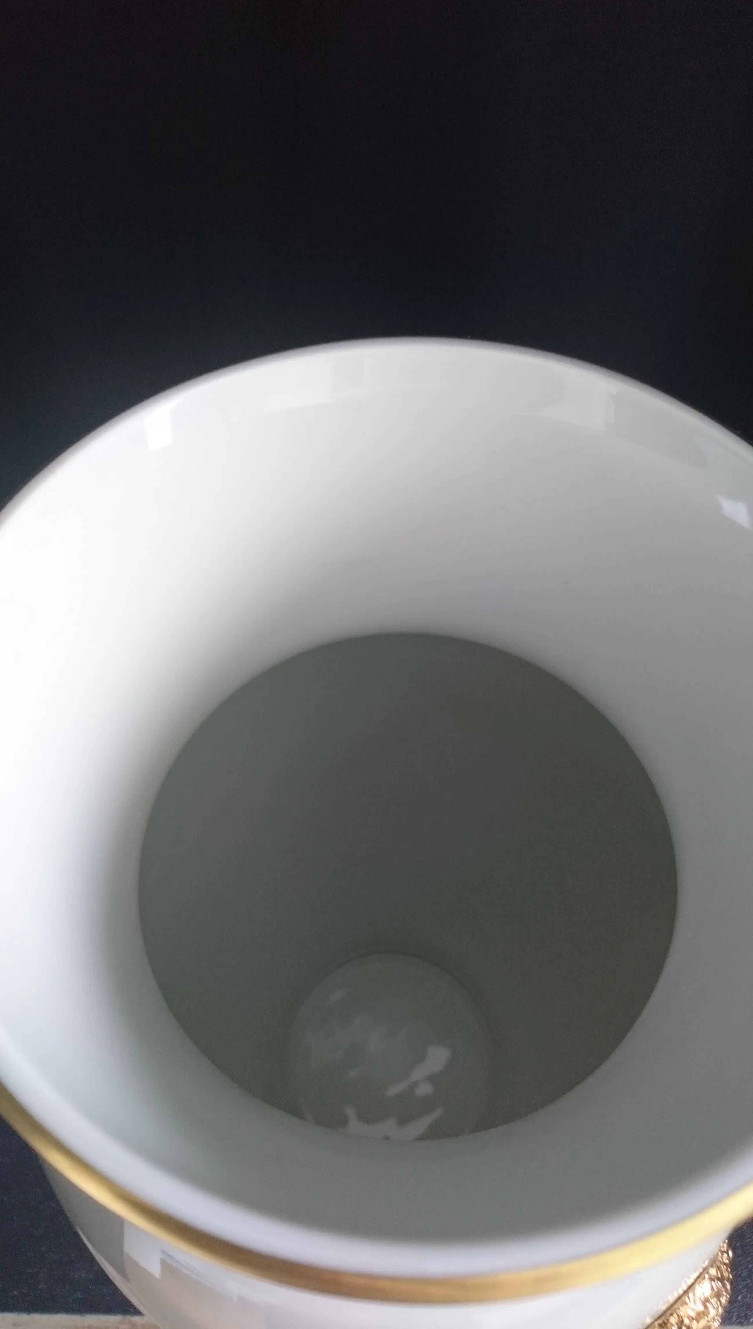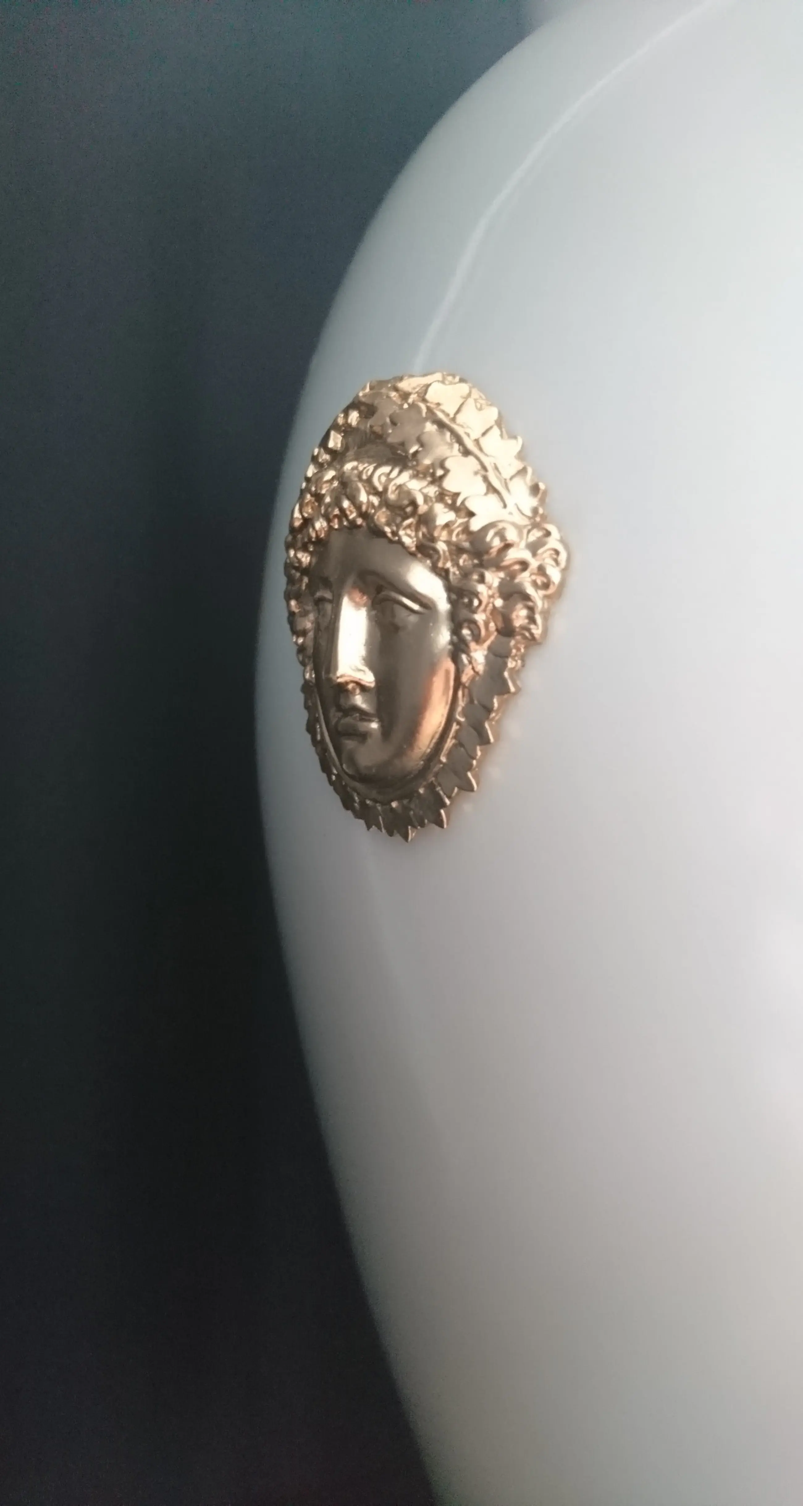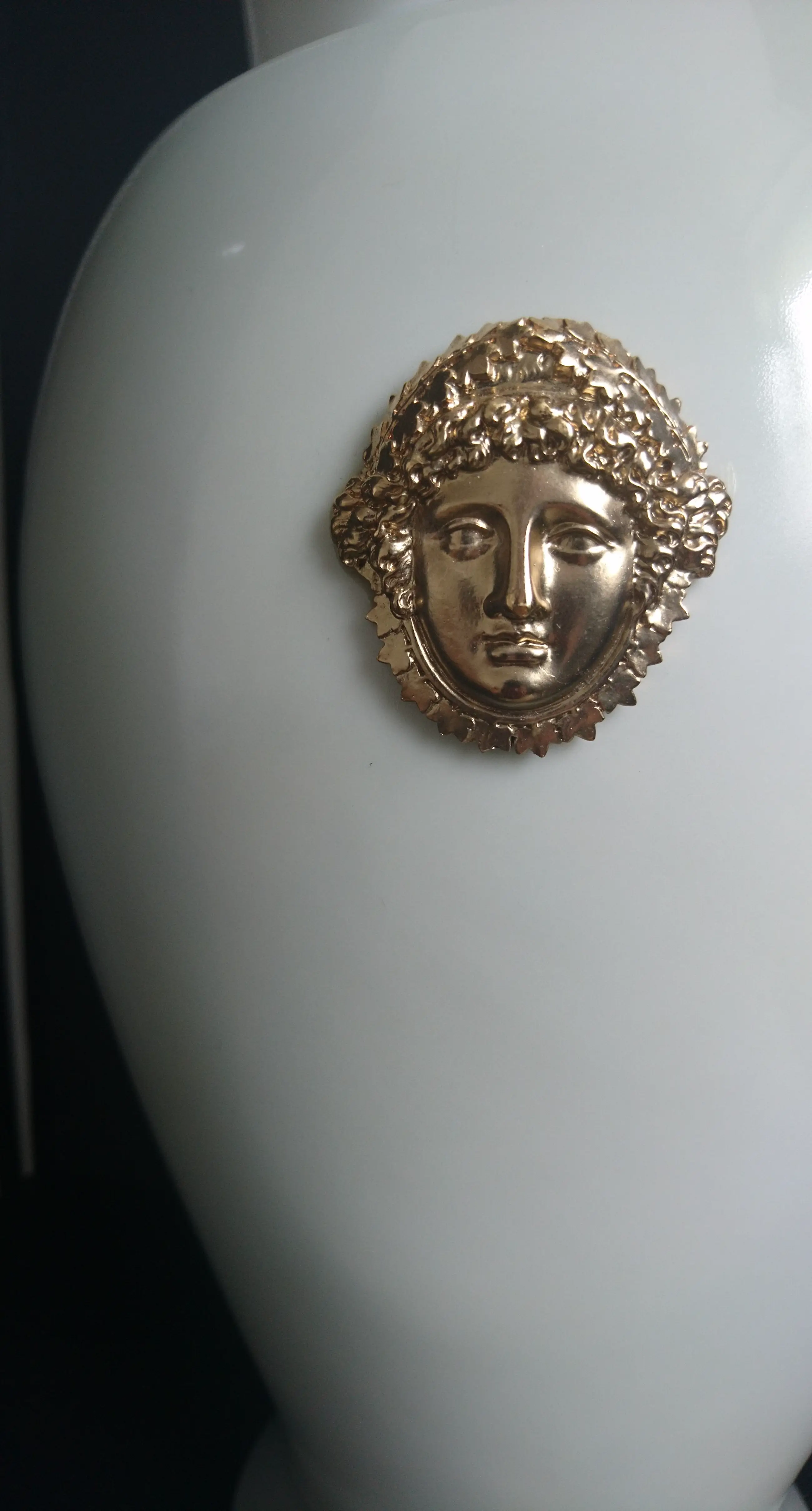 Grote Tharaud/UnionLimousine (porcelain de Limoges France) porseleinen sier/bloemenvaas uit de jaren '90/'00. Versierd met drie vergulde mythologische mascarons rondom de vaas. In zeer goede staat. Geen breuk, chips of krassen.