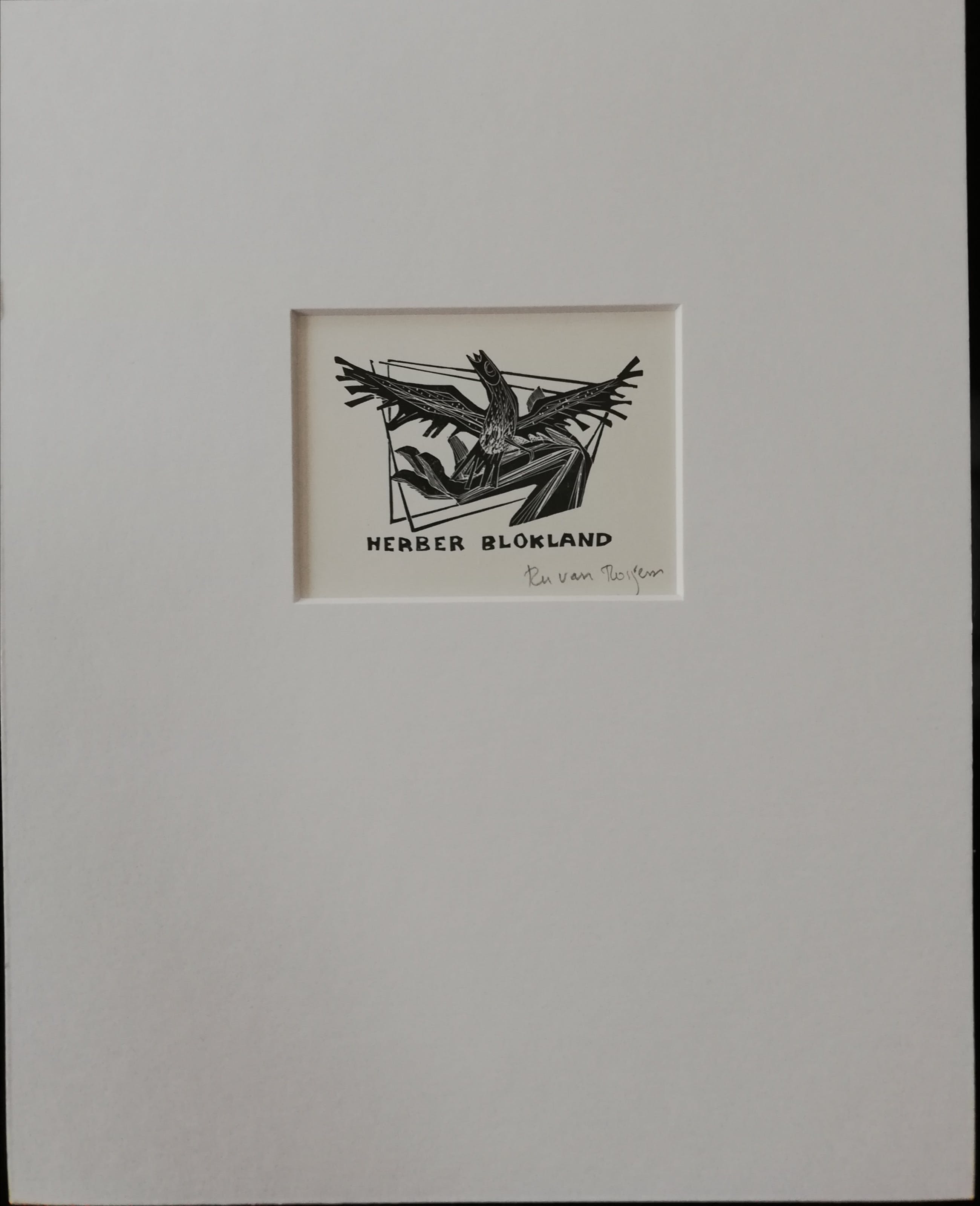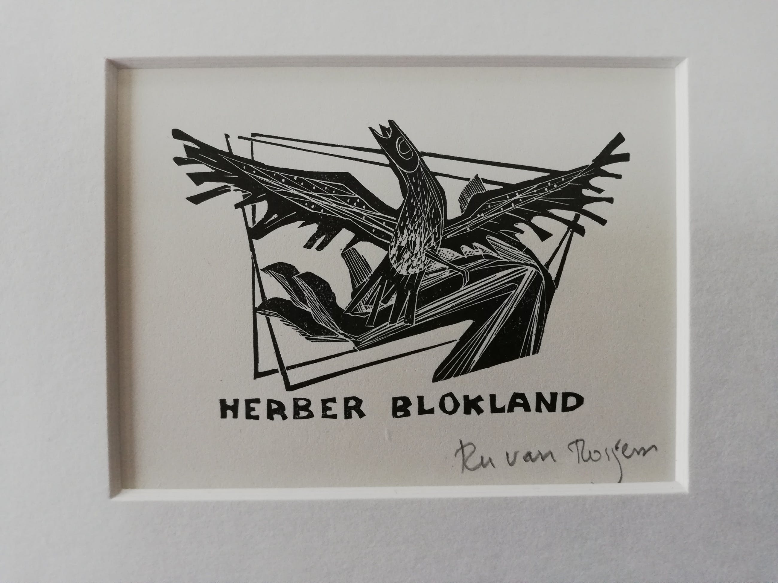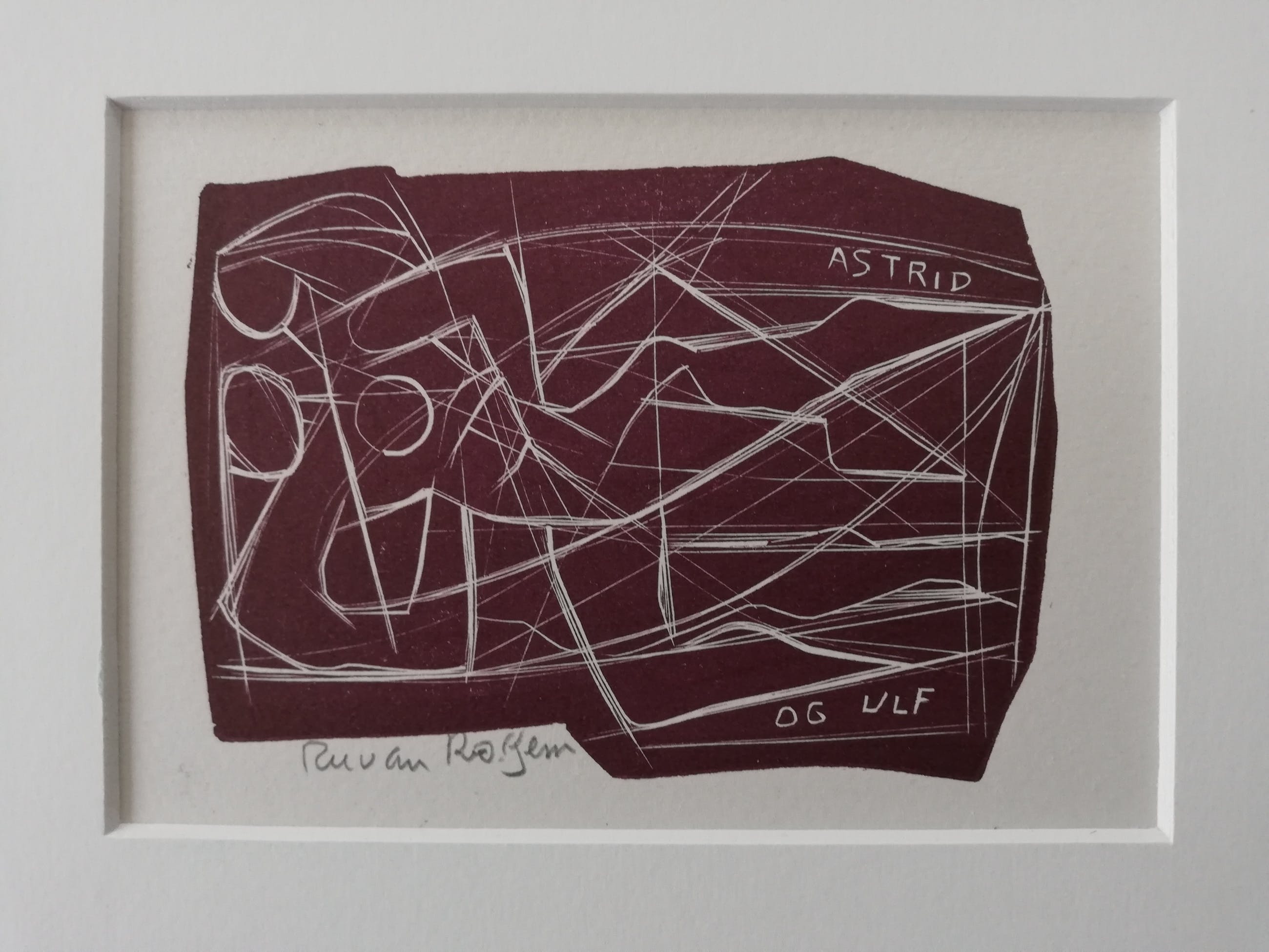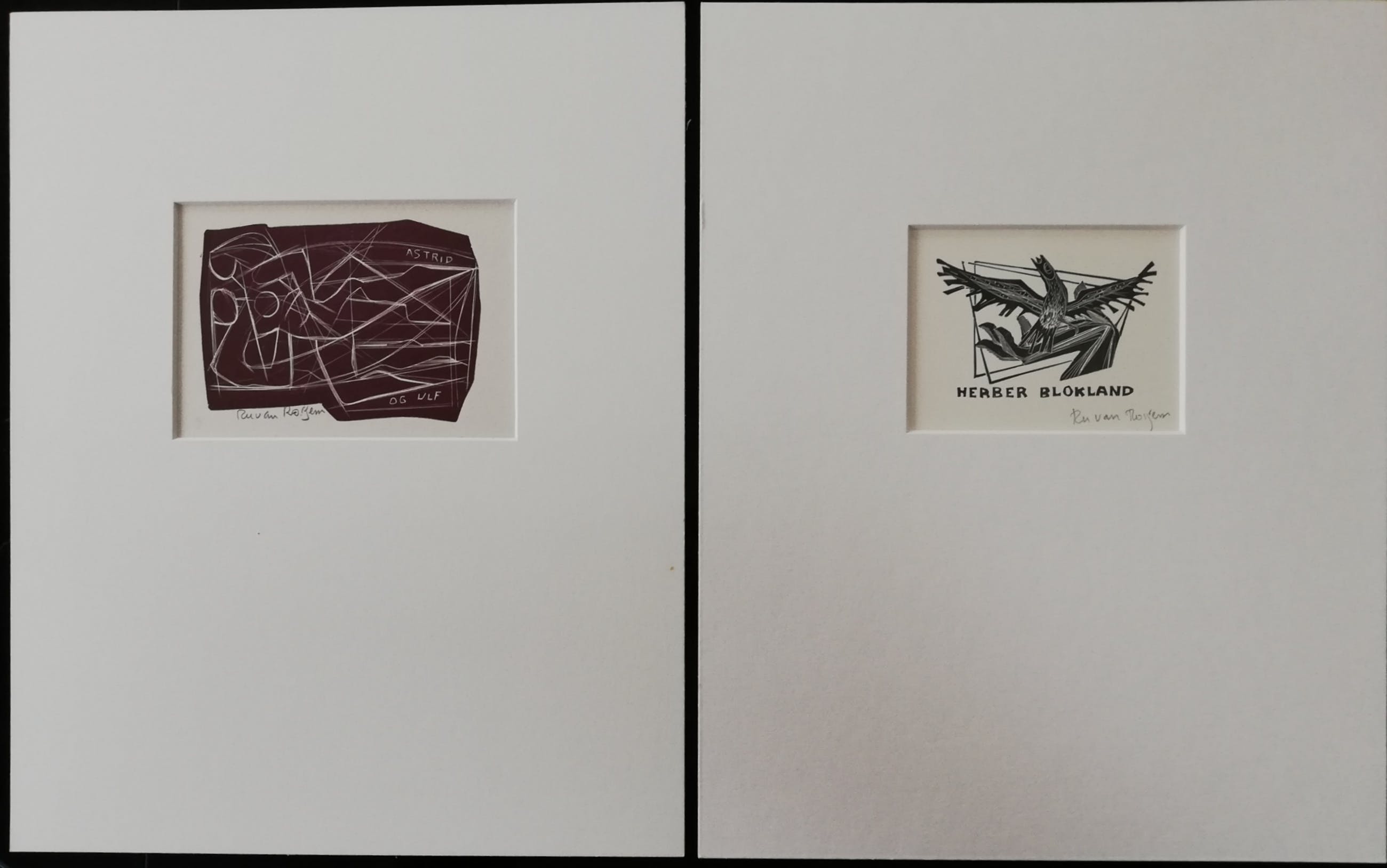 2 gravures van Ru van Rossem uit 1958, in zeer goede staat en netjes achter passepartout. Betreft 2 exlibrissen. Handgesigneerd in potlood.