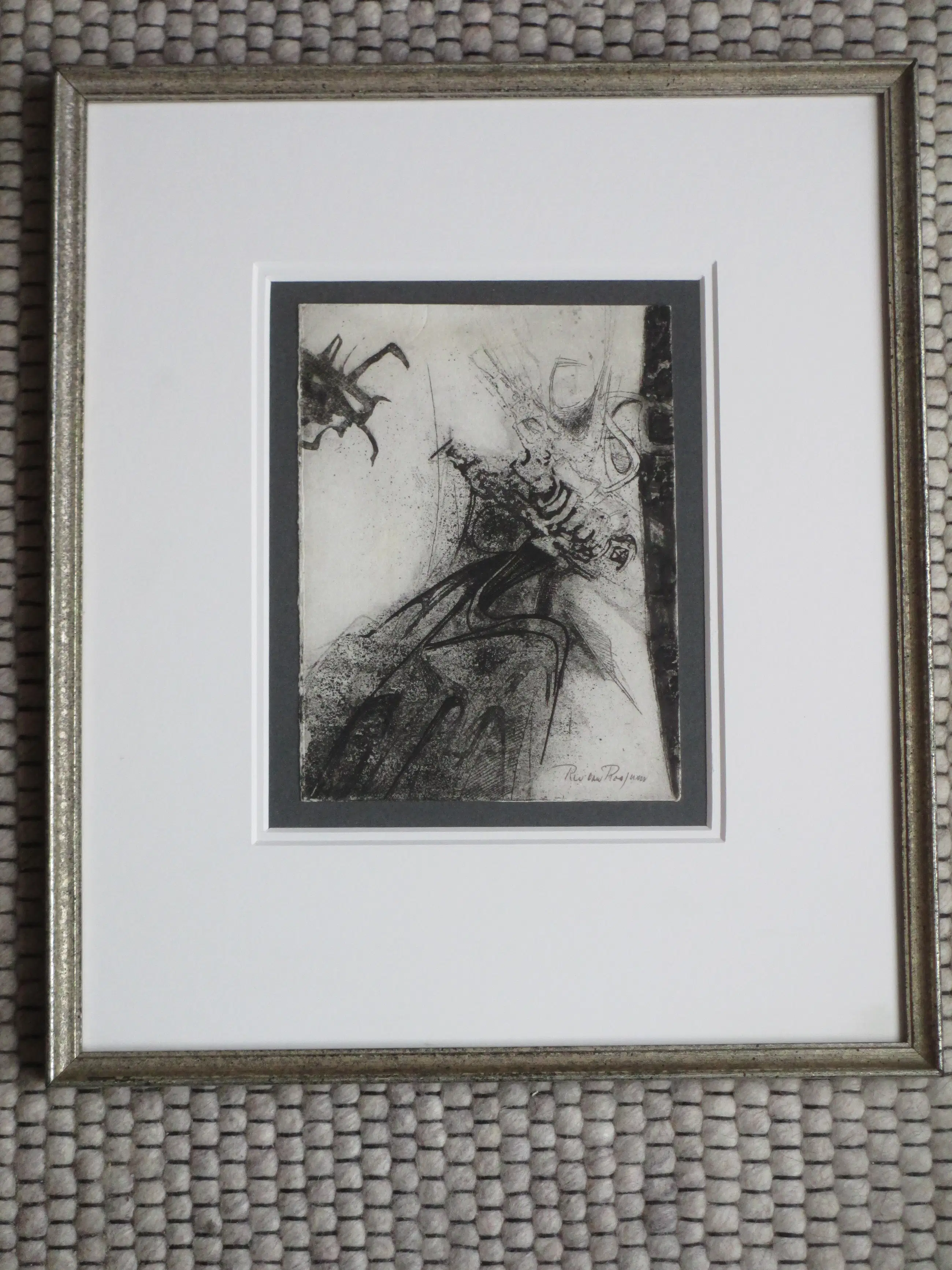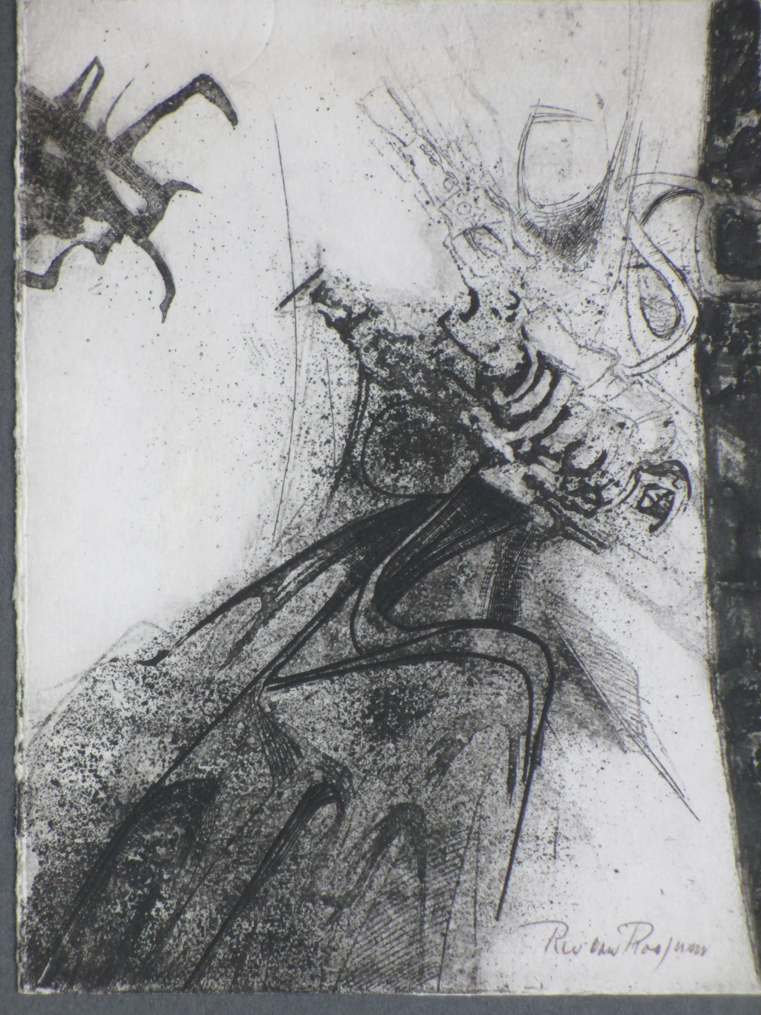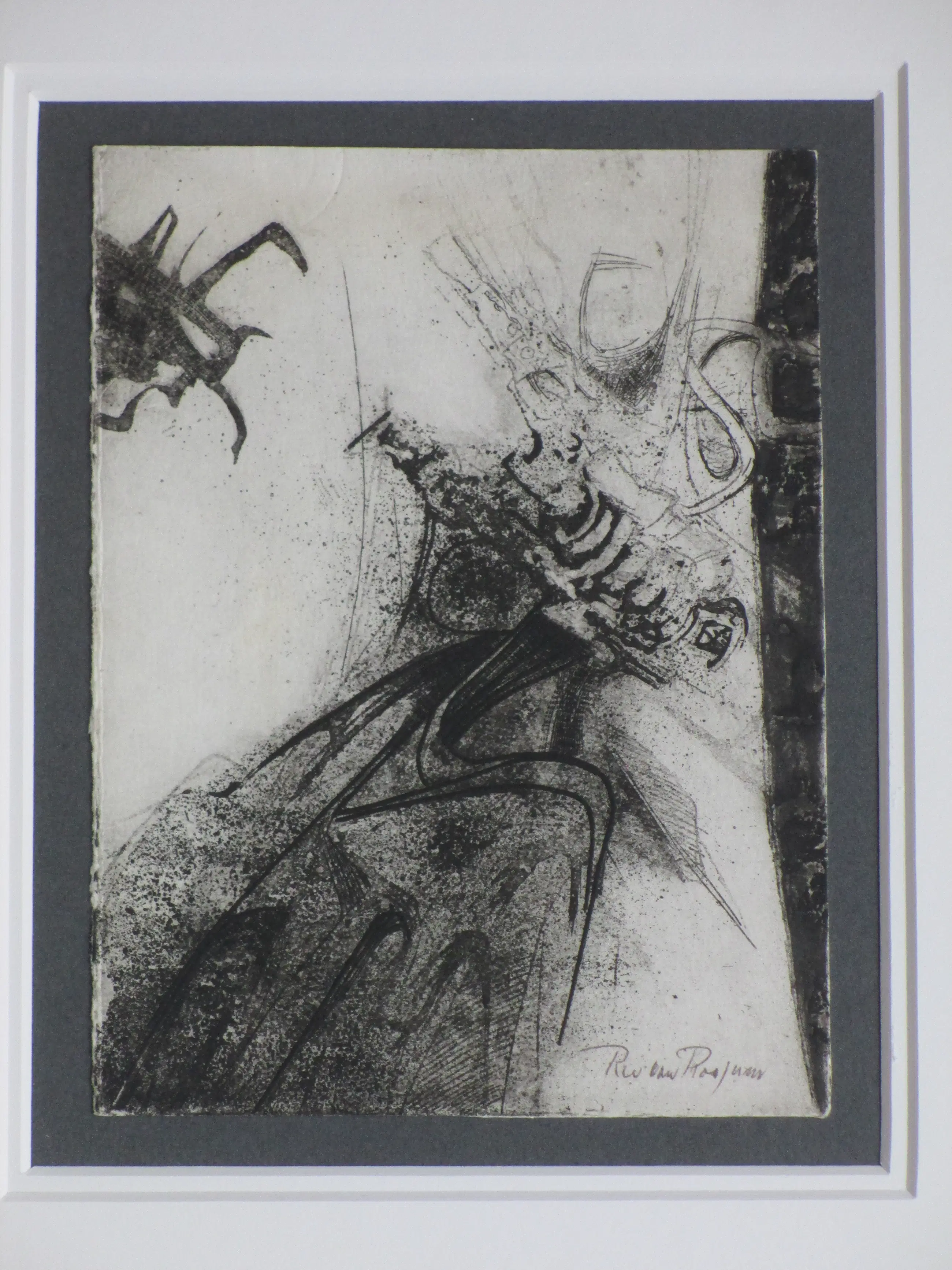 Ets door Ru van Rossem Voorstelling van een abstracte compositie Gelijst, beeldmaat 19x14, lijstmaat 38x32 Gesigneerd in potlood r.o.: 'Ru van Rossem'