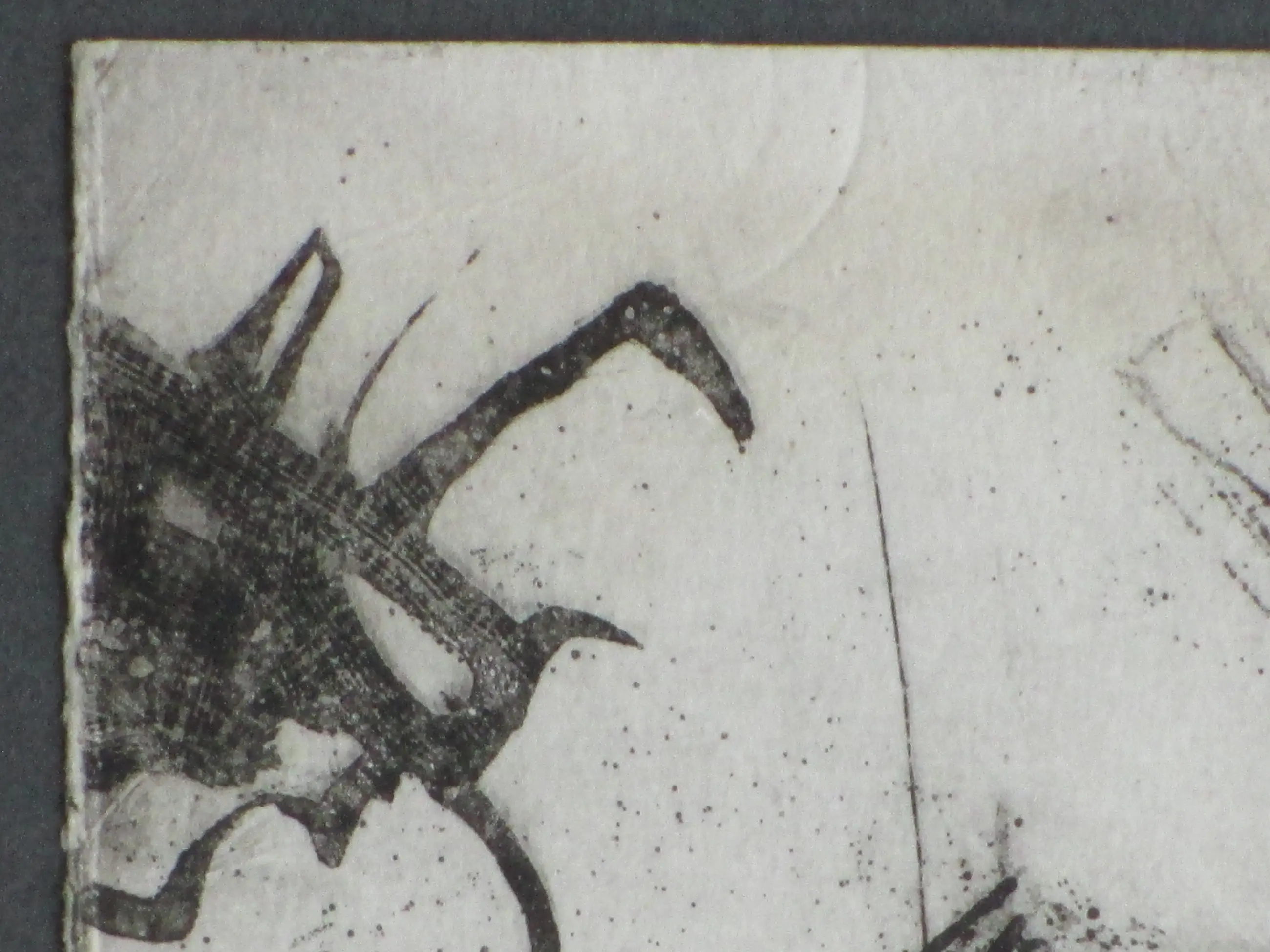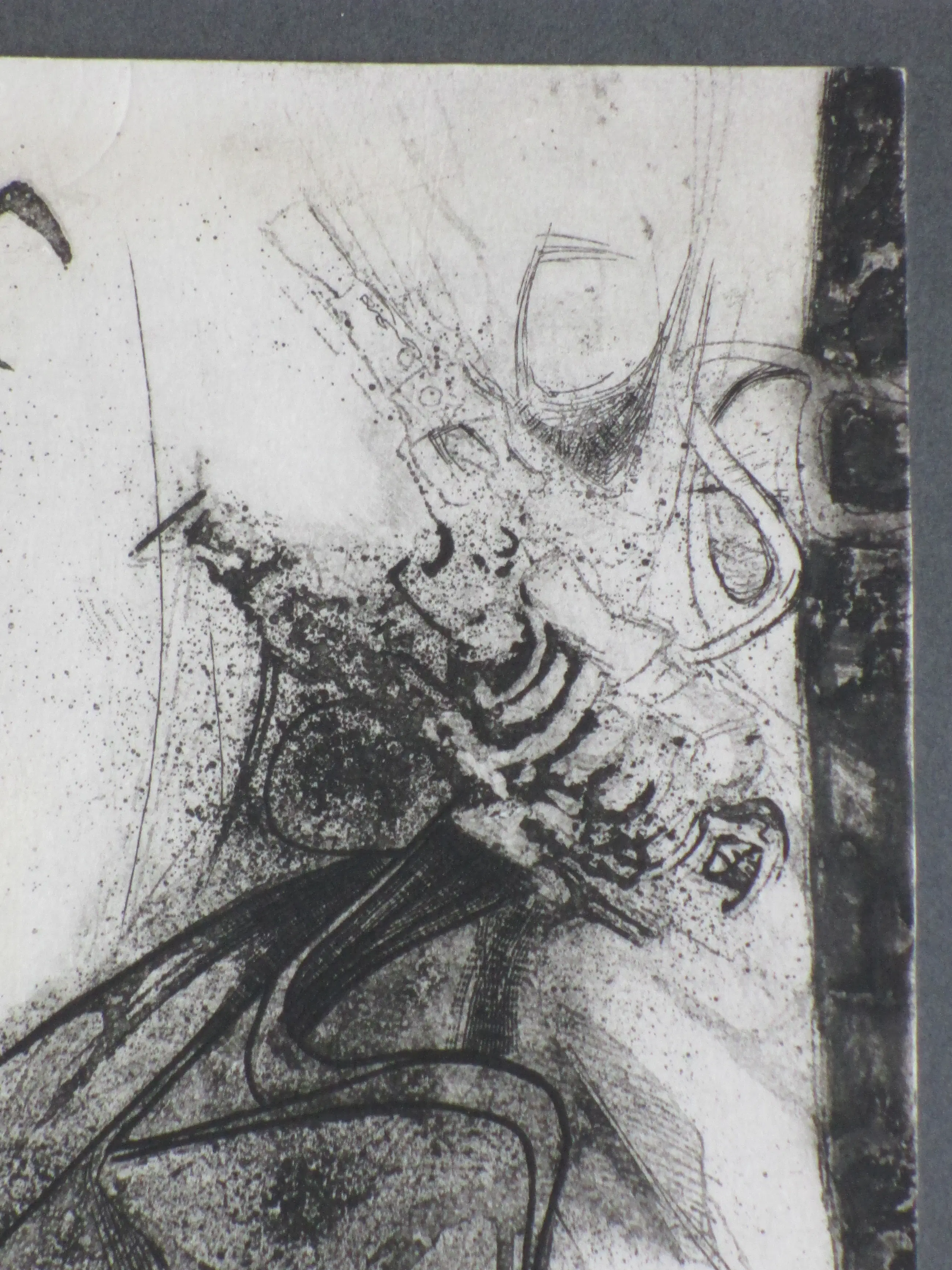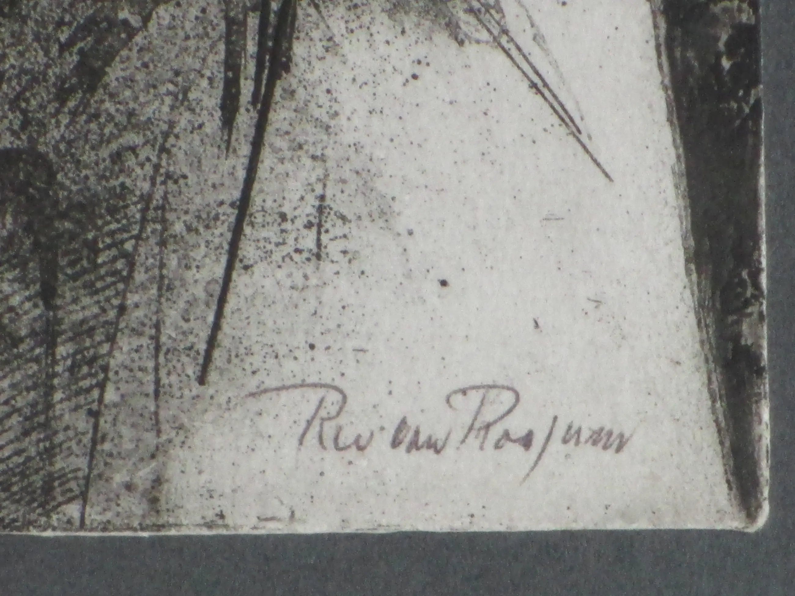 Ets door Ru van Rossem Voorstelling van een abstracte compositie Gelijst, beeldmaat 19x14, lijstmaat 38x32 Gesigneerd in potlood r.o.: 'Ru van Rossem'