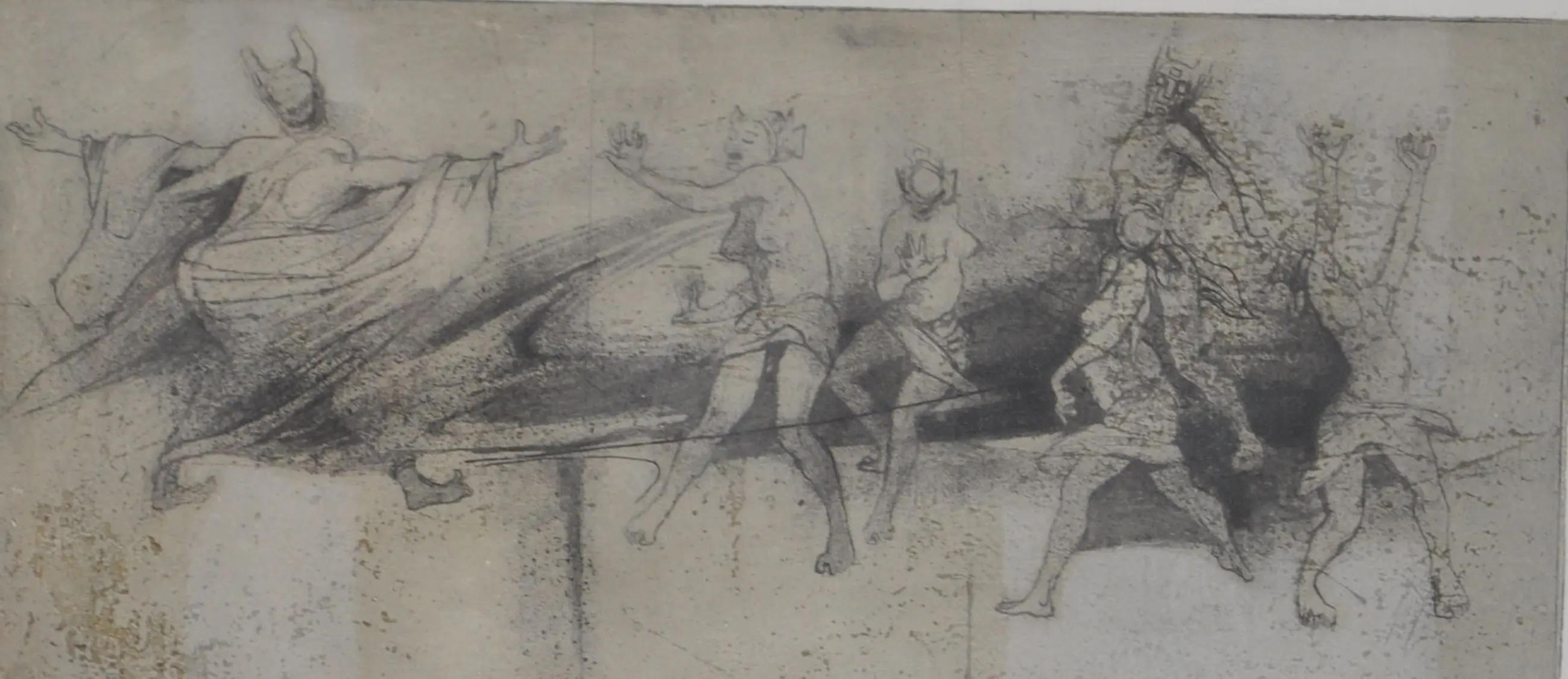 Mooi, karakteristiek werk van Ru van Rossem. Aquatint ets op geschept papier, met potlood gesigneerd, gedateerd (‘77), getiteld en genummerd (3/35). In goede conditie; werk ingelijst.