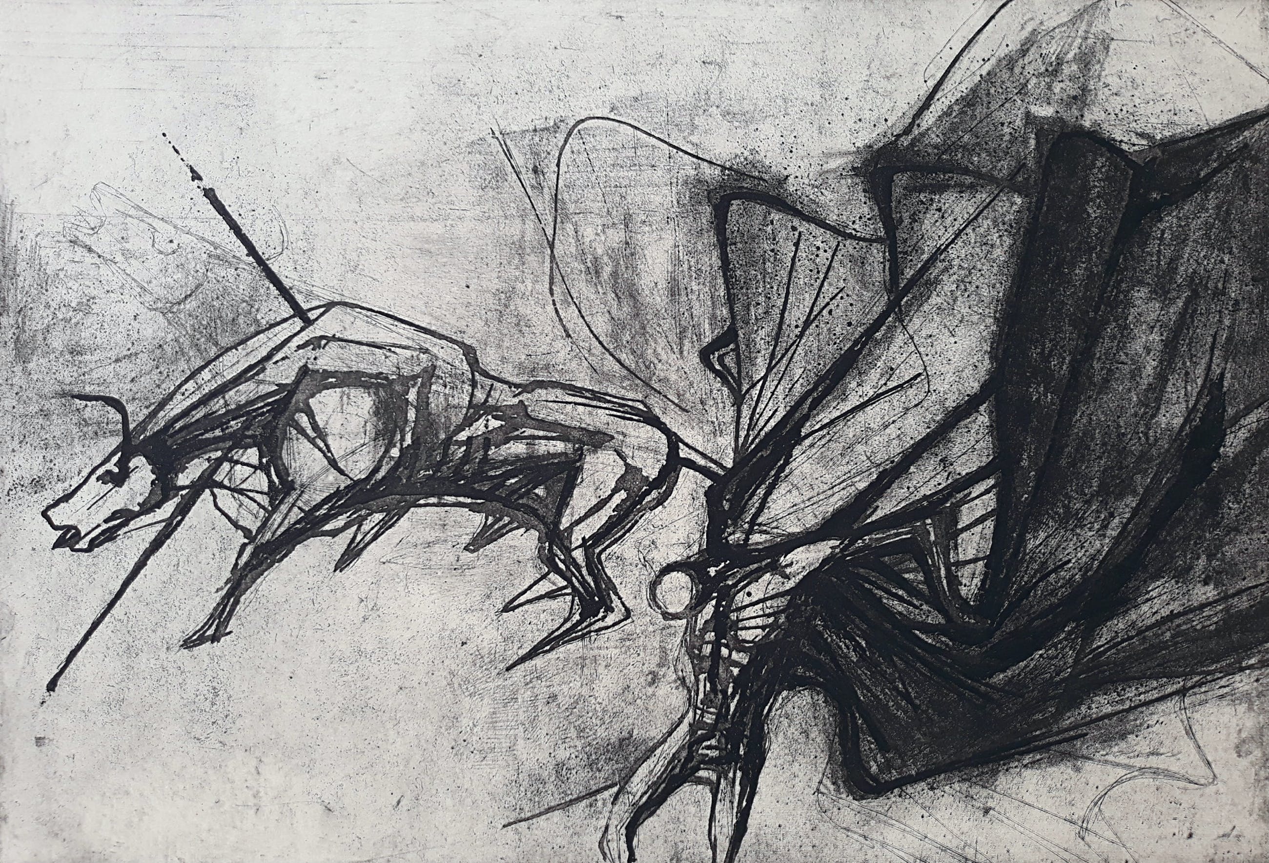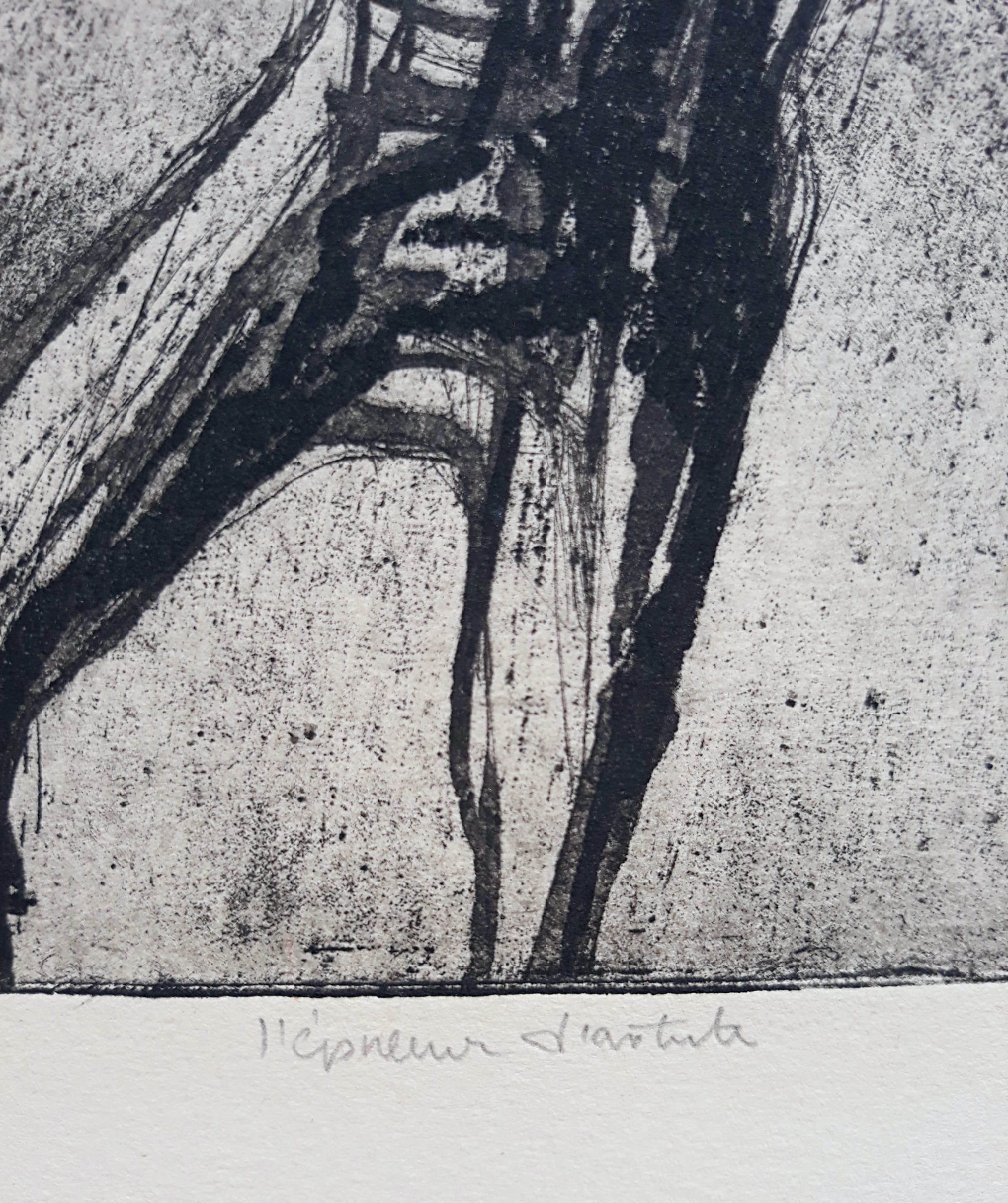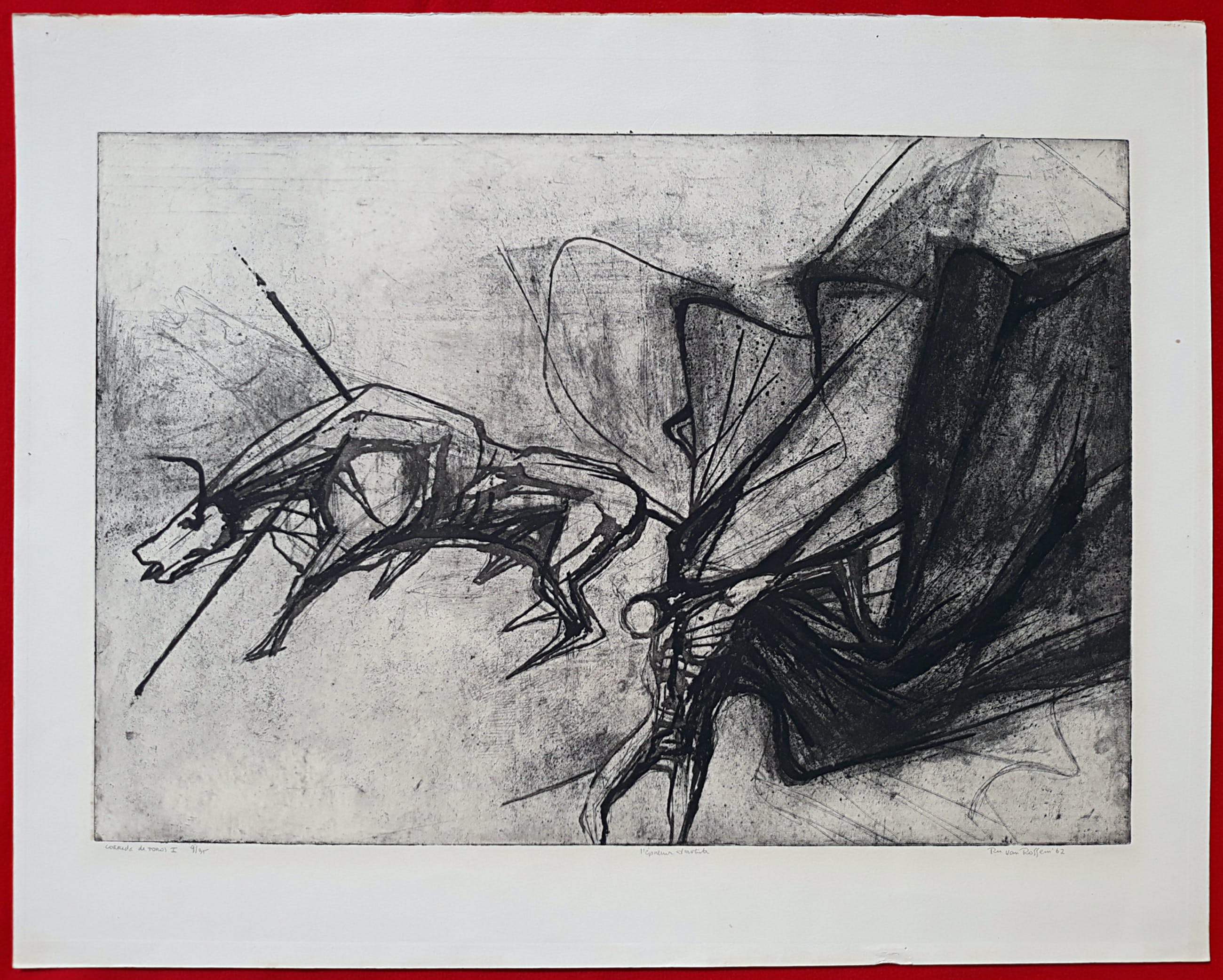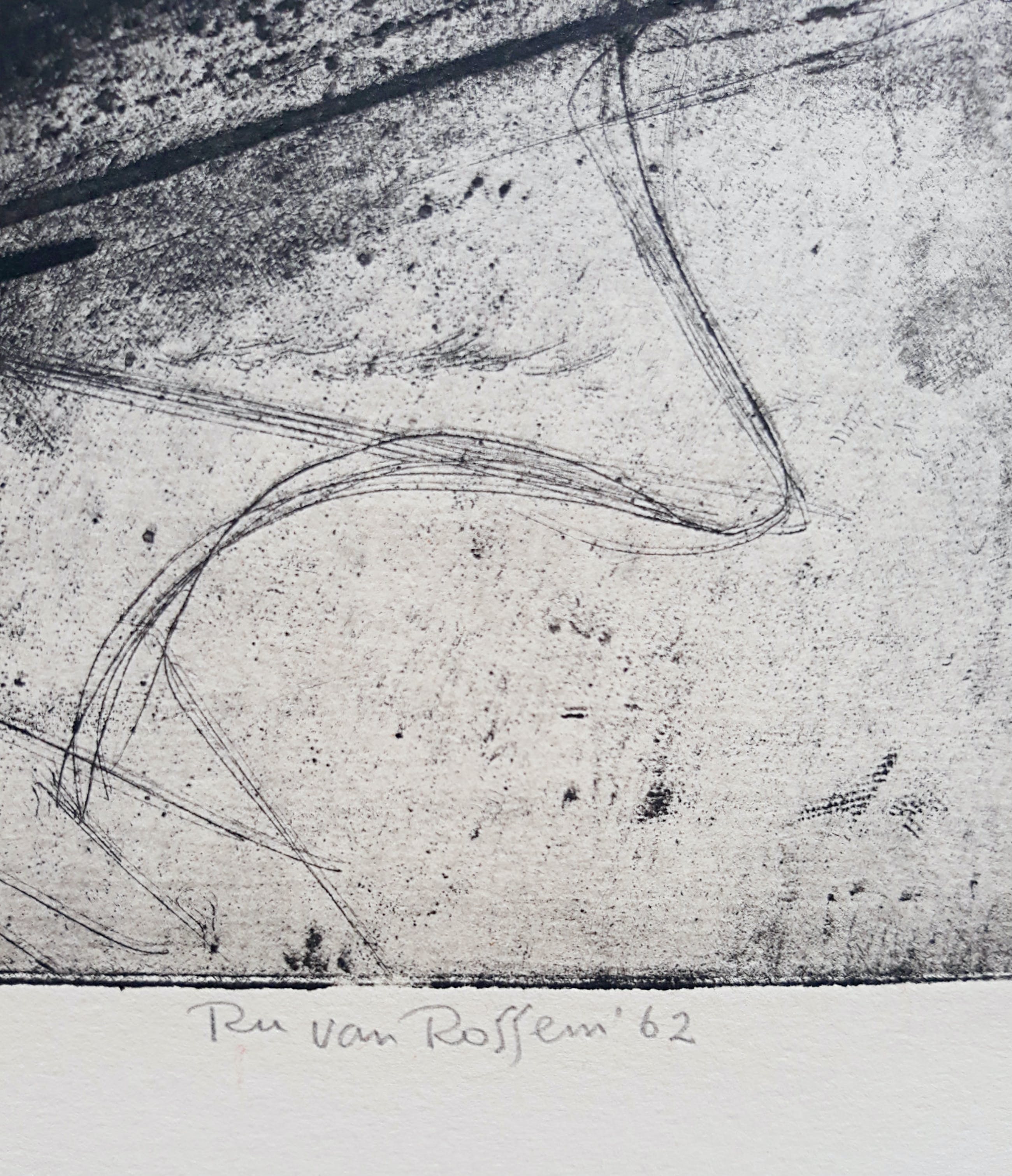 Karakteristiek, wat vroeger werk van Ru van Rossem. Aquatint ets op geschept papier, met potlood gesigneerd, gedateerd (‘62), getiteld en genummerd (9/35). In goede conditie, blad heeft ingelijst gezeten want er is een heel lichte verkleuring van het blad binnen een vorig passe-partout en in verso zitten er taperesten langs de randen. Opnieuw ingelijst met passe-partout is het werk zeer goed.