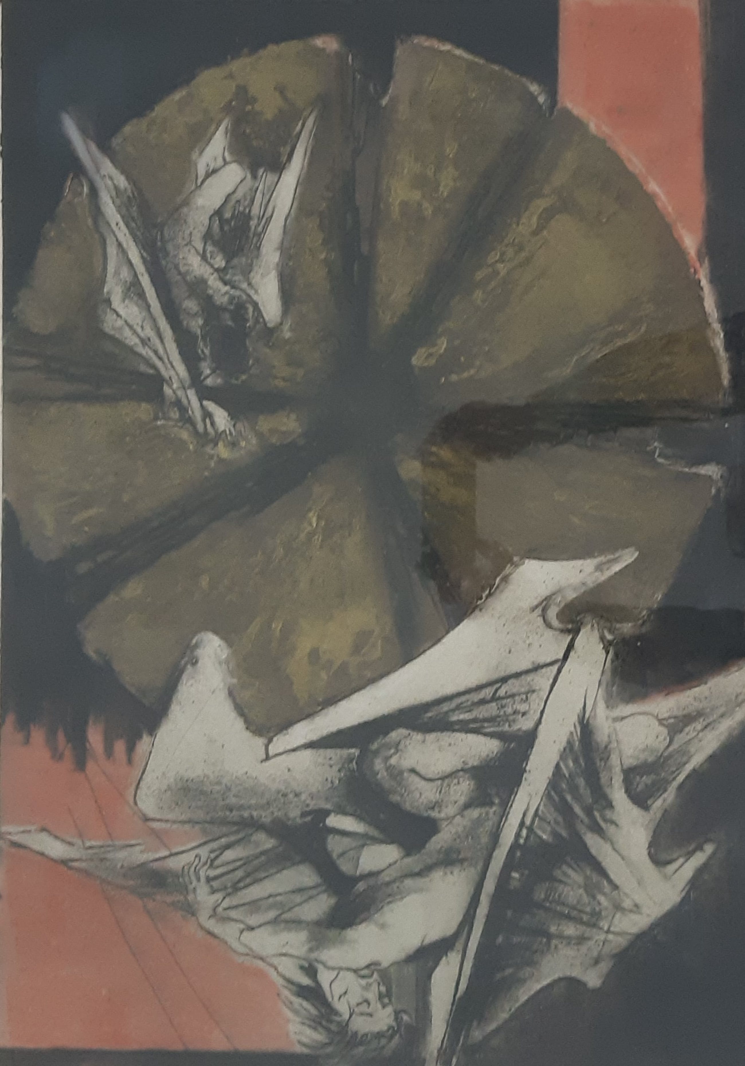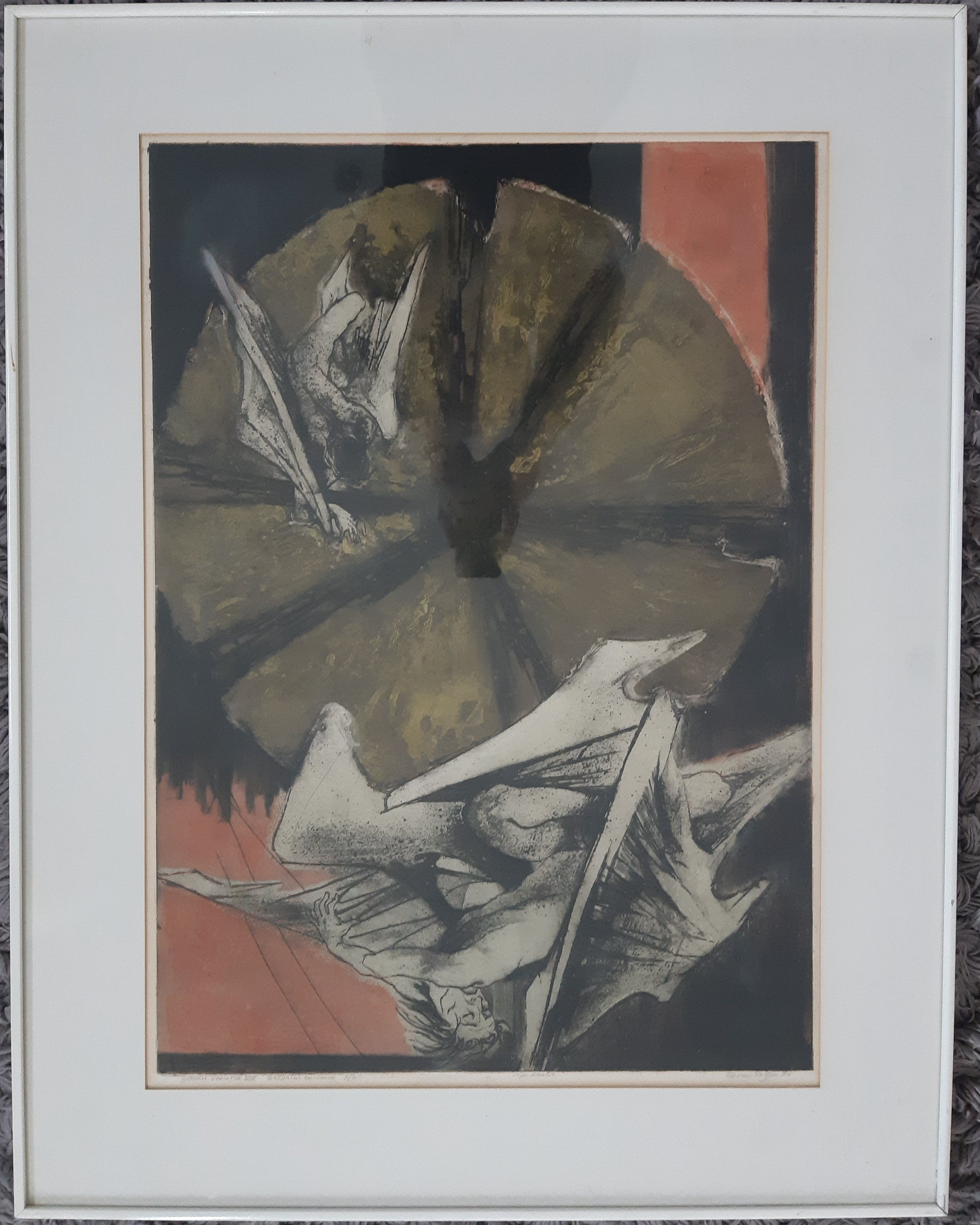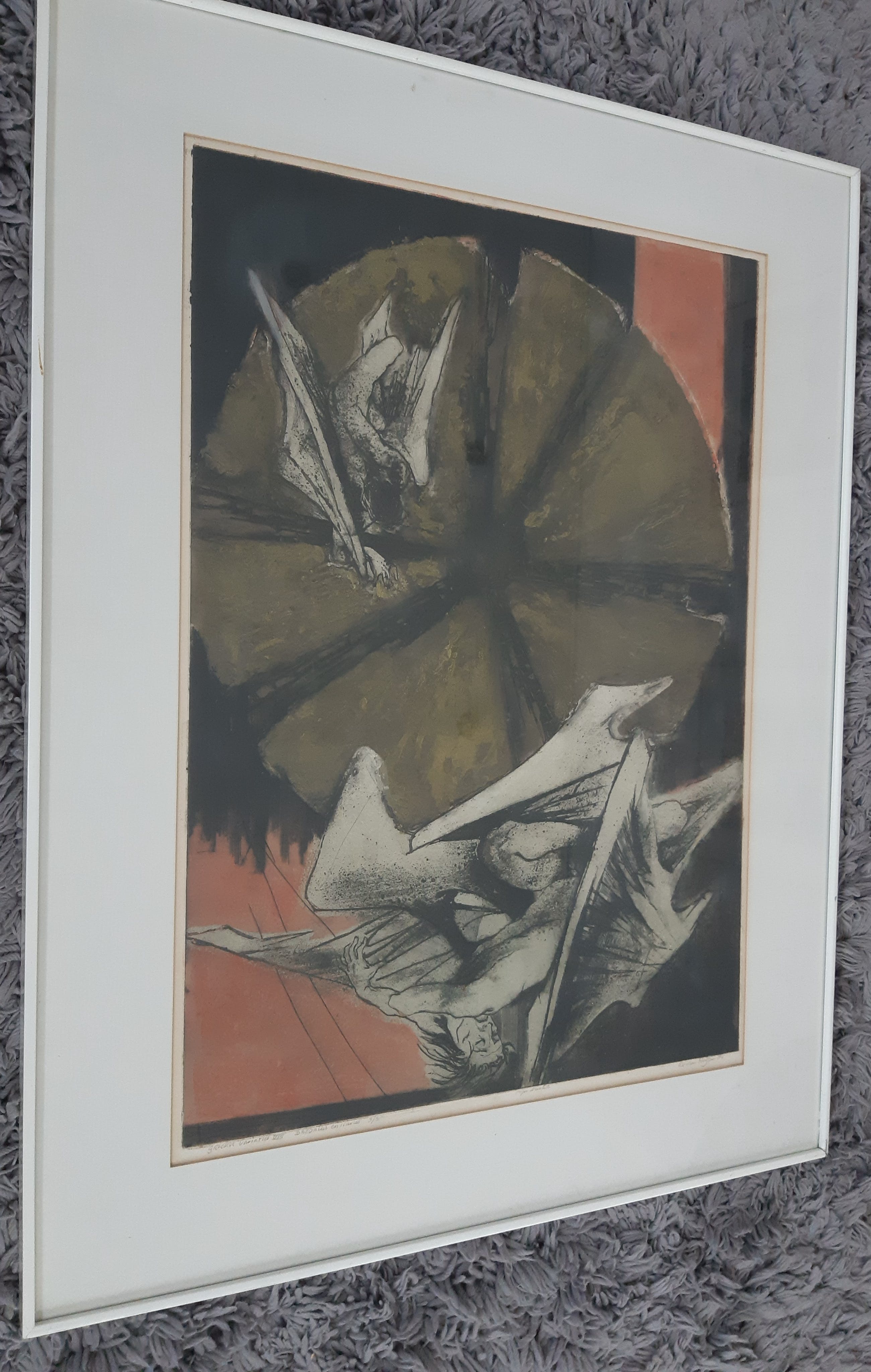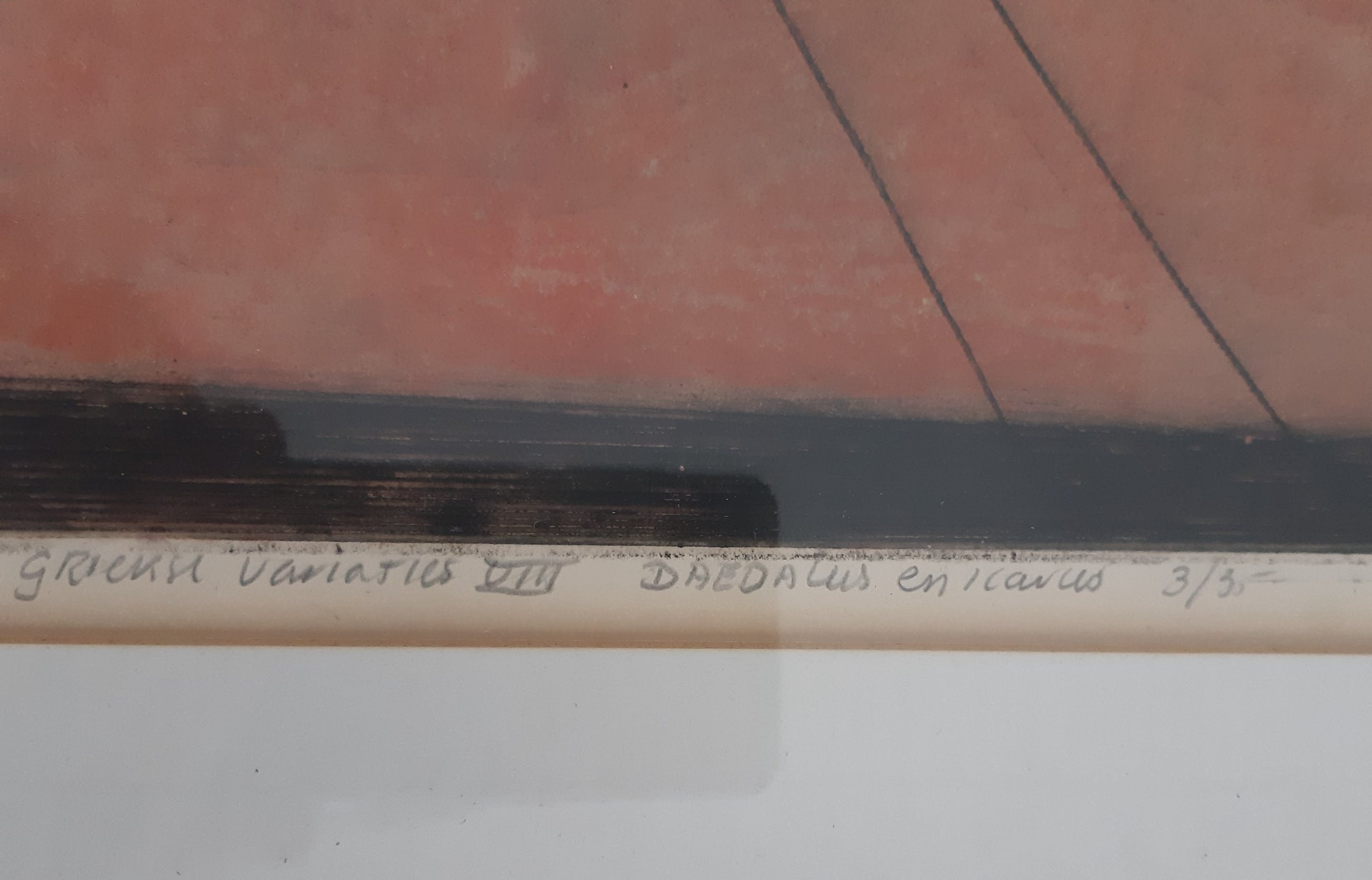 Grote kleurenets van Ru van Rossem, getiteld Griekse variaties VIII Daedalus en Icarus. Ingelijst in witte aluminium lijst met gebruikssporen. Het werk is met potlood gesigneerd, genummerd 3/35, gedateerd en van titel voorzien. De conditie van de afbeelding is zeer goed.