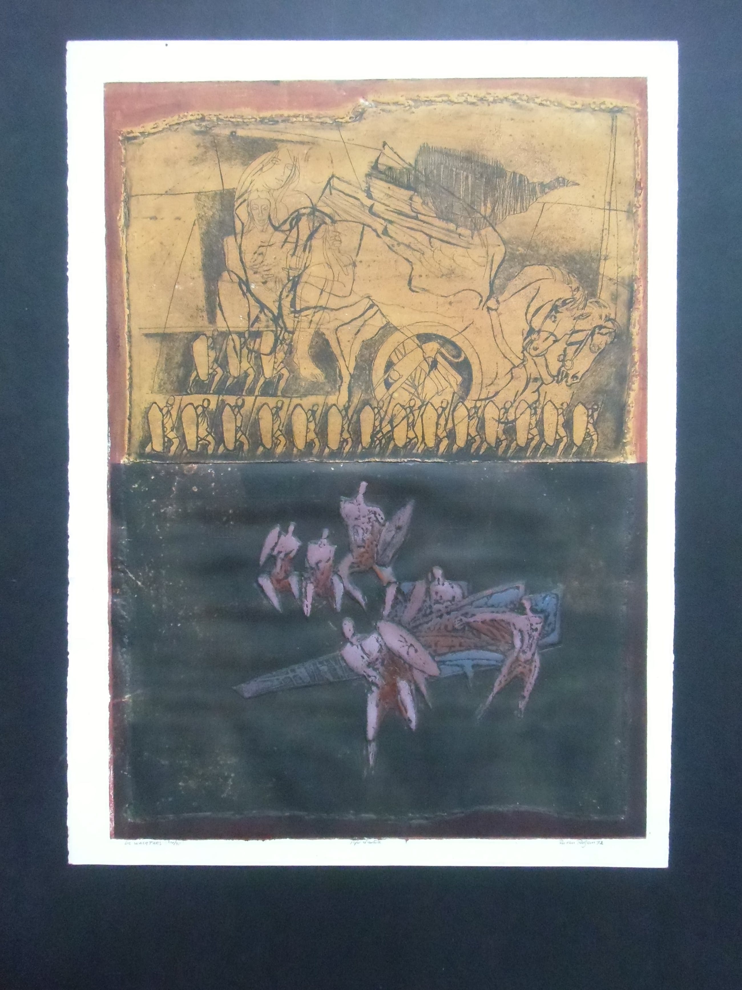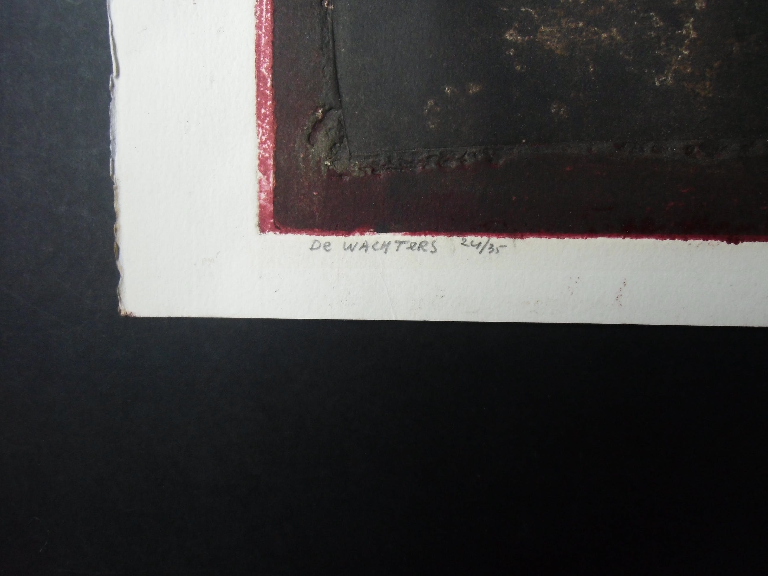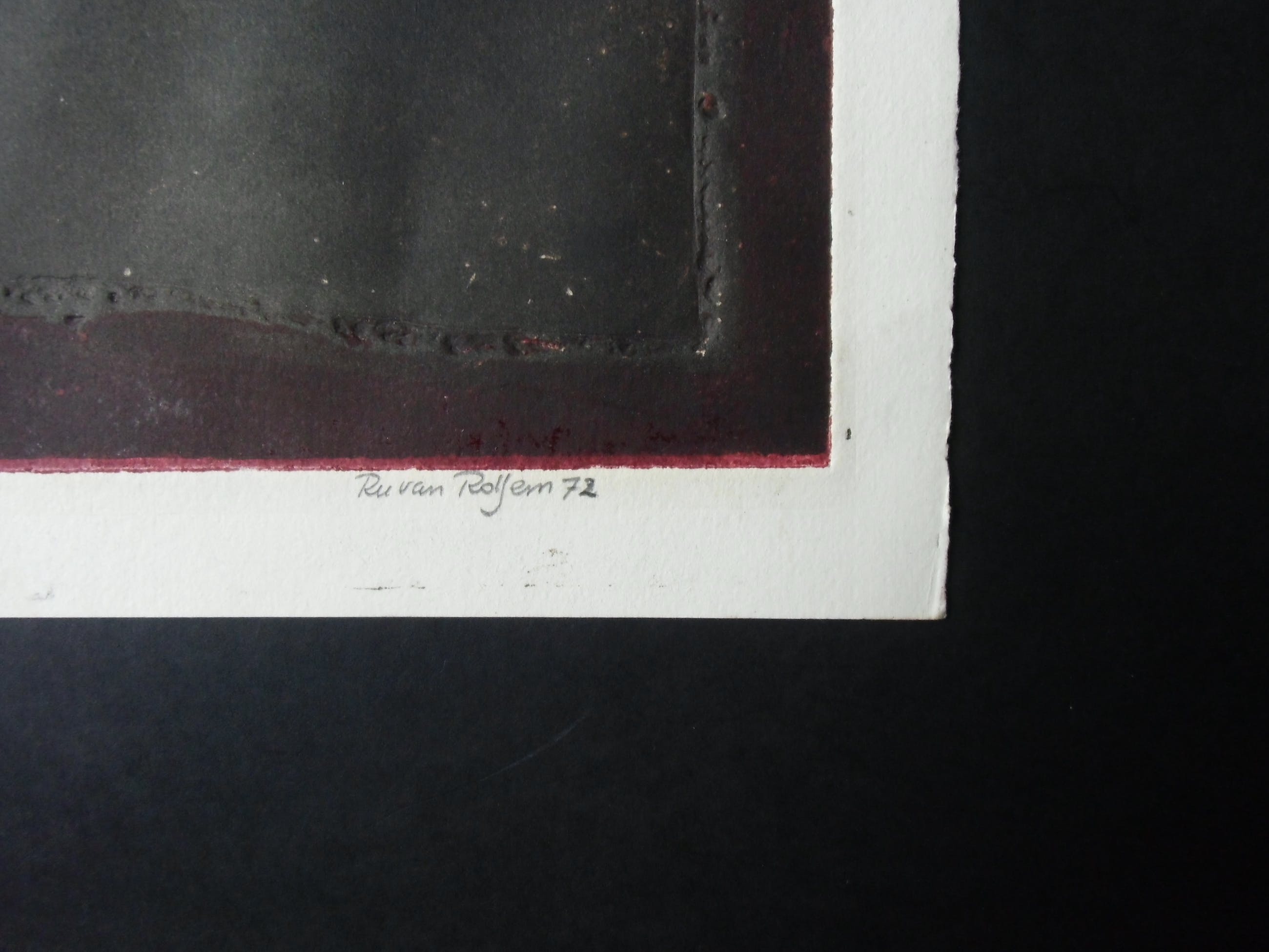 Deze kleurets/aquatint is een épreuve d'artiste met potlood gesigneerd. Het is een monumentale ets met sterke lijnen en reliëf. Jaar: 1972. Gebruikssporen in de marge. Geen lijst en/of passepartout.