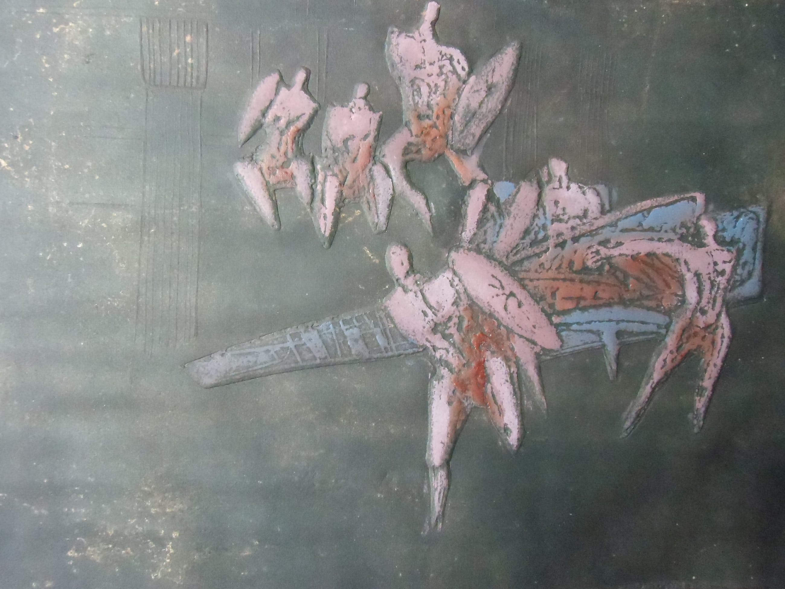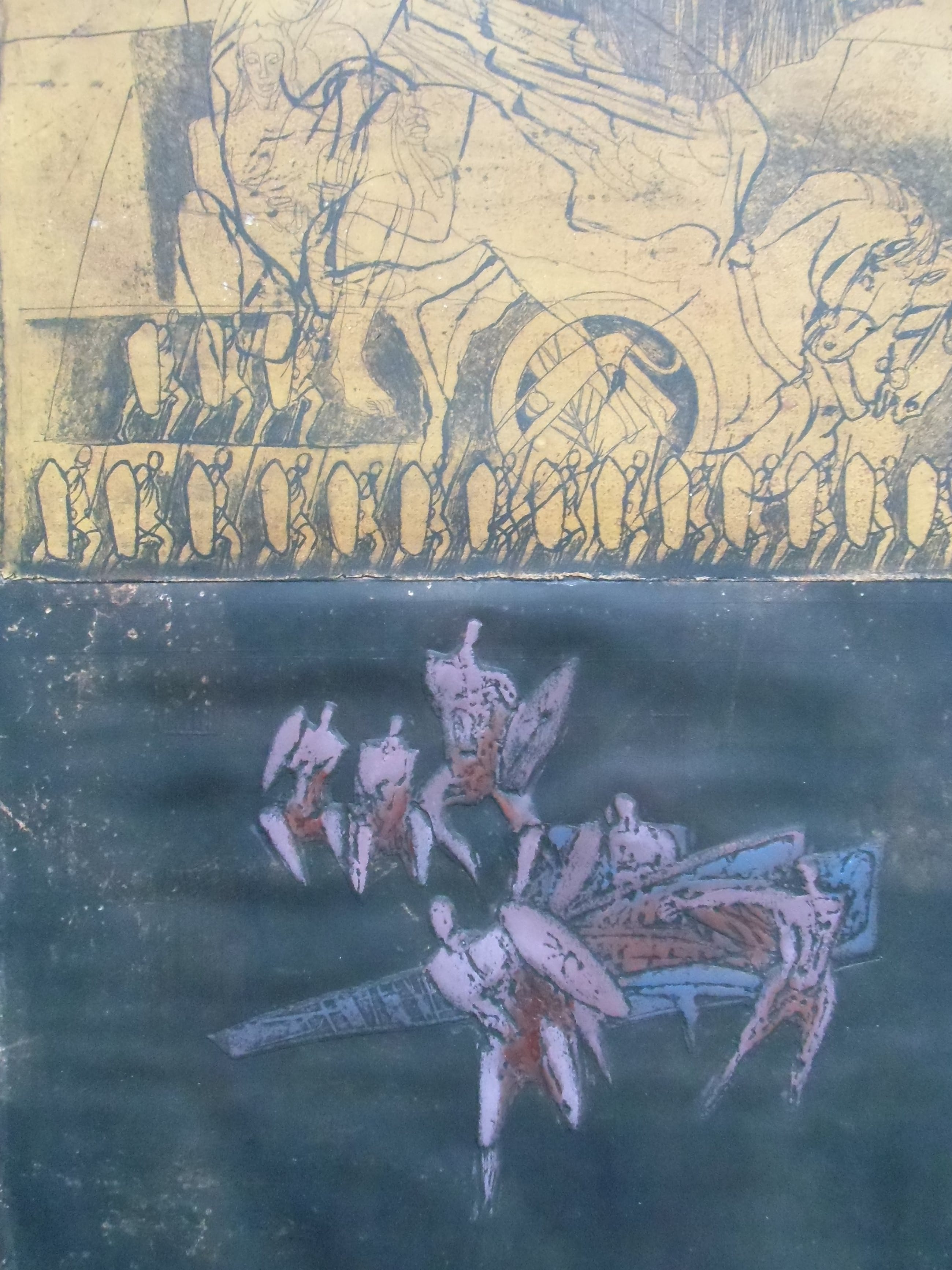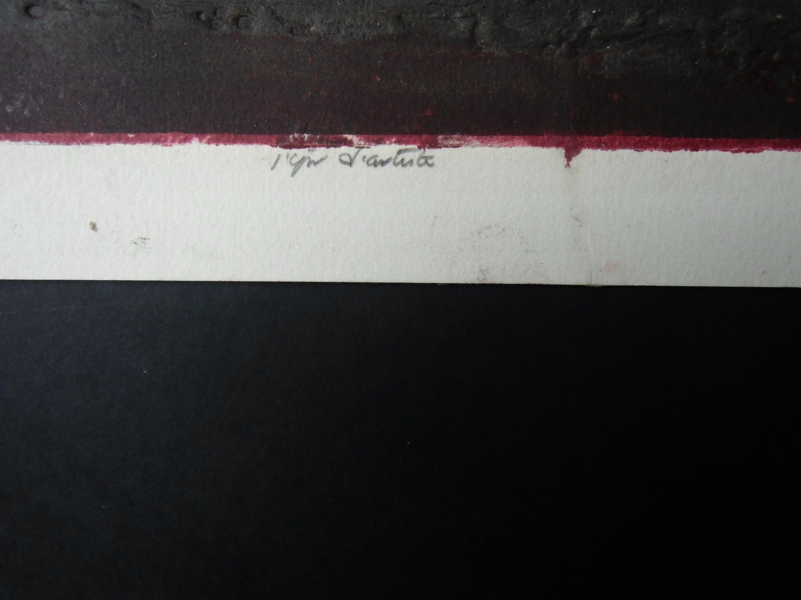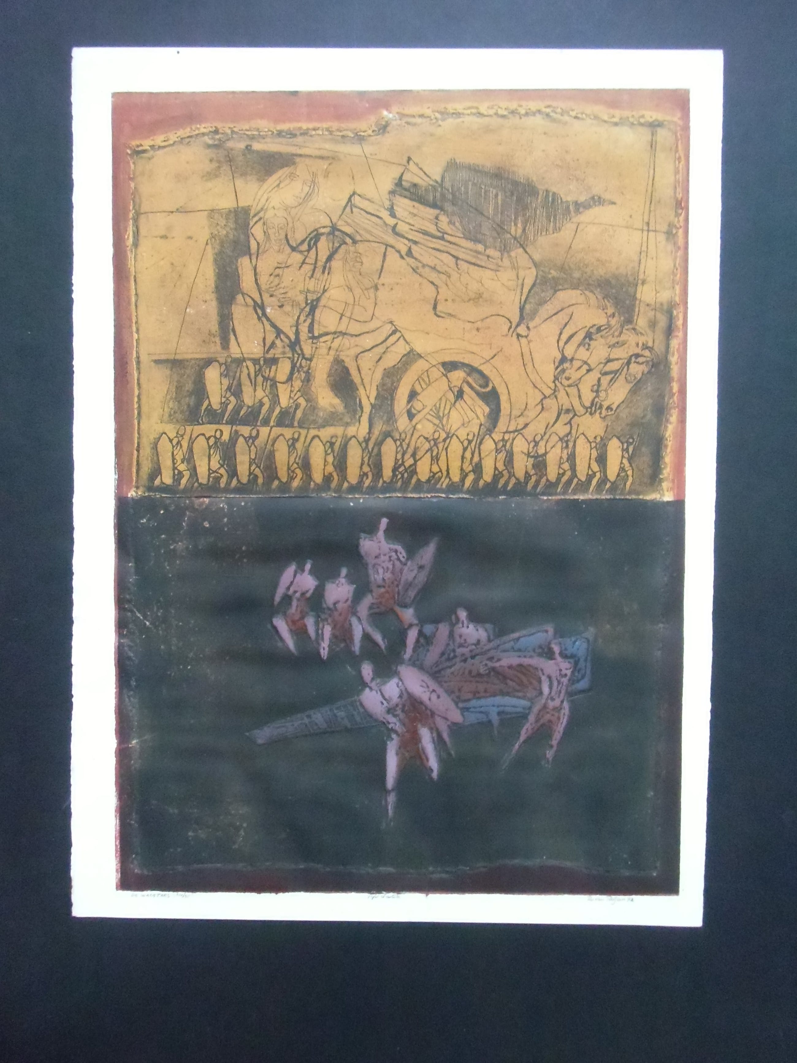 Deze kleurets/aquatint is een épreuve d'artiste met potlood gesigneerd. Het is een monumentale ets met sterke lijnen en reliëf. Jaar: 1972. Gebruikssporen in de marge. Geen lijst en/of passepartout.