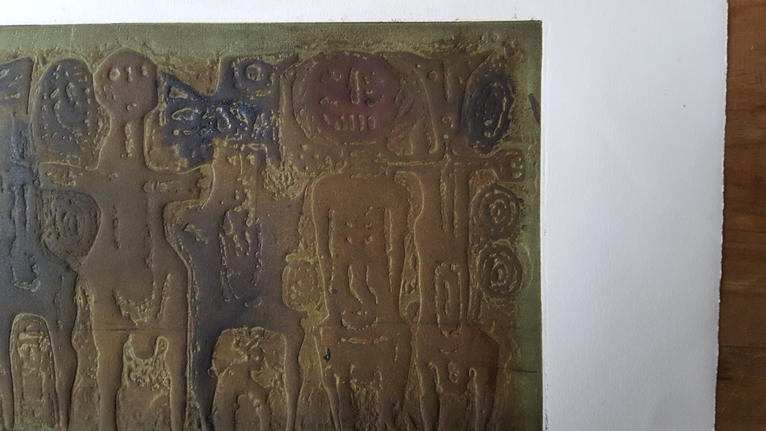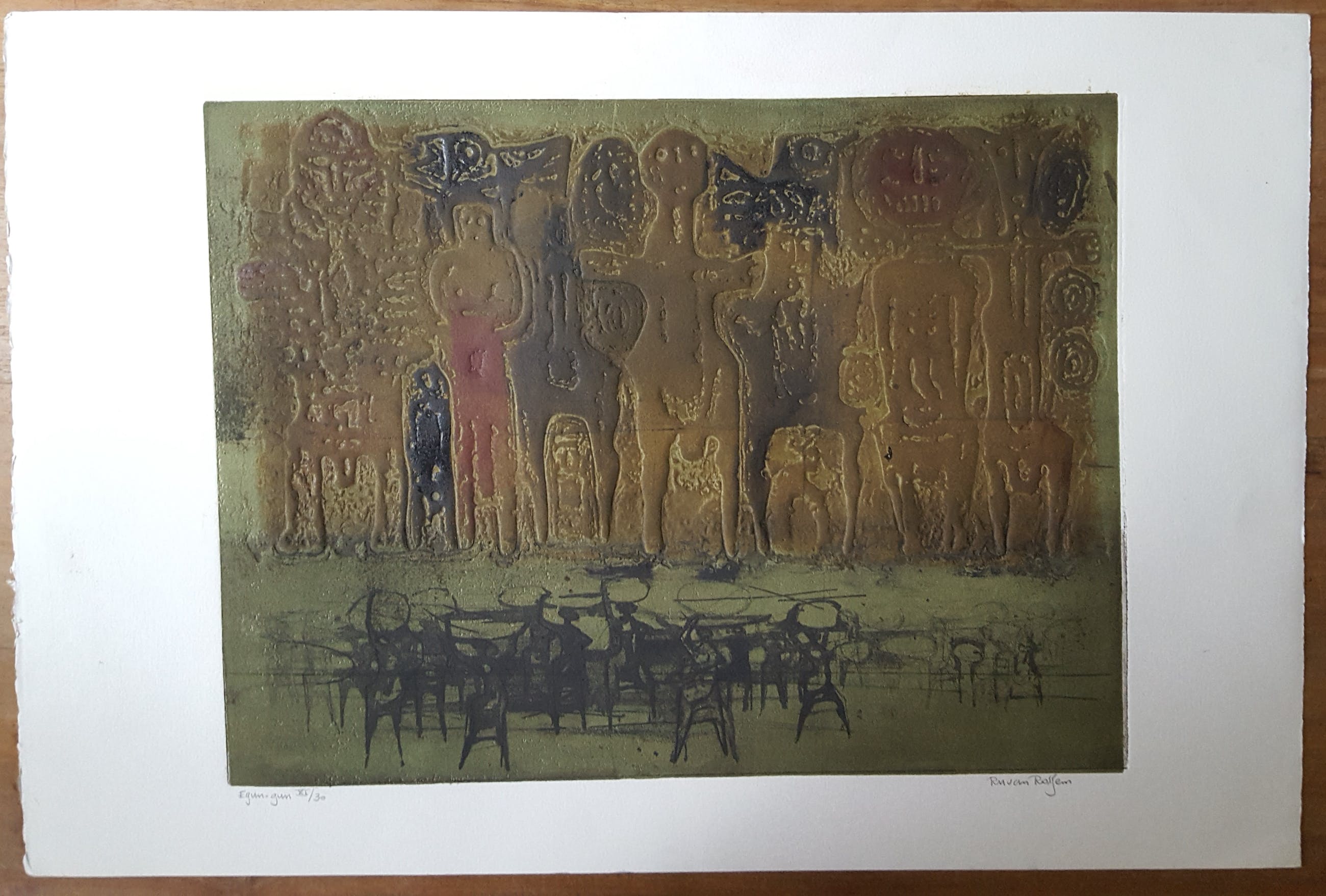 Ru van Rossem.Egun-gun. Reliëf ets. Gesigneerd. Oplage 30 ex.Handgesigneerd. Nummer XI uit 30. In perfecte staat. Afmeting afbeelding 30x40 cm. Afmeting papier 38 x 57 cm.