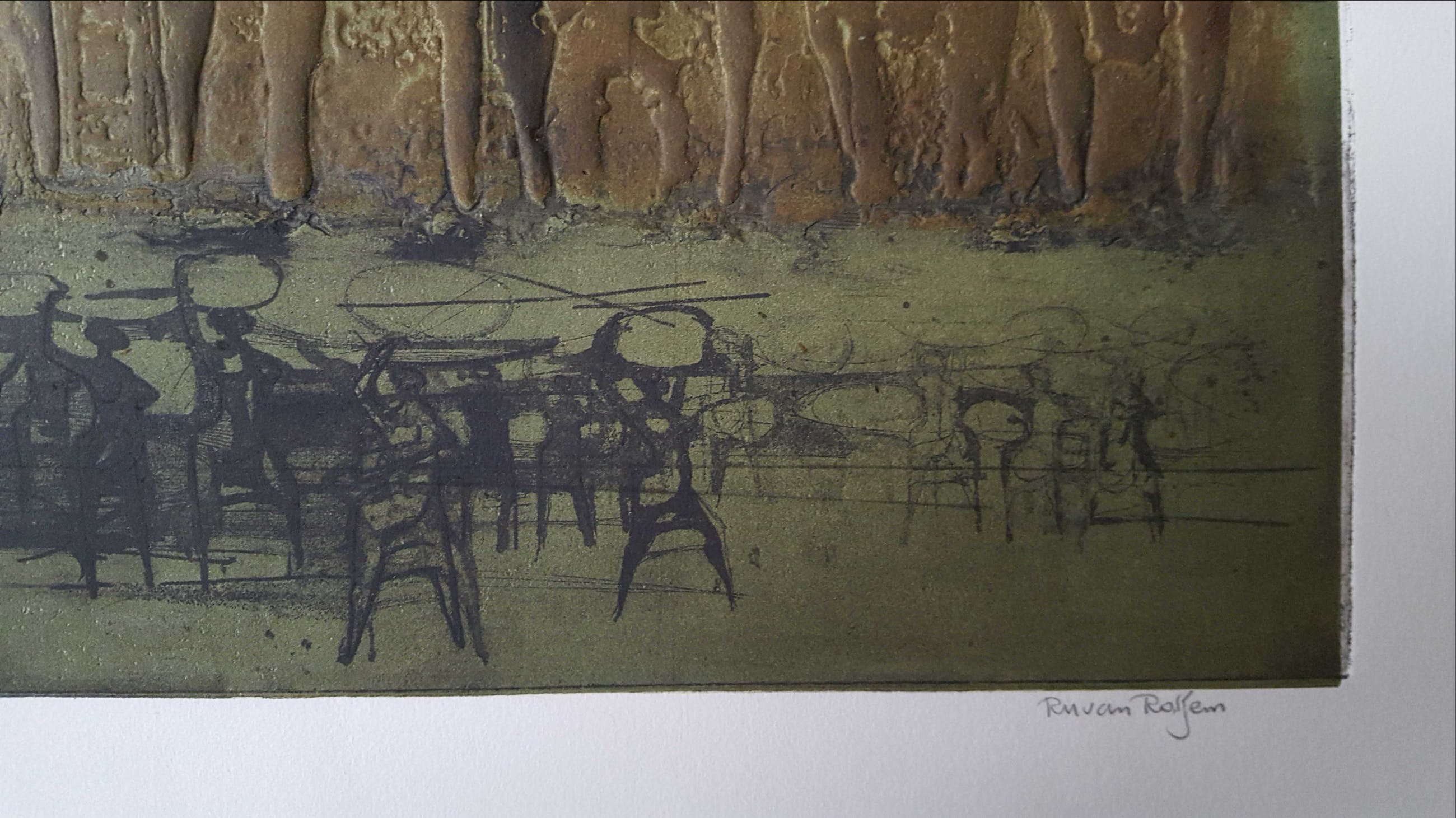 Van Rossem drukte zijn etsen eigenhandig op zijn eigen unieke manier.vaak met reliëf en in schitterende kleuren. Ru van Rossem (1924-2007) was een van de belangrijkste beeldend kunstenaars in Nederland. Deze Tilburgse kunstenaar heeft tussen 1950 en 2006 gewerkt aan een indrukwekkend oeuvre, waarbij vooral zijn etsen nationaal en internationaal de aandacht hebben getrokken. Vele onderscheidingen vielen hem ten deel, onder meer het erelidmaatschap van de Accademia Fiorentina,Florence.