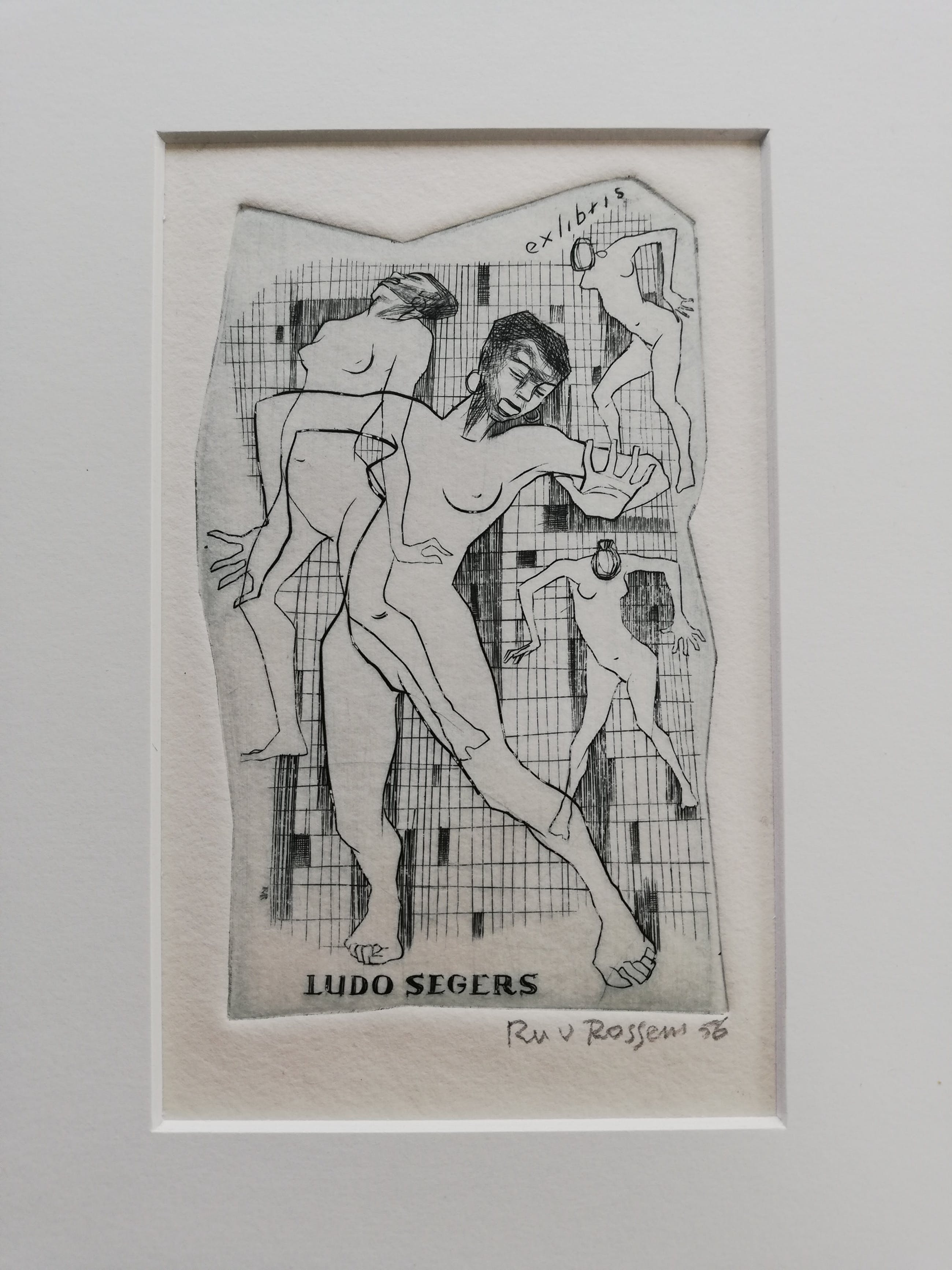 Fraai vormgegeven ex libris van meester etser Ru van Rossem. Handgesigneerd en gedateerd (1956) met potlood rechtsonder. In nette passepartout.