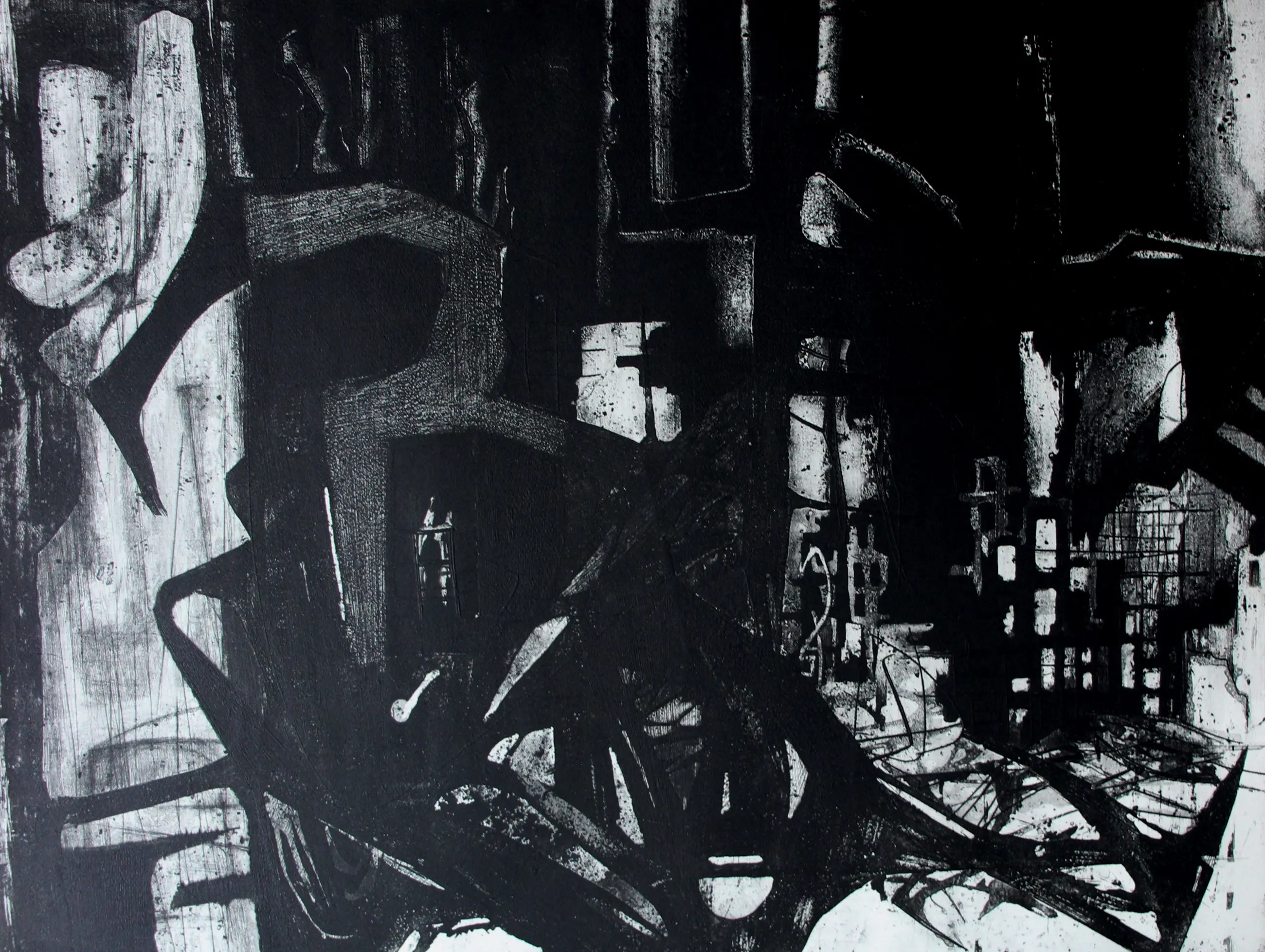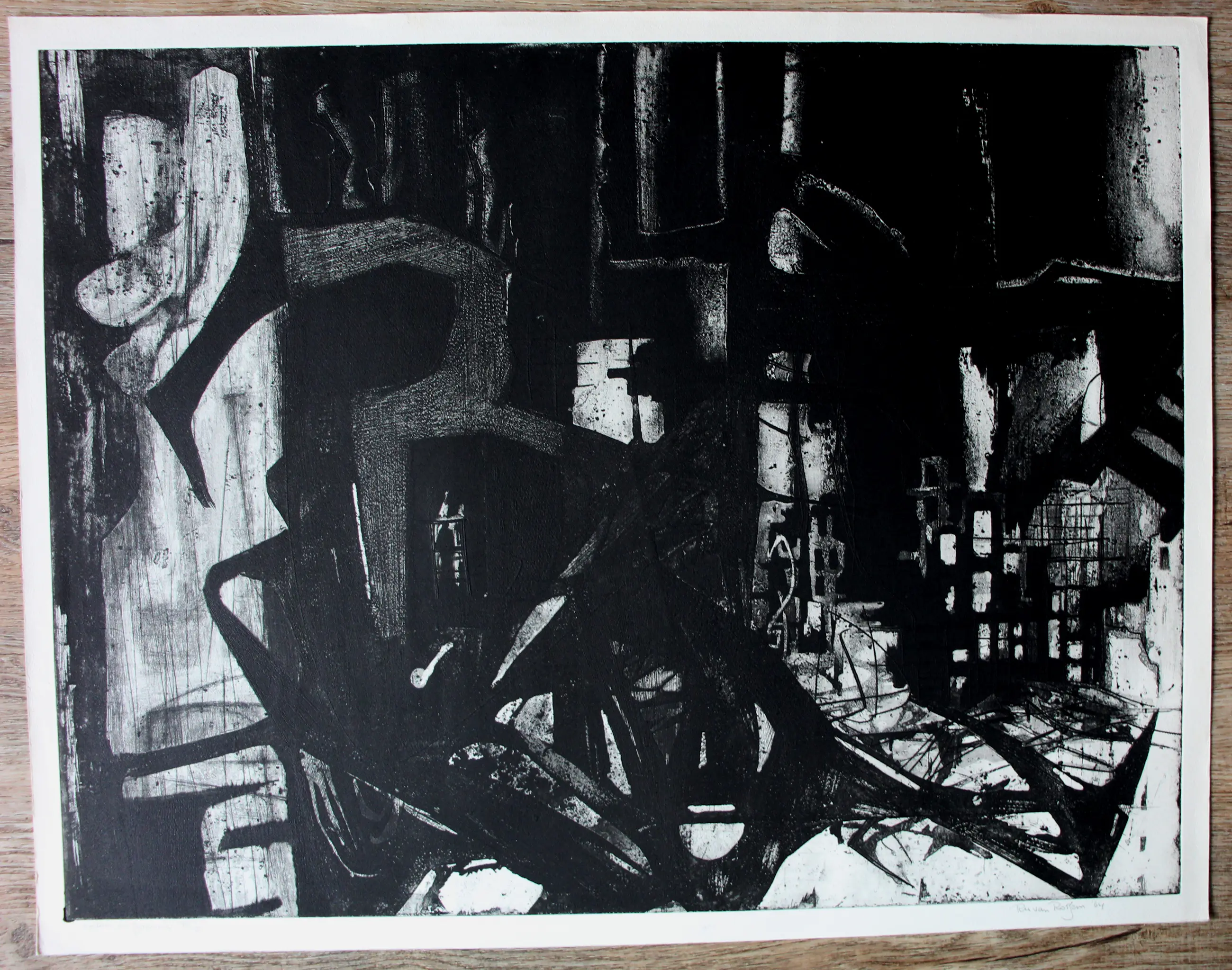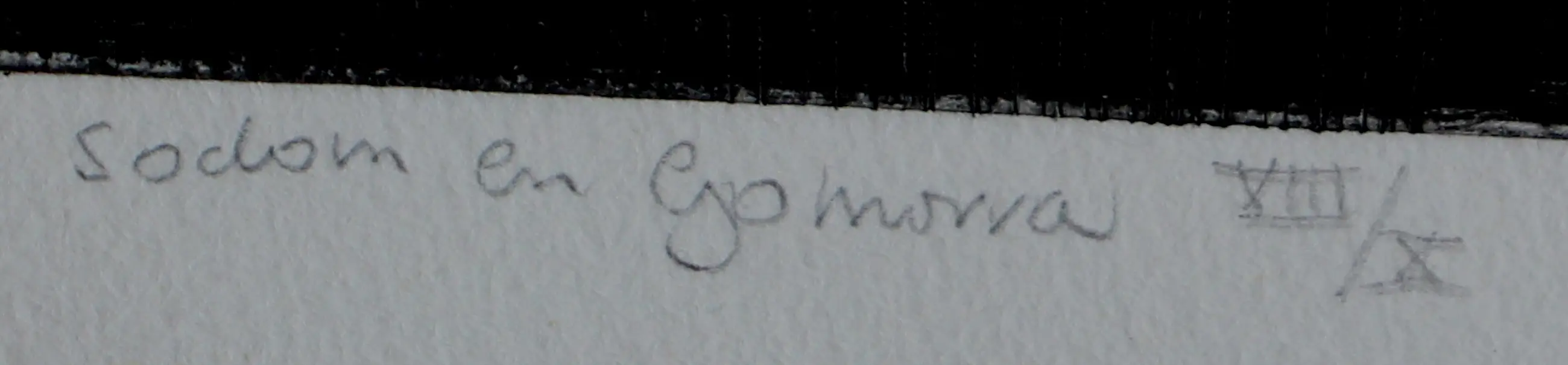 Ets van Ru van Rossem uit 1964. Nummer: XIII/X. Titel: Sodom en Gomorra(Sodom en Gomorra verwijzen naar twee steden in de Bijbel die verwoest werden door God als straf voor hun immorele seksuele gedrag en zonden).