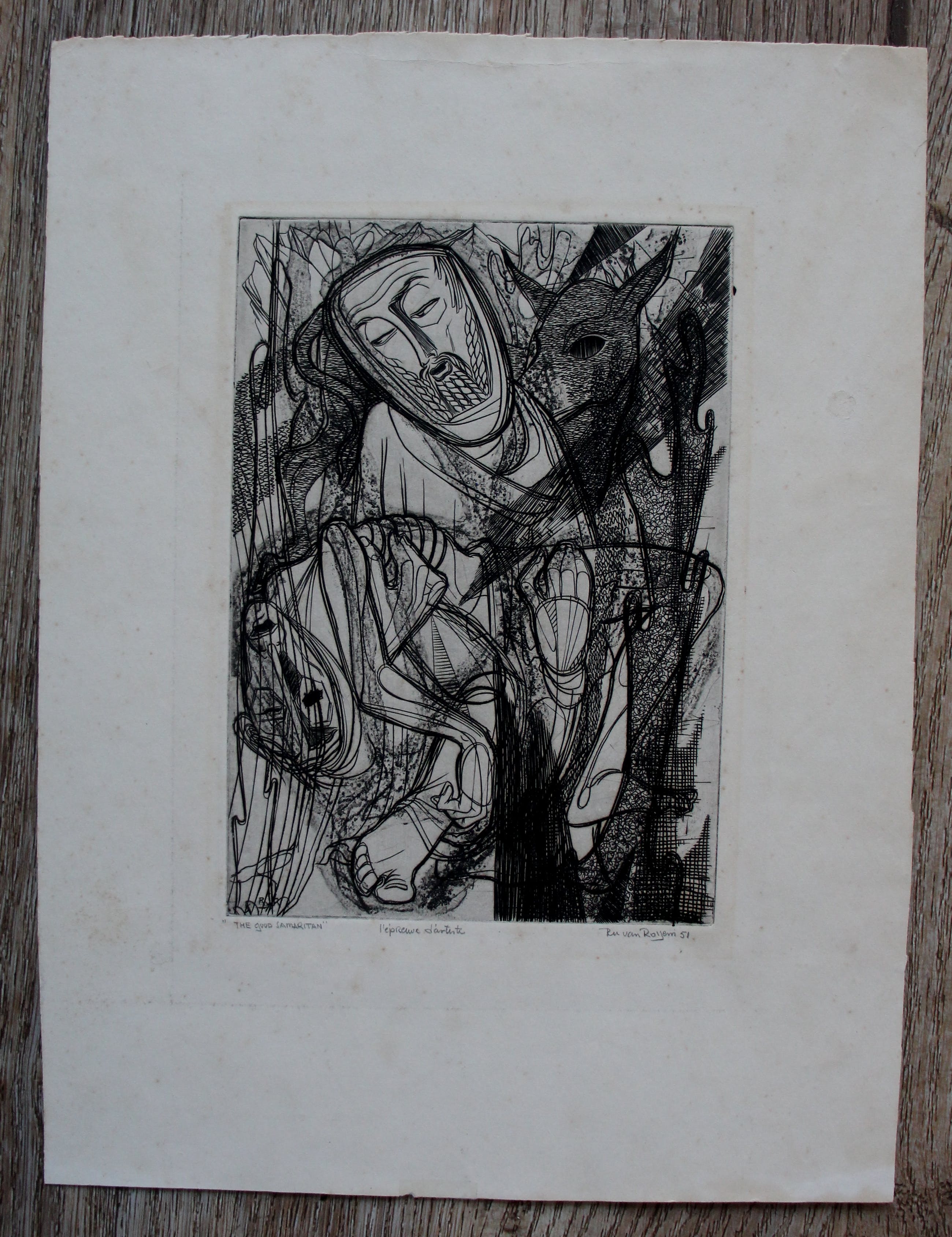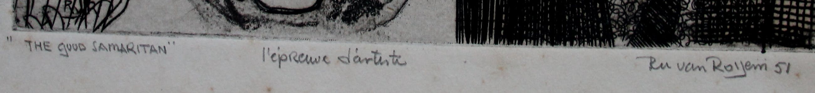 Ets van Ru van Rossem uit 1951. Titel: "The good samaritan". Oplage: l'epreuve d'artiste. Afmetingen blad: H29.5 x b22cm. Afmetingen voorstelling: H17.5 x b12cm. Het werk is rechts onderaan, met potlood, gesigneerd door de kunstenaar. De authenticiteit van dit werk wordt volledig gegarandeerd. Een certificaat van echtheid kan, op verzoek, worden gemaild.