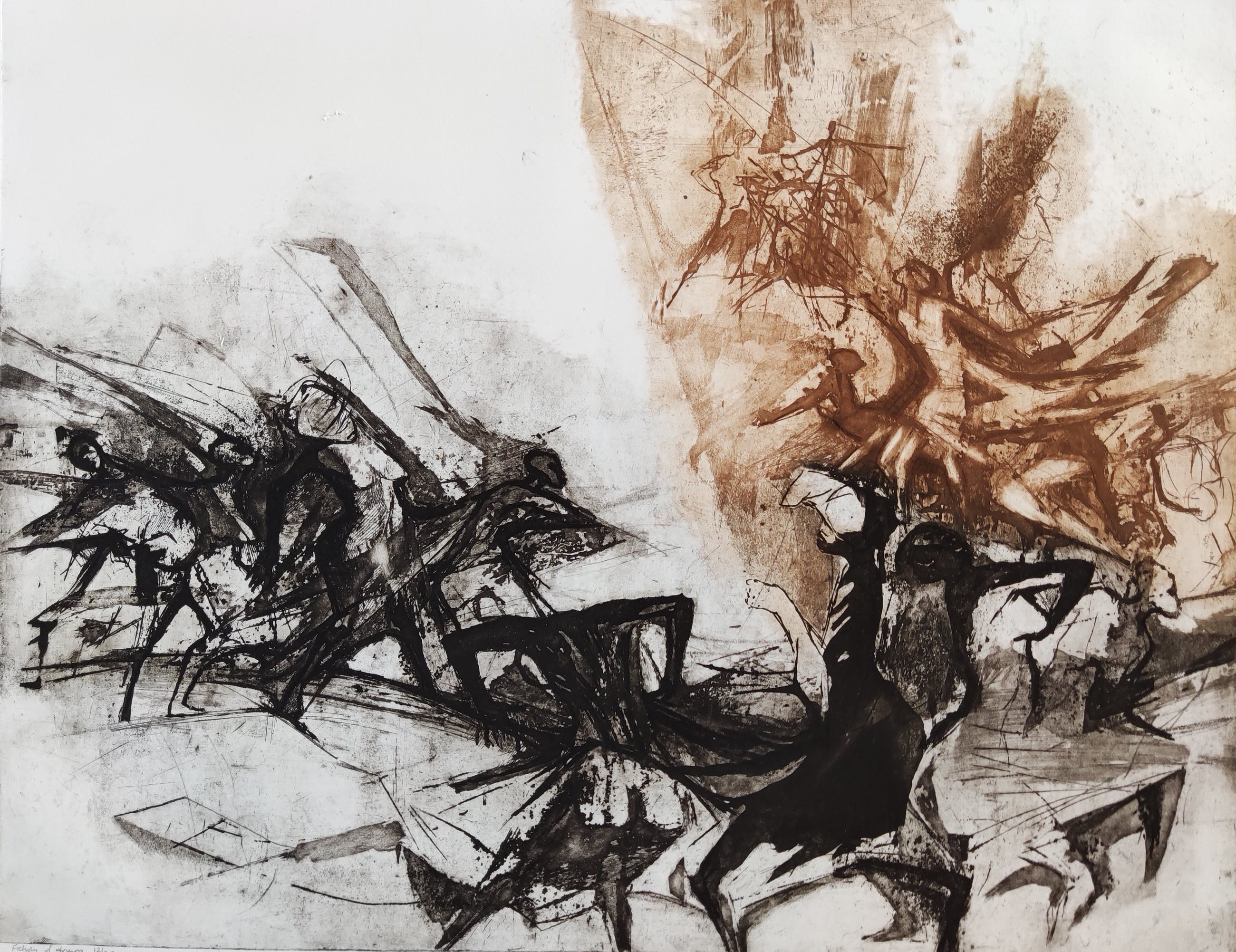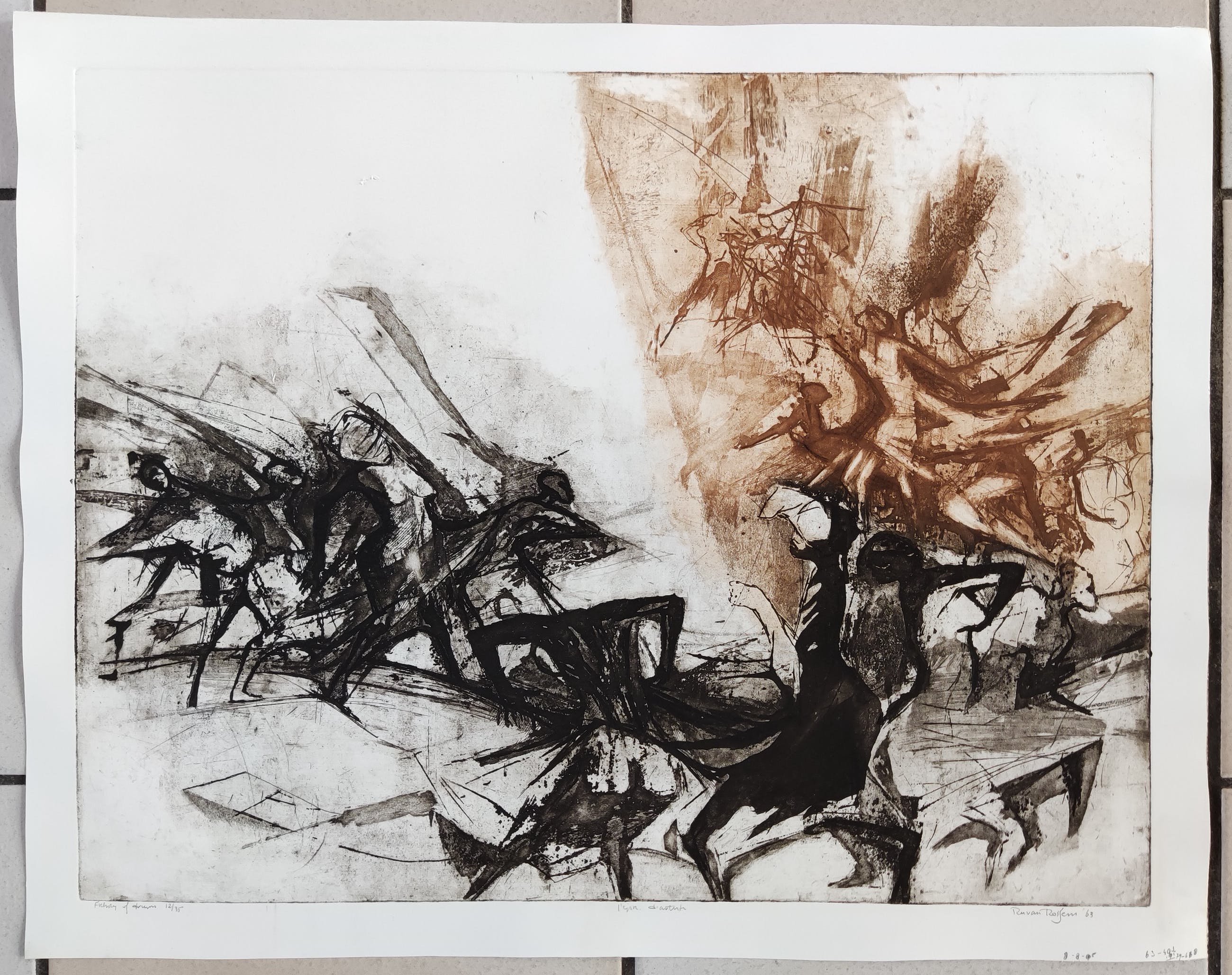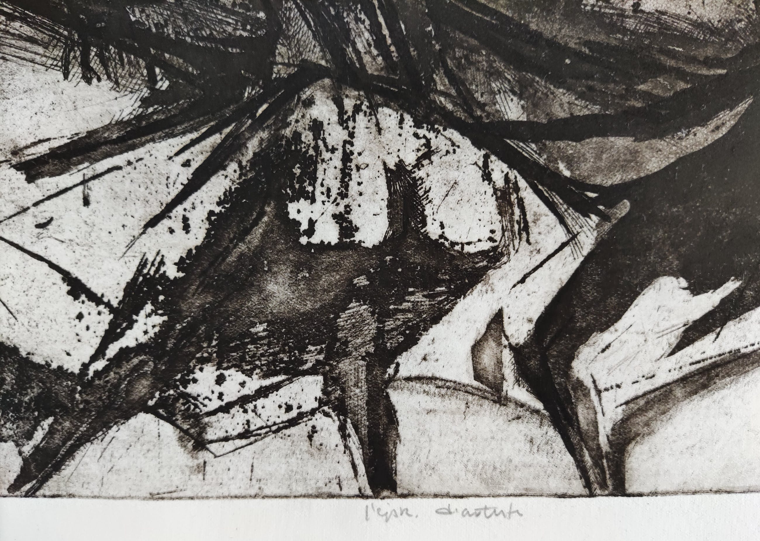Ets in kleuren. Potlood gesigneerd en gedateerd rechtsonder. Getiteld en genummerd 12/35 linksonder. 1e epr. d'artiste midden onder. Beeldmaat 48x61,5 cm. Bladmaat 53,5x68 cm. Losbladig.