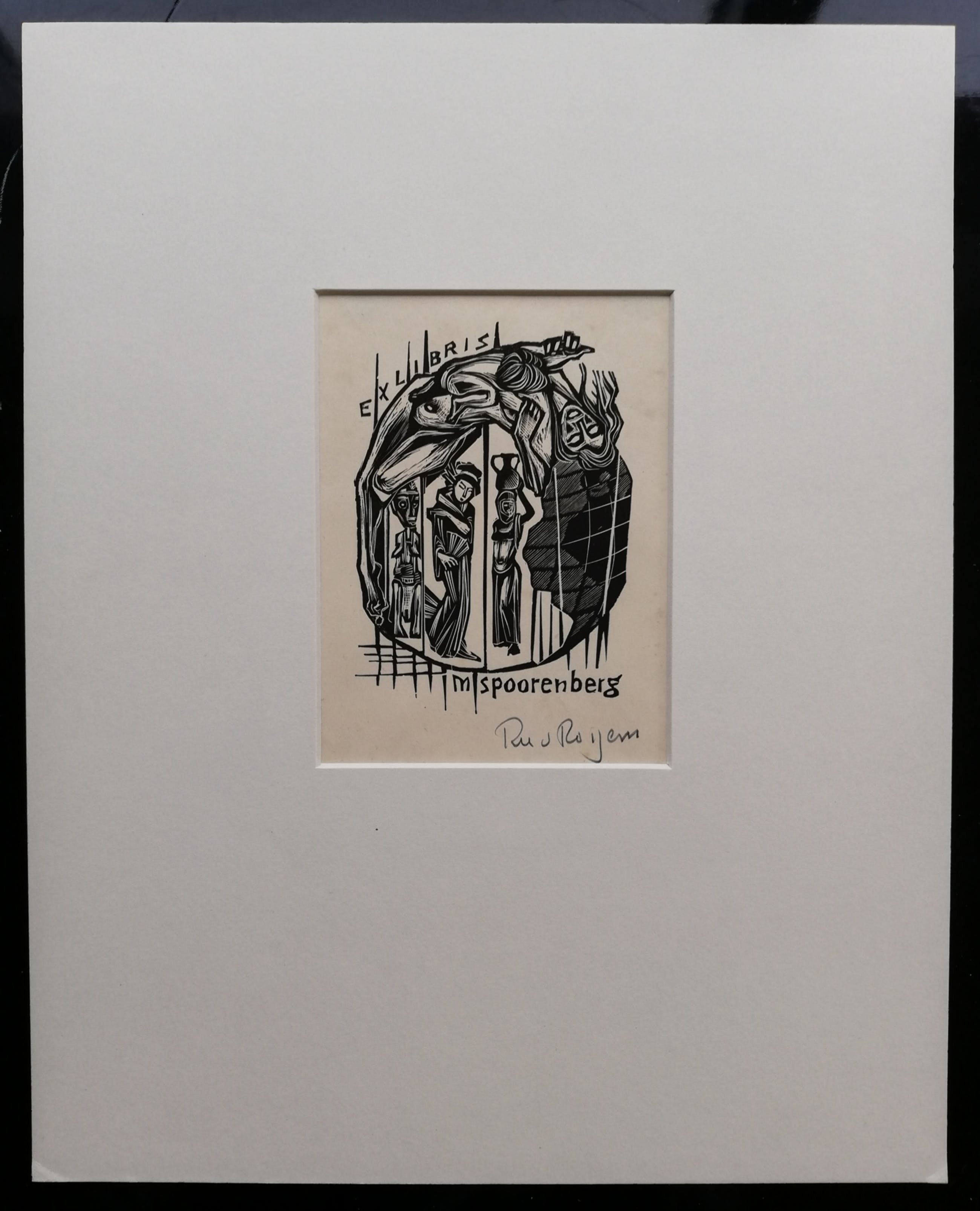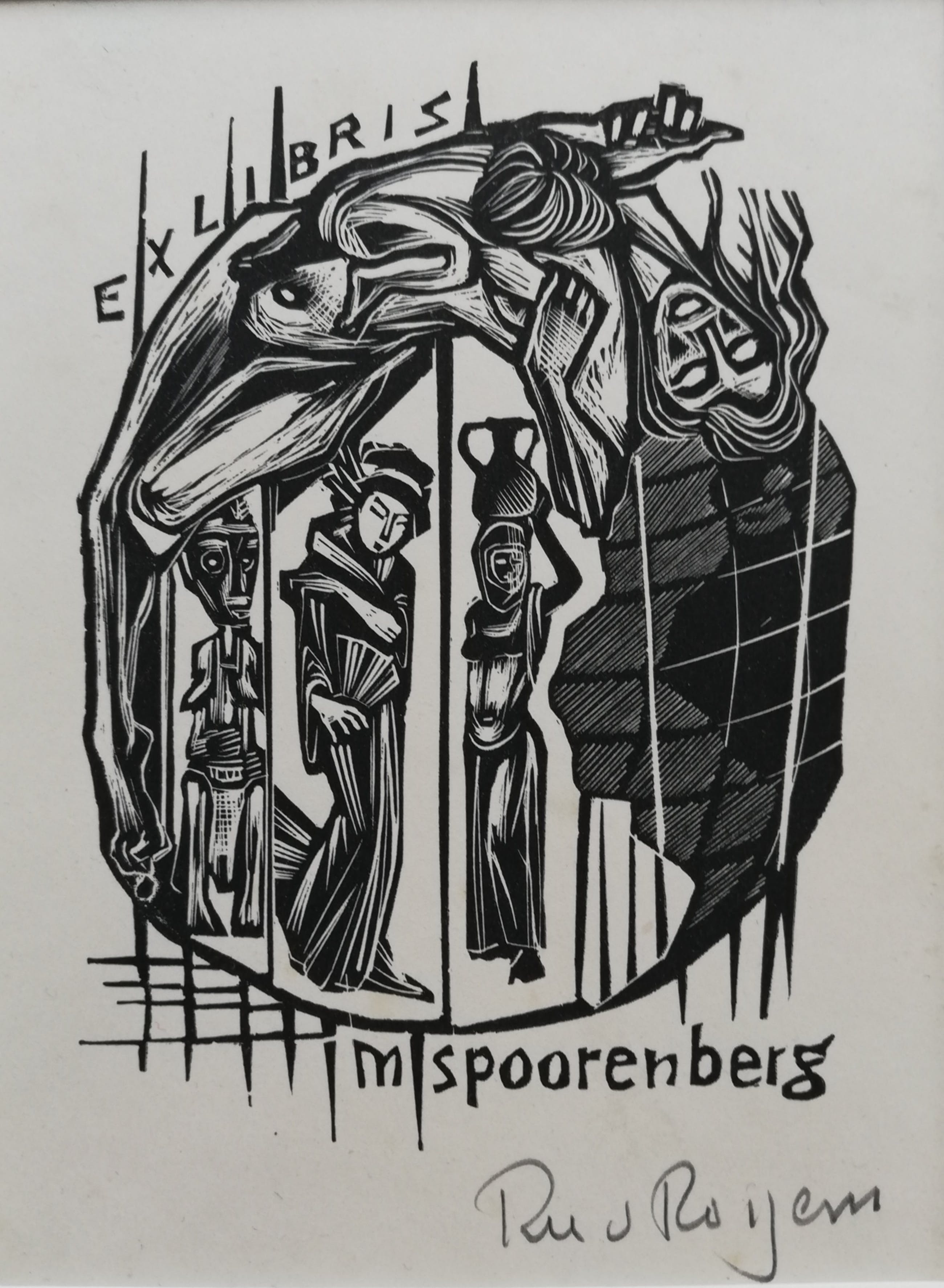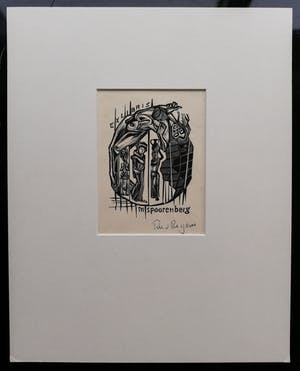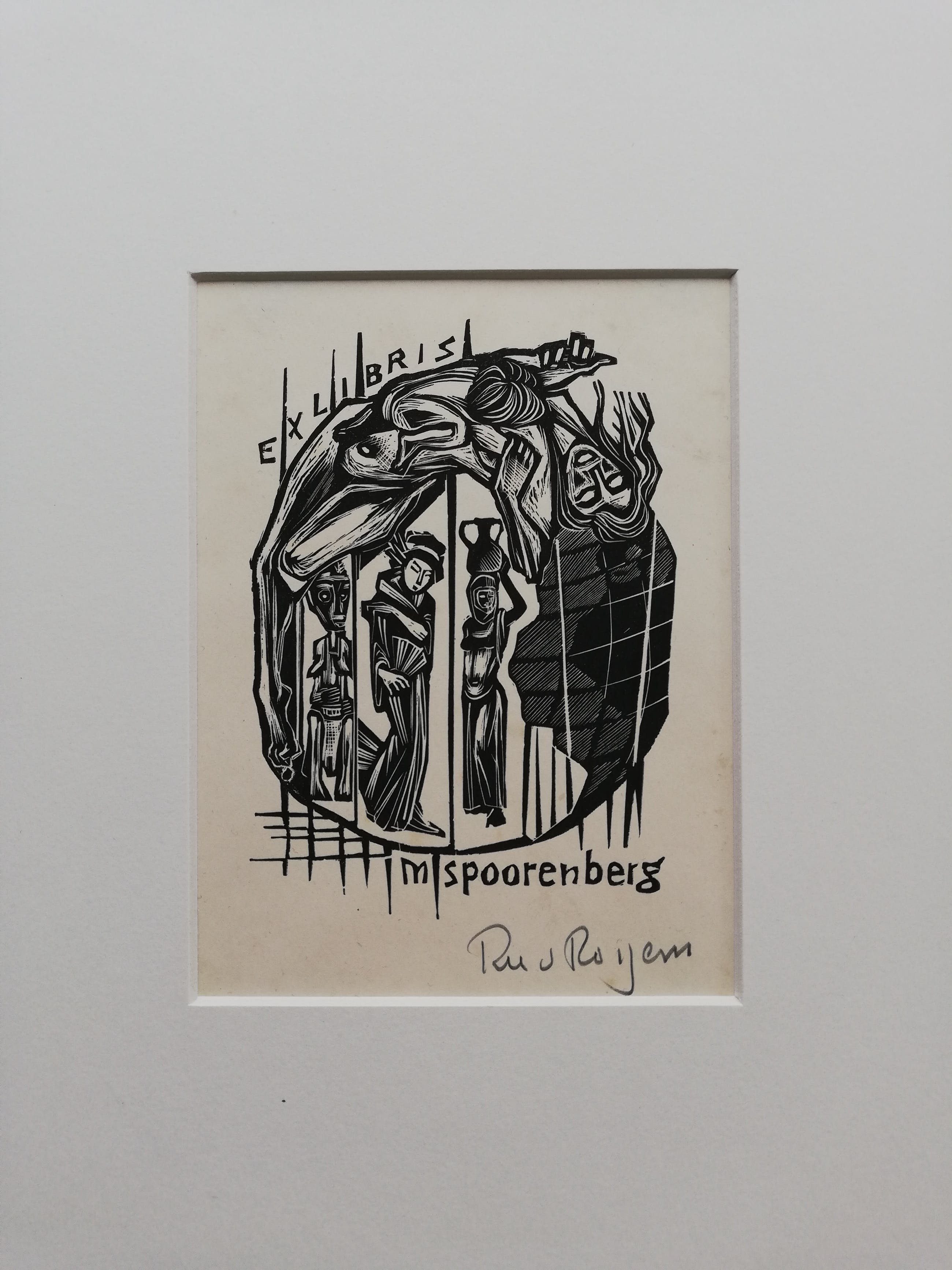 Fraai vormgegeven ex libris van kunstenaar Ru van Rossem. Handgesigneerd met potlood rechtsonder. Uit 1957. In nette passepartout.