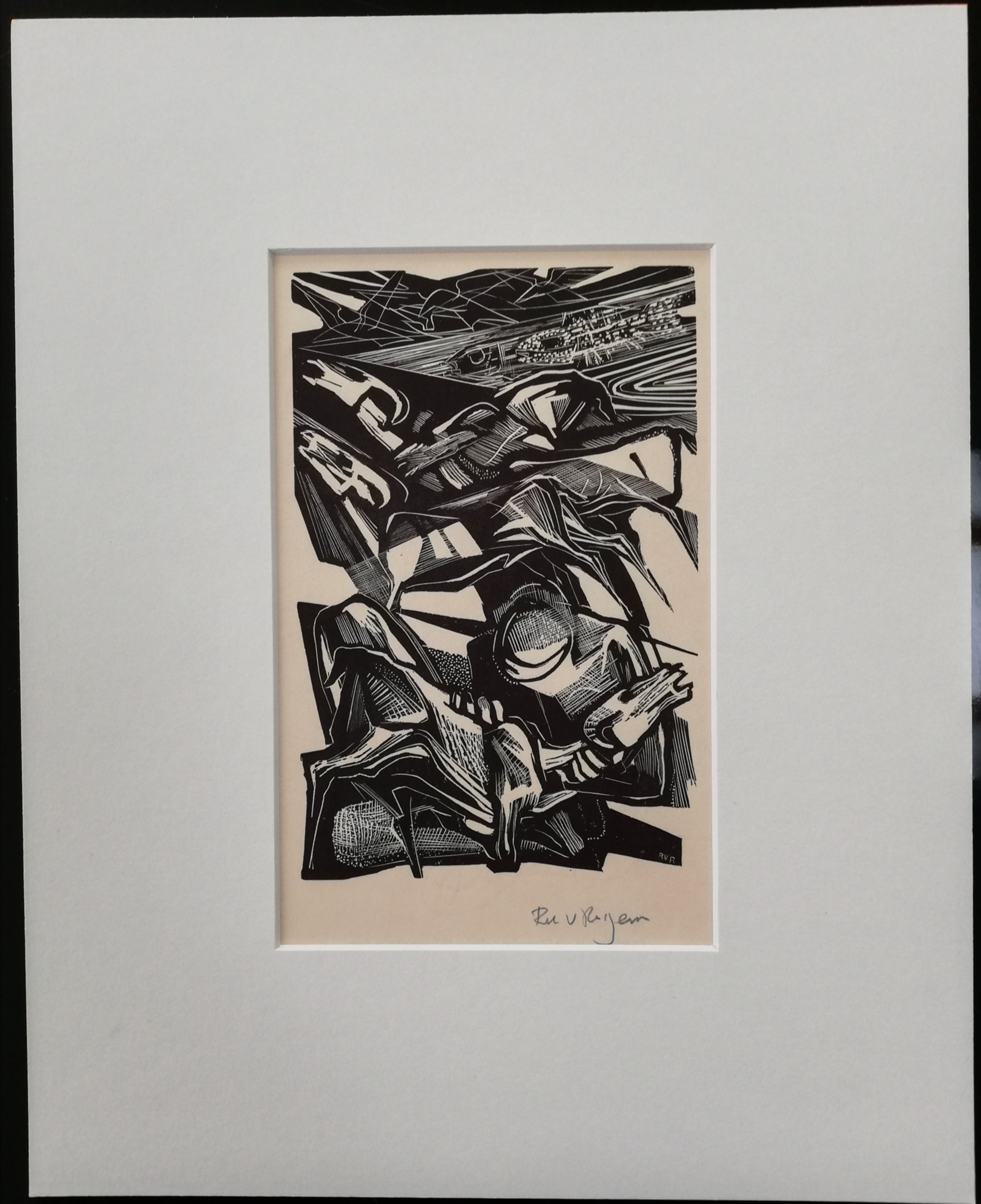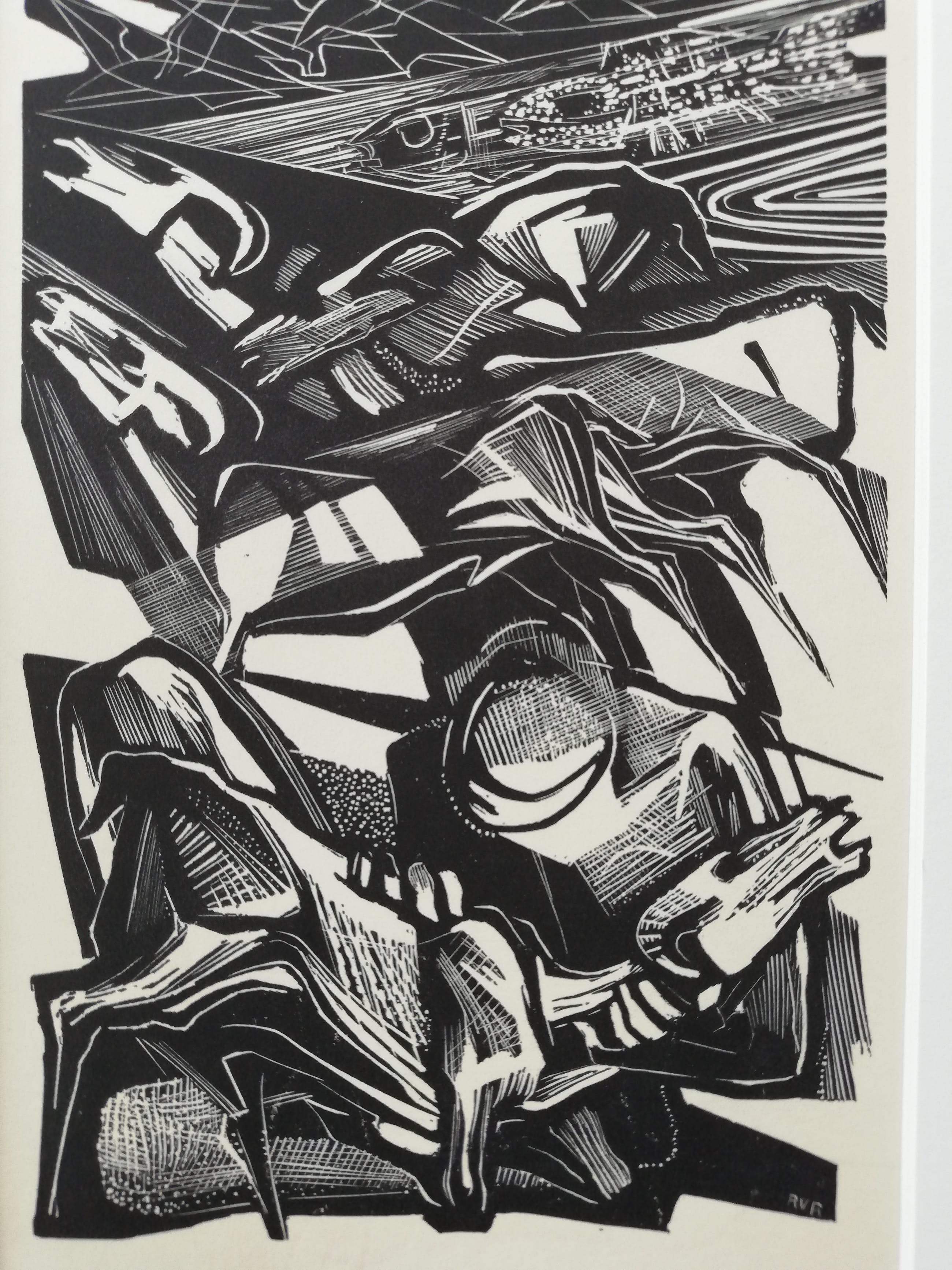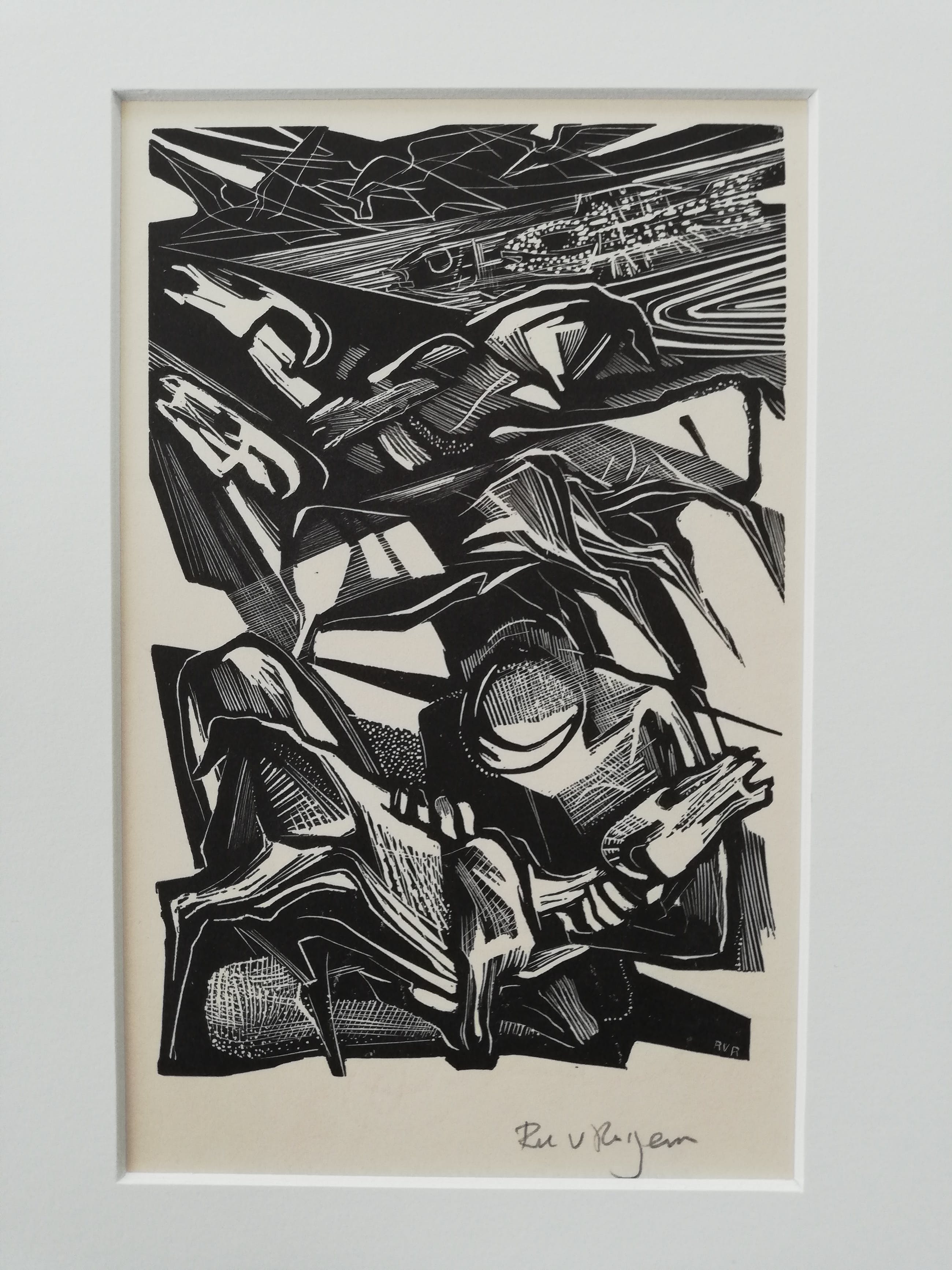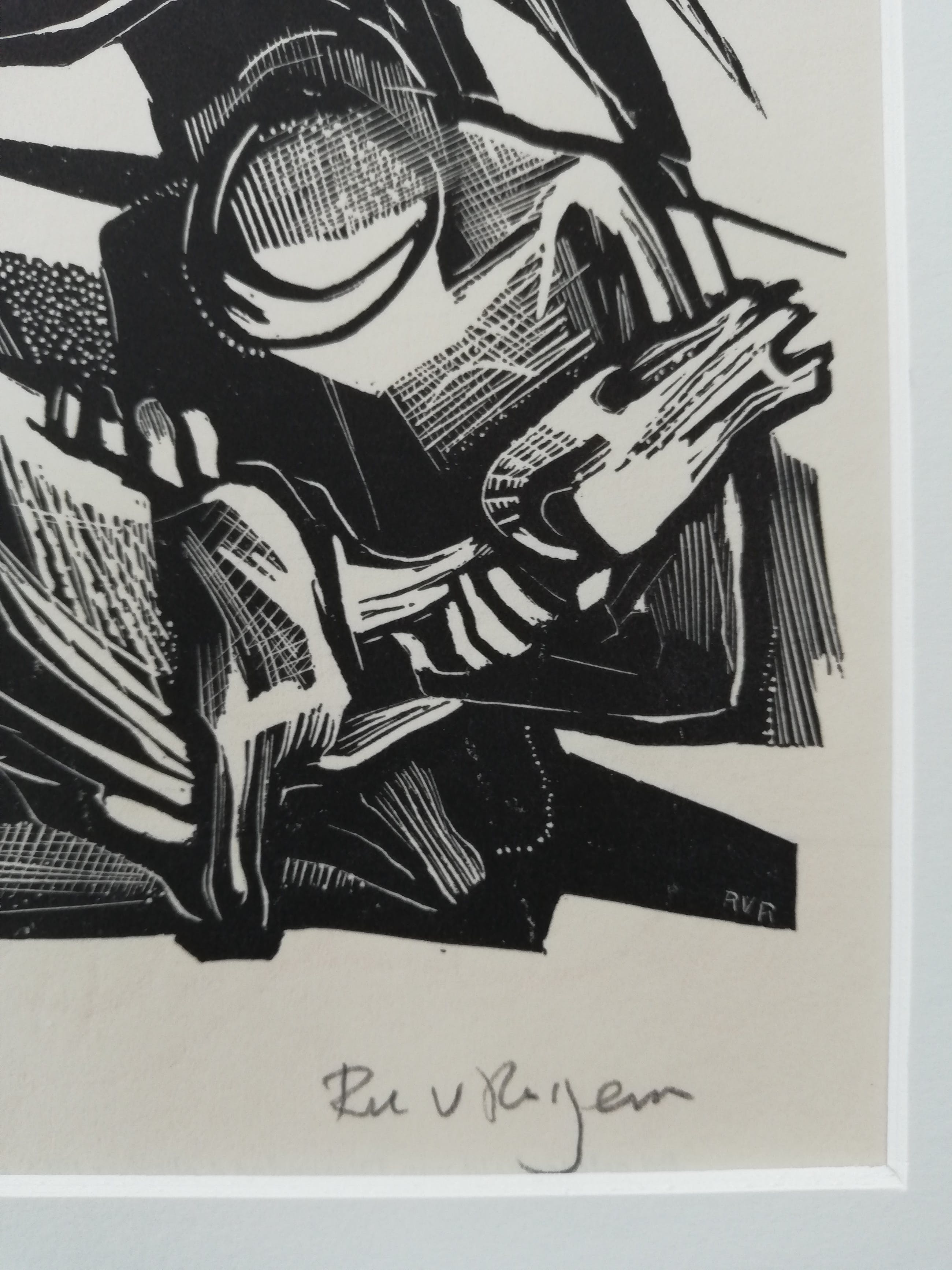 Houtsnede met afgebeeld een aantal geabstraheerde dieren. Van Ru van Rossem uit 1966. Handgesigneerd en in zeer nette staat. In passepartout. Afkomstig uit nalatenschap van de kunstenaar.