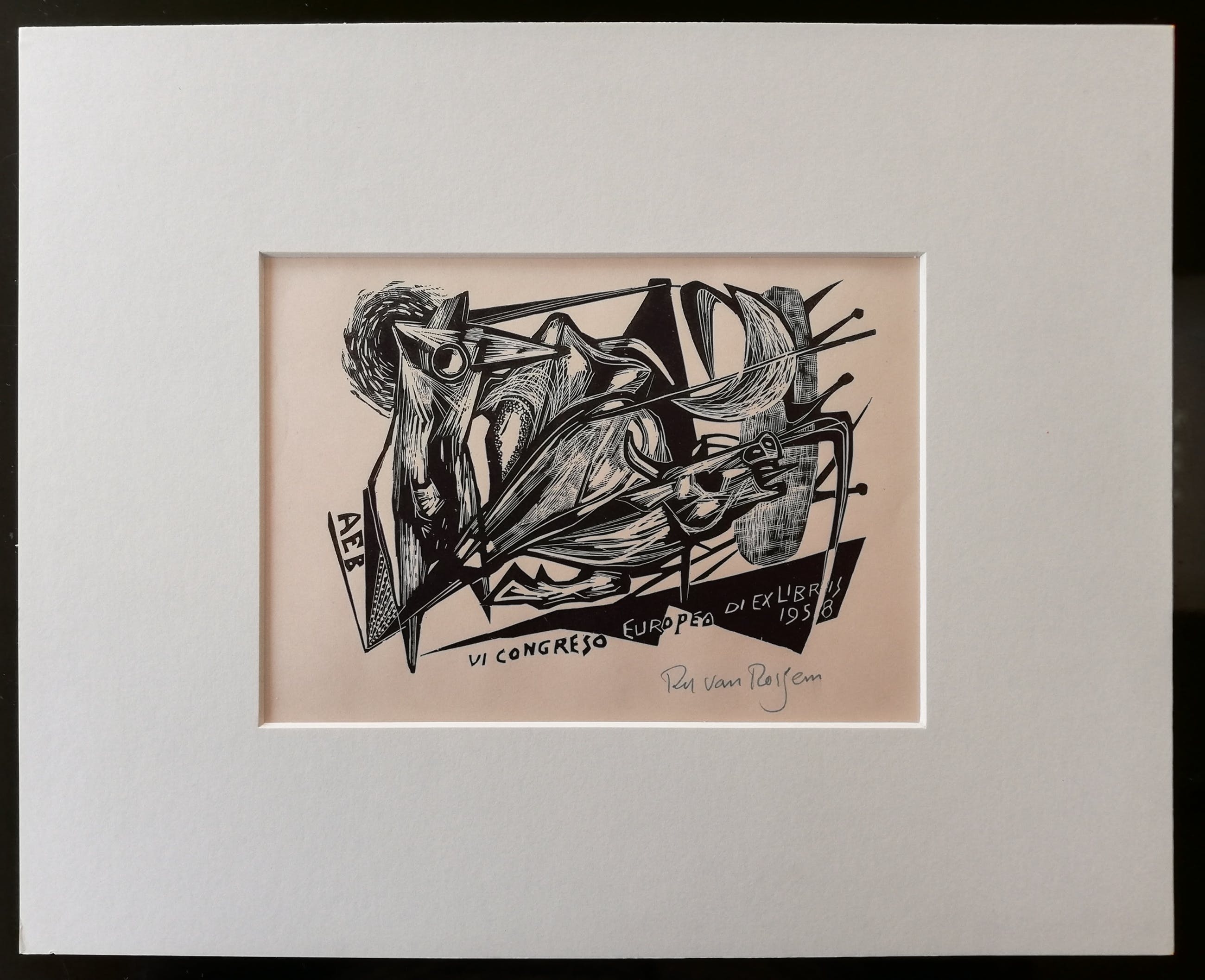 Houtsnede vervaardigd voor het Europese congres over de exlibris, door meester etser Ru van Rossem in 1958. Handgesigneerd en in zeer nette staat. In passepartout. Afkomstig uit nalatenschap van de kunstenaar.