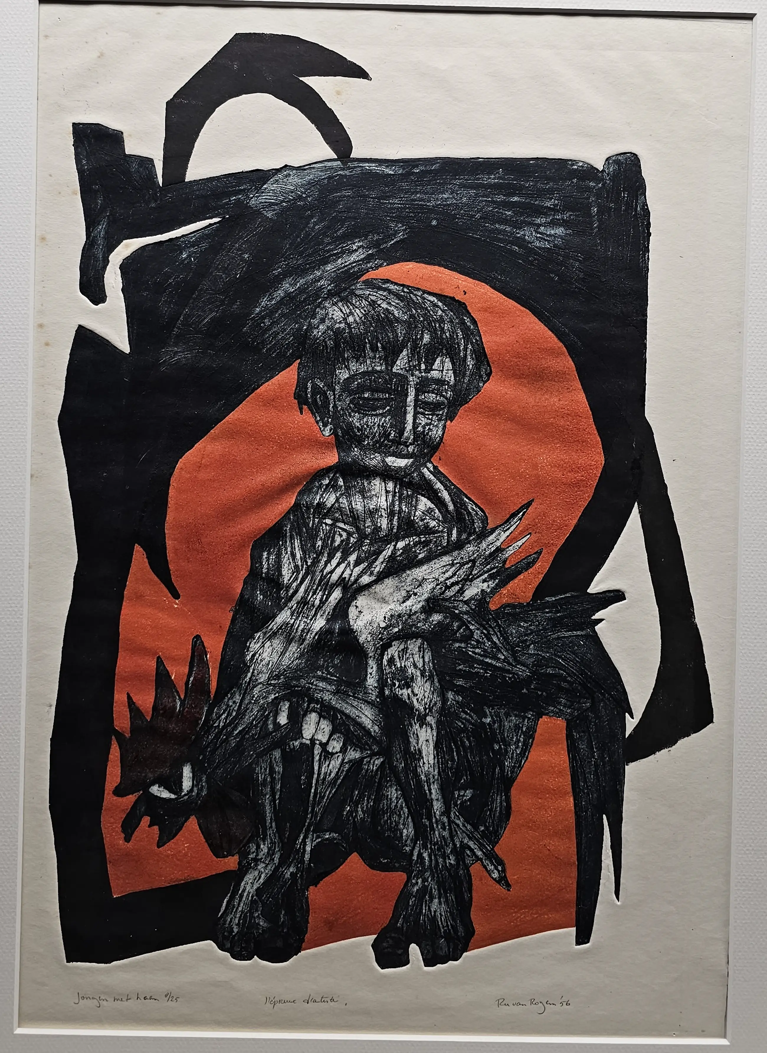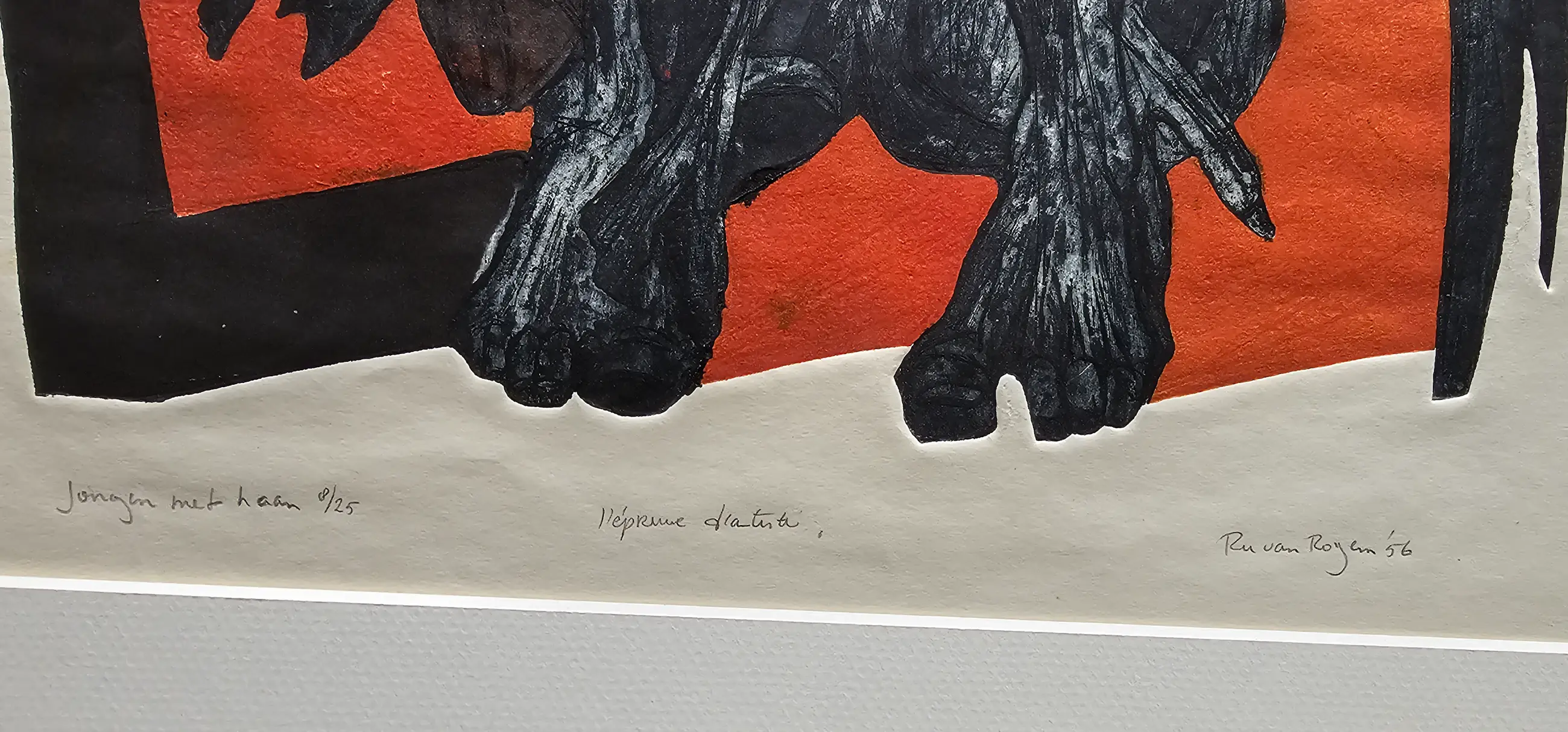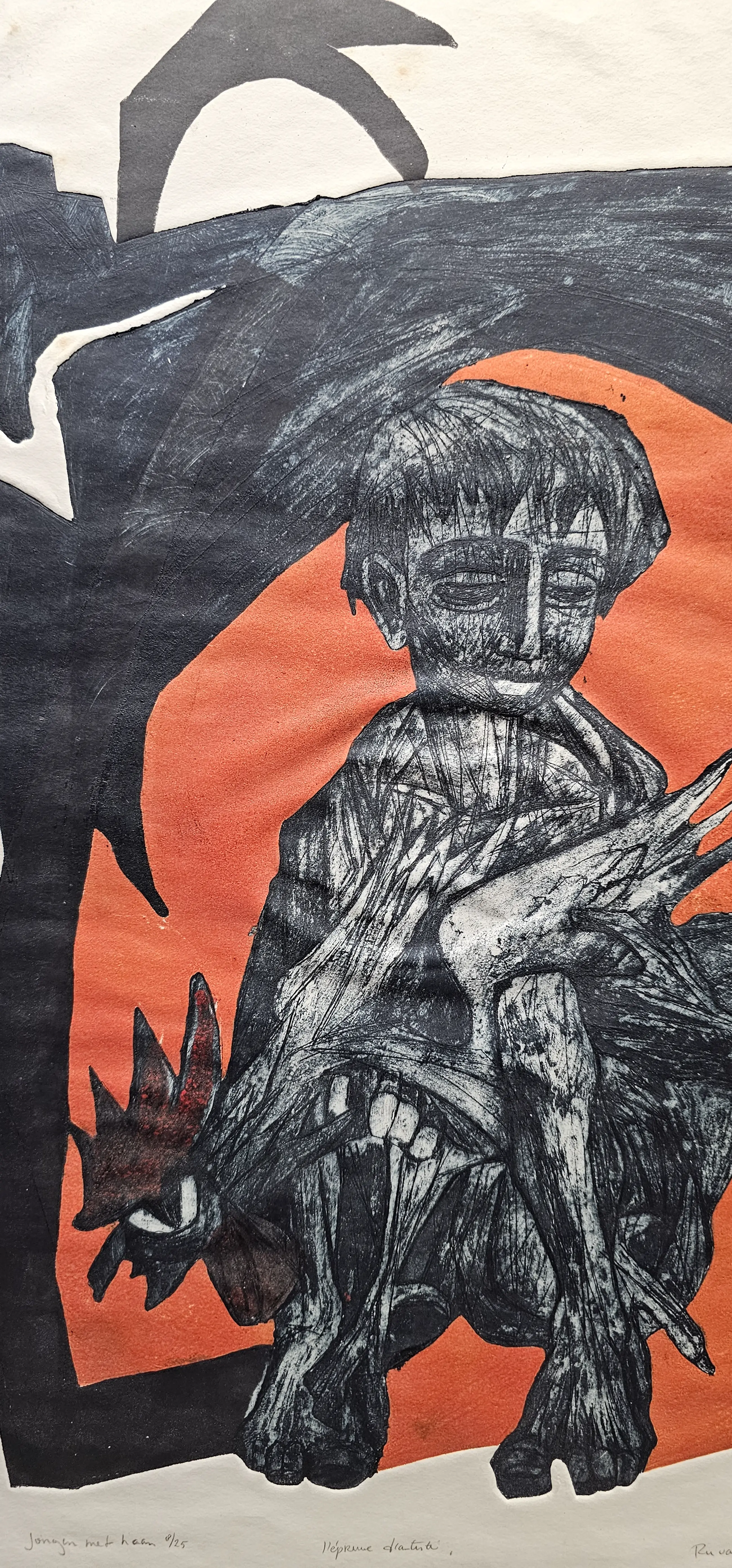 Ru van Rossum Jongen met haan Enpruve de artiste reliefdruk.