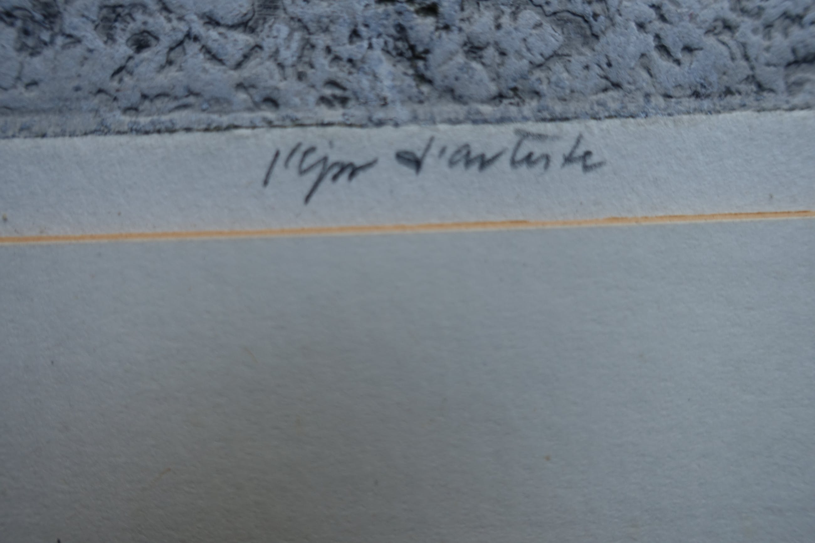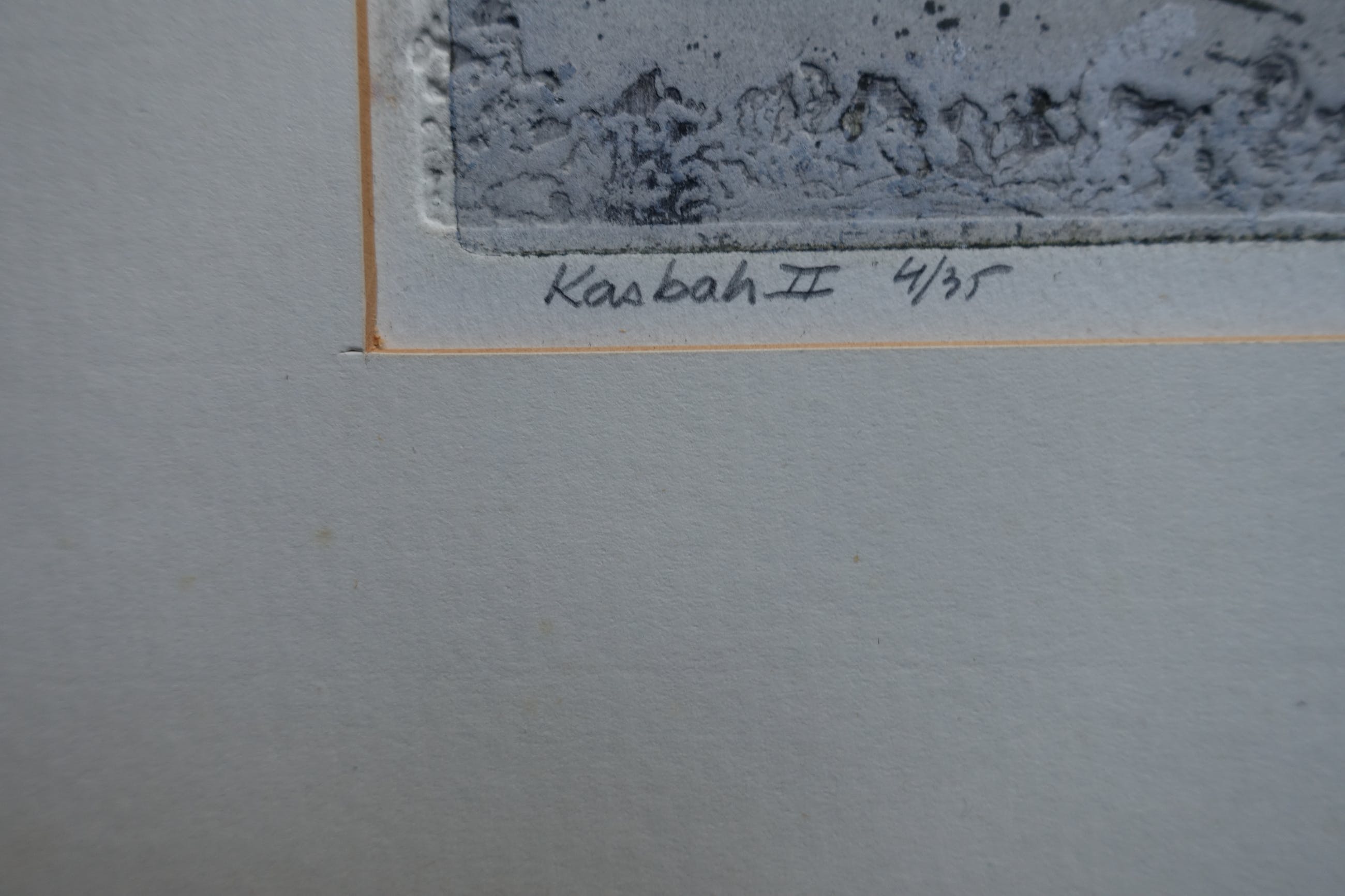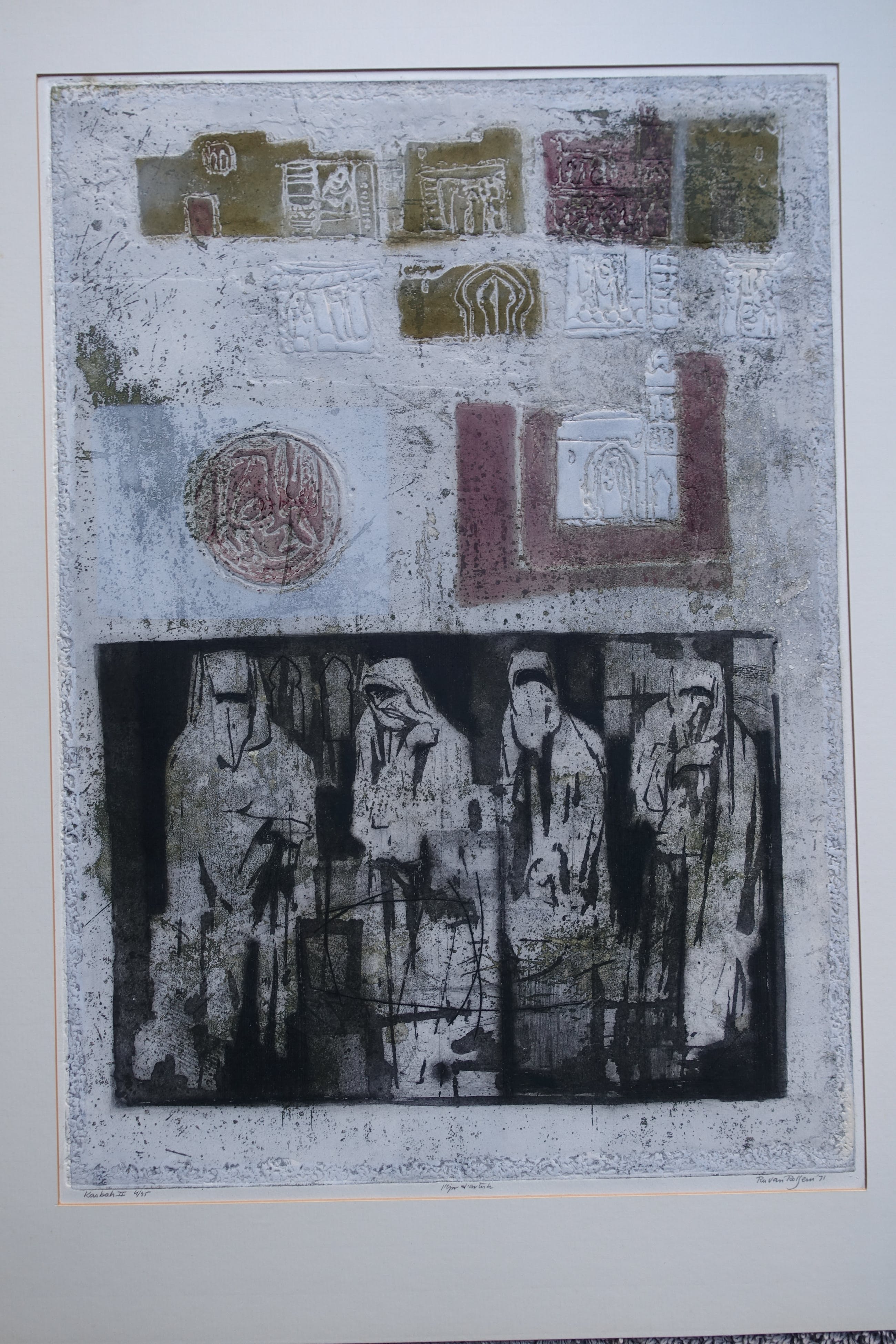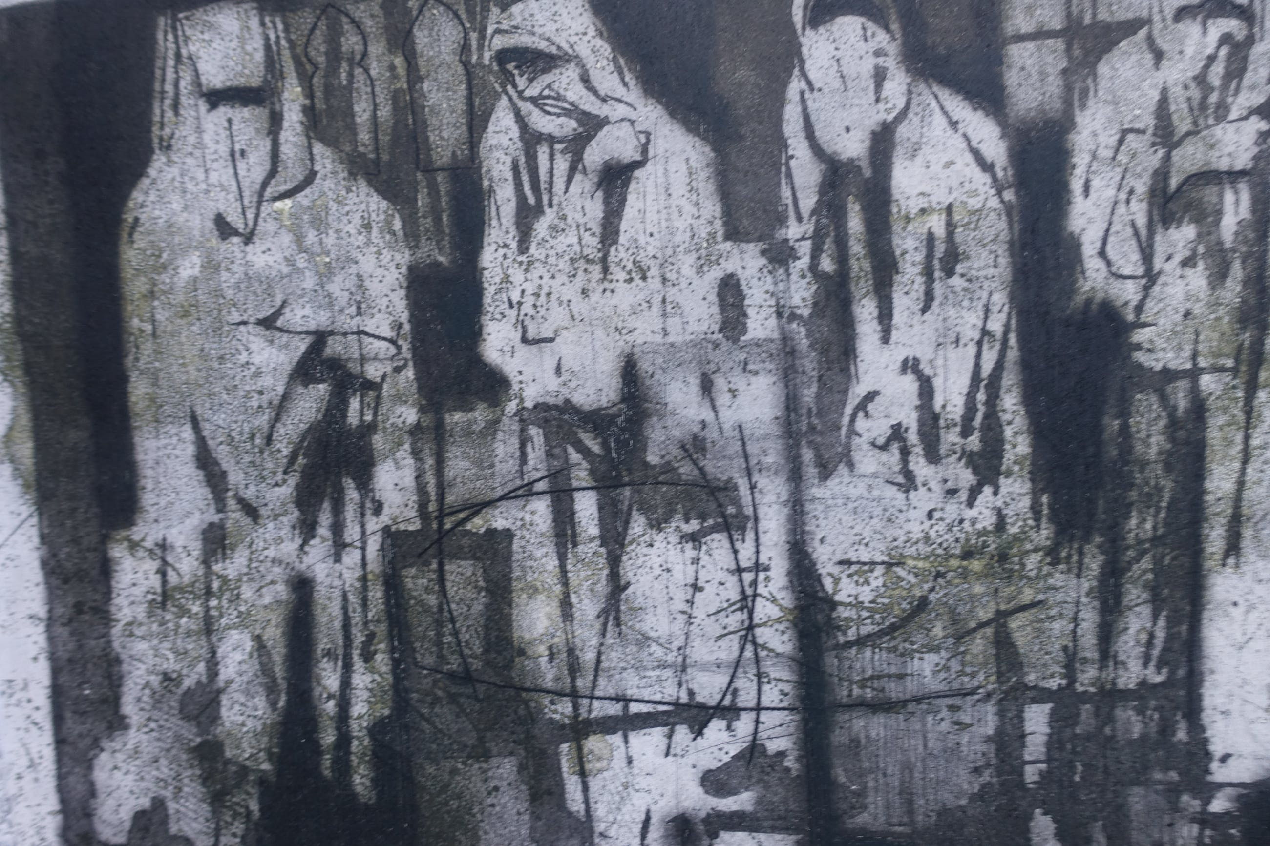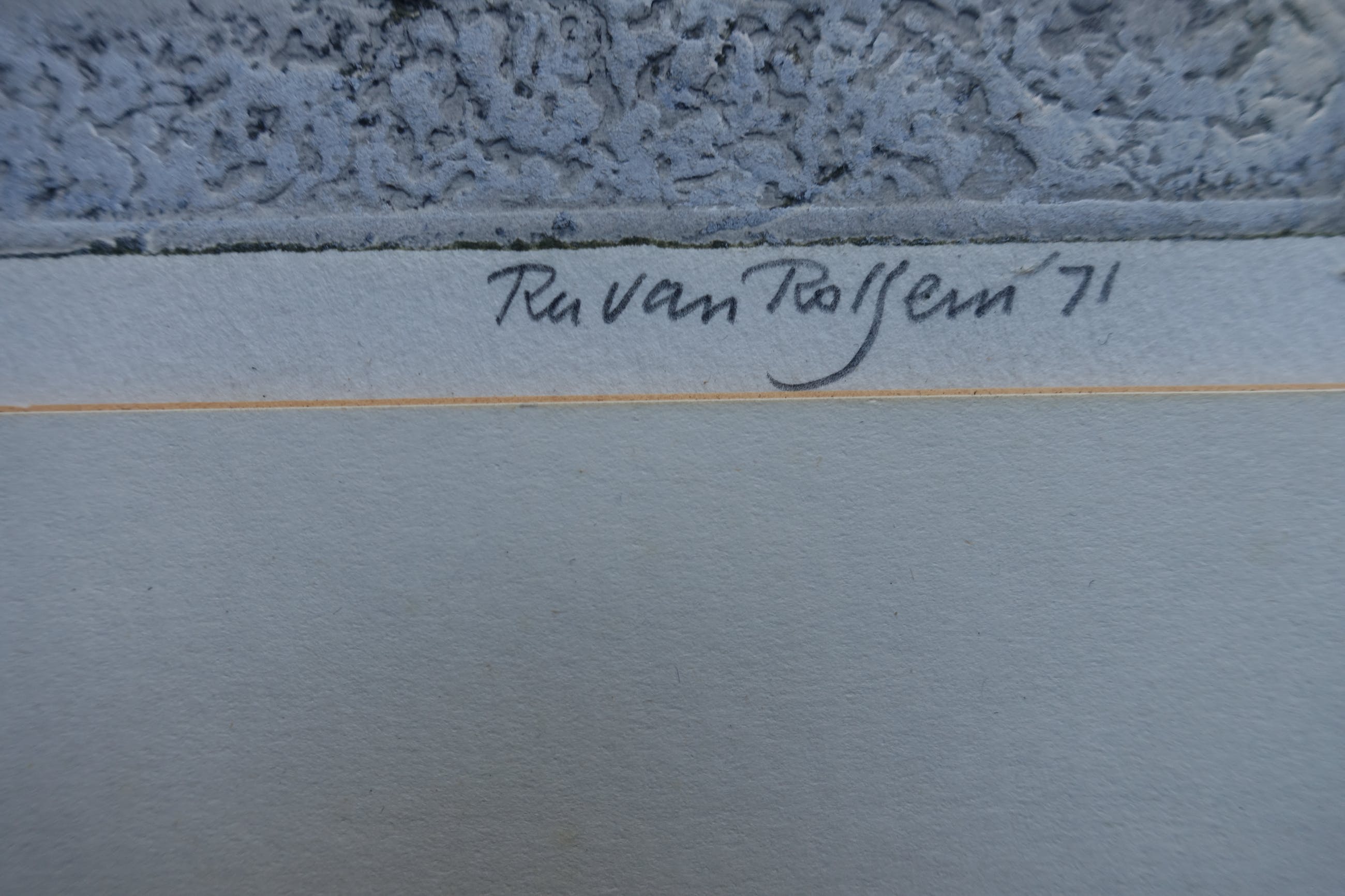 Karakteristiek werk van Ru van Rossem uit het begin van de zeventiger jaren. Expressieve ets-aquatint met veel reliëf. Kleine oplage (4/35) en gesigneerd en betiteld met potlood.