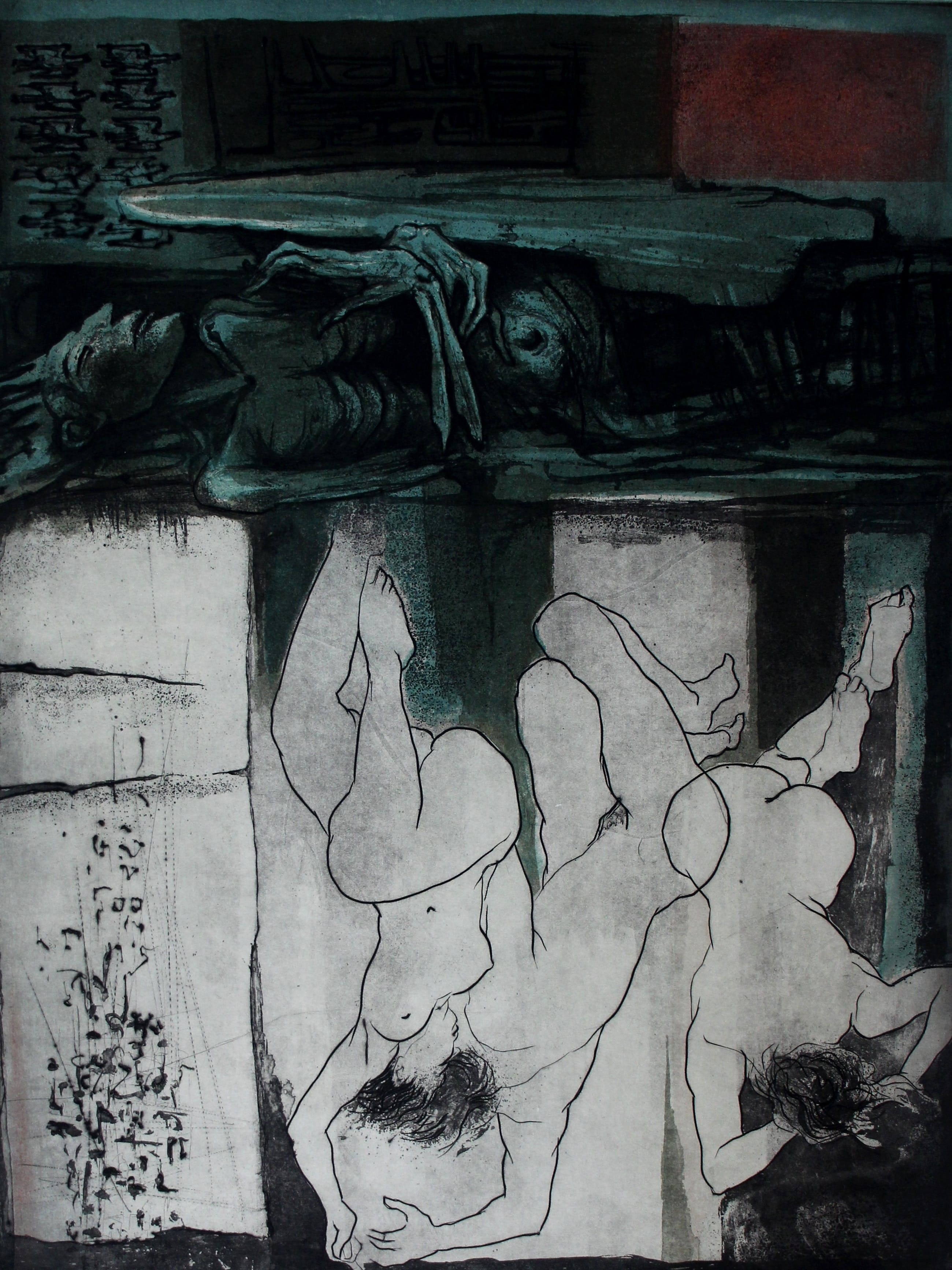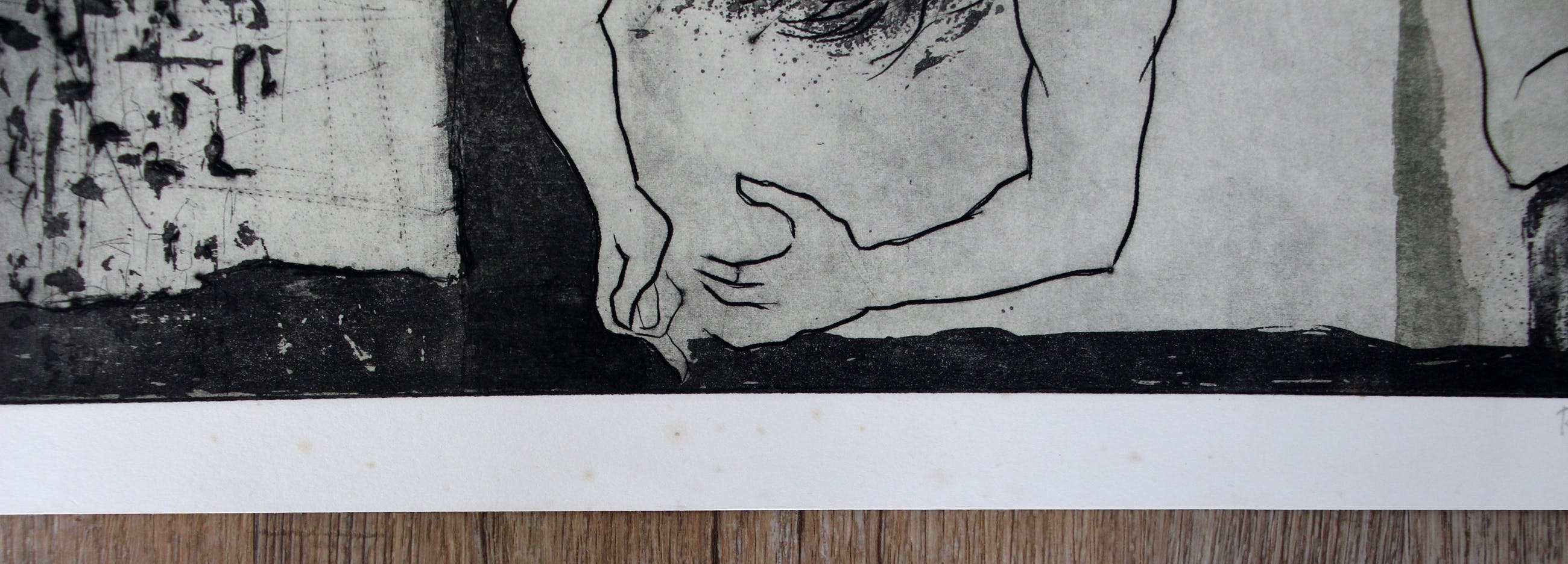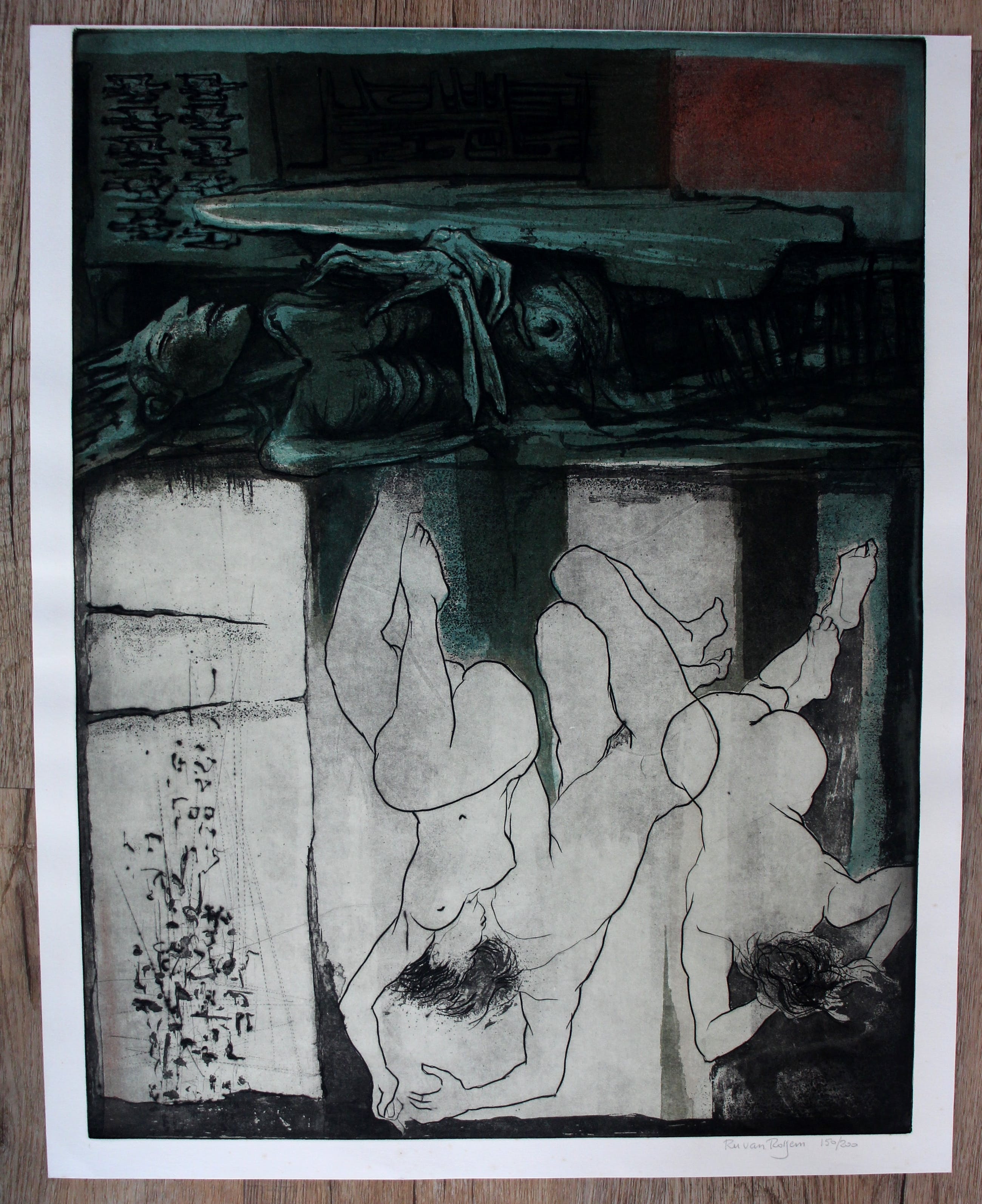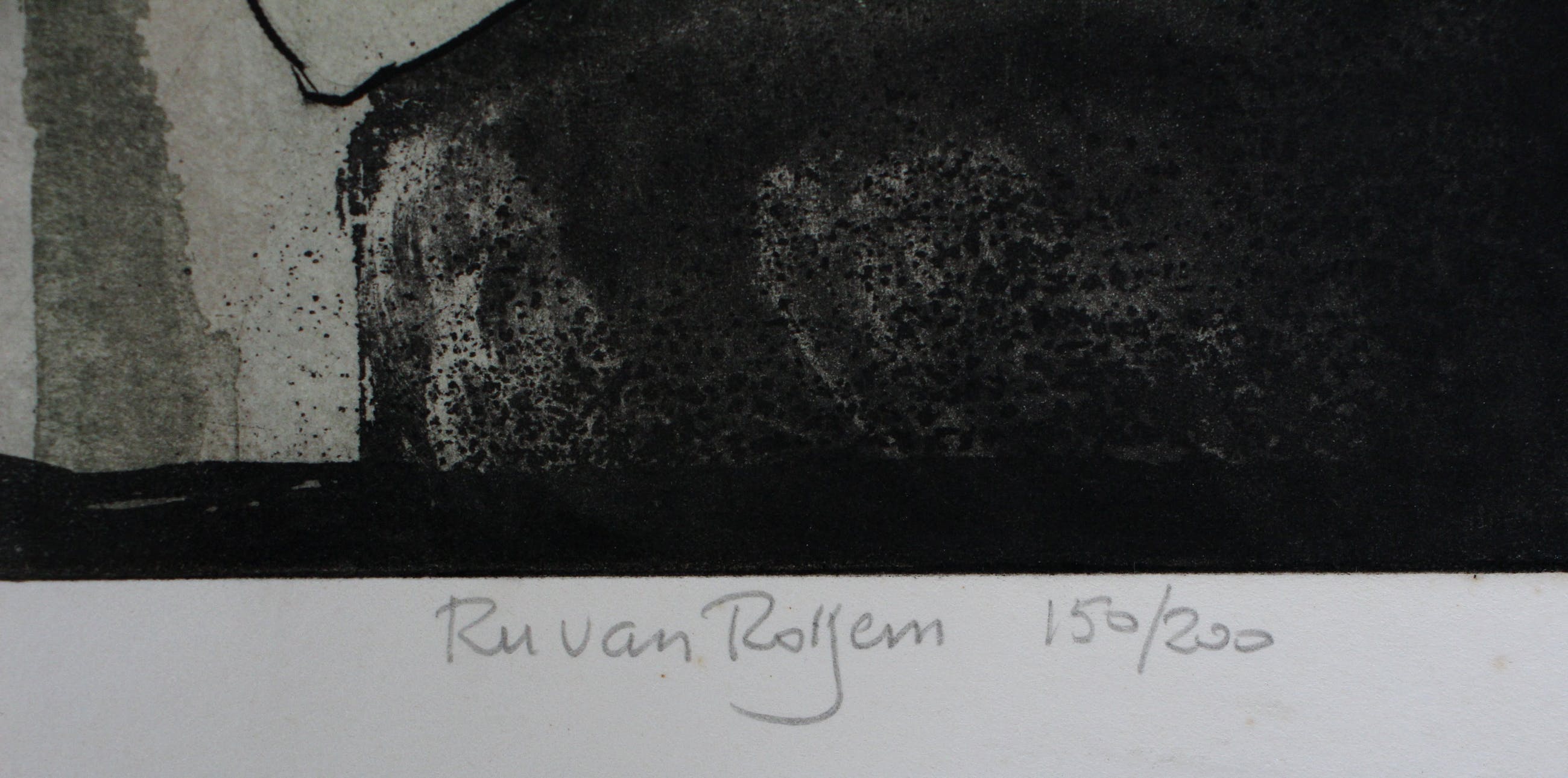 Mooie ets van Ru van Rossem uit 1982. Titel: Tombe. Nummer: 150/200. Afkomstig uit de map: "20 hedendaagse Nederlandse kunstenaars". Uitgegeven door Gin Gallery te Amsterdam.