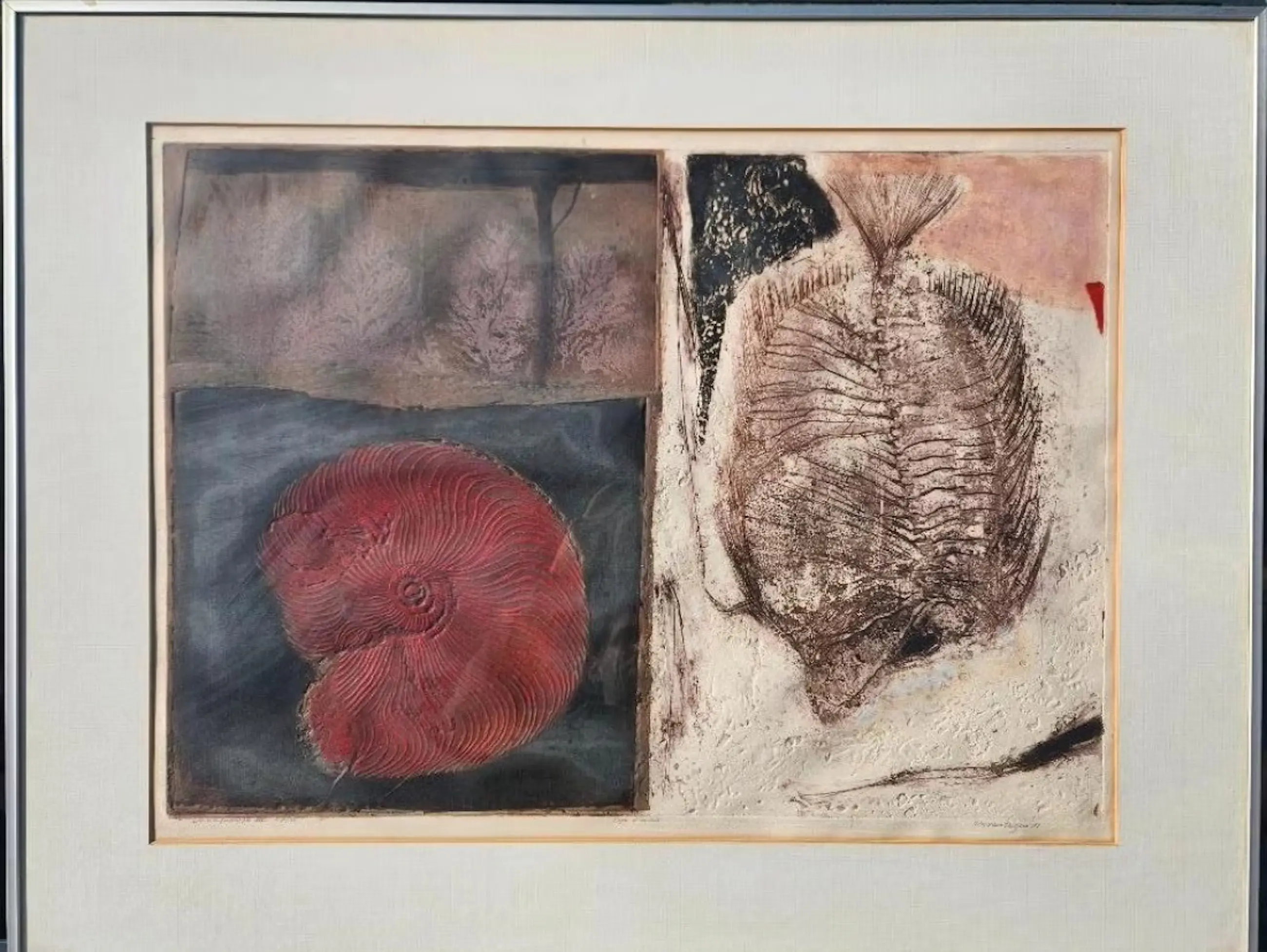 Kleurenets met reliëfdruk uit 1982. Potlood gesigneerd en gedateerd rechtsonder.