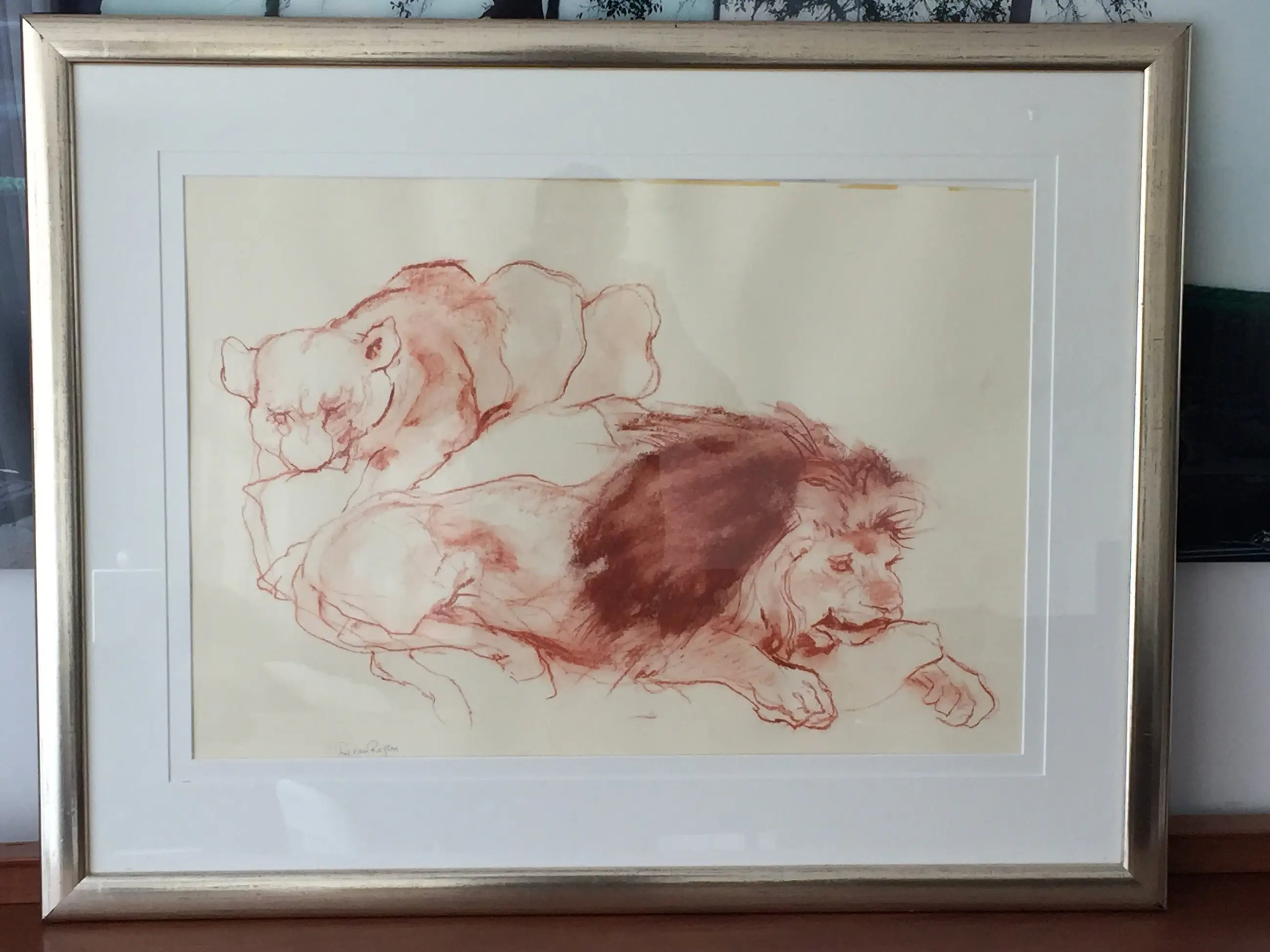 Een karaktervolle sepia krijttekening van Ru van Rossem, voorstellende een liggende leeuw en leeuwin. Het werk is uitgevoerd in een warme roodbruine tint en toont de kenmerkende losse, expressieve lijnvoering van de kunstenaar.