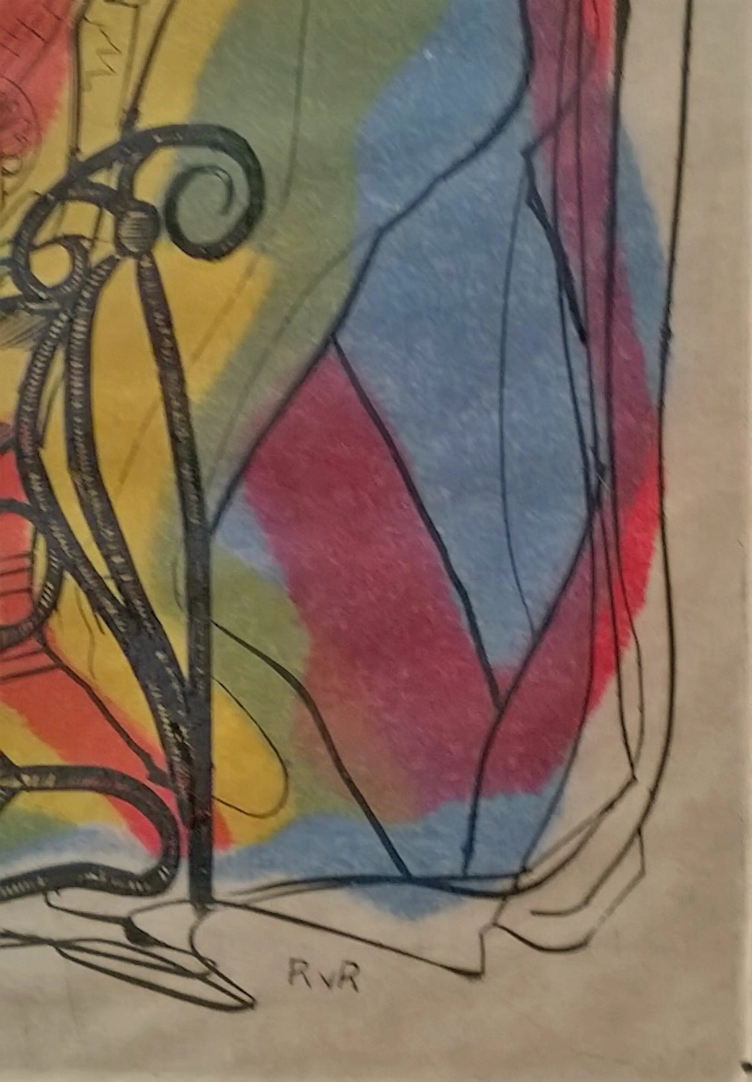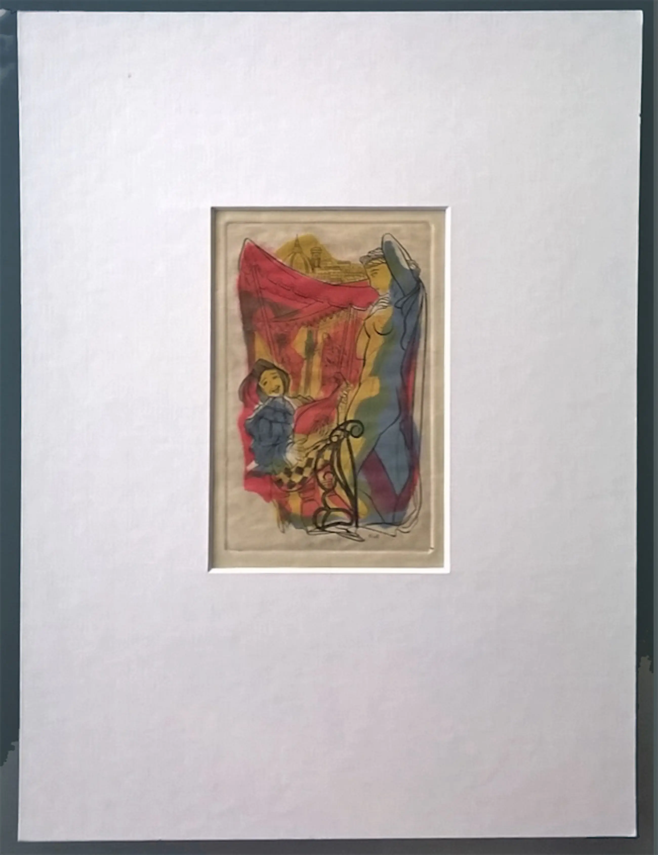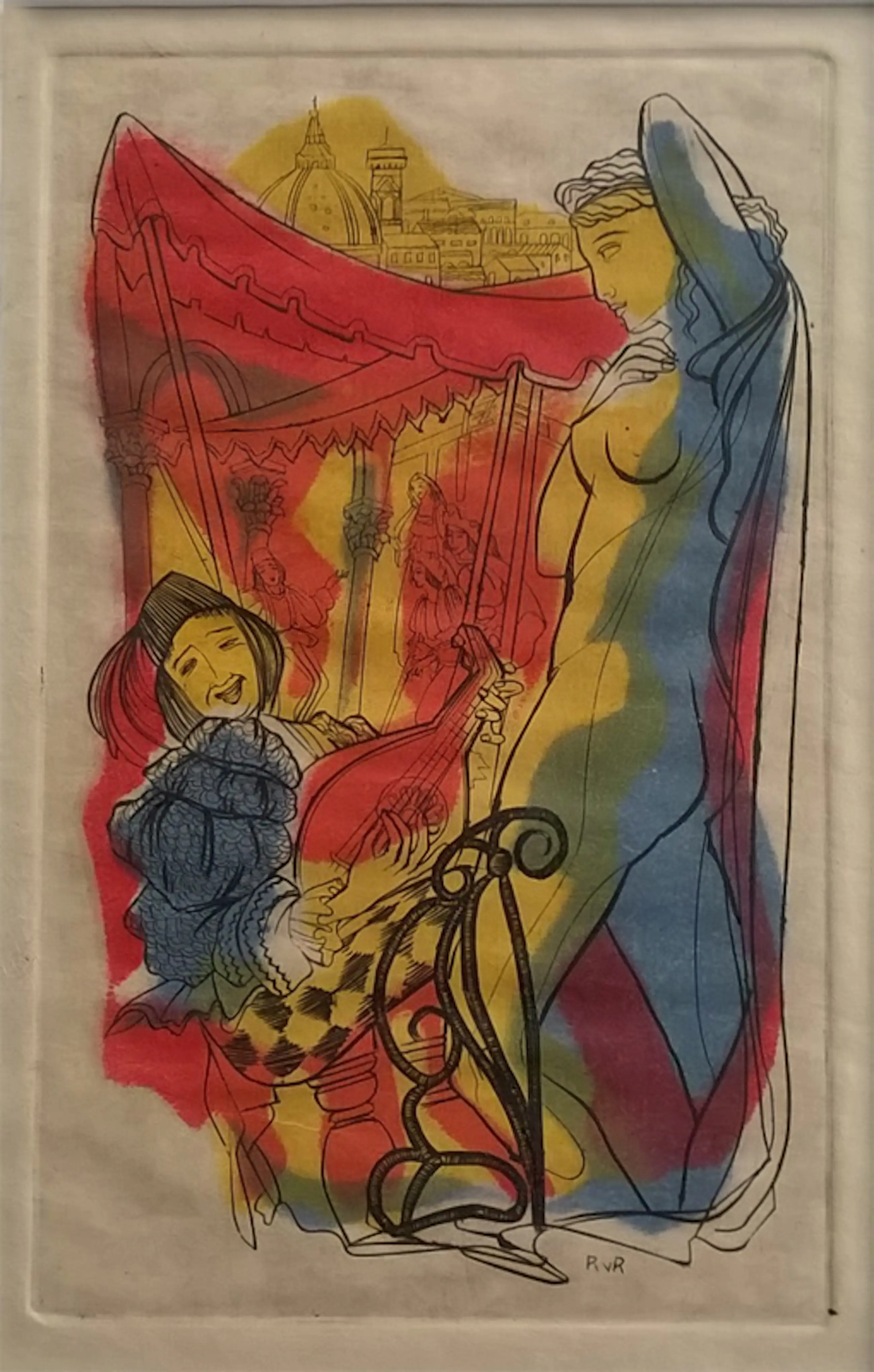 Ru van Rossem - door de kunstenaar gedrukte en ingekleurde gravure, minstreel in Venetiaanse setting*, gesigneerd in het werk met RvR. In cremewitte passe partout. Beeldmaat ca. 18 x 11 cm, totaal 40 x 30 cm. Zeer goede staat.