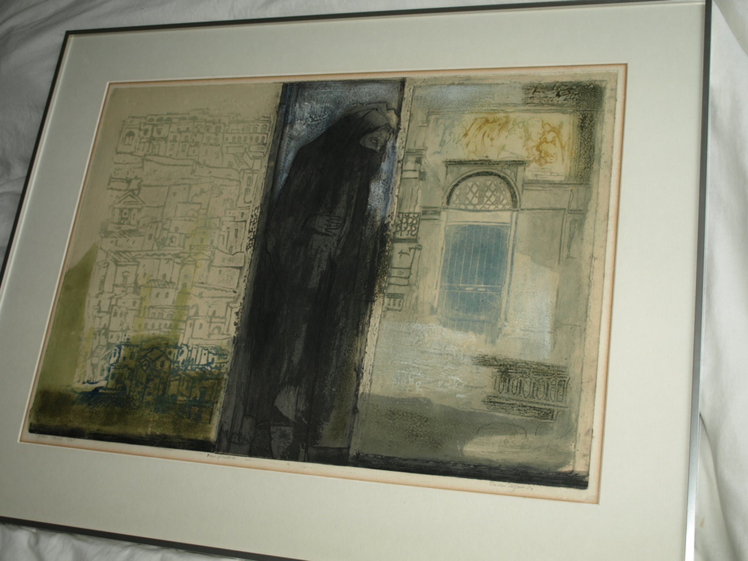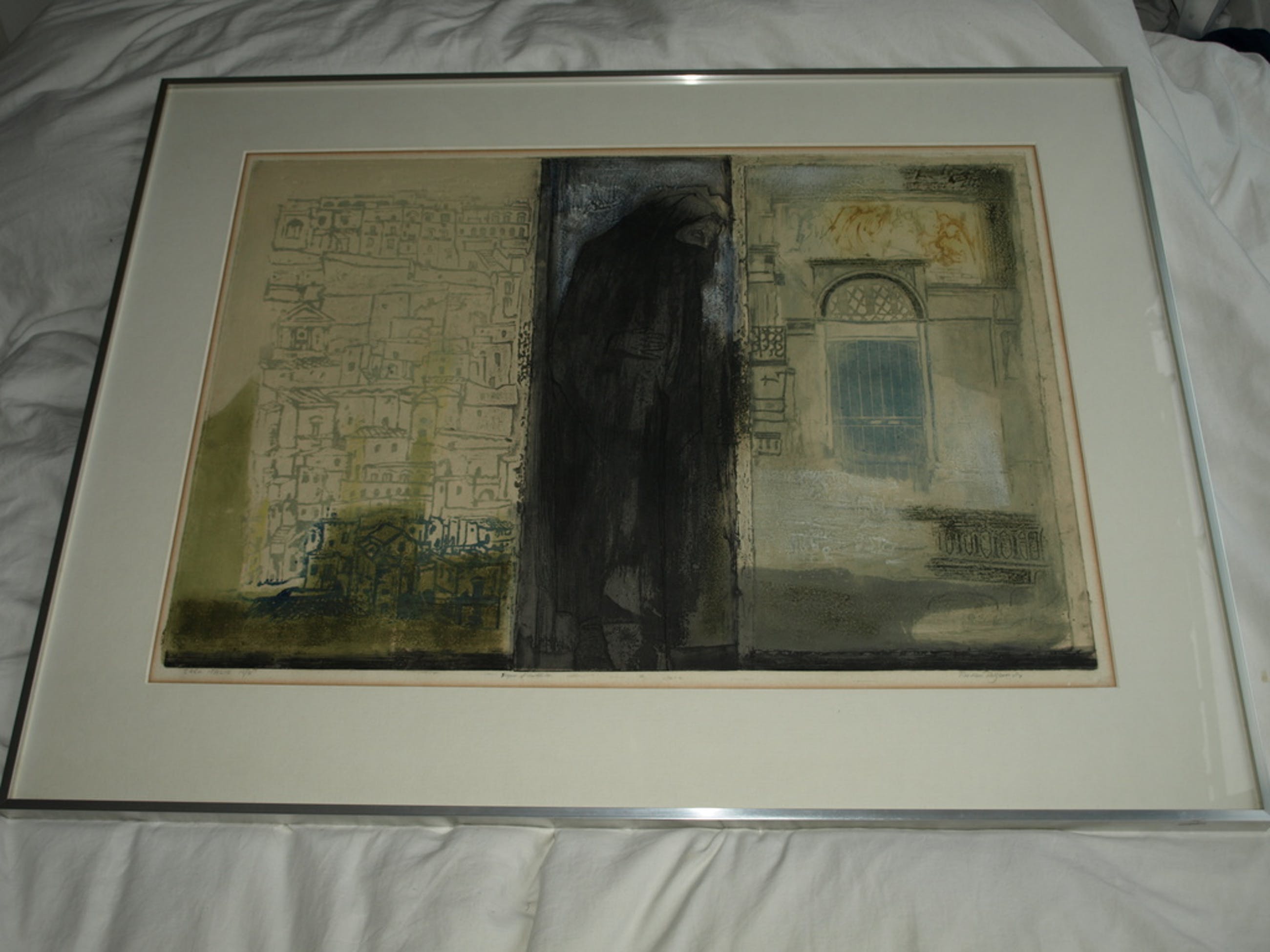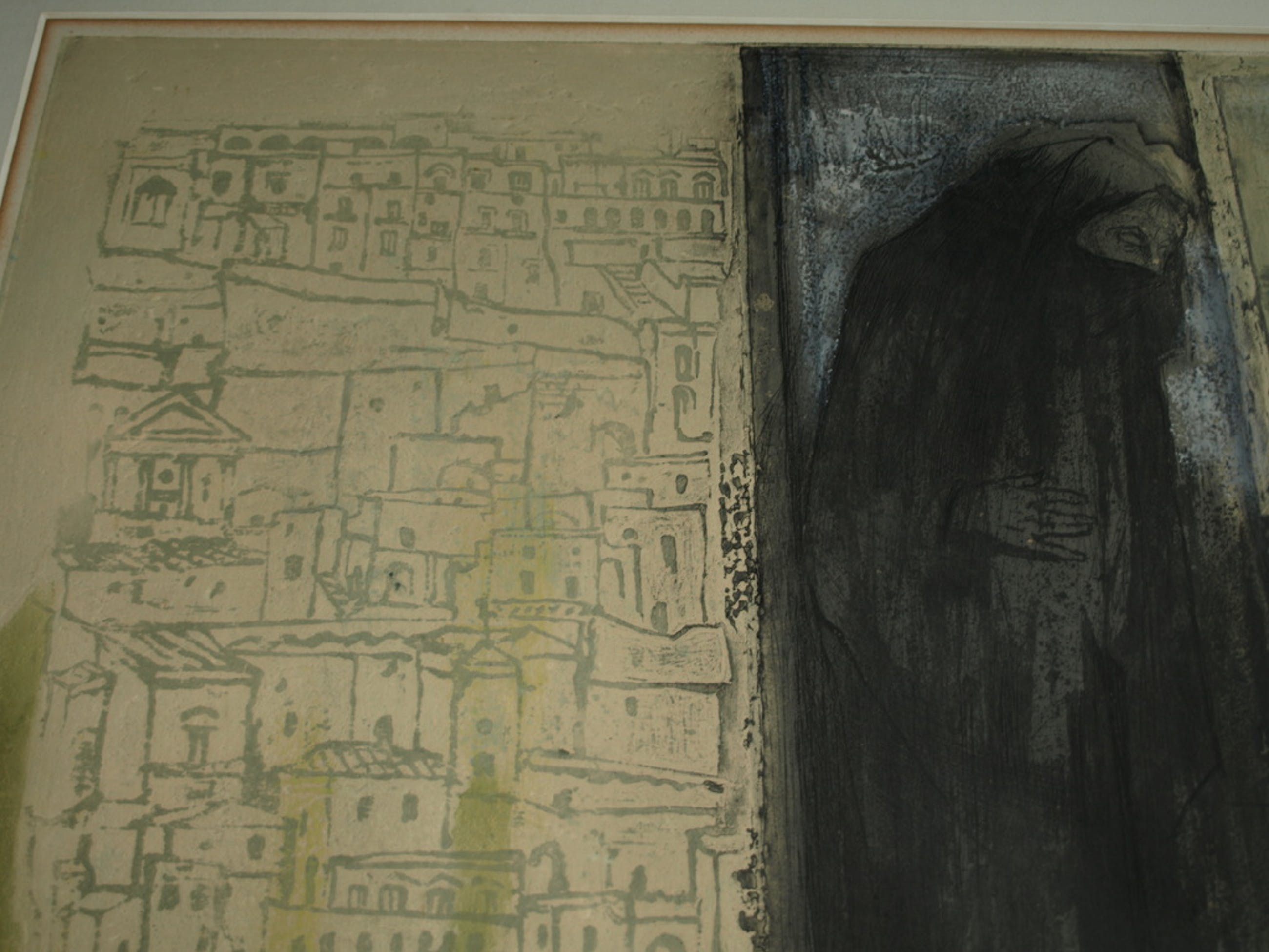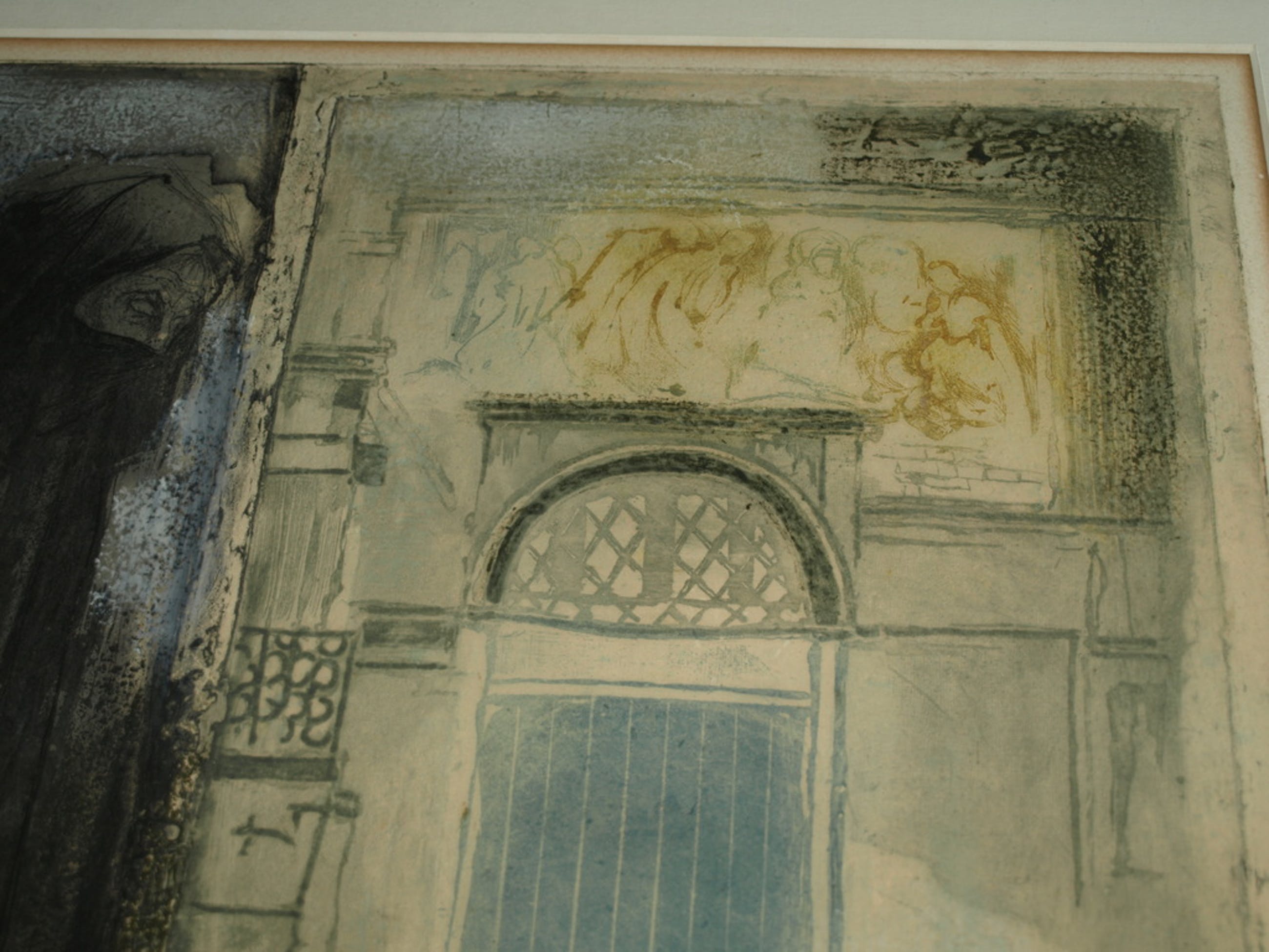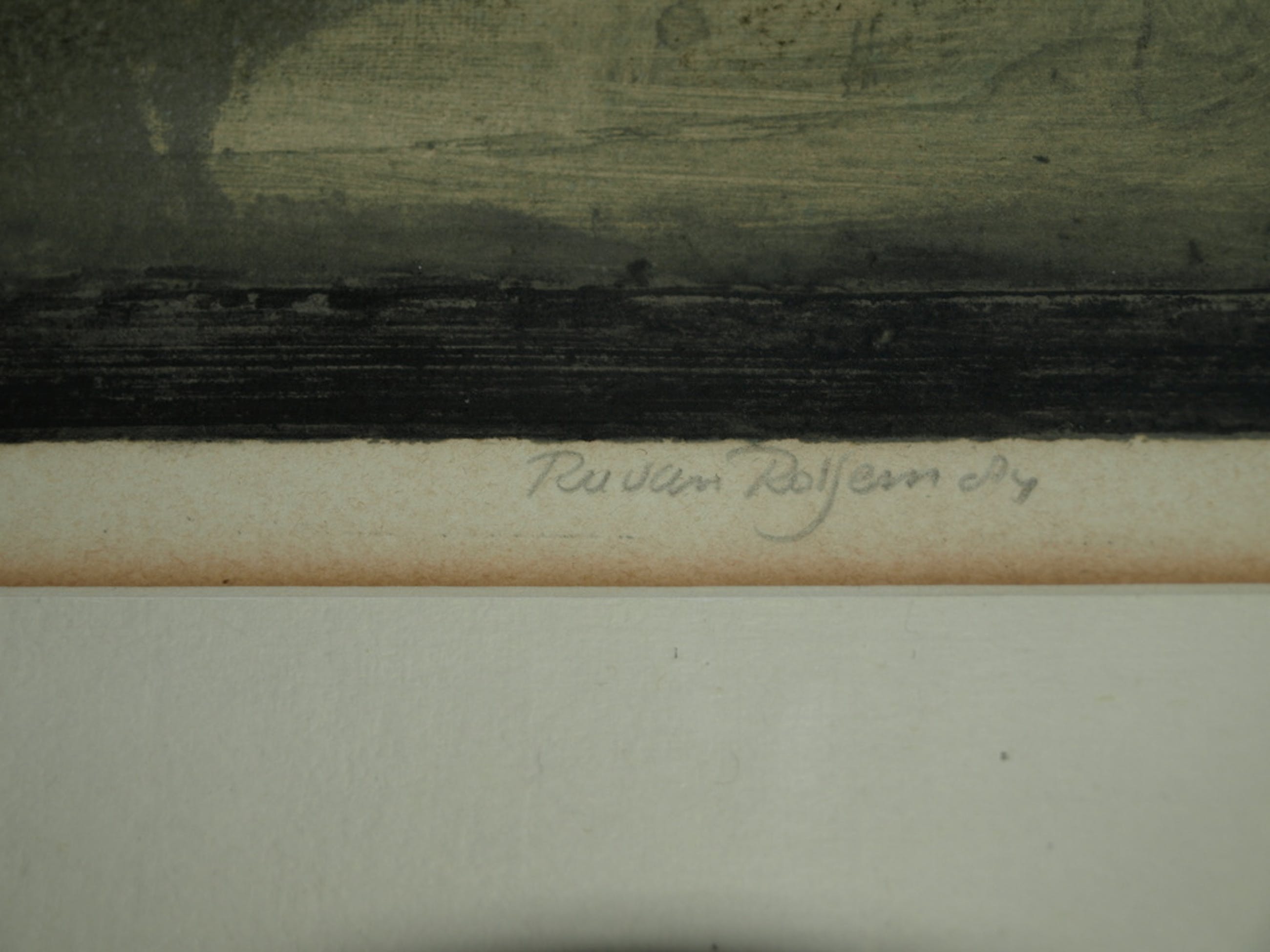 Een grote ingelijste ets met reliëfdruk uit 1984 van de Nederlandse kunstenaar Ru van Rossem.