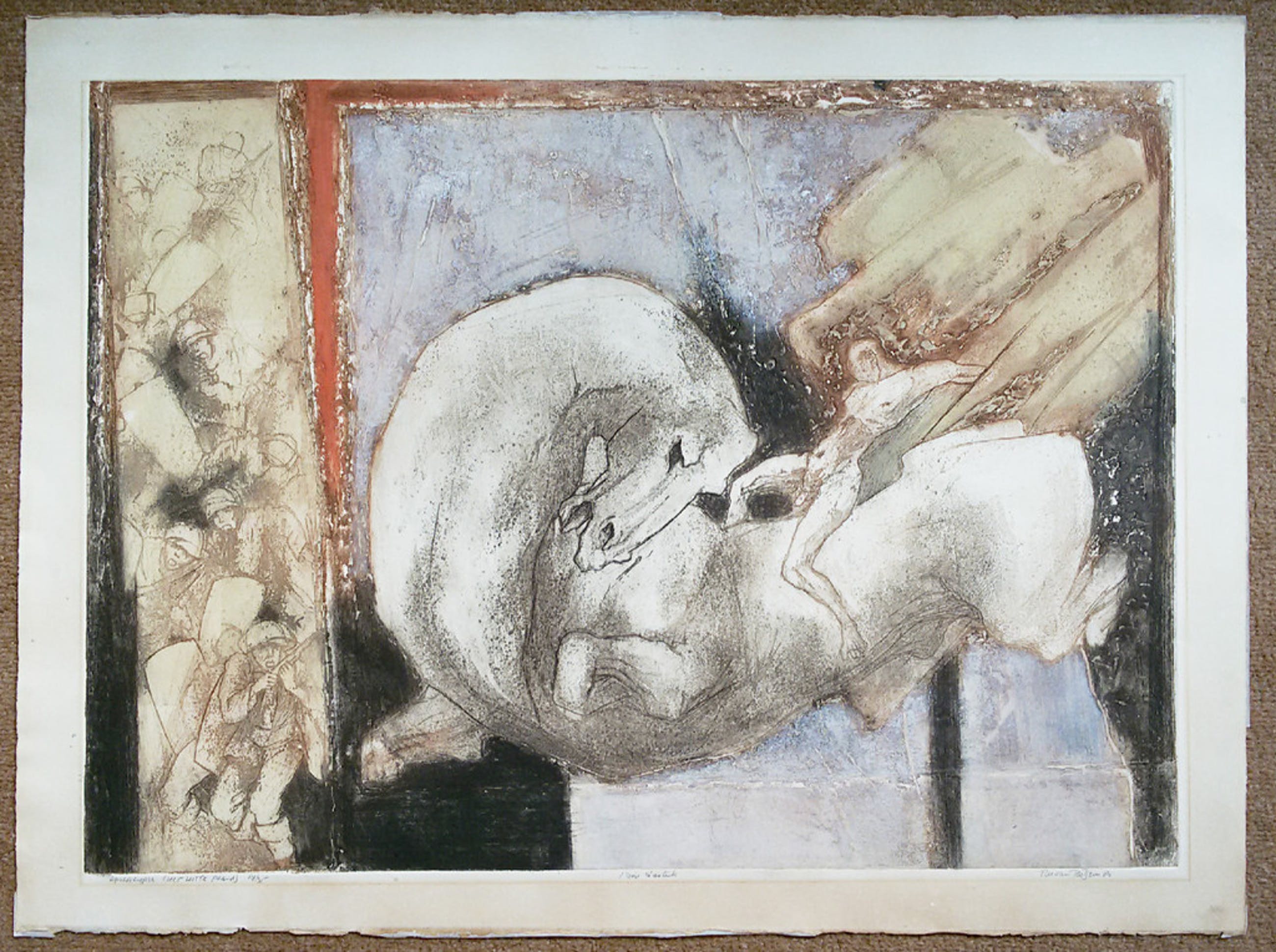 Zeer mooie ets van Ru van Rossem op dik geschept papier. Met potlood gesigneerd, gedateerd (’80), getiteld en genummerd (14/35). Afkomstig uit de kunstcollectie van ABNAMRO, in goede staat. Werk heeft ingelijst gezeten want het blad is verkleurd langs de randen van het oude passe-partout; er binnen door licht (lichte verkleuring), er buiten door het niet zuurvrij zijn van het oude passe-partout (iets donkerder). Goed ingelijst met nieuw passe-partout valt de algehele verkleuring niet of nauwelijks meer op, het etsbeeld is zeer goed.