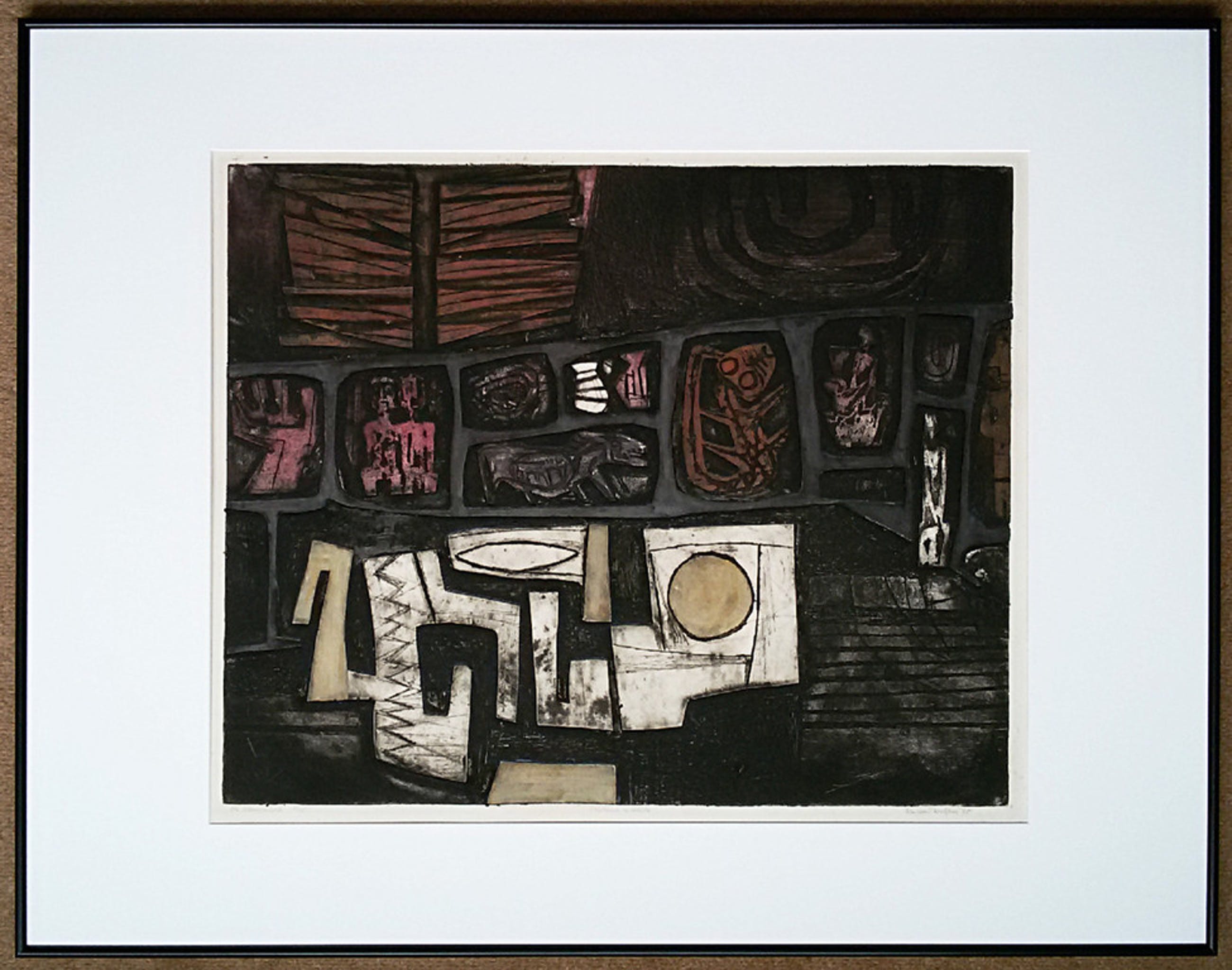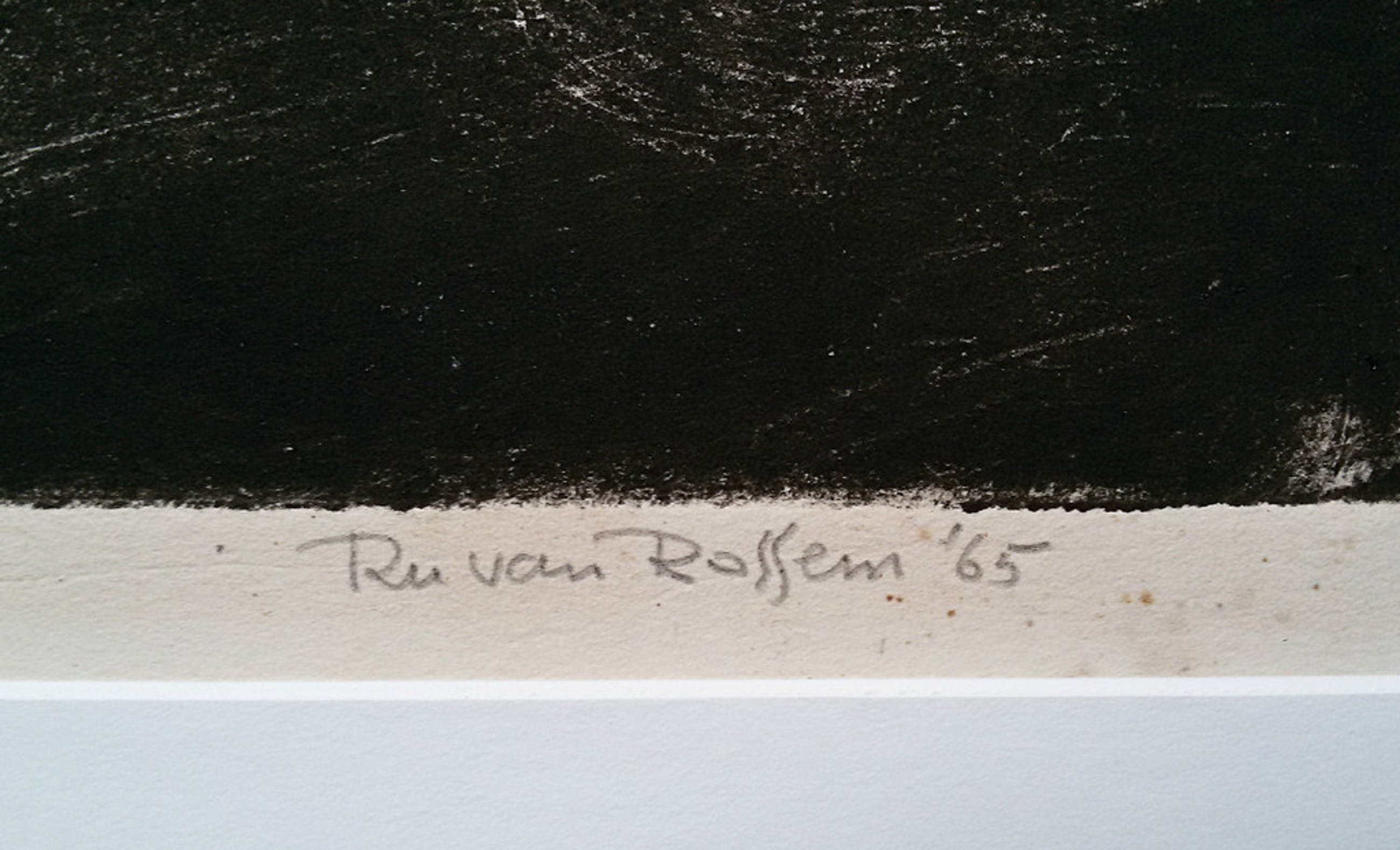 Duistere, zeer mooie ets van Ru van Rossem op dik geschept papier. Met potlood gesigneerd, gedateerd (’65), getiteld en genummerd (8/35). Prachtig ingelijst, achter glas en met smetteloos, zuurvrij passe-partout. In uitstekende conditie.