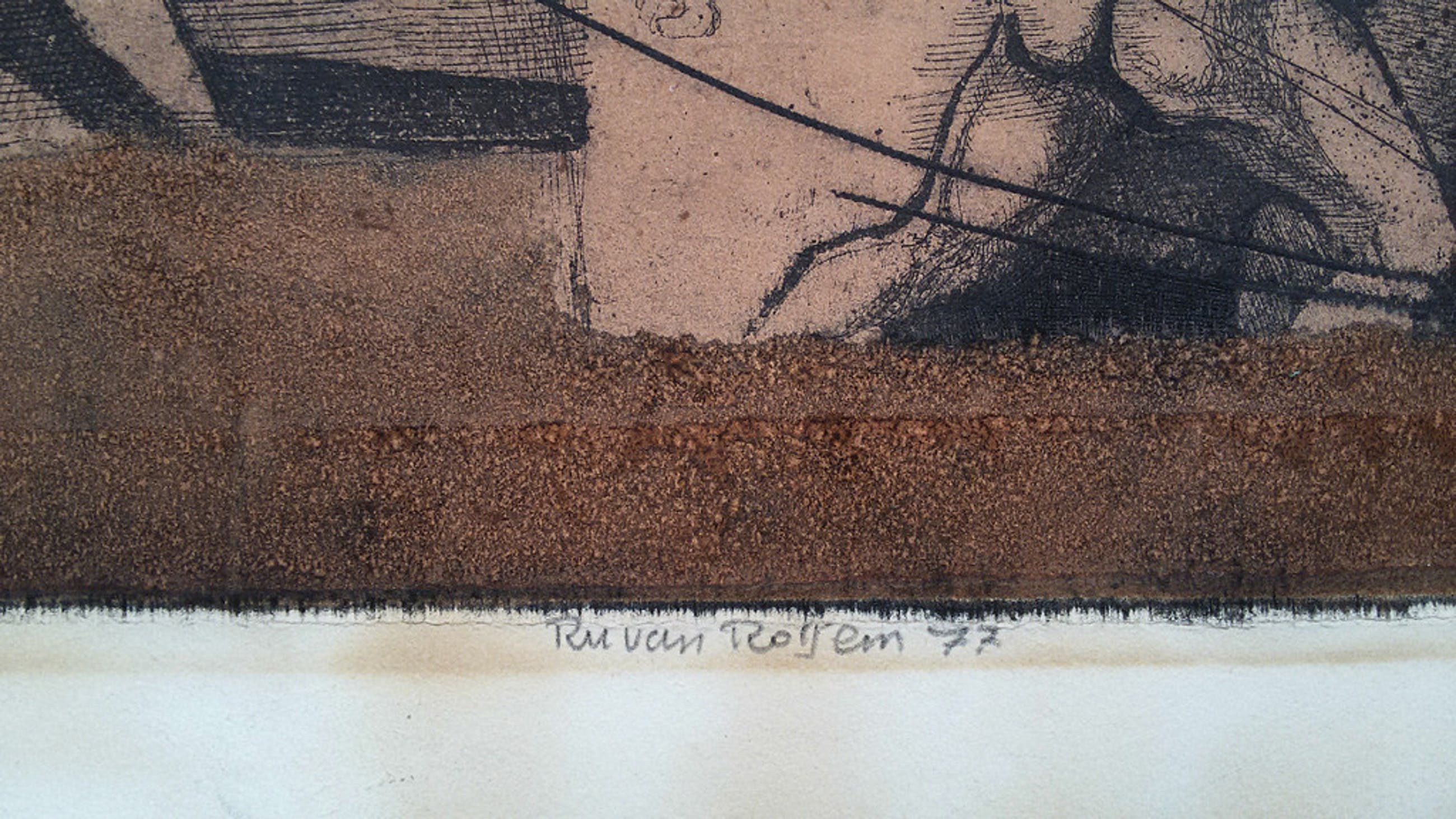 Karakteristieke ets van Ru van Rossem op dik geschept papier. Met potlood gesigneerd, gedateerd (’77), getiteld en genummerd (20/35). Afkomstig uit de kunstcollectie van ABNAMRO, in redelijke staat.