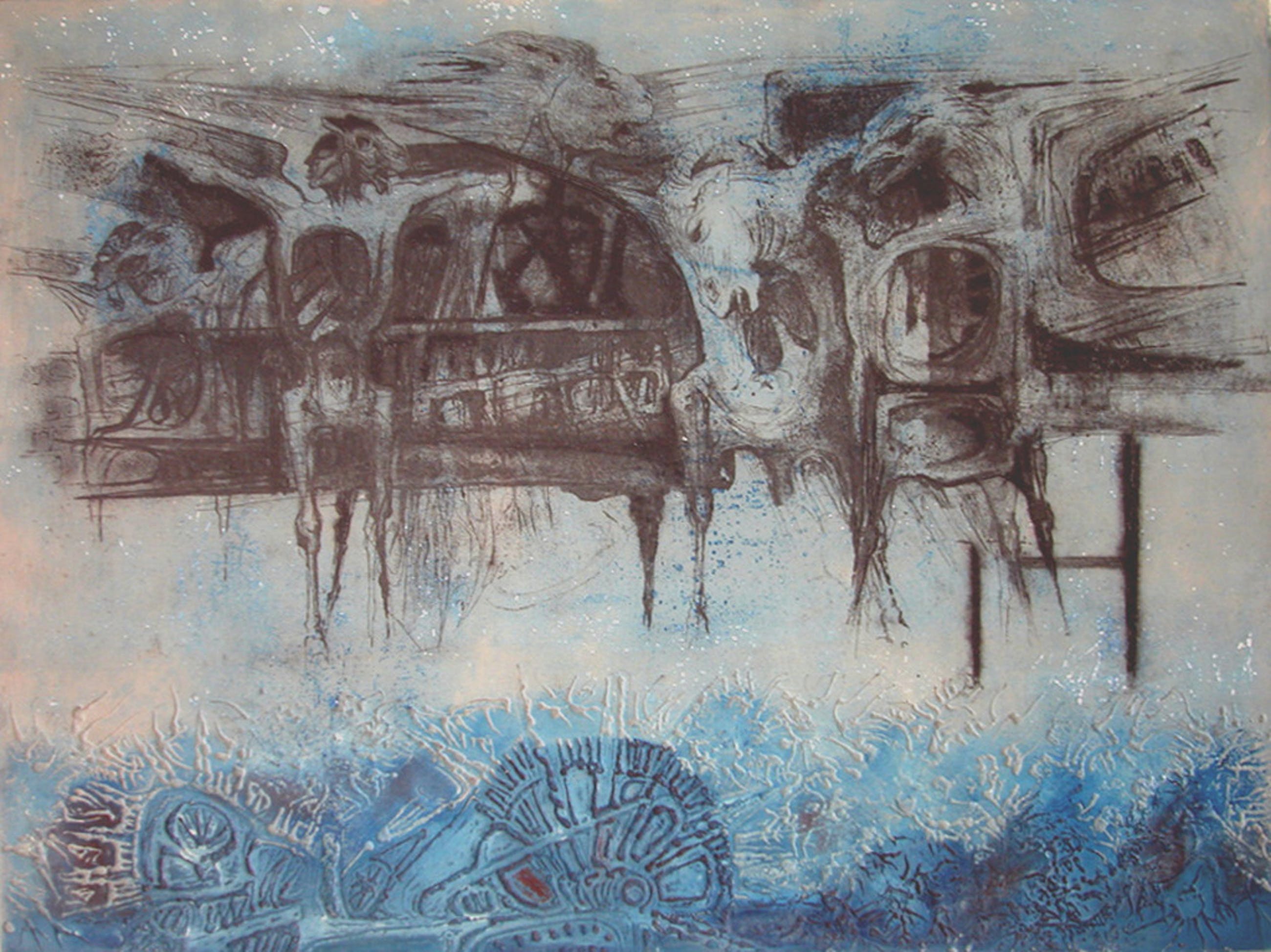 Op het eerste gezicht lijkt dit een abstract werk, maar na langere beschouwing wordt het een en ander zichtbaar. Er is hier sprake van een gemengde techniek, ets - aquatint en diepdruk, want het onderste blauwgekleurde deel is in reliëf afgedrukt. De afmeting is 70x50, oplage 8/35 en het jaartal 1976. Door kunstenaar van deze gegevens voorzien en ondertekend.