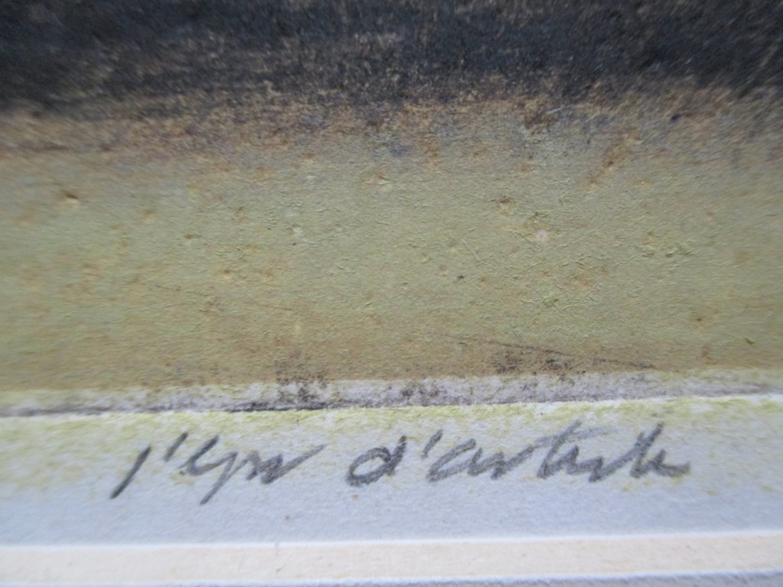 Geplaatst achter passe-partout, afm. 69,5x90, beeld 49,5x69,5 cm.