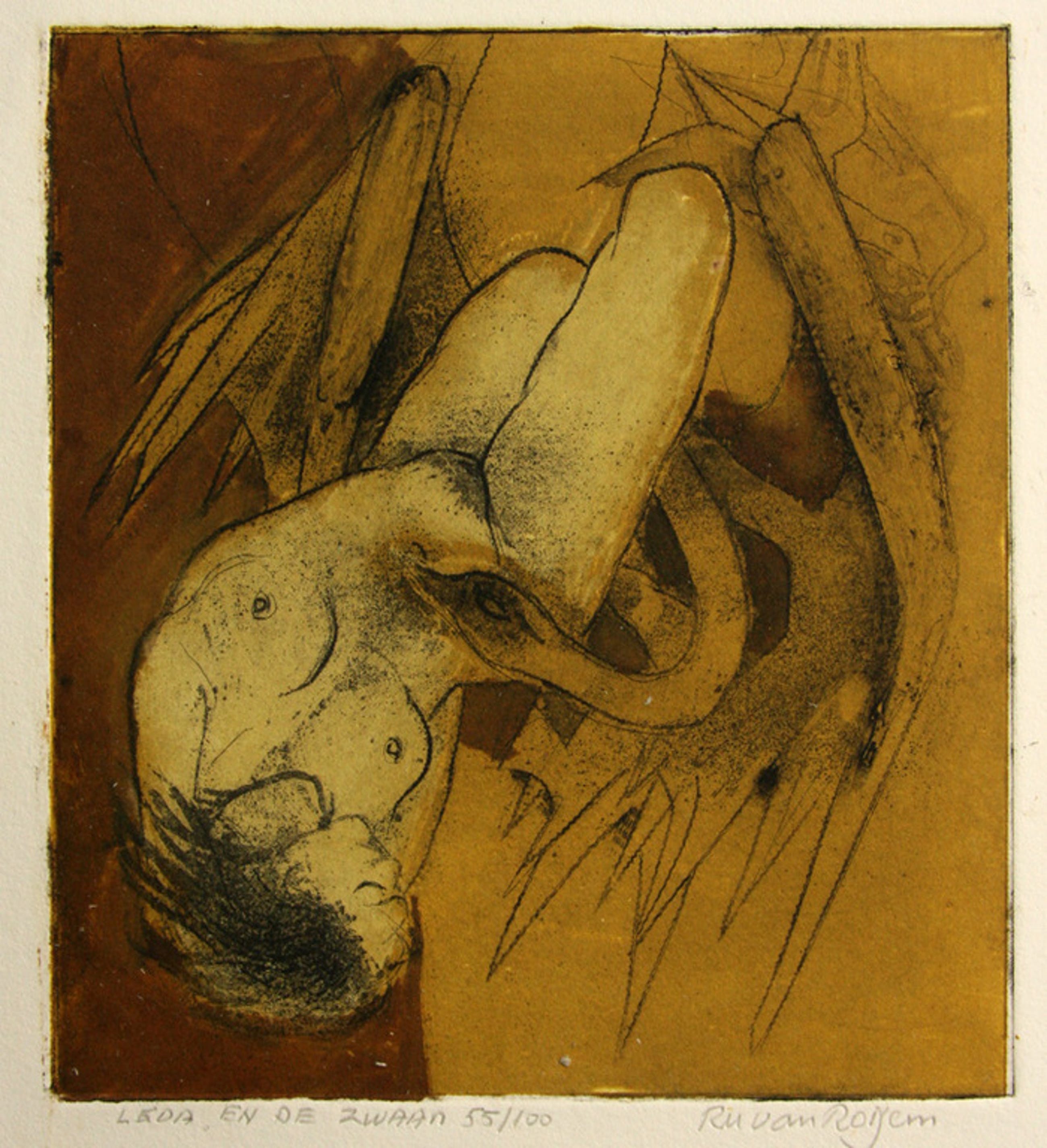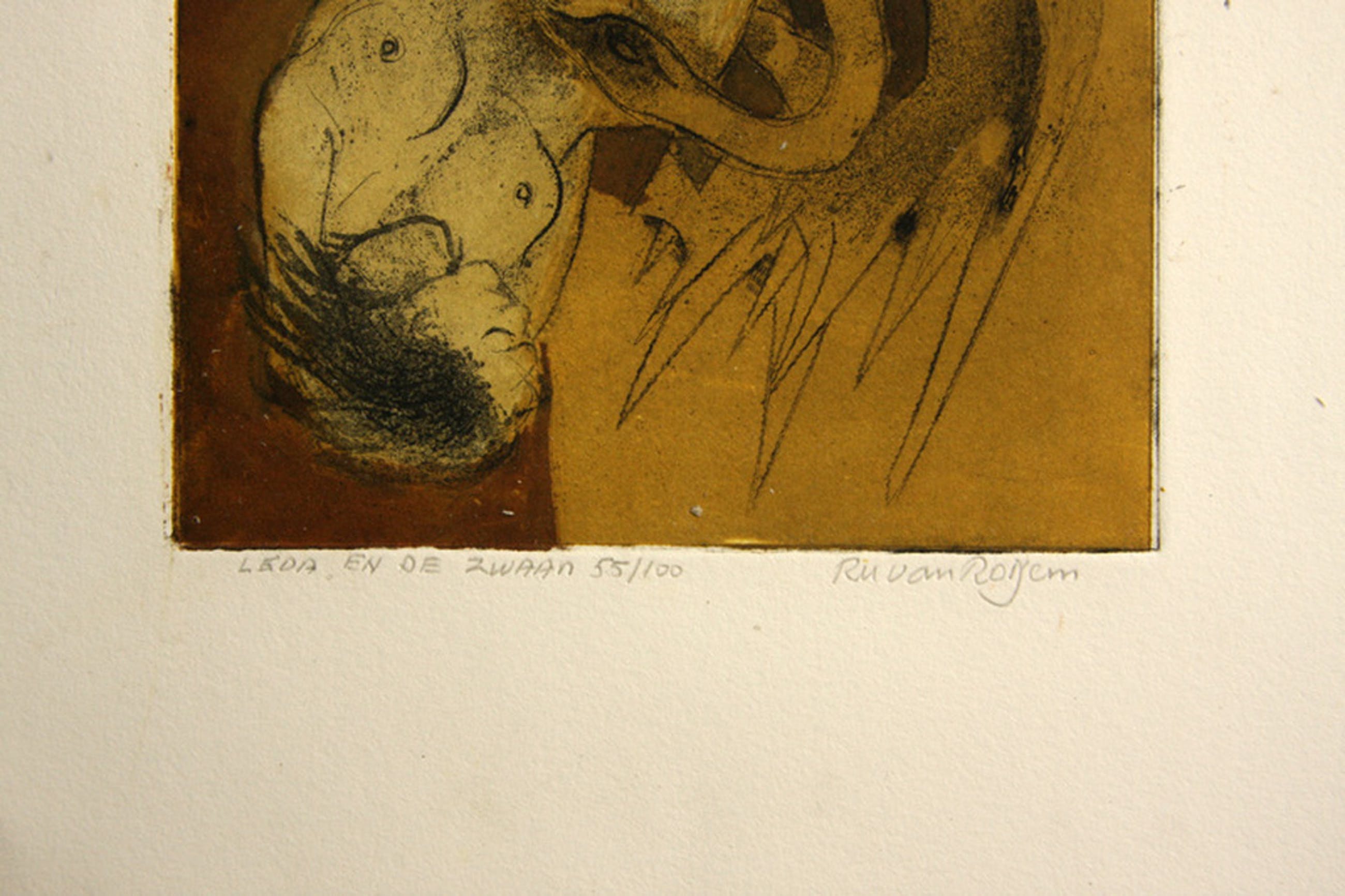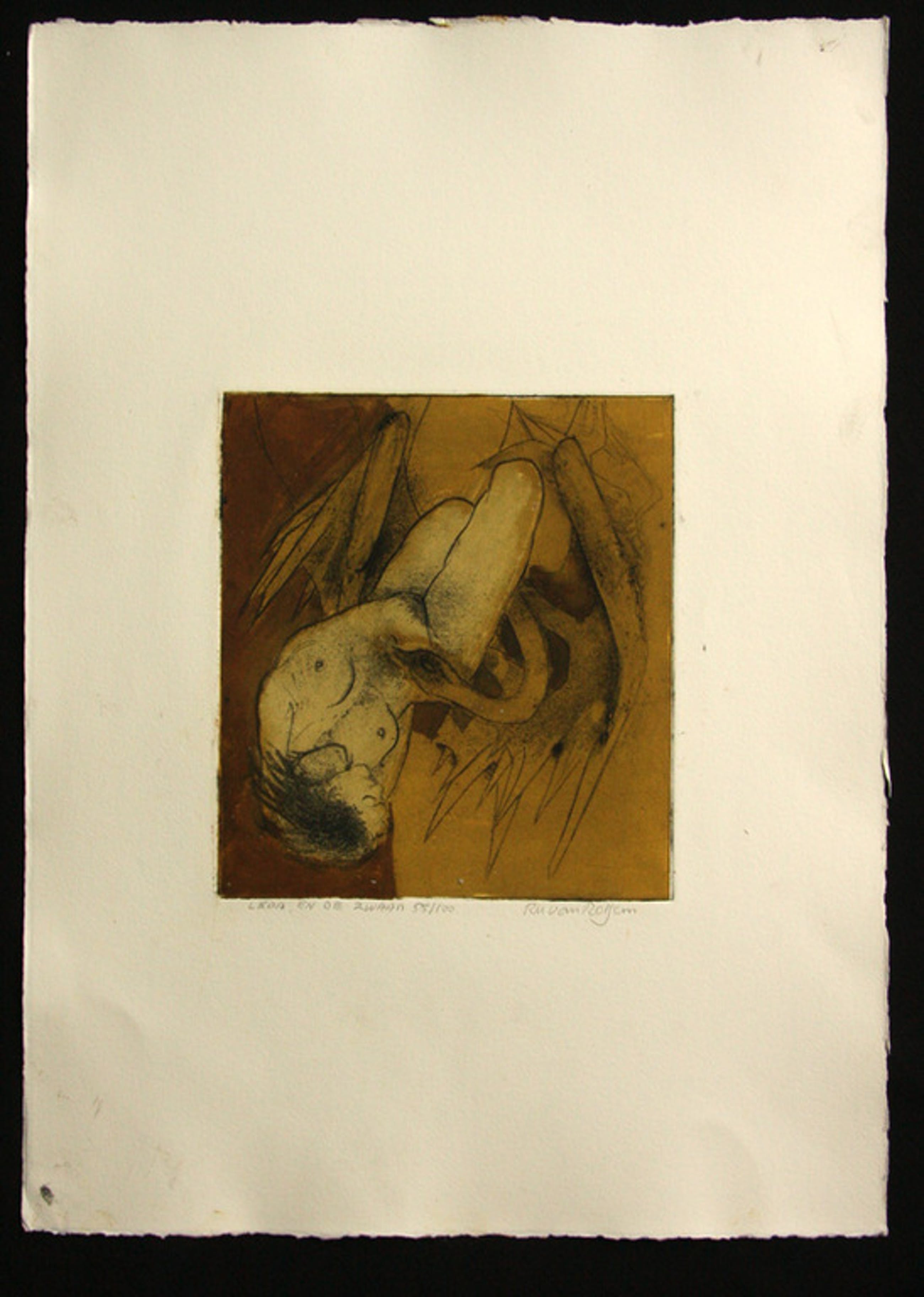 Fraai kunstwerk van Ru van Rossem op prachtig dik papier. Nr. 55 van 100 exemplaren.