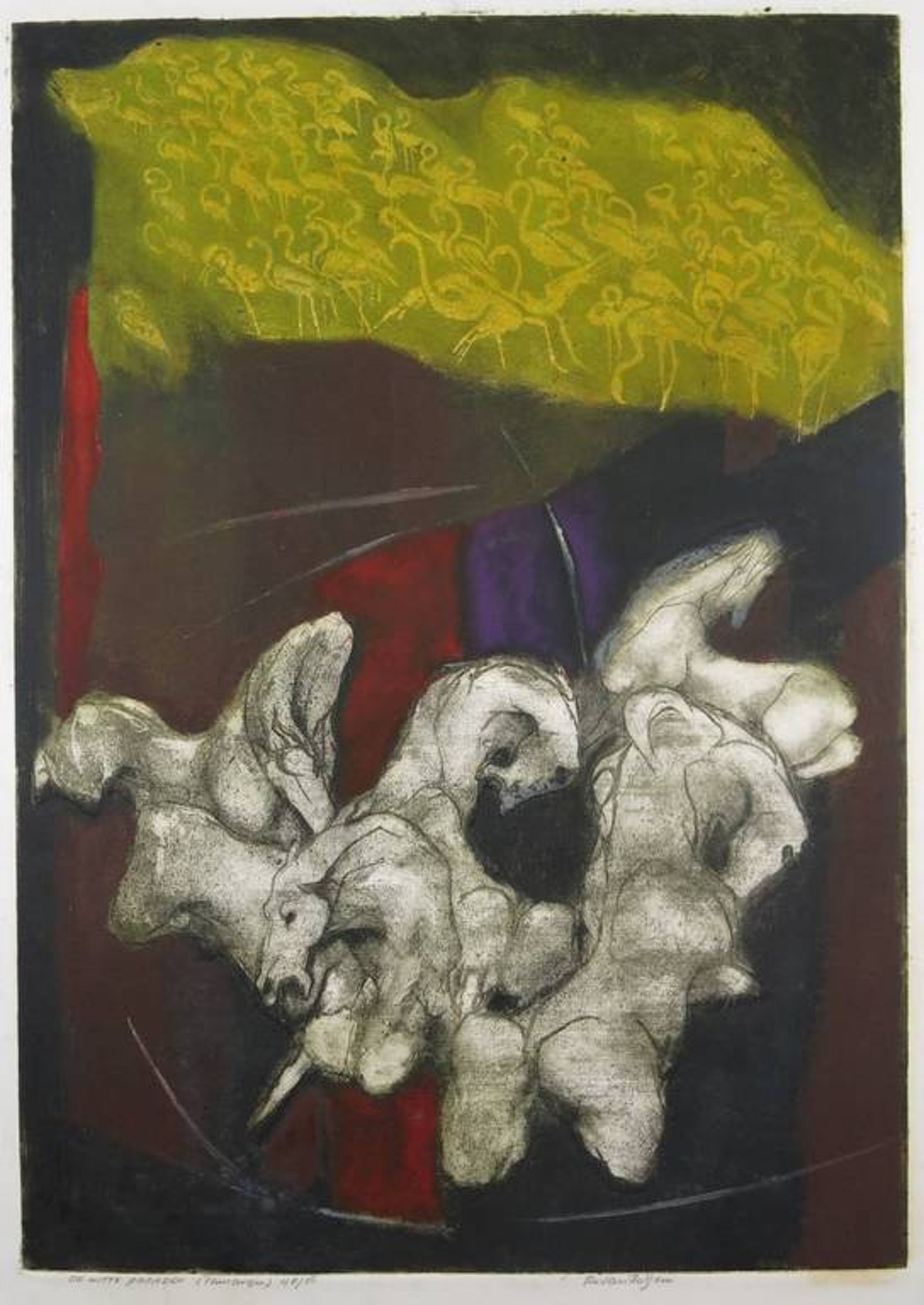 Conditie: Beeld in goede staat. Buiten het beeld in de witranden geen schade maar wat gevlekt (afgeven van de verf tijdens maakproces, ingelijst niet zichtbaar)