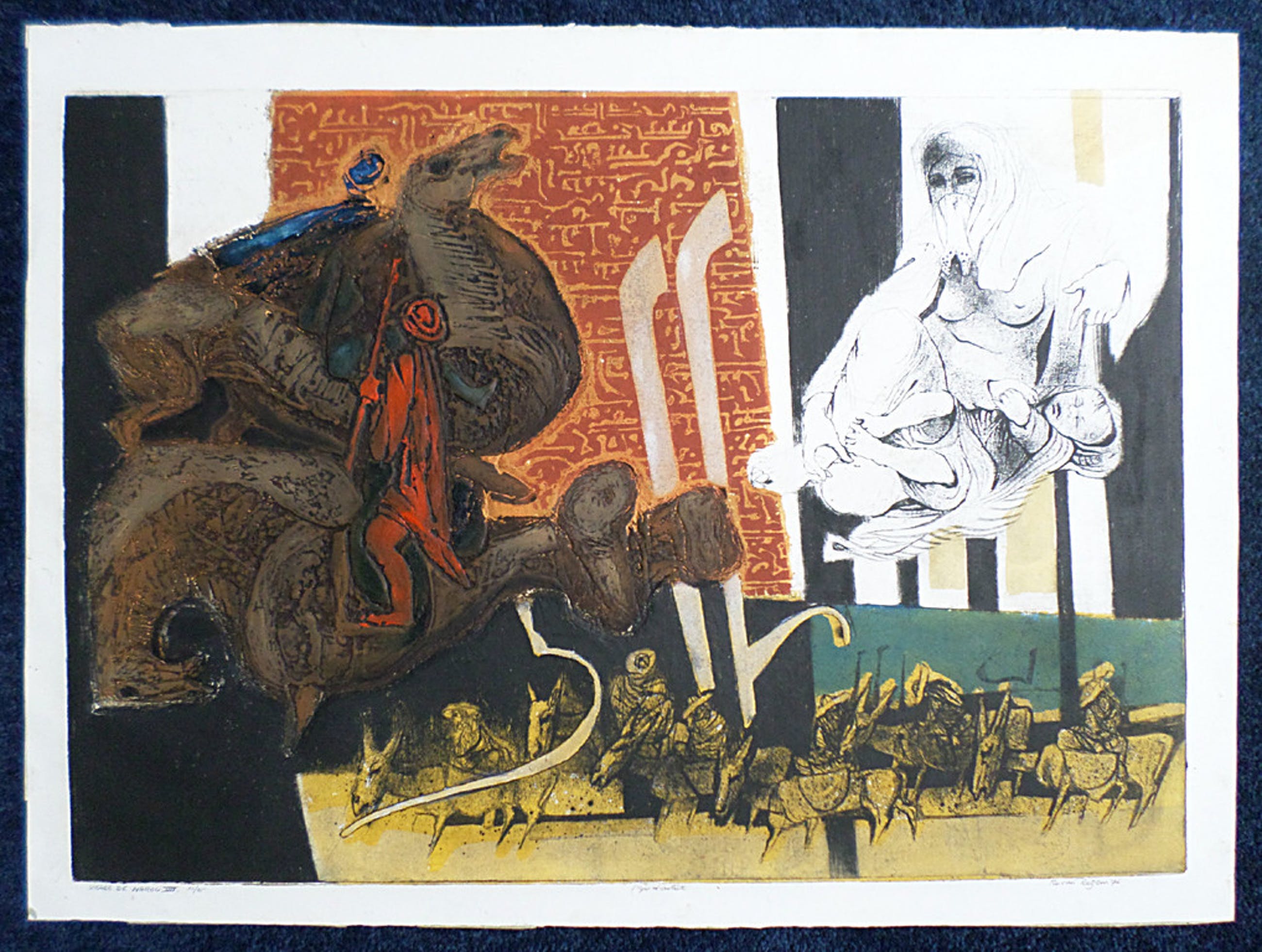 Karakteristiek werk van Ru van Rossem op dik geschept papier. Handgesigneerd, gedateerd (1976) en genummerd (10 uit een oplage van slechts 35). Het werk is ingelijst geweest want heeft resten van tape aan de achterkant maar dit heeft geen enkele effect op de voorkant. Werk heeft waarschijnlijk niet in een passe-partout gezeten en er is nauwelijks sprake van verkleuring. In uitstekende staat. Afkomstig uit de kunstcollectie van ABN AMRO.