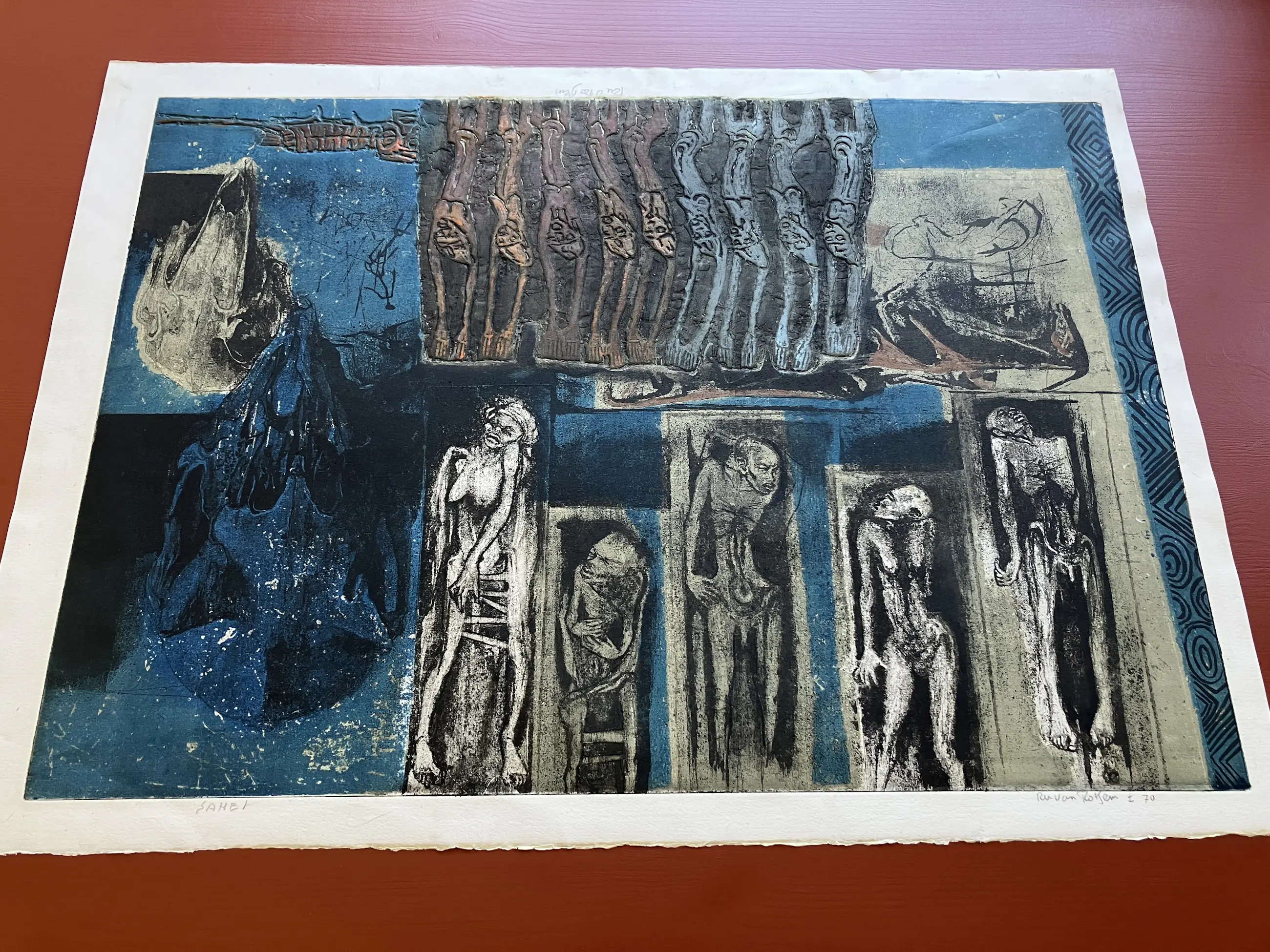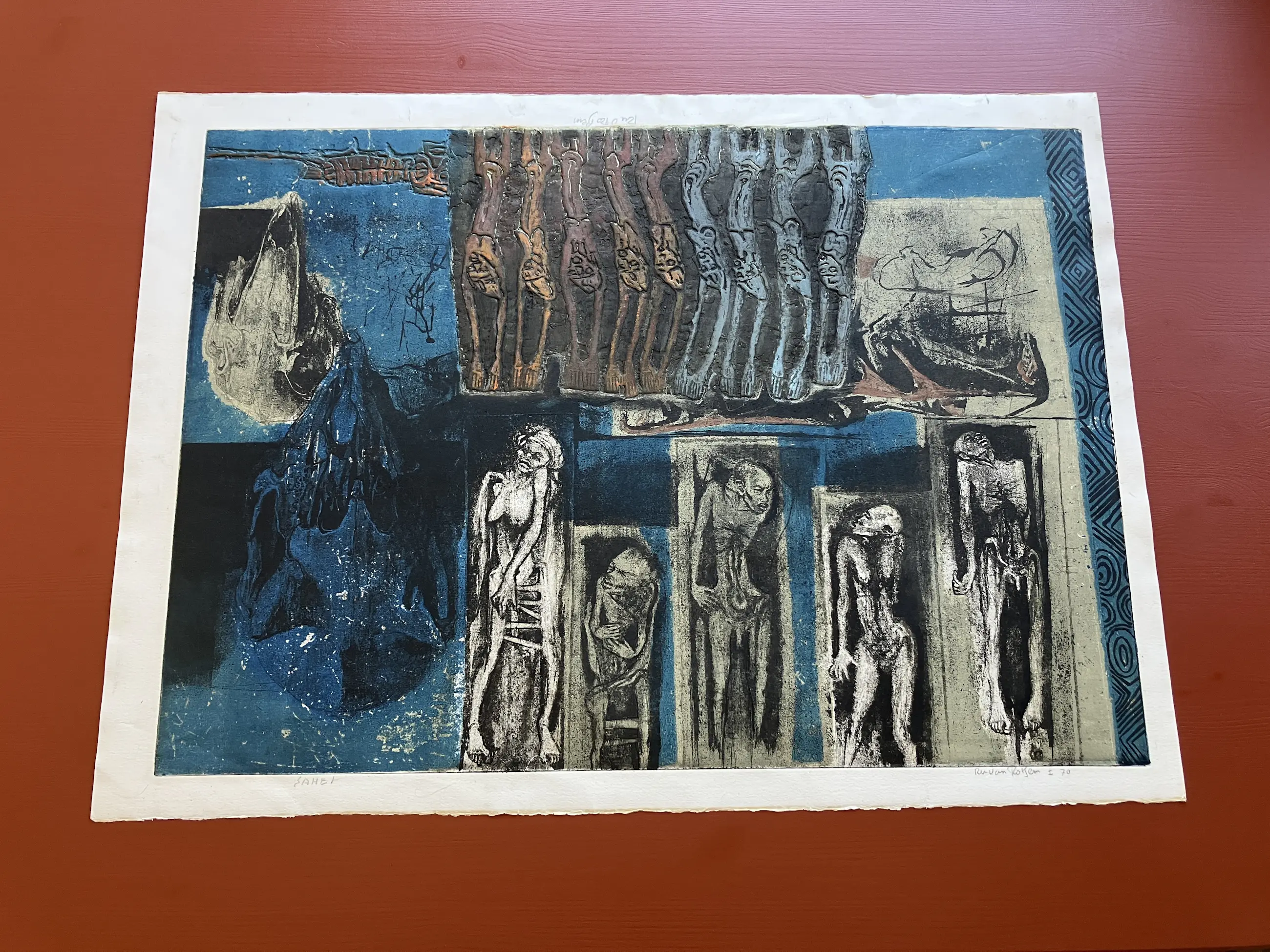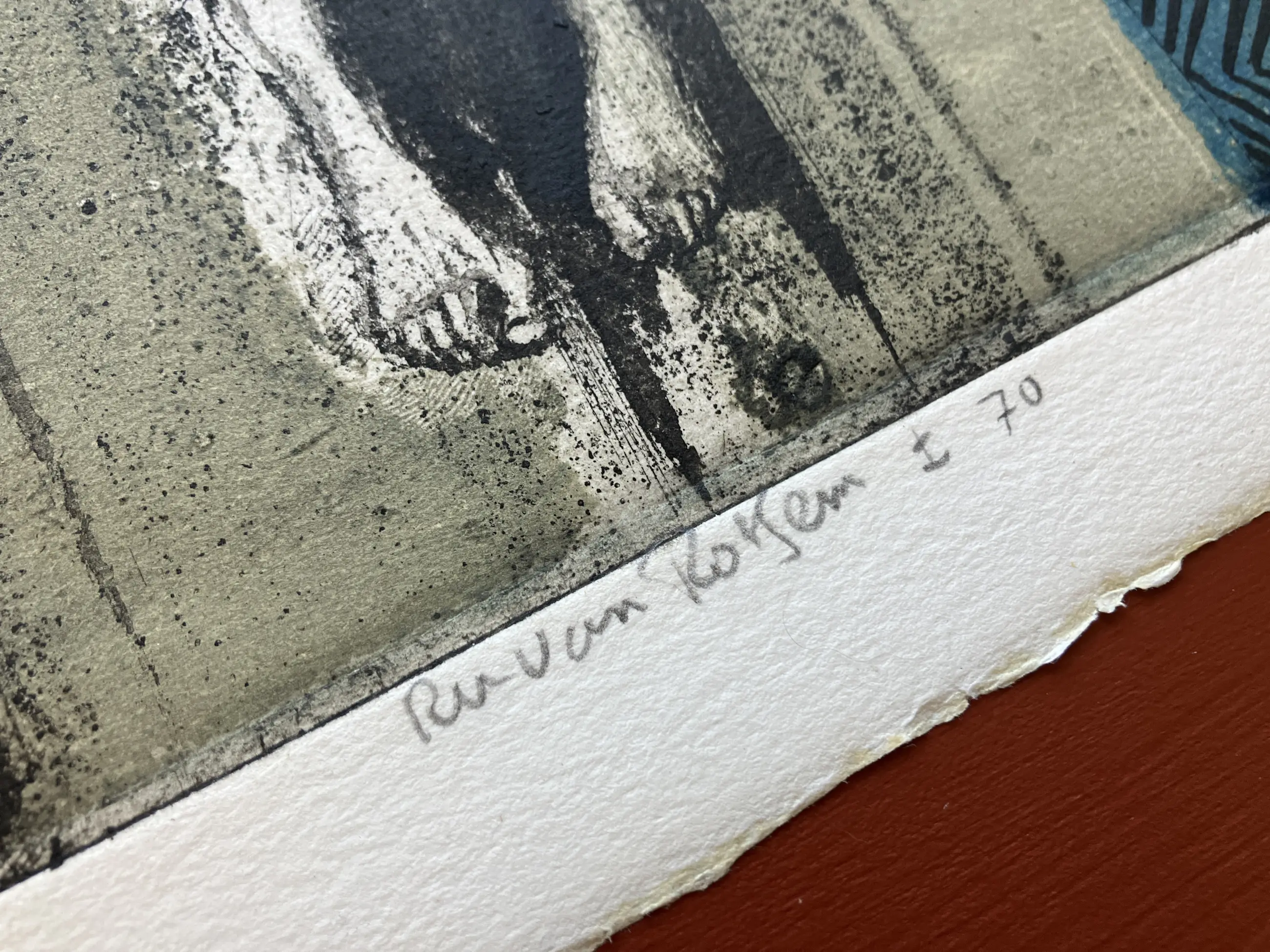 Prachtige originele ets met reliëfdruk van Ru van Rossem, titel: Sahet, gesigneerd in potlood. Linksonder de titel. Rechtsonder de signatuur en het jaartal: +/- '70.