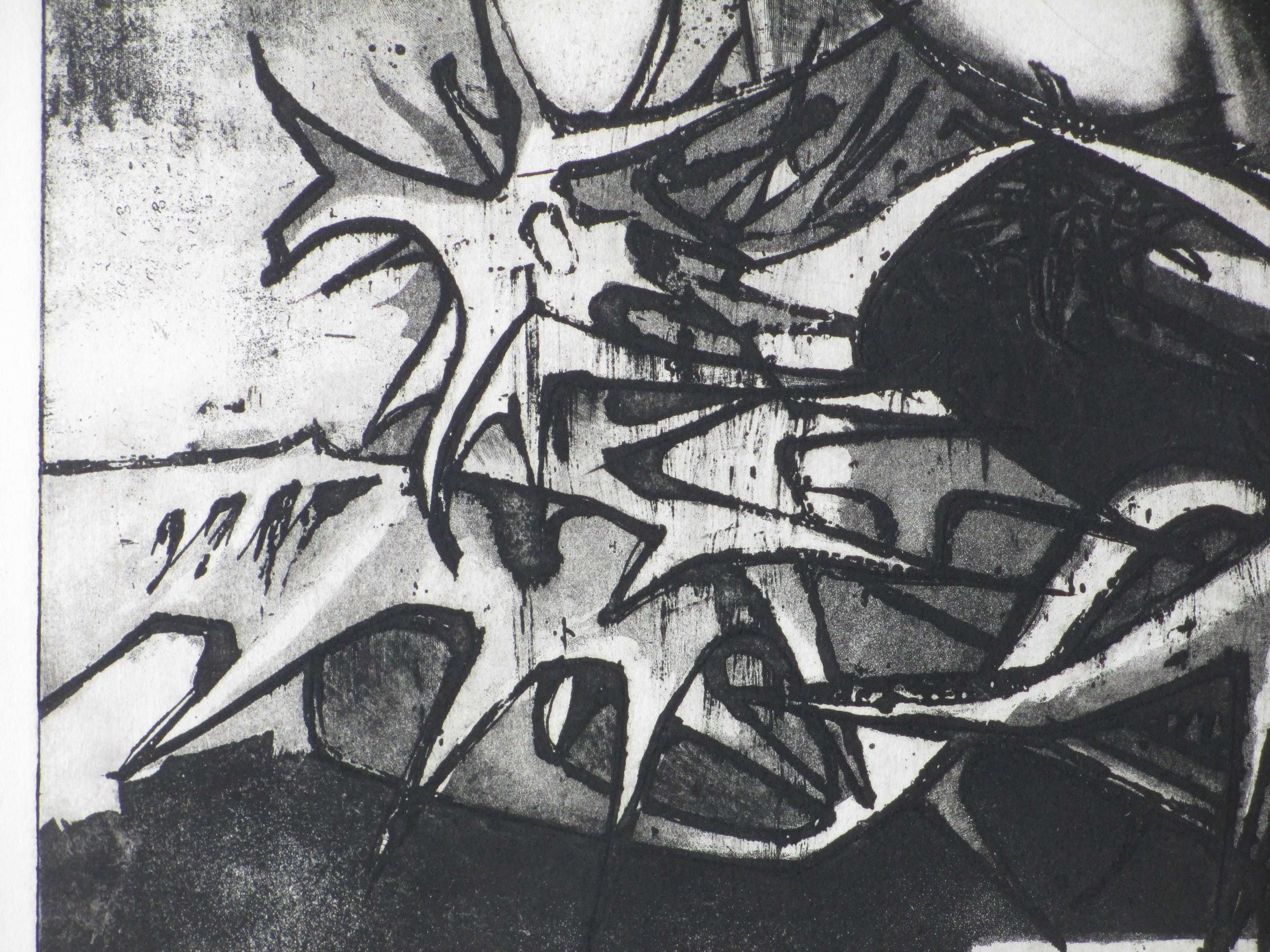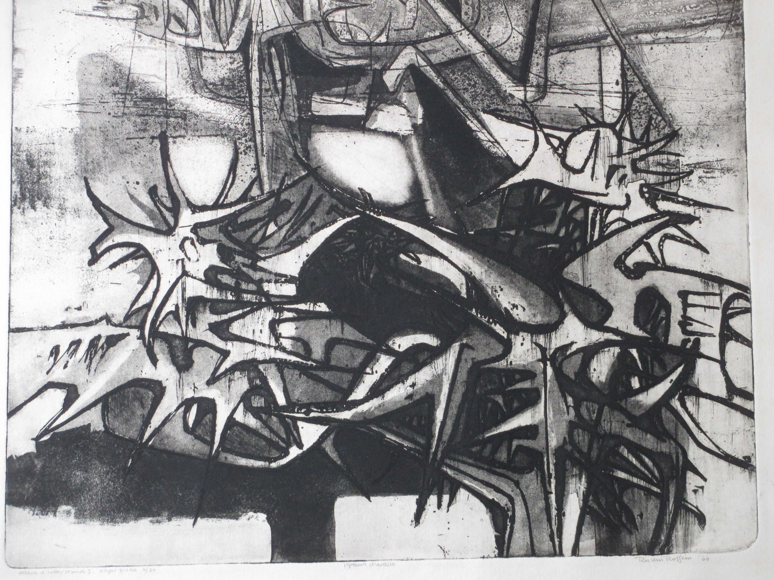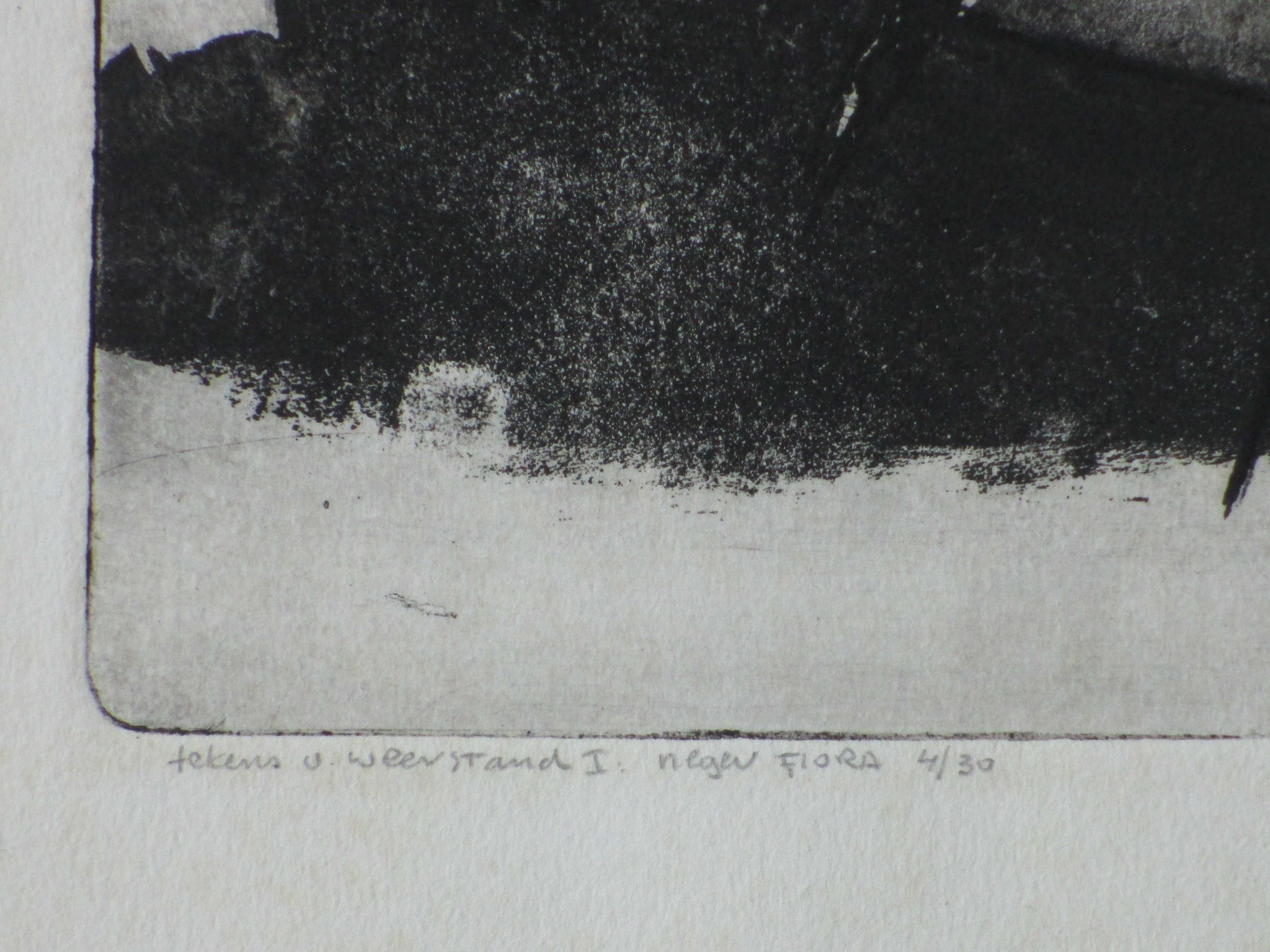 Ets door Ru van Rossem. Losbladig, beeldmaat 69x50, bladmaat 75x55 Gesigneerd en gedateerd rechtsonder in potlood: 'Ru van Rossem '66' Annotatie middenonder: 'l'epreuve d'artiste' Getiteld en genummerd linksonder: 'Tekens v. weerstand I' en '4/30'
