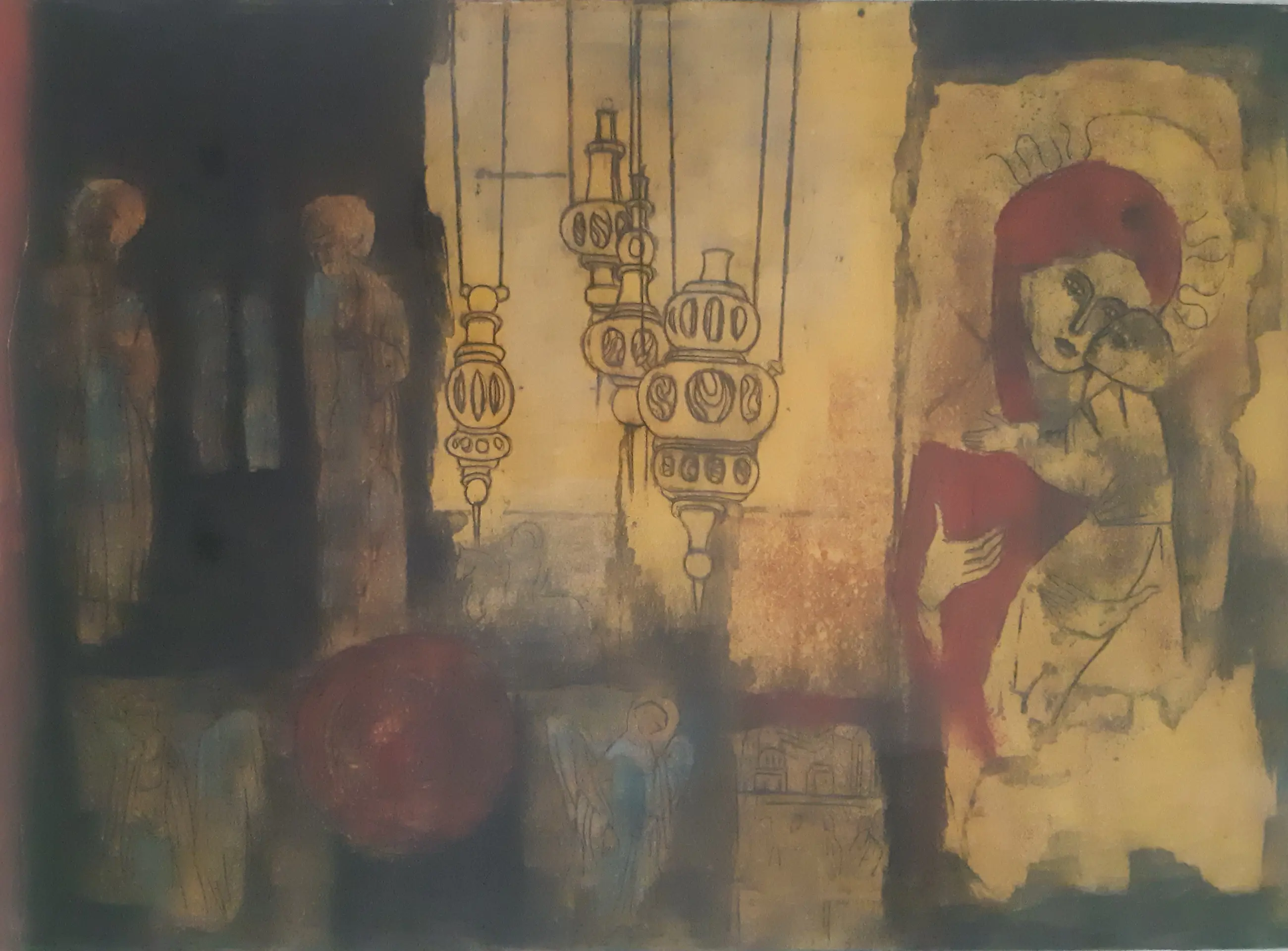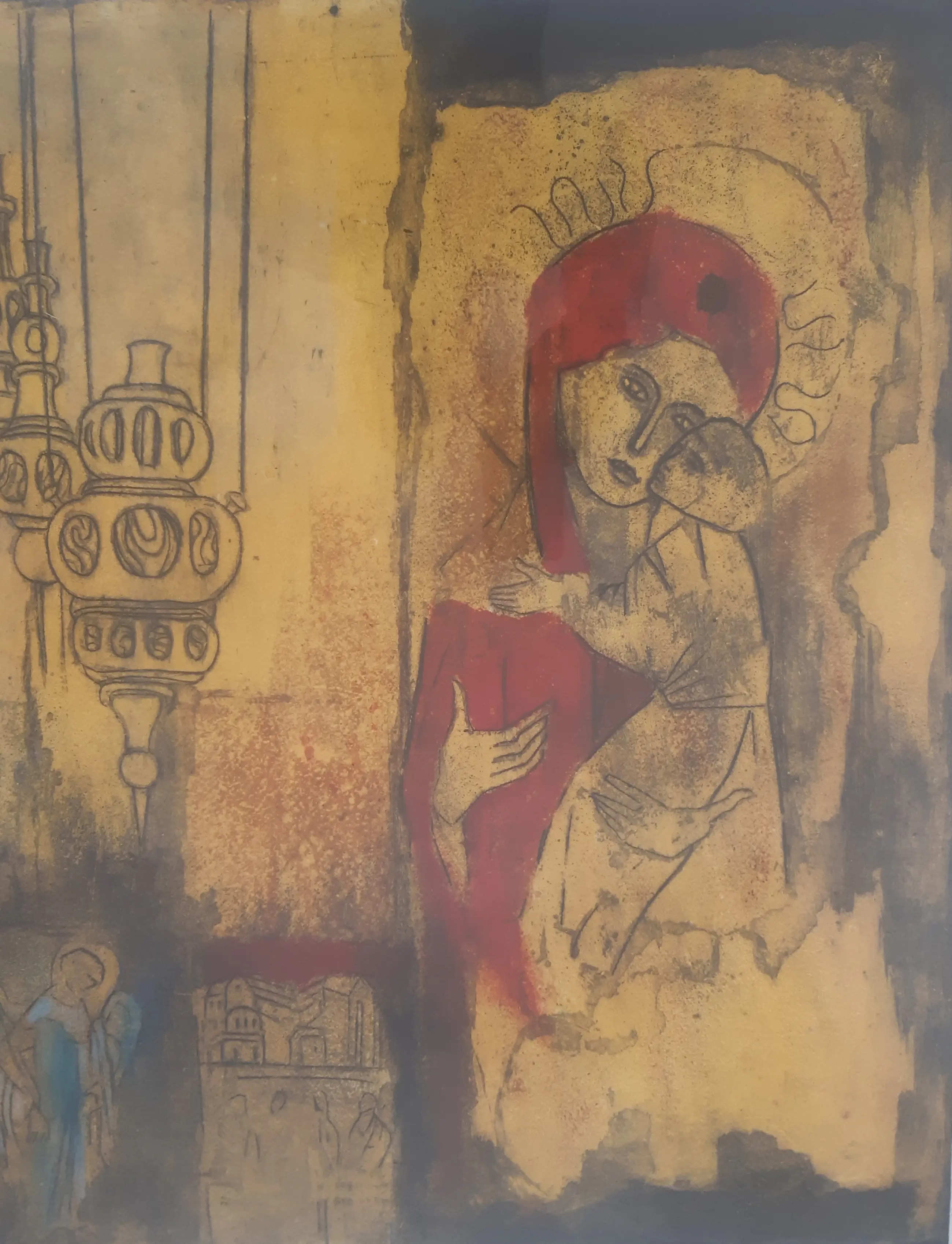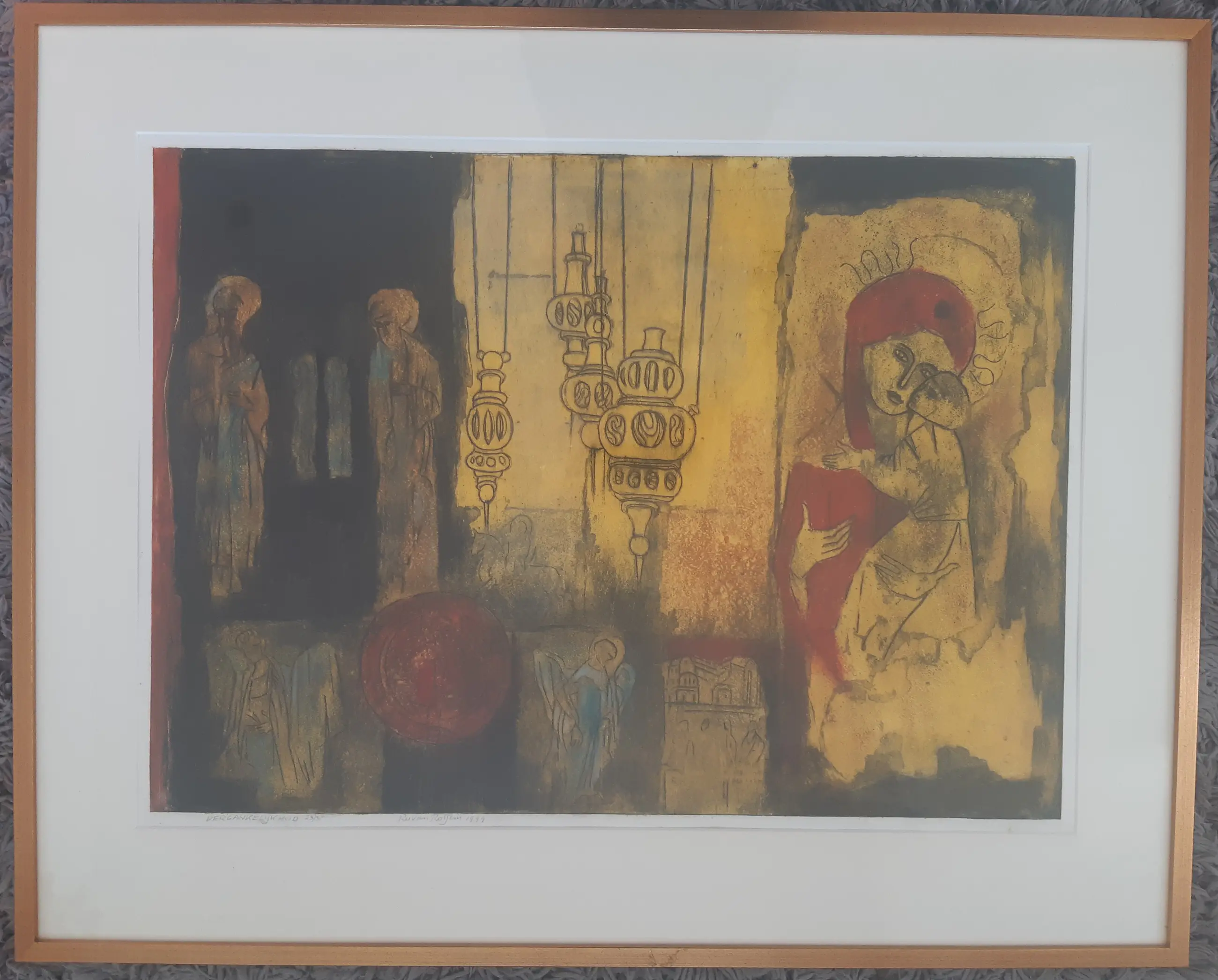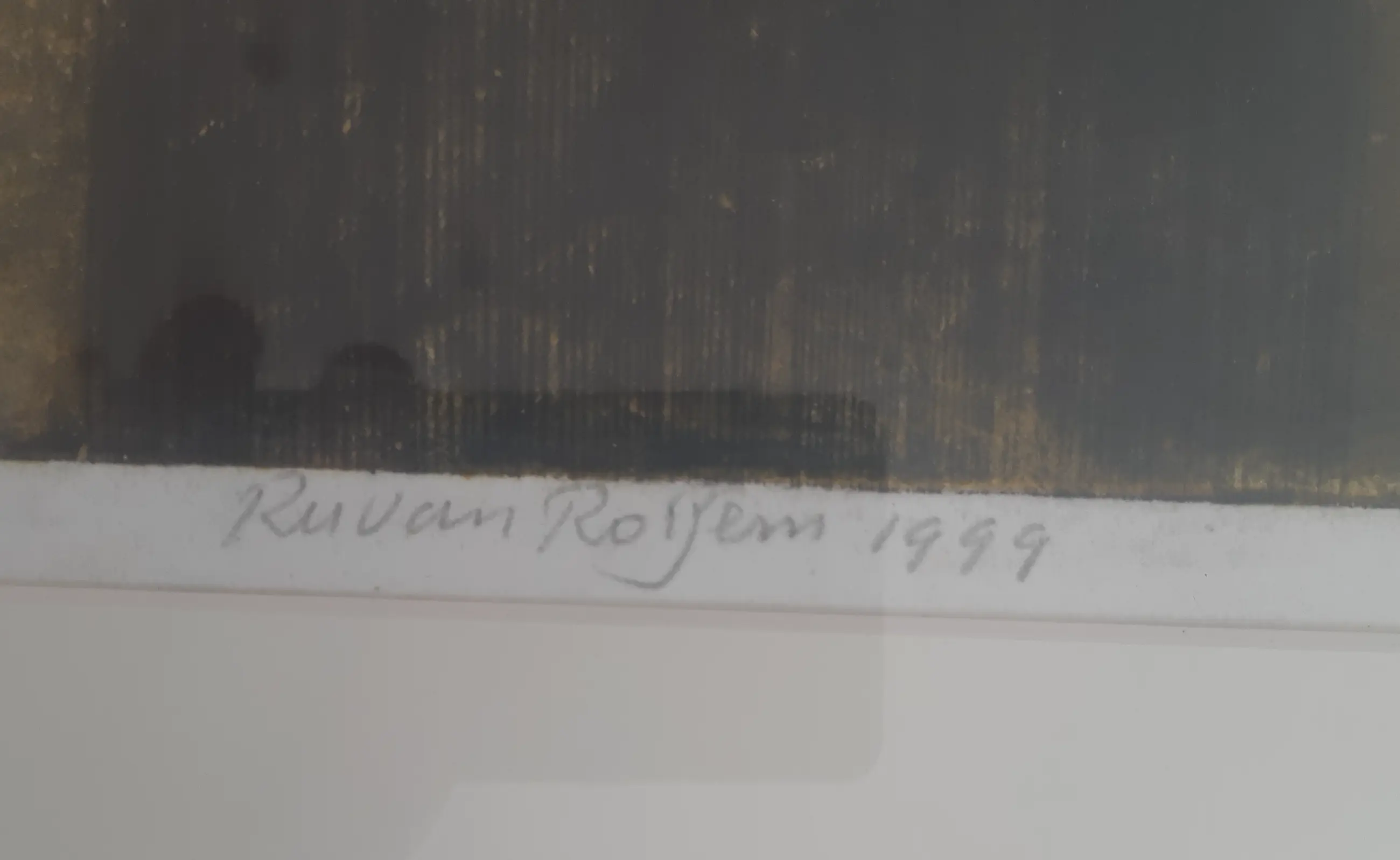 Grote kleurenets van Ru van Rossem, in de voor hem kenmerkende techniek. De kleurenets is met potlood gesigneerd, genummerd, gedateerd en van titel voorzien. Ingelijst in een koperkleurige houten Barth-lijst. Het geheel verkeert in uitstekende staat. Op de foto's zijn reflecties zichtbaar.