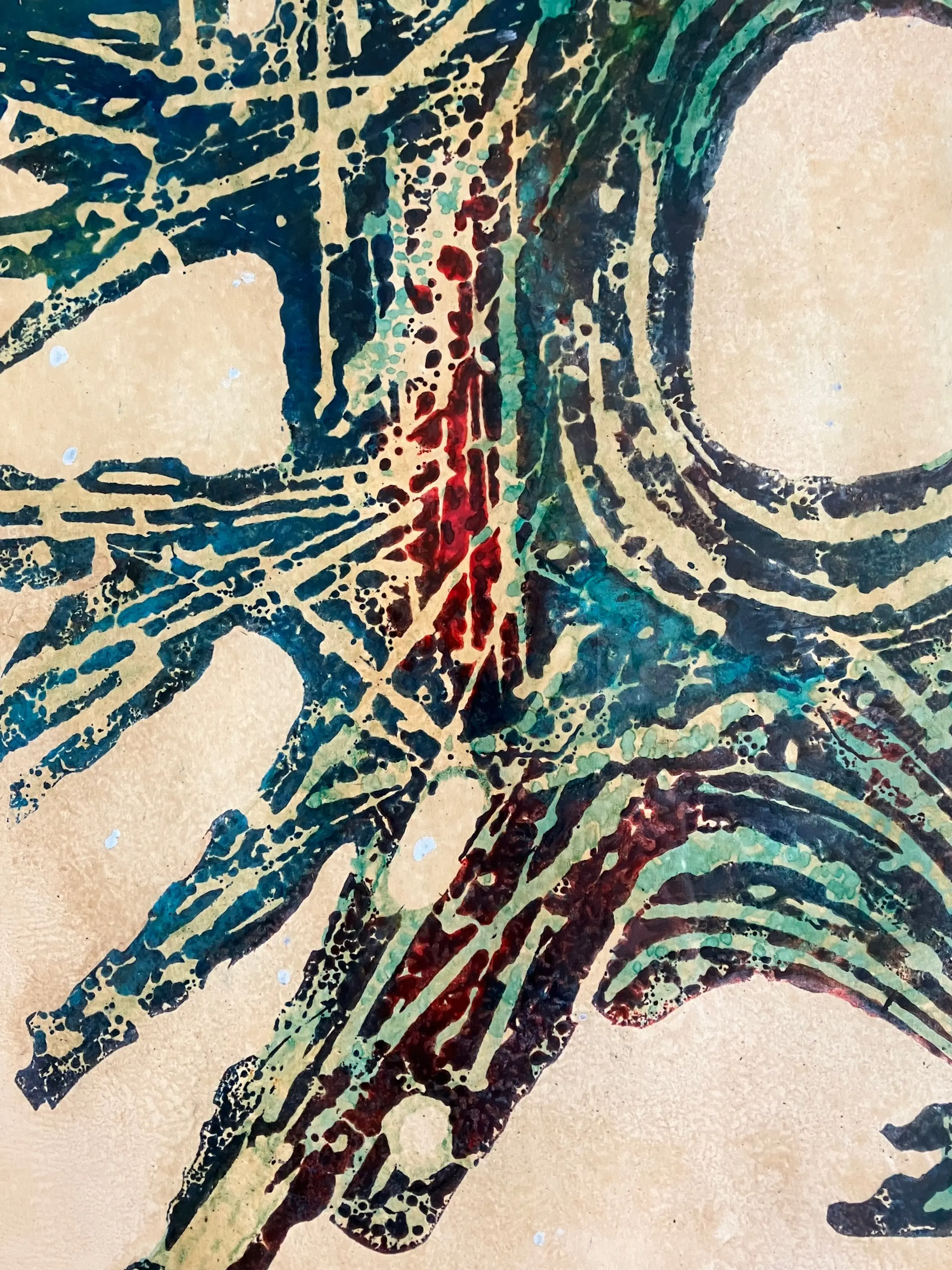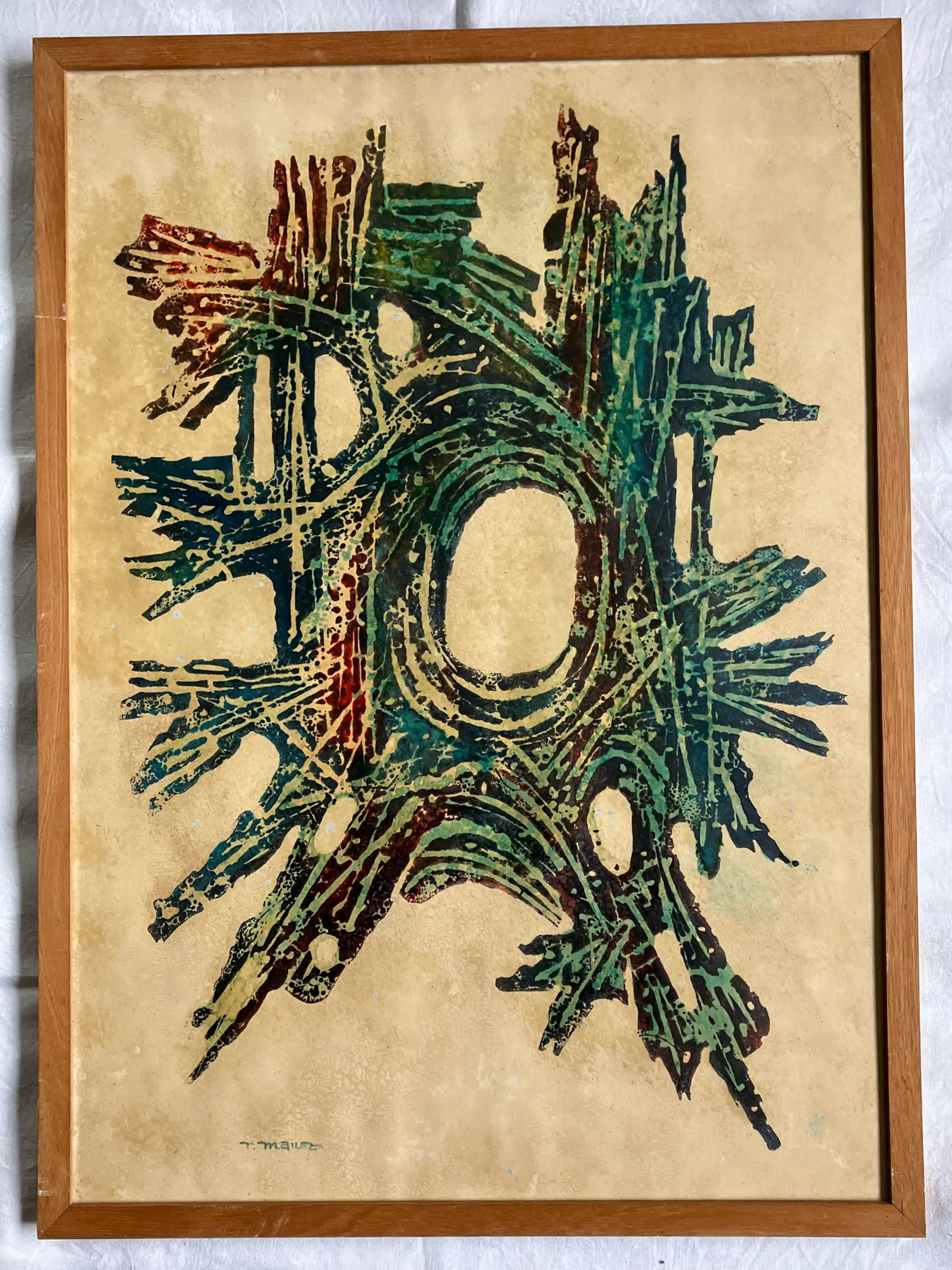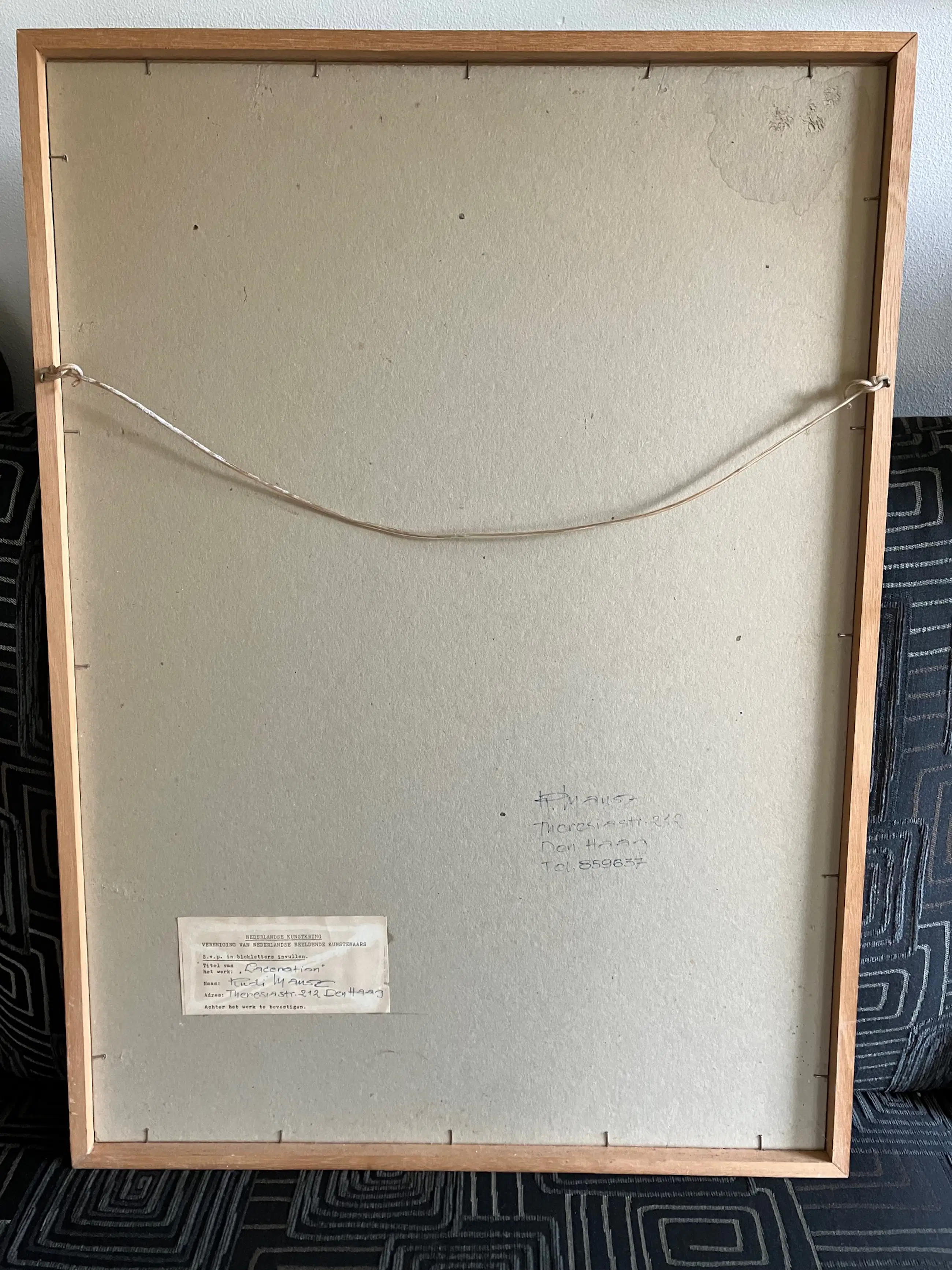 Het is ingelijst, maar de lijst is wat vergeeld (grenen) net als het werk. Er is gewerkt met vetkrijt, dat maakt dat het papier ook wat verkeurd is.