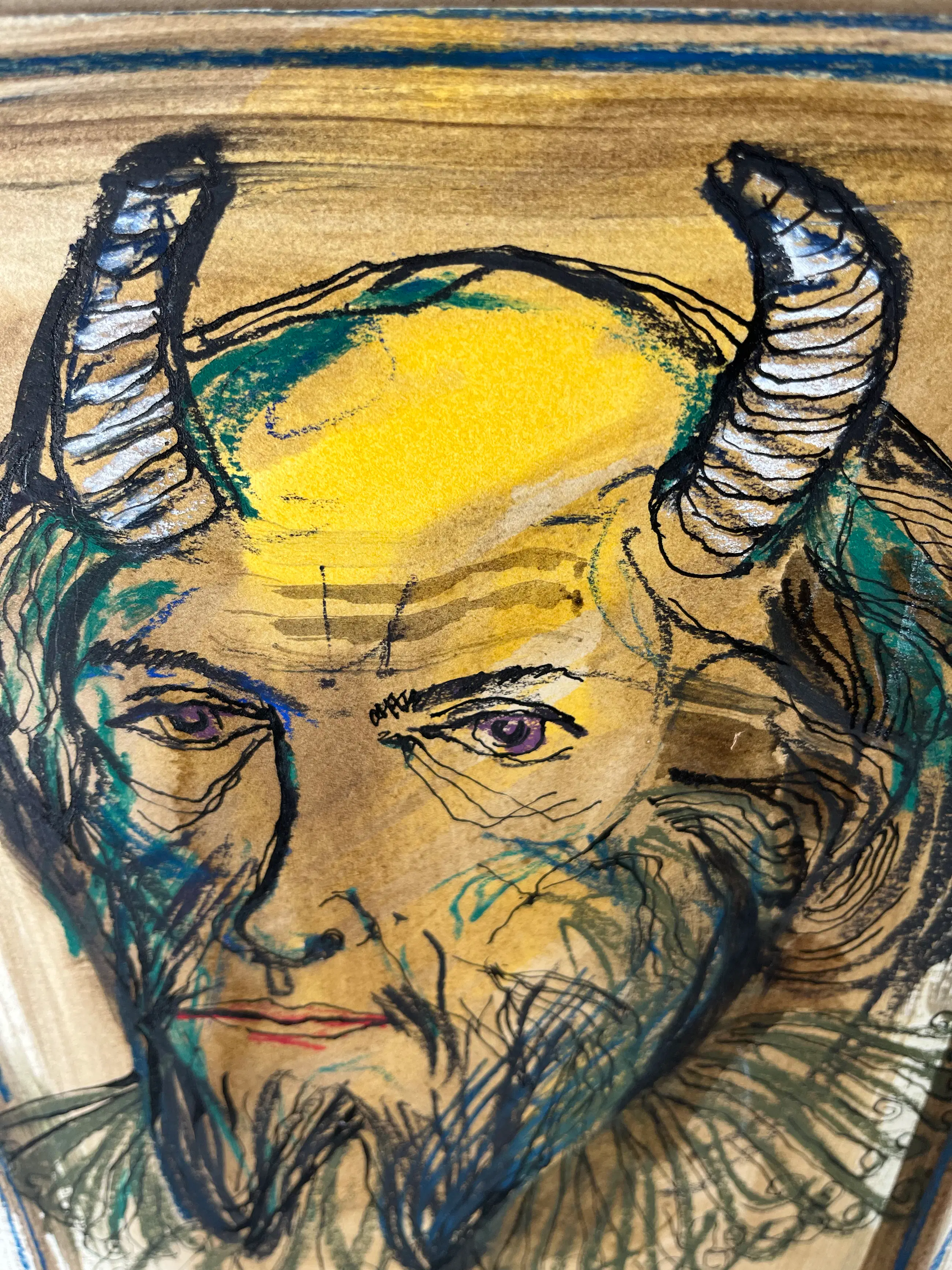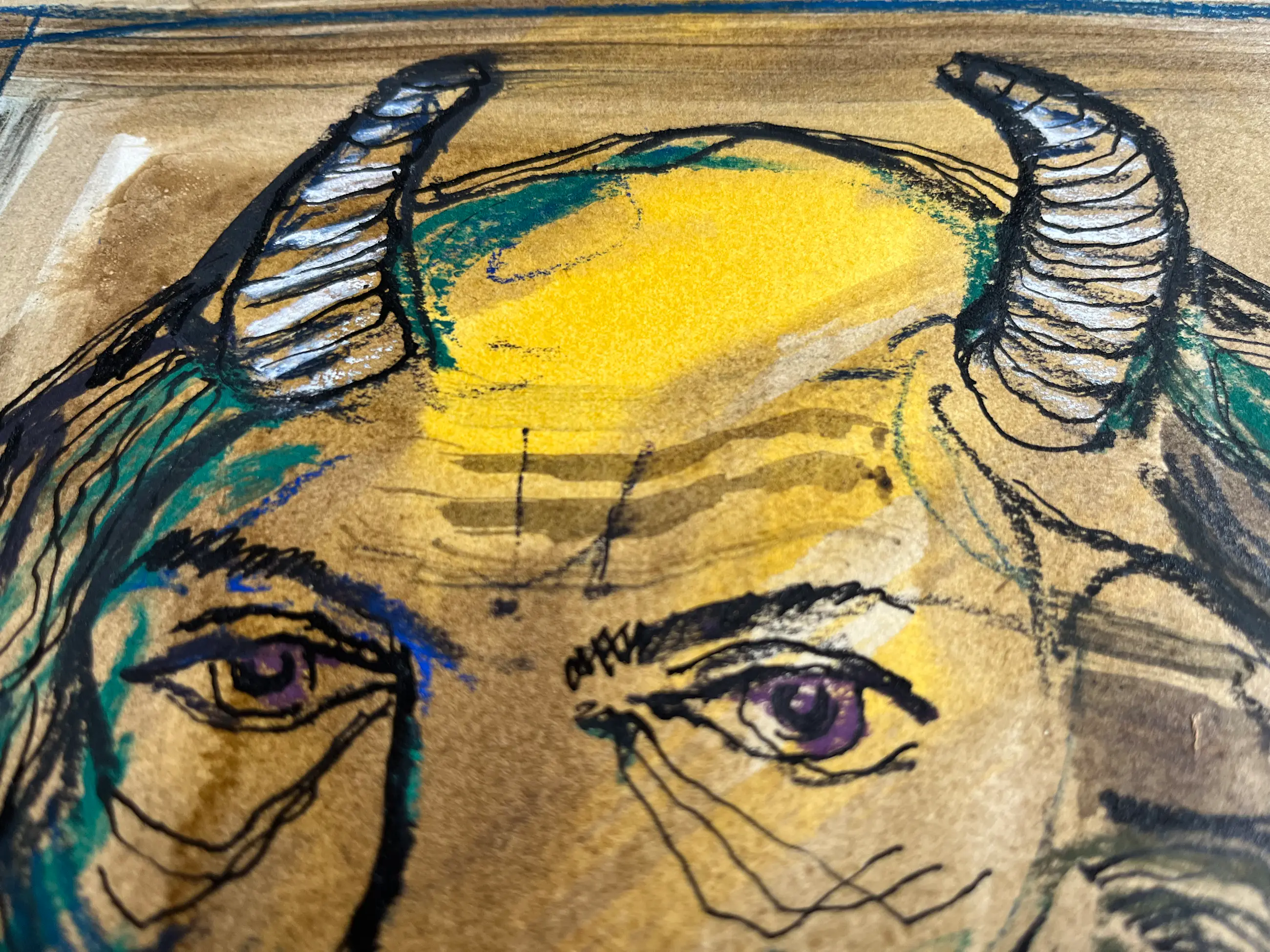 Waar aquarel en inkt in het papier trekken, blijft pastelkrijt er bovenop liggen.