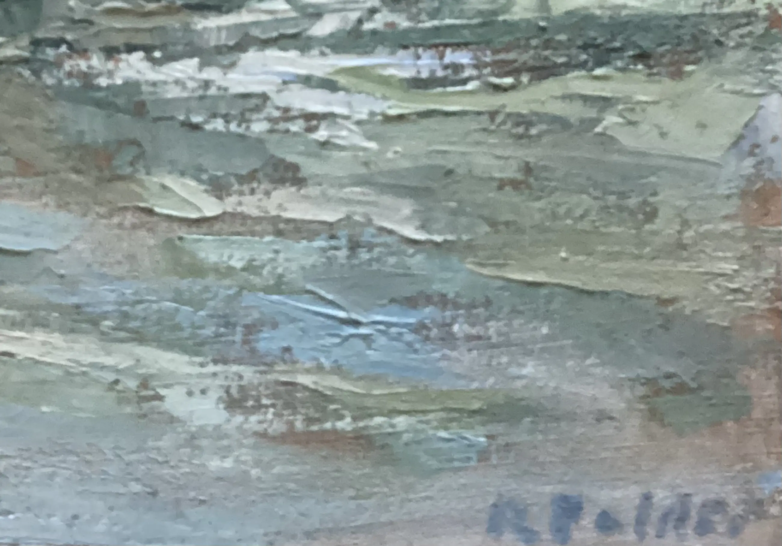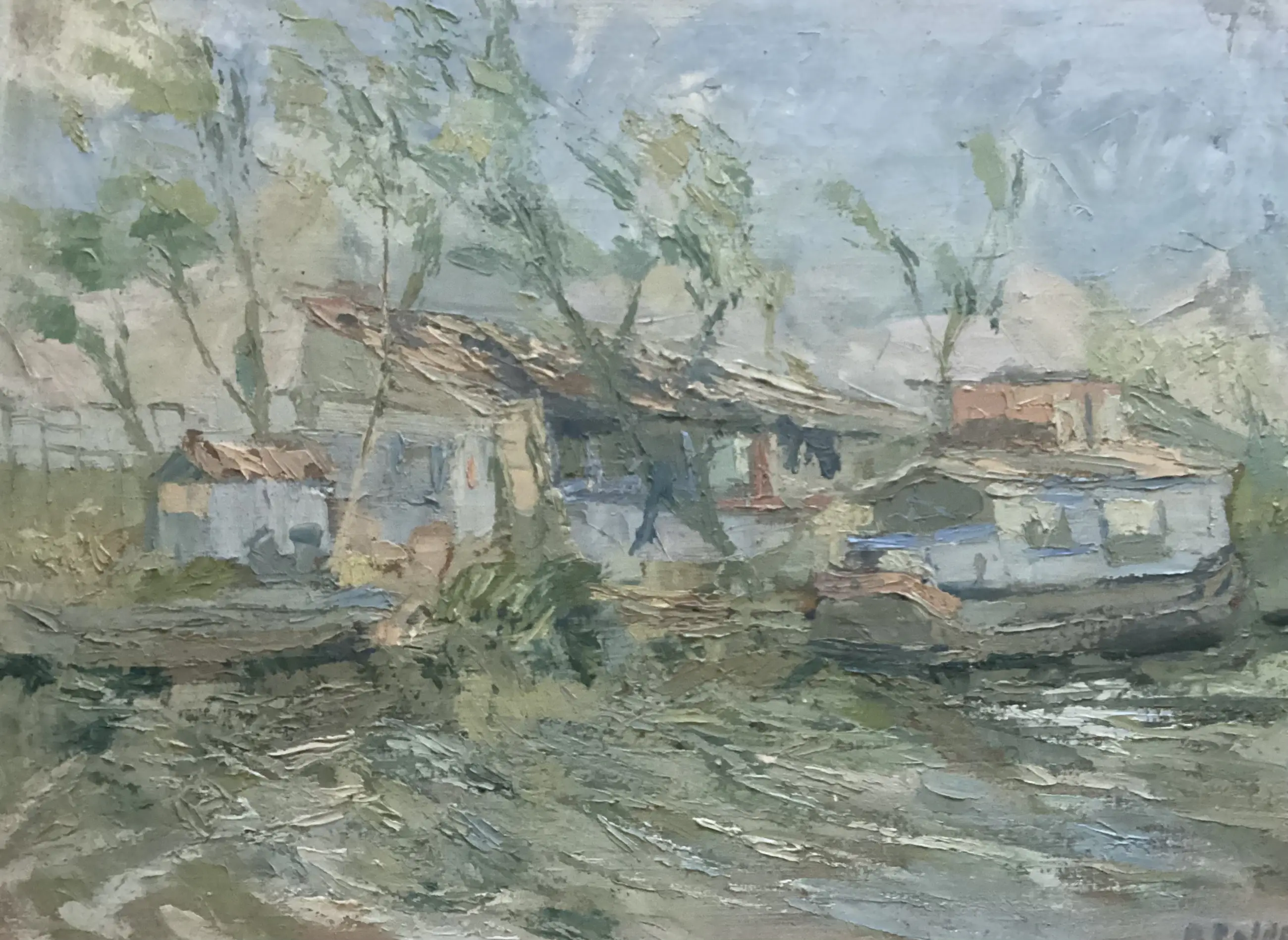 Mooi en karakteristiek luministisch landschap vanRudi Poler Dit schilderij is opgebouwd uit subtiele kleurschakeringen die, hoe langer je naar dit werk kijkt, hoe meer kleuren en vormen zich ontvouwen. Dit prachtige landschap met woonboot is waarschijnlijk in Loosdrecht geschilderd.