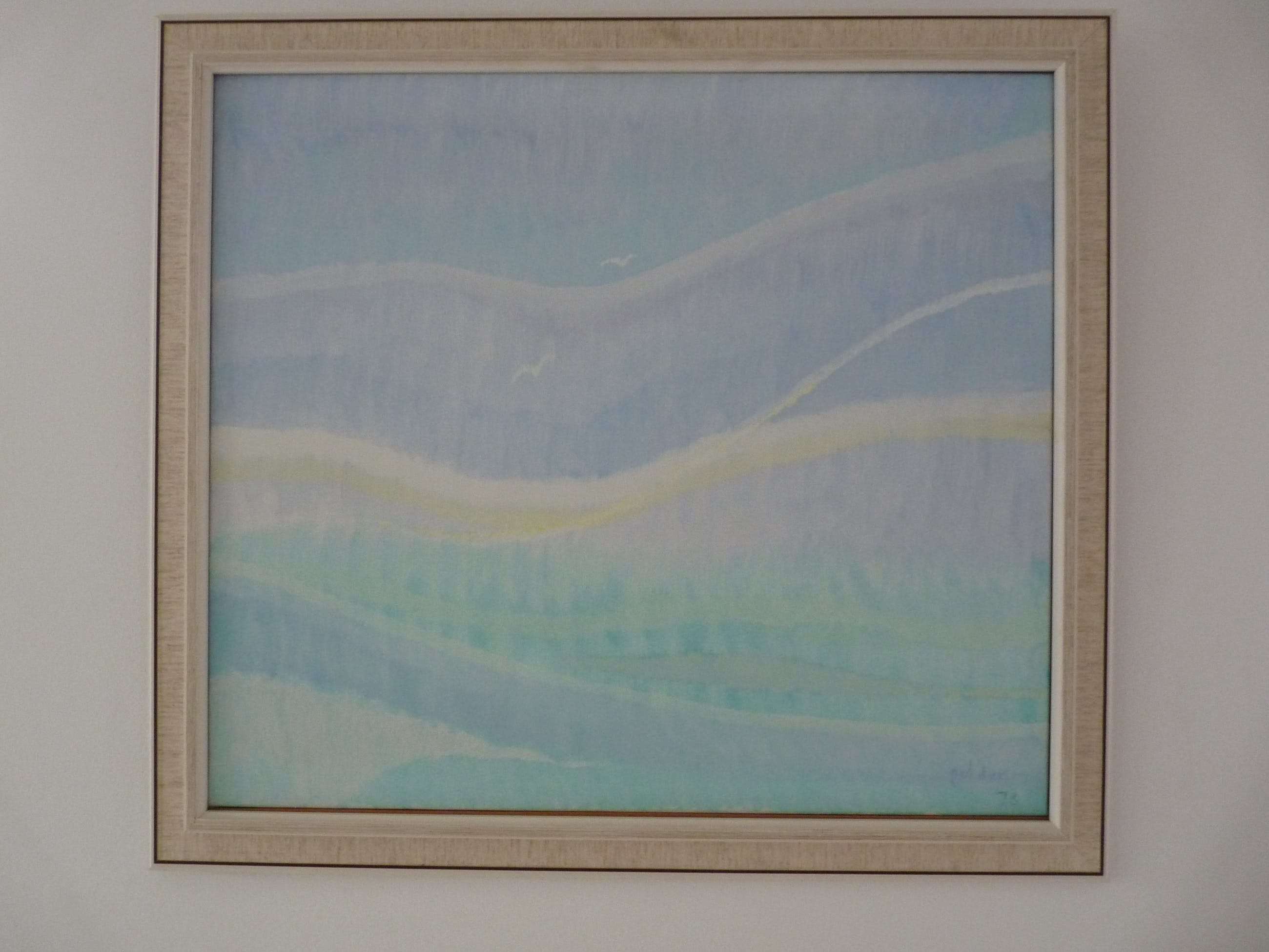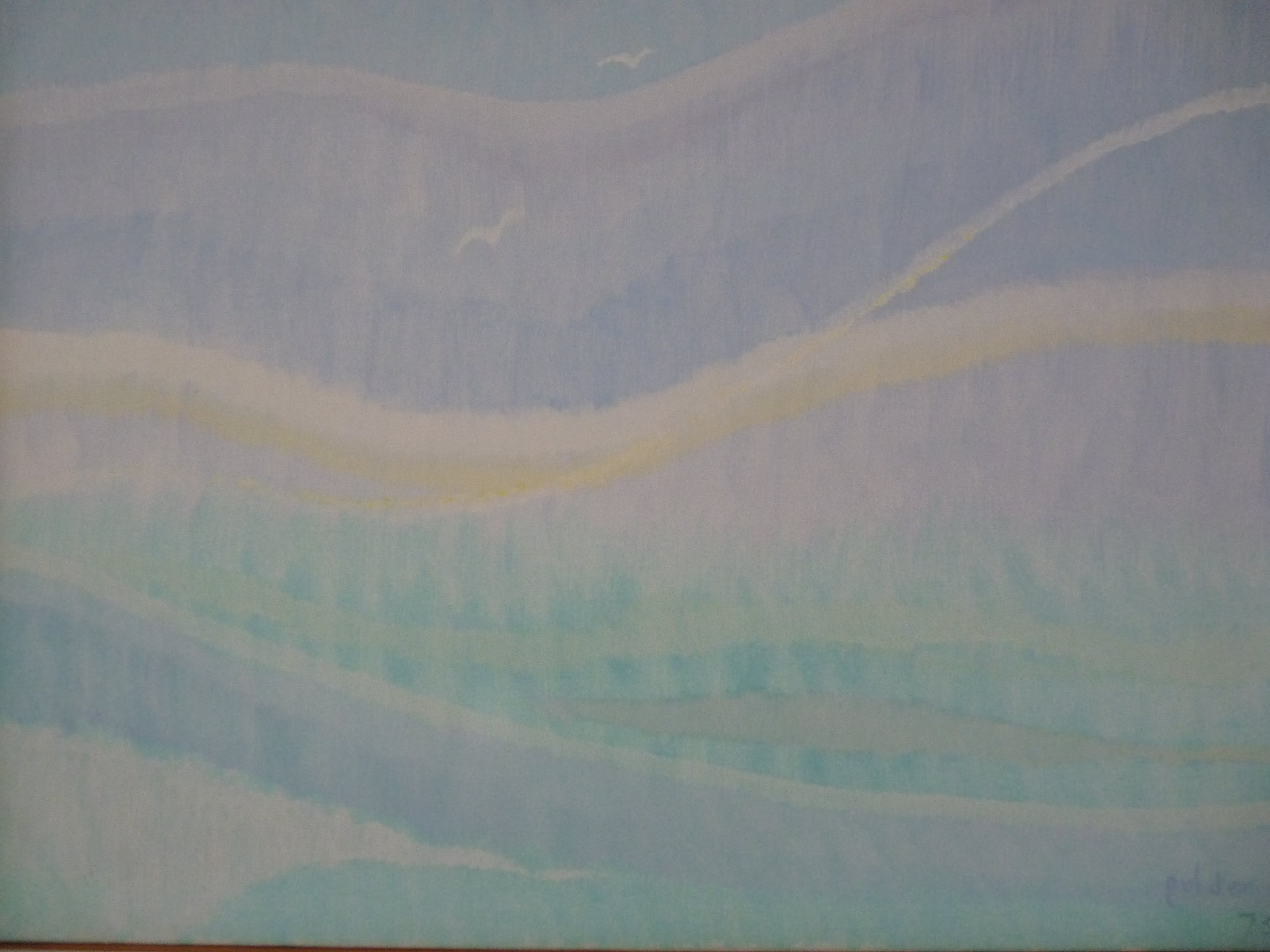 Schilderij in pastelkleuren met als onderwerp een landschap met vogels. Werk is uit 1973.
