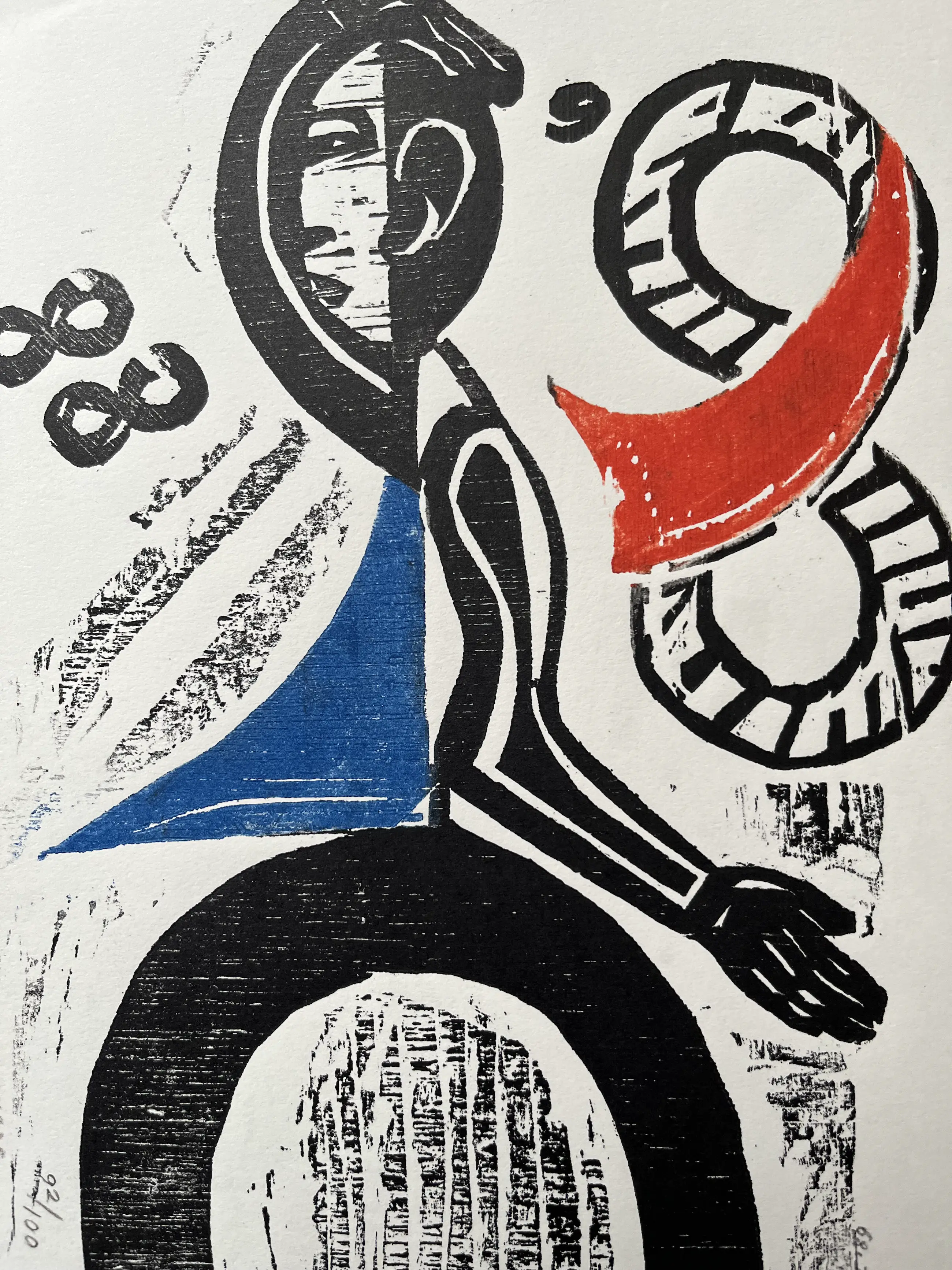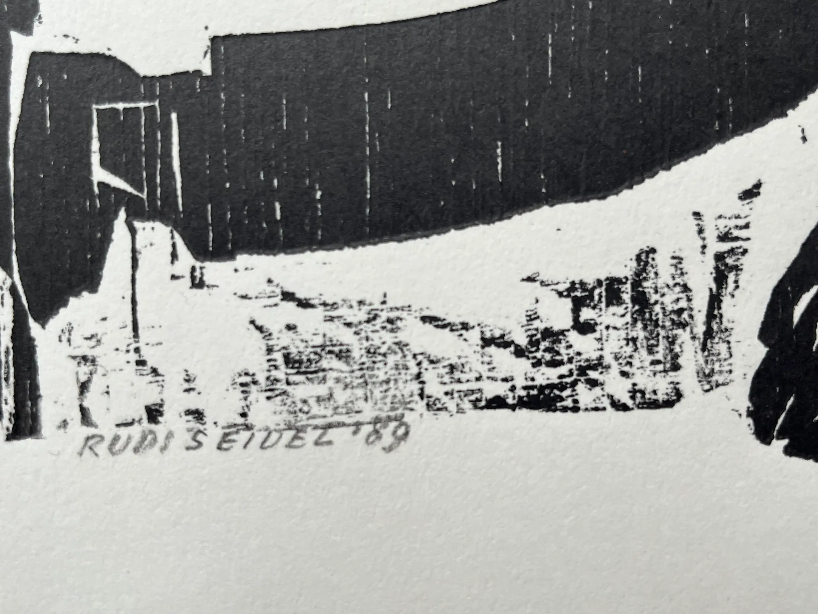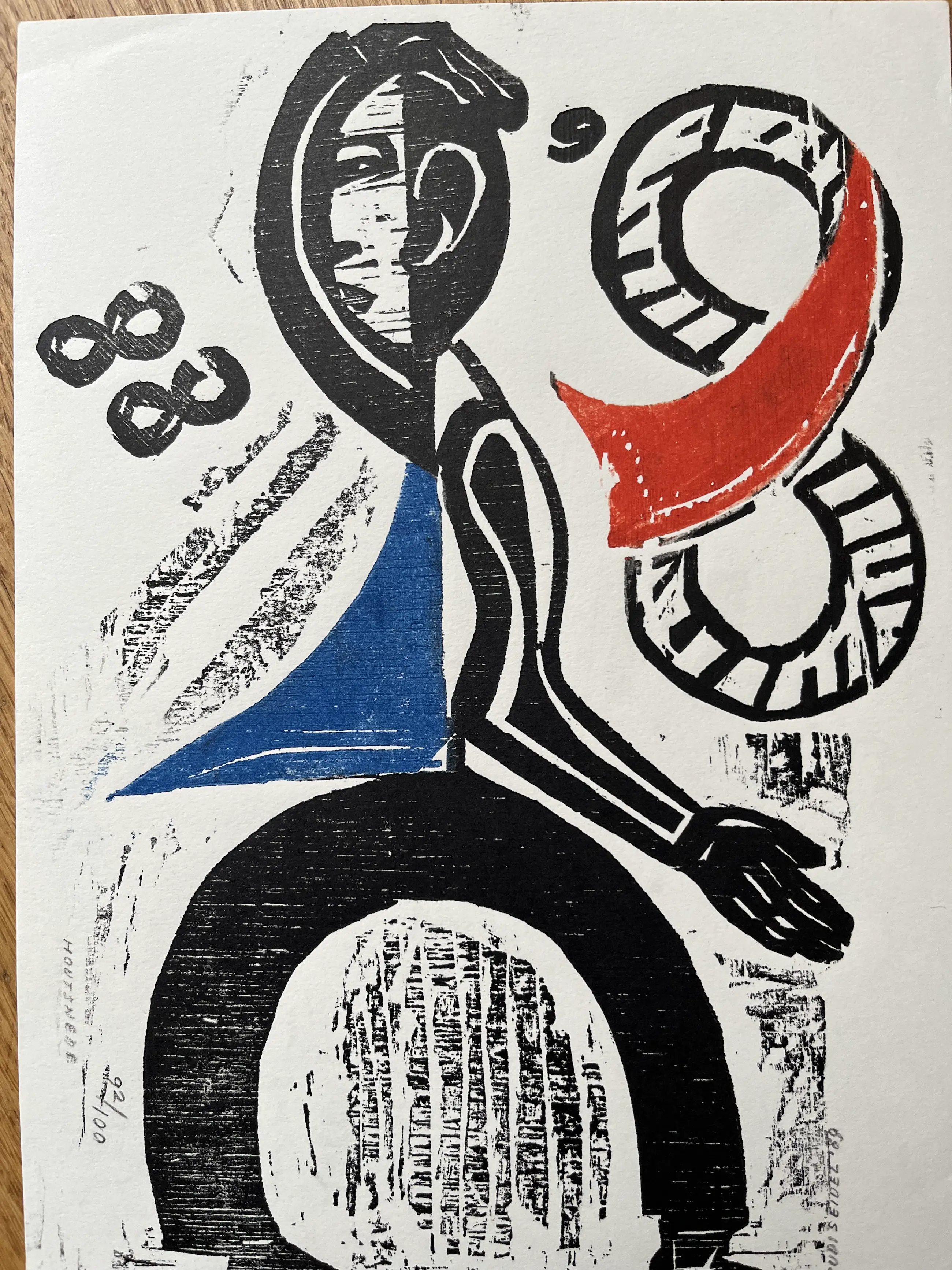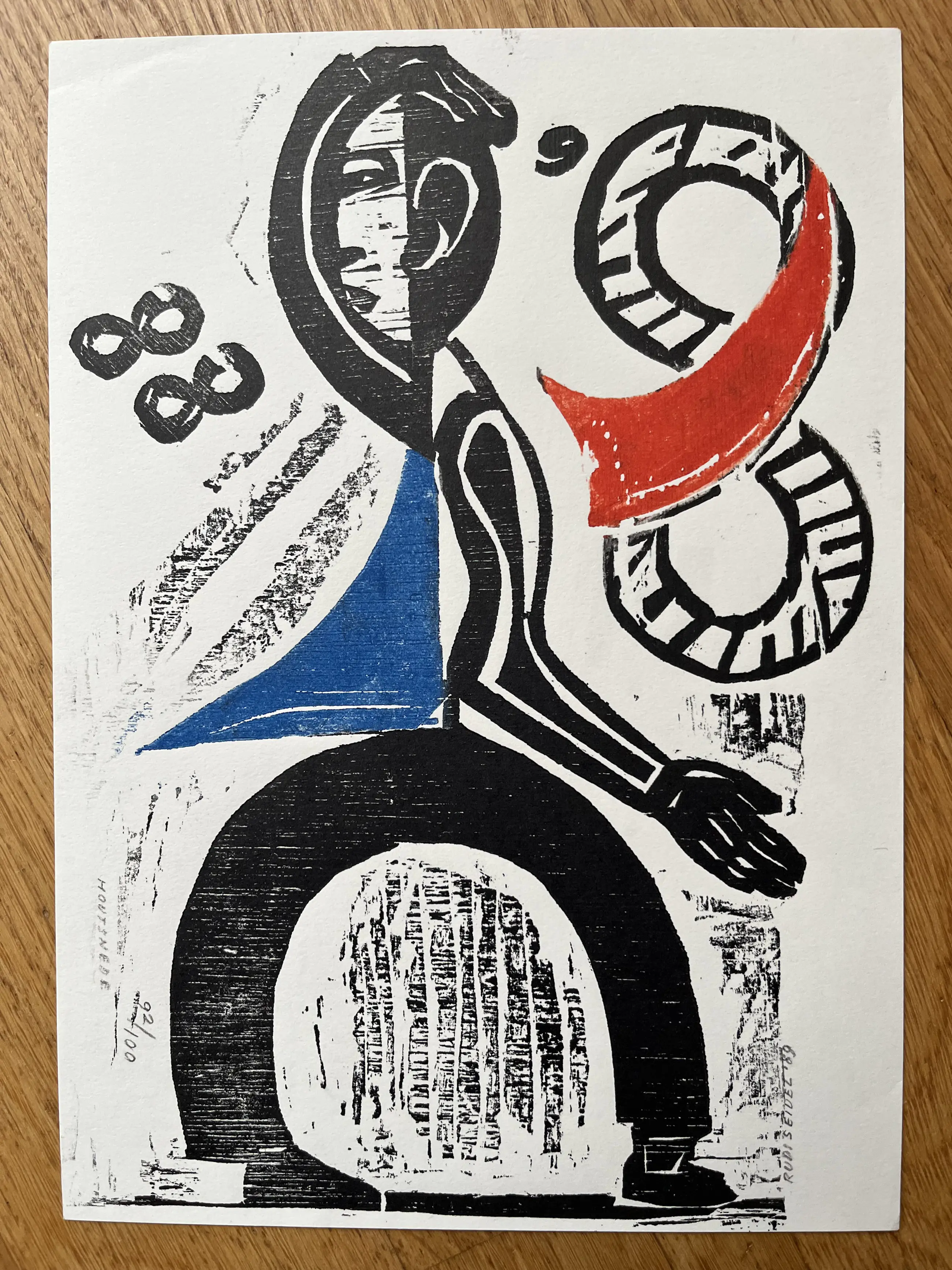 Houtsnede uit 1989. Oplage 92/100. Afmeting 29,5 x 21 cm. In blad zit een vouwtje rechtsboven.