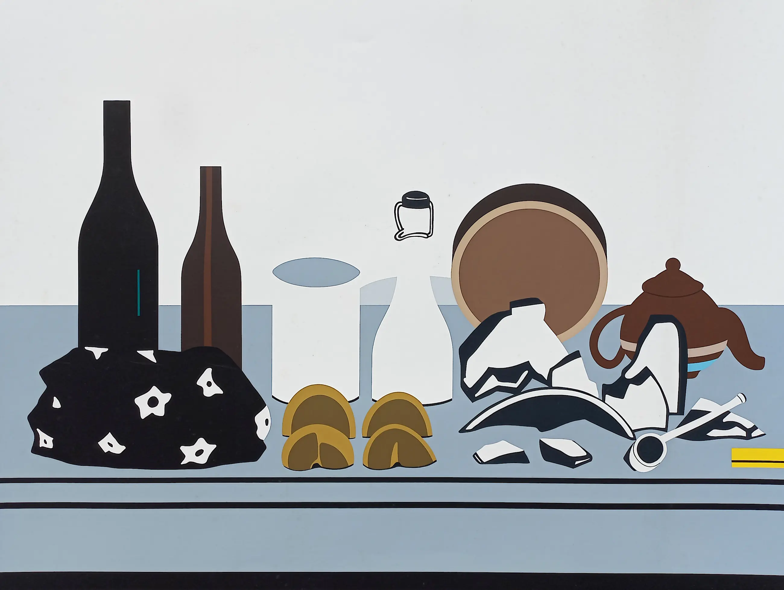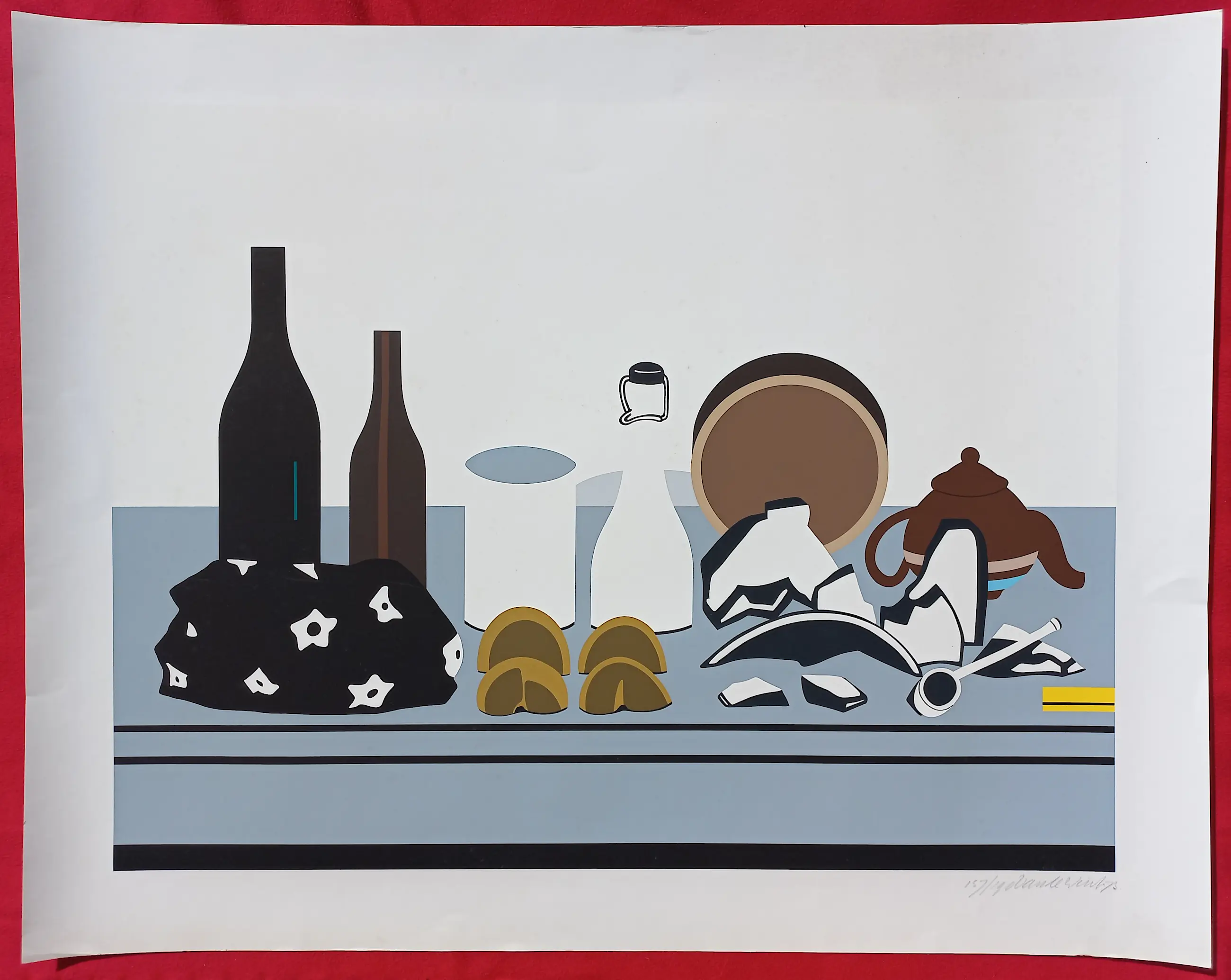 Bekend werk van Rudi van de Wint, uitgegeven door Prent190. Zeefdruk op glad papier, met potlood gesigneerd, gedateerd (‘73) en genummerd (157/190). In redelijk goede conditie.