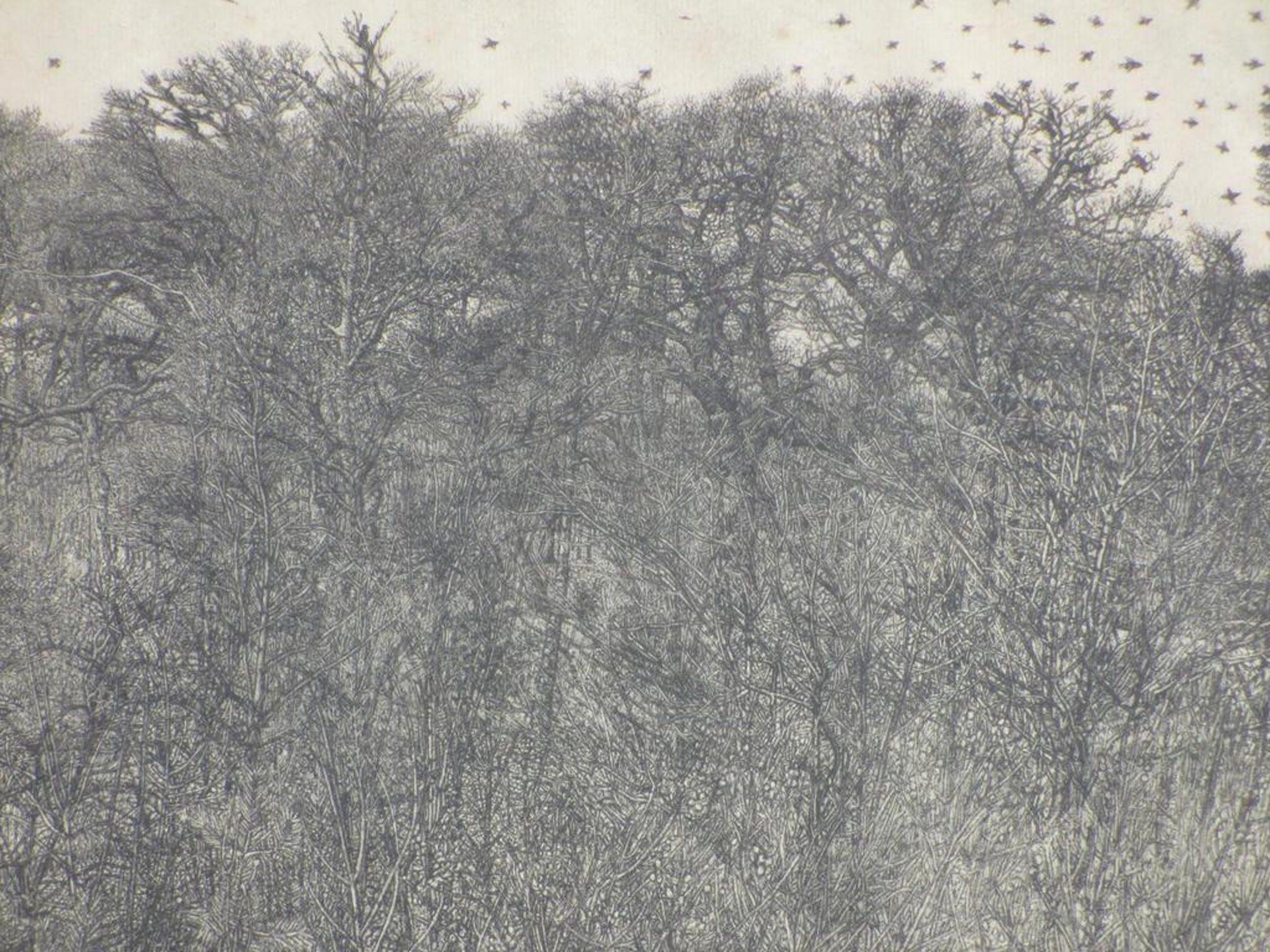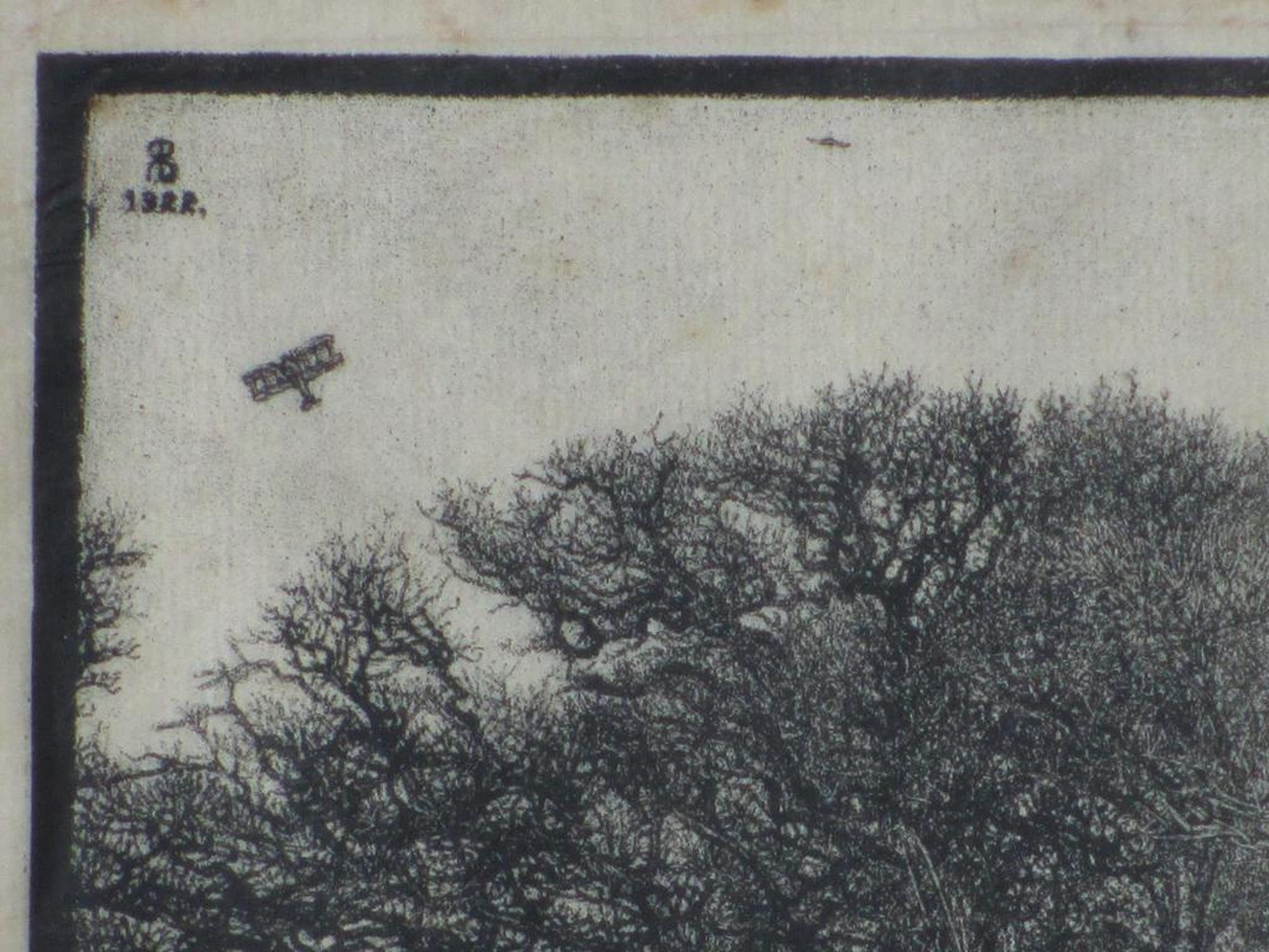 Voorstelling van een bosgezicht met vogels en een vliegtuig