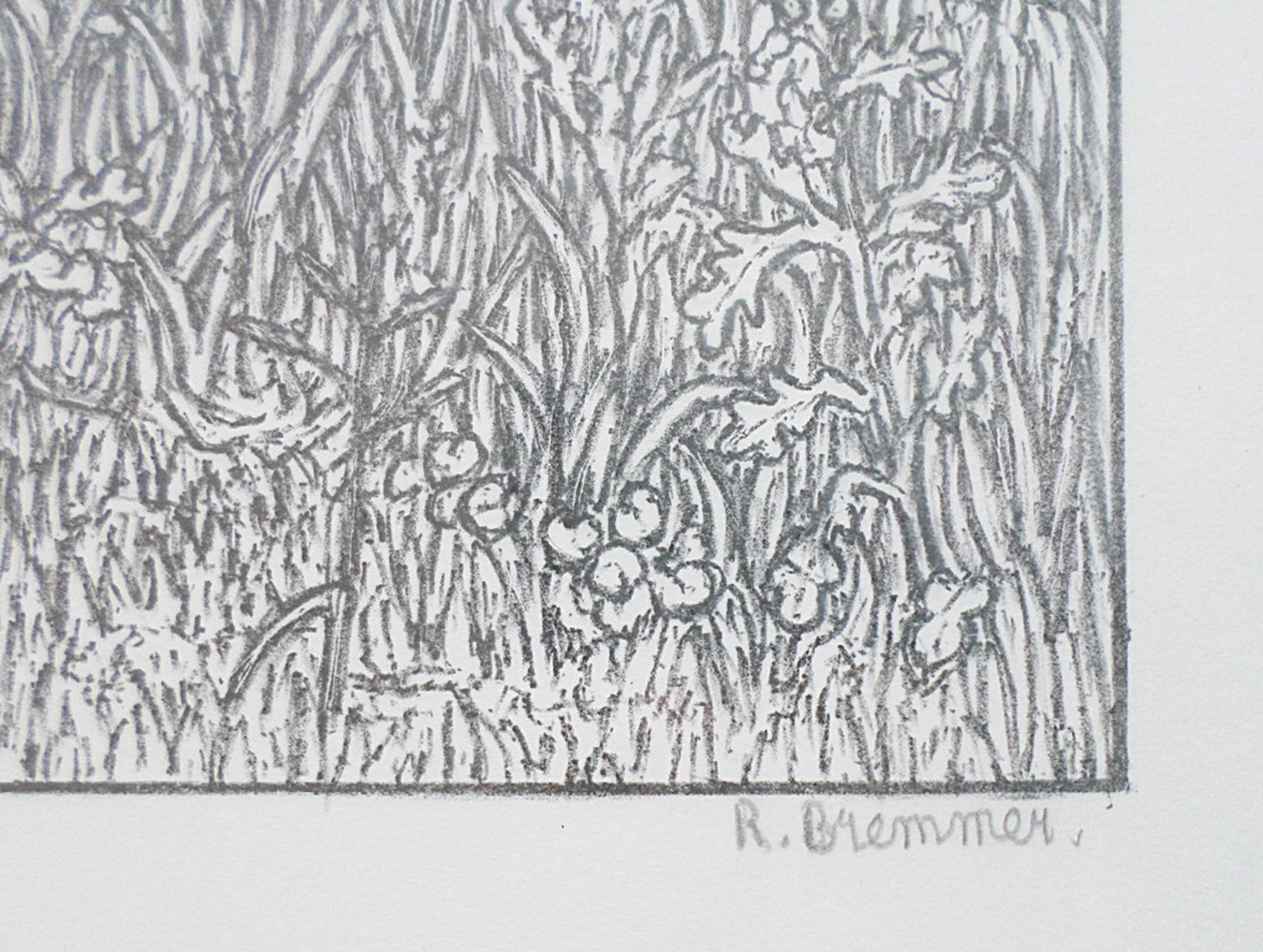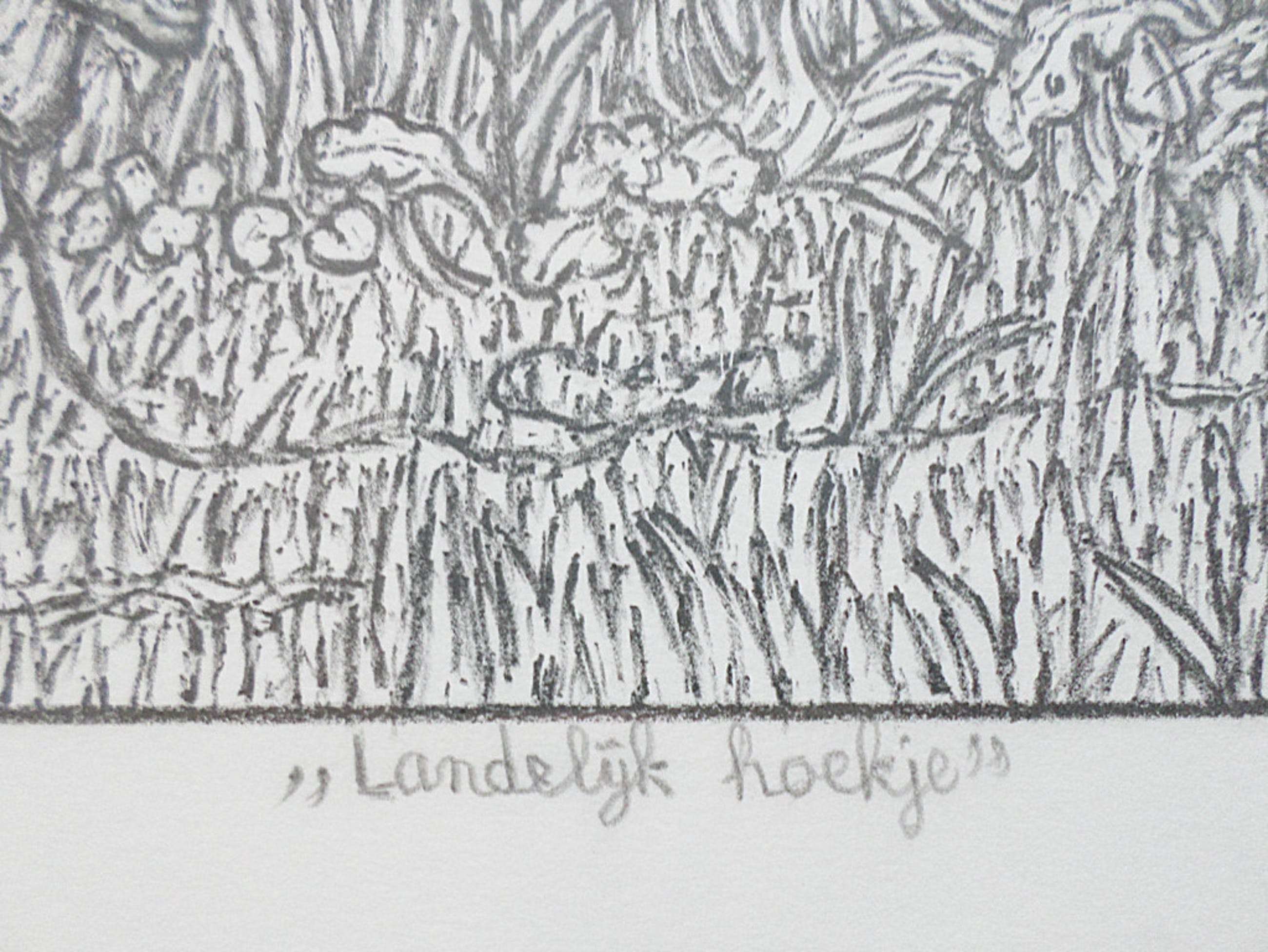 Mooie litho van Rudolf Bremmer uit 1977 getiteld “Landelijk hoekje”. In strakke houten lijst, achter glas. Met potlood gesigneerd, getiteld en genummerd (37/40). Initialen en datering ook in de druk.