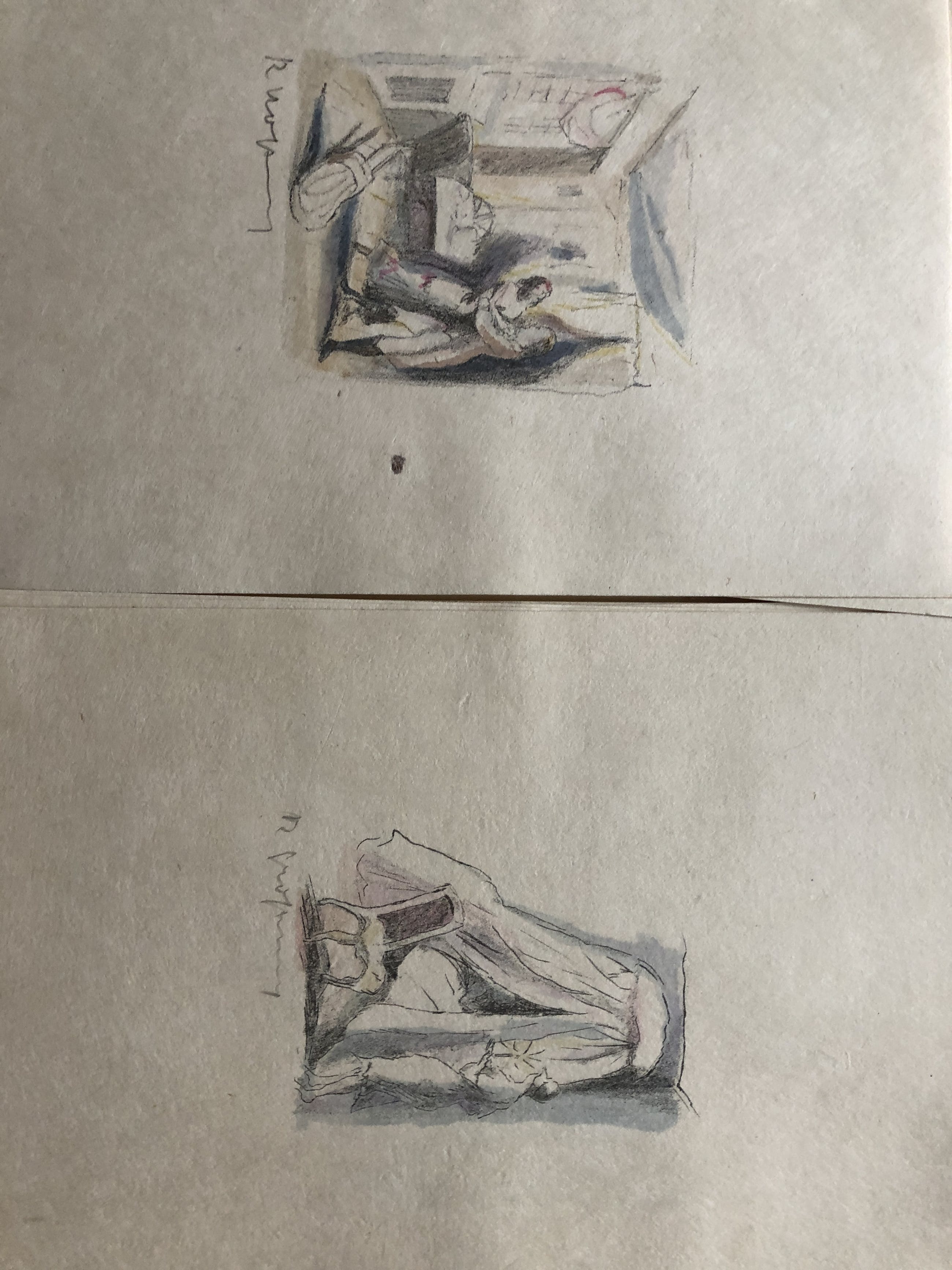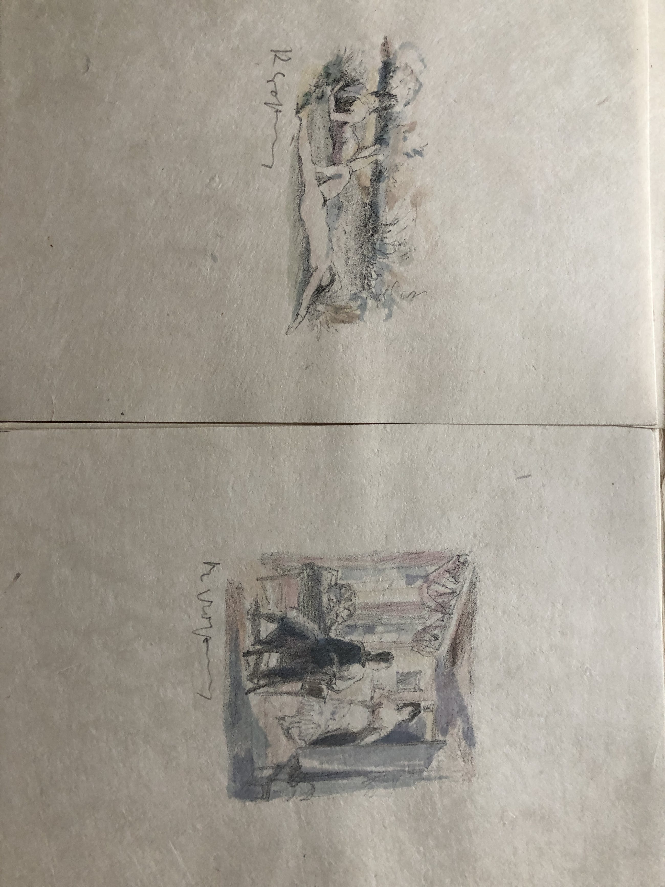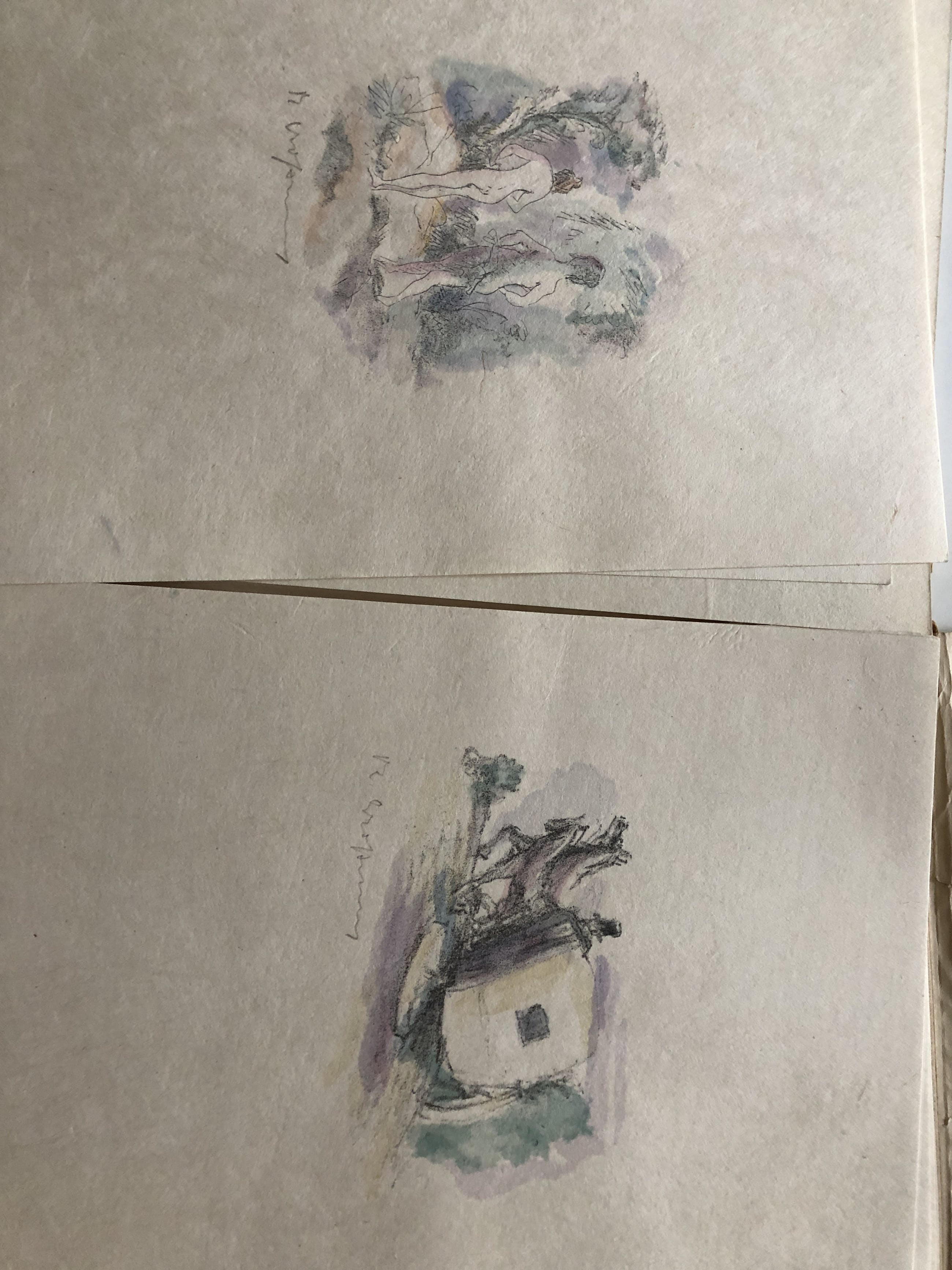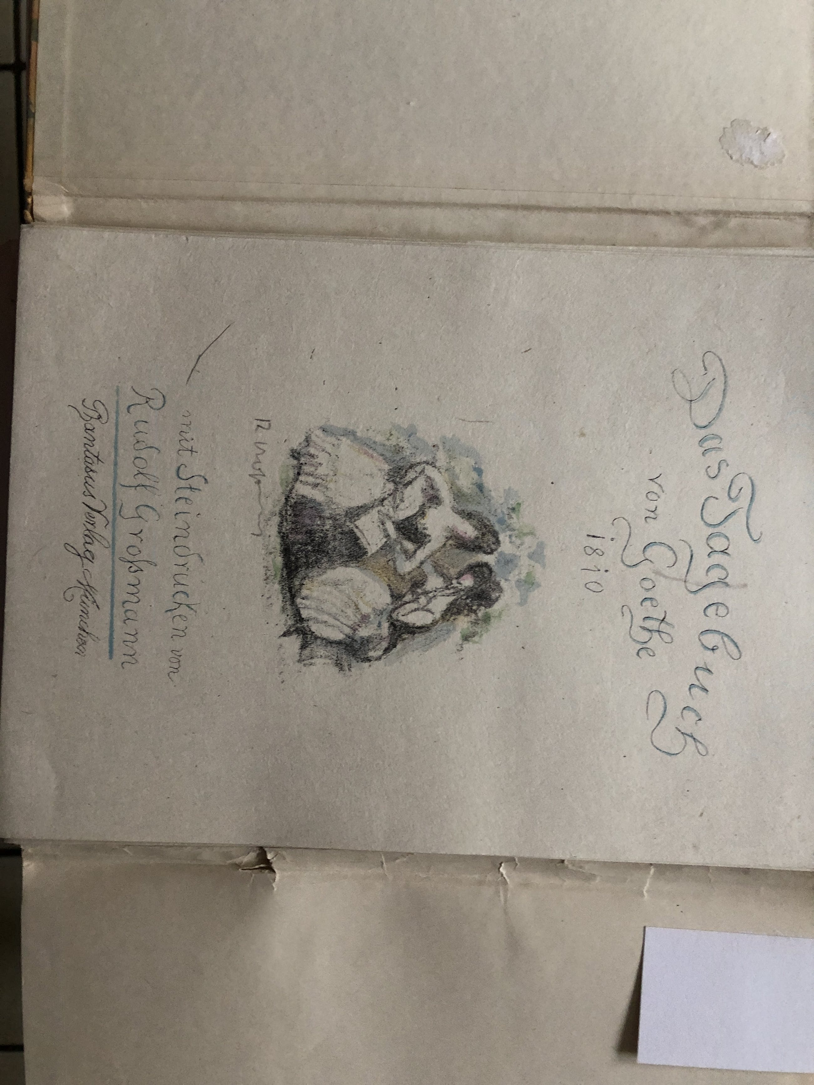 Mappe mit 24 Steindrucken (inclusive Titelblatt)Phantasus Verlag München. Das Tagebuch von Goethe 1810.Jedes Blatt signiert und eine der Lithodarstellungen liegt als kleine Zeichnung in der Mappe bei. Die Zeichnung ist leider unsachgemäß an den Ecken auf Untergrundkarton aufgeklatscht mit Kleber.Singuläre Ausgabe in dieser Art.Mappe defekt!! Blätter an den Rändern z. T. durch die Mappe etwas altersspurig. Vorne in der Mappe Besitzerklebezettel. Aus dem Besitz Haberstock Berlin.Blattgröße jeweils 18,2 mal 24,3 cm.Privatverkauf.