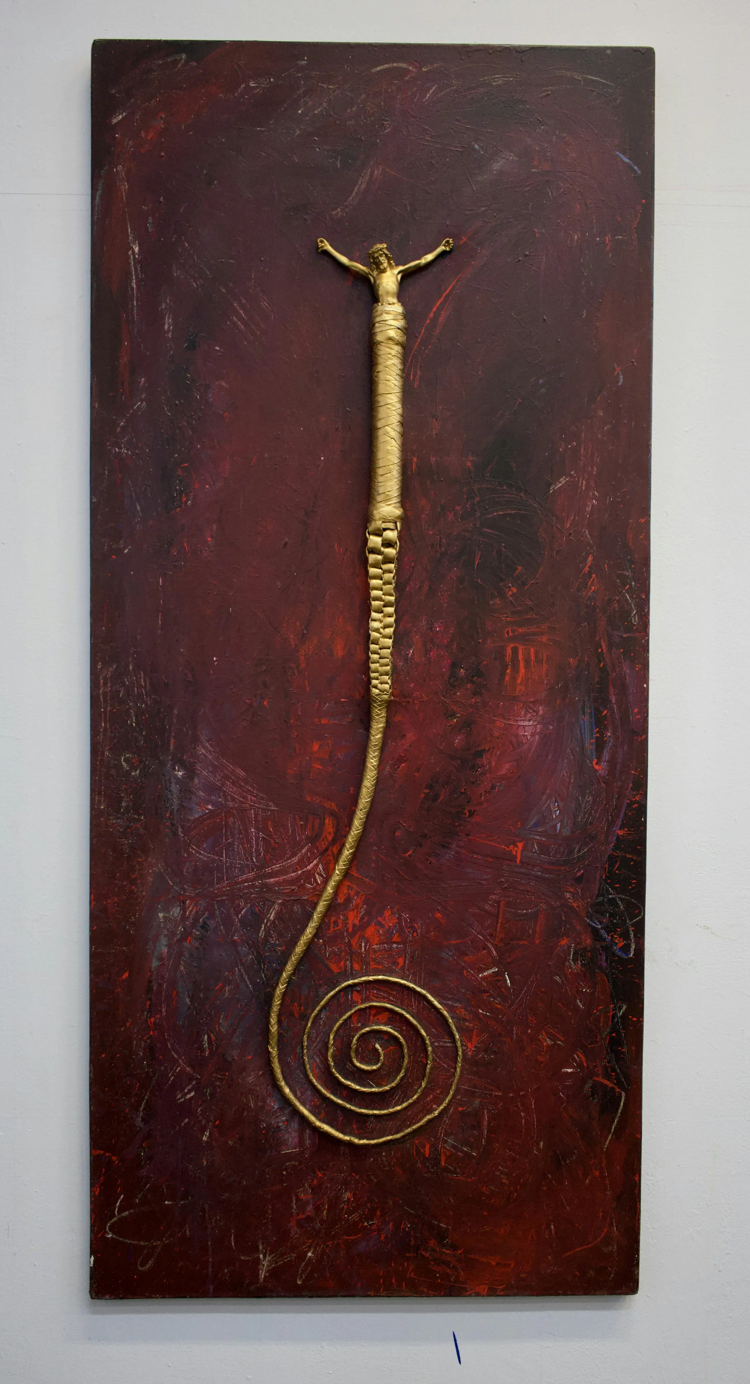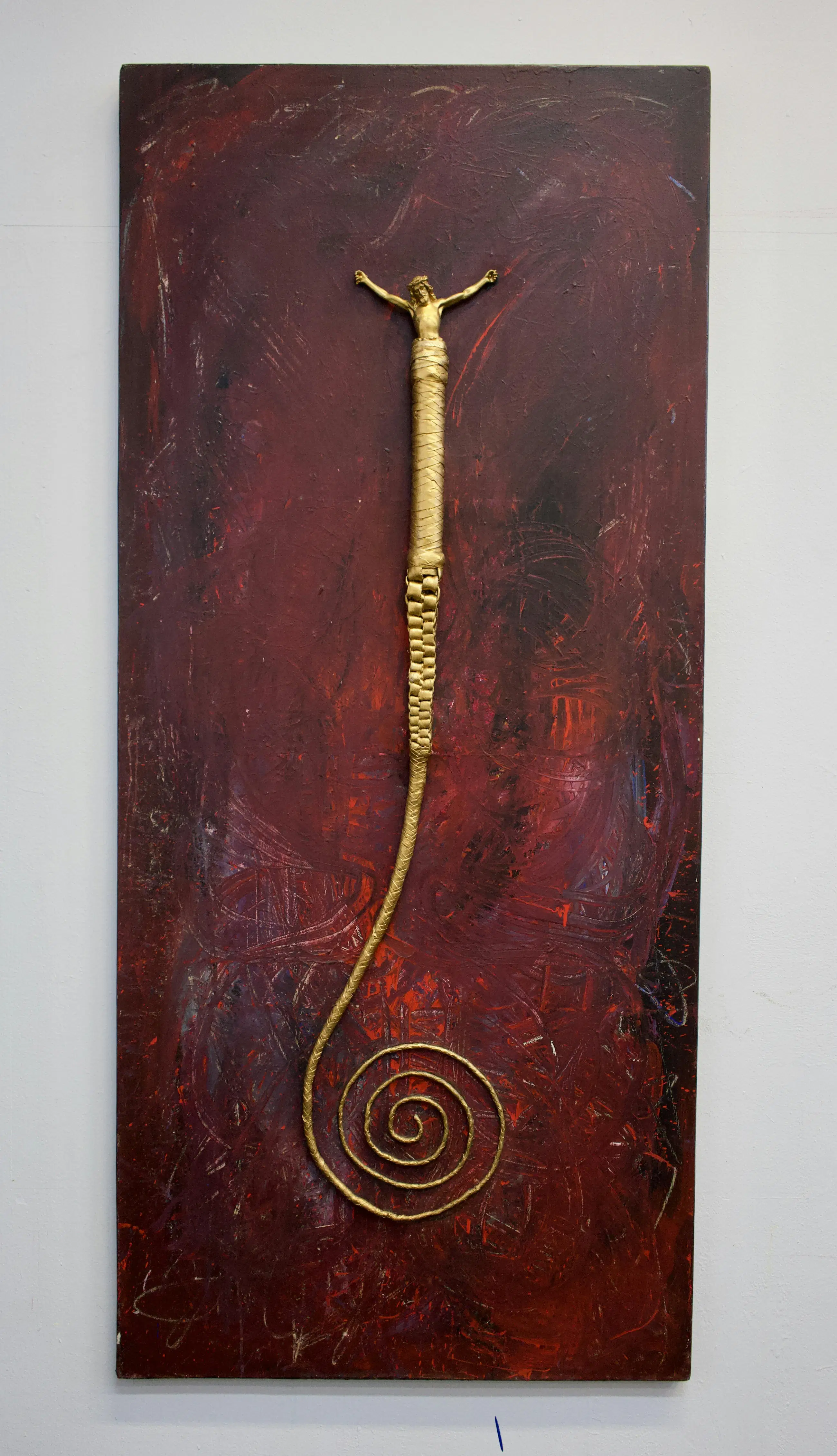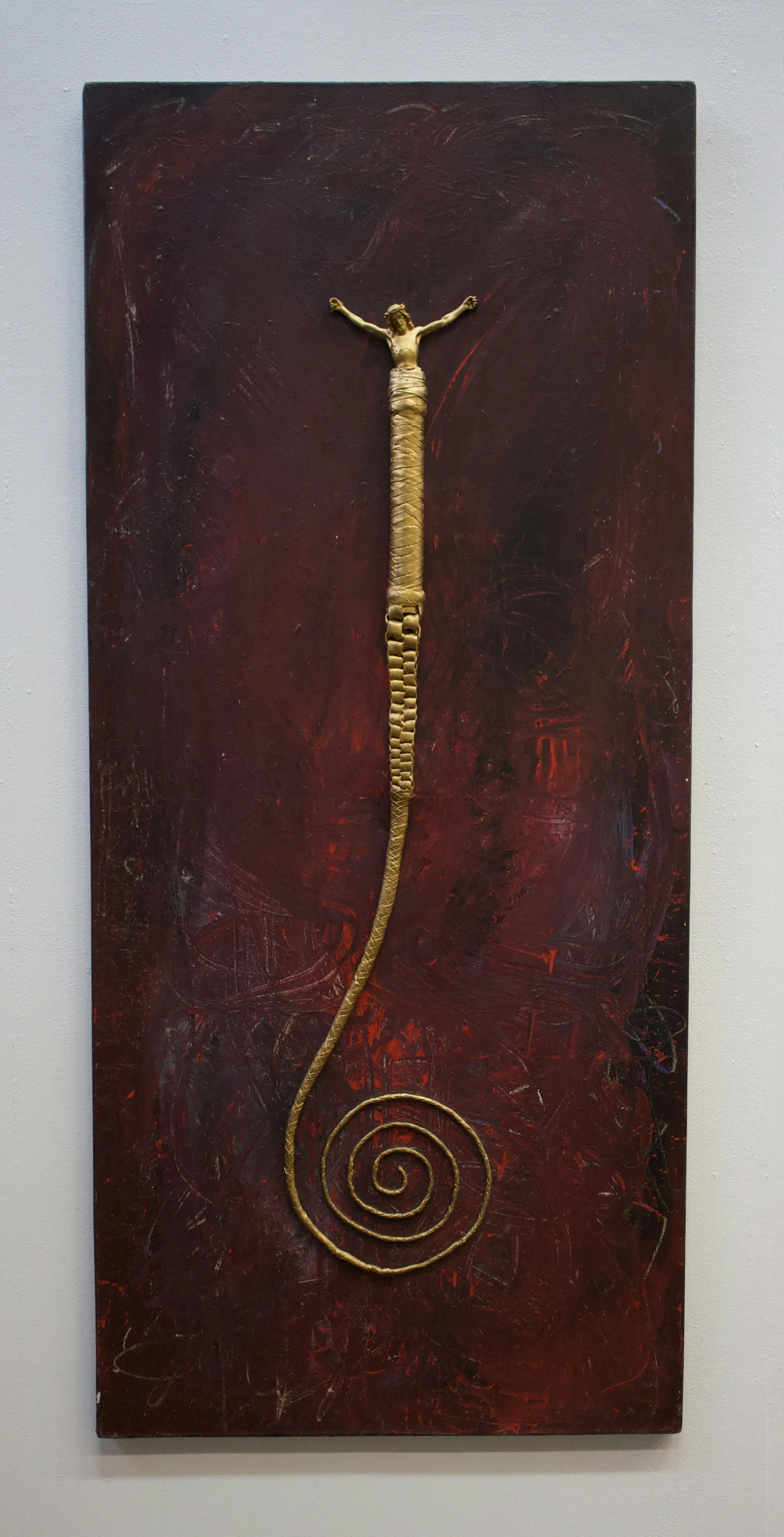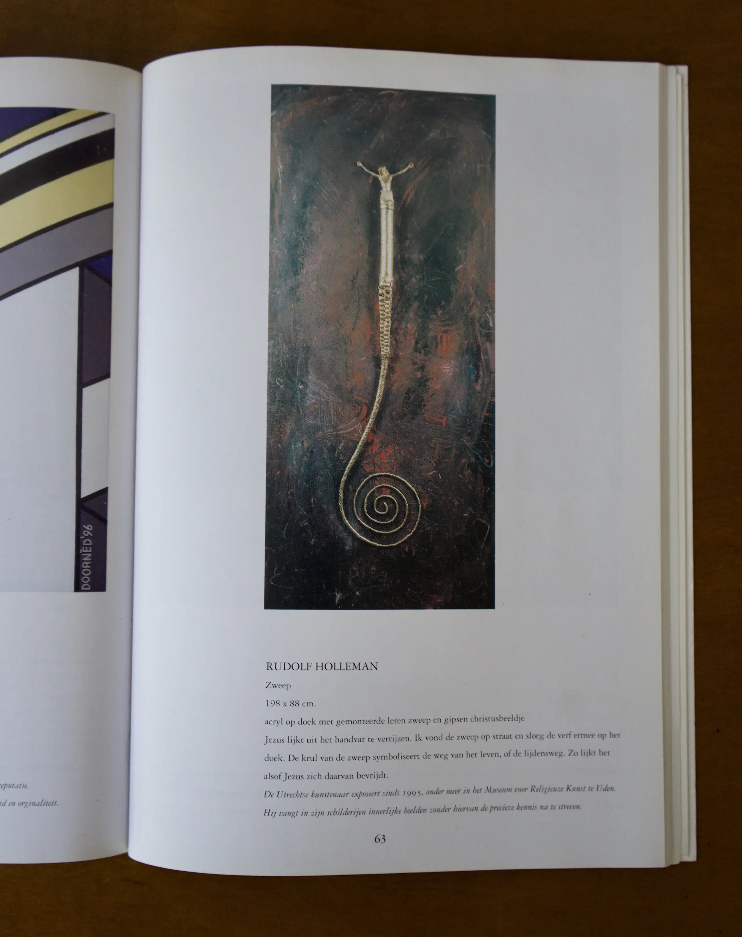 Acryl op doek met gemonteerde leren zweep en gipsen Christus beeldje Rudolf Holleman vond de zweep op straat en sloeg de verf ermee op het doek. De krul/spiraal van de zweep lijkt de weg van het leven en lijdensweg te symboliseren. Jezus lijkt uit het handvat te verrijzen.