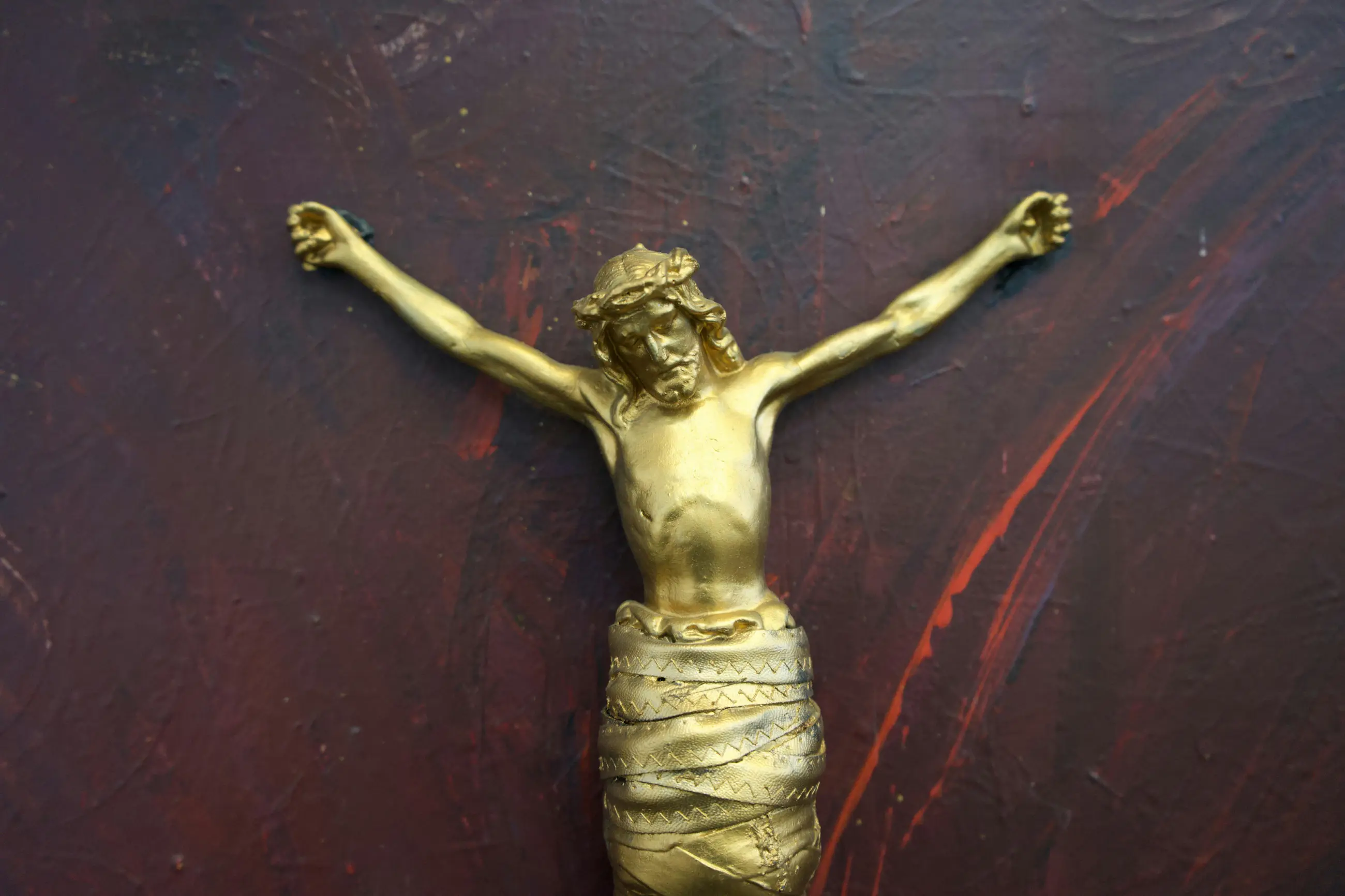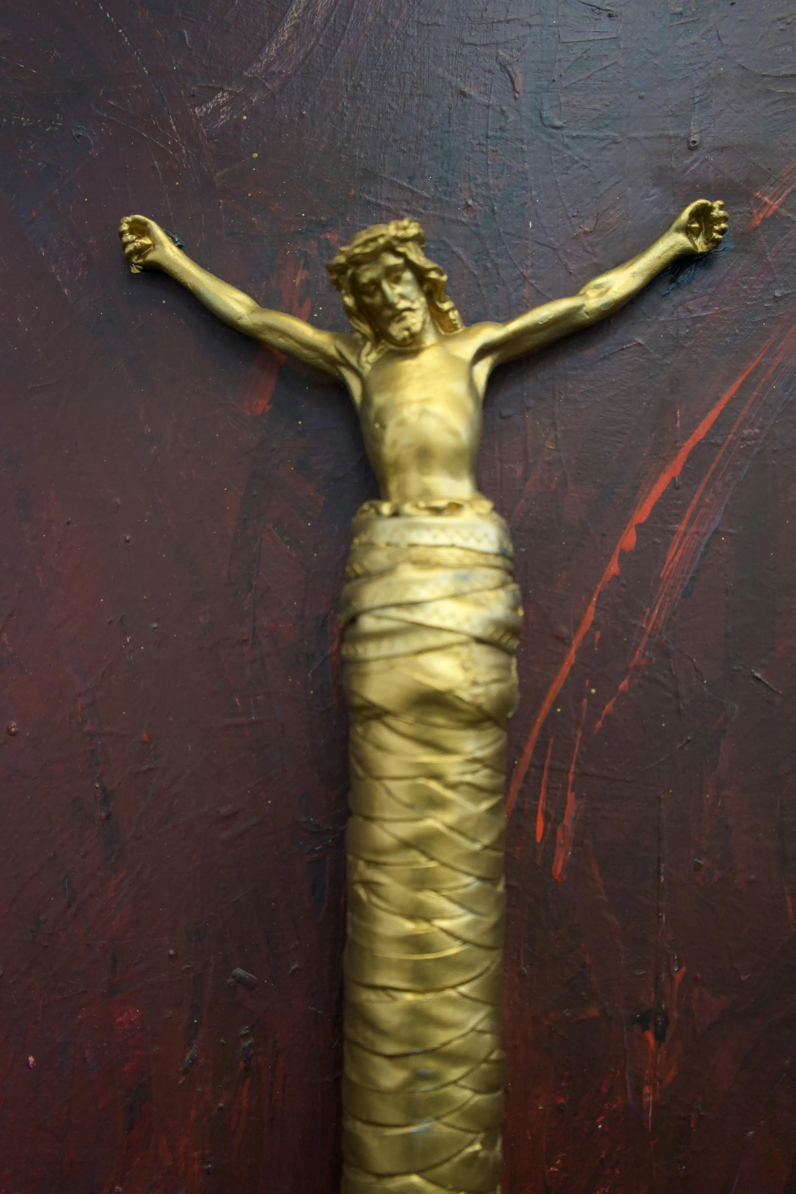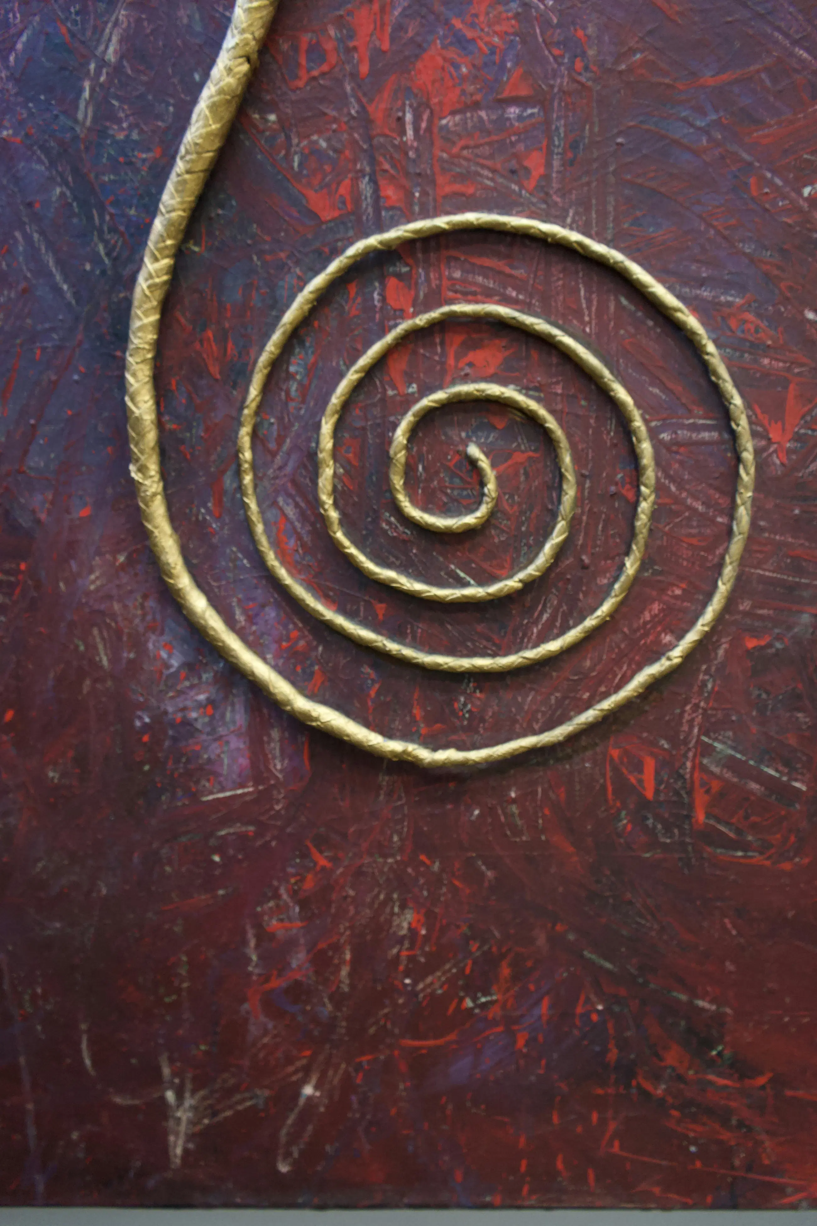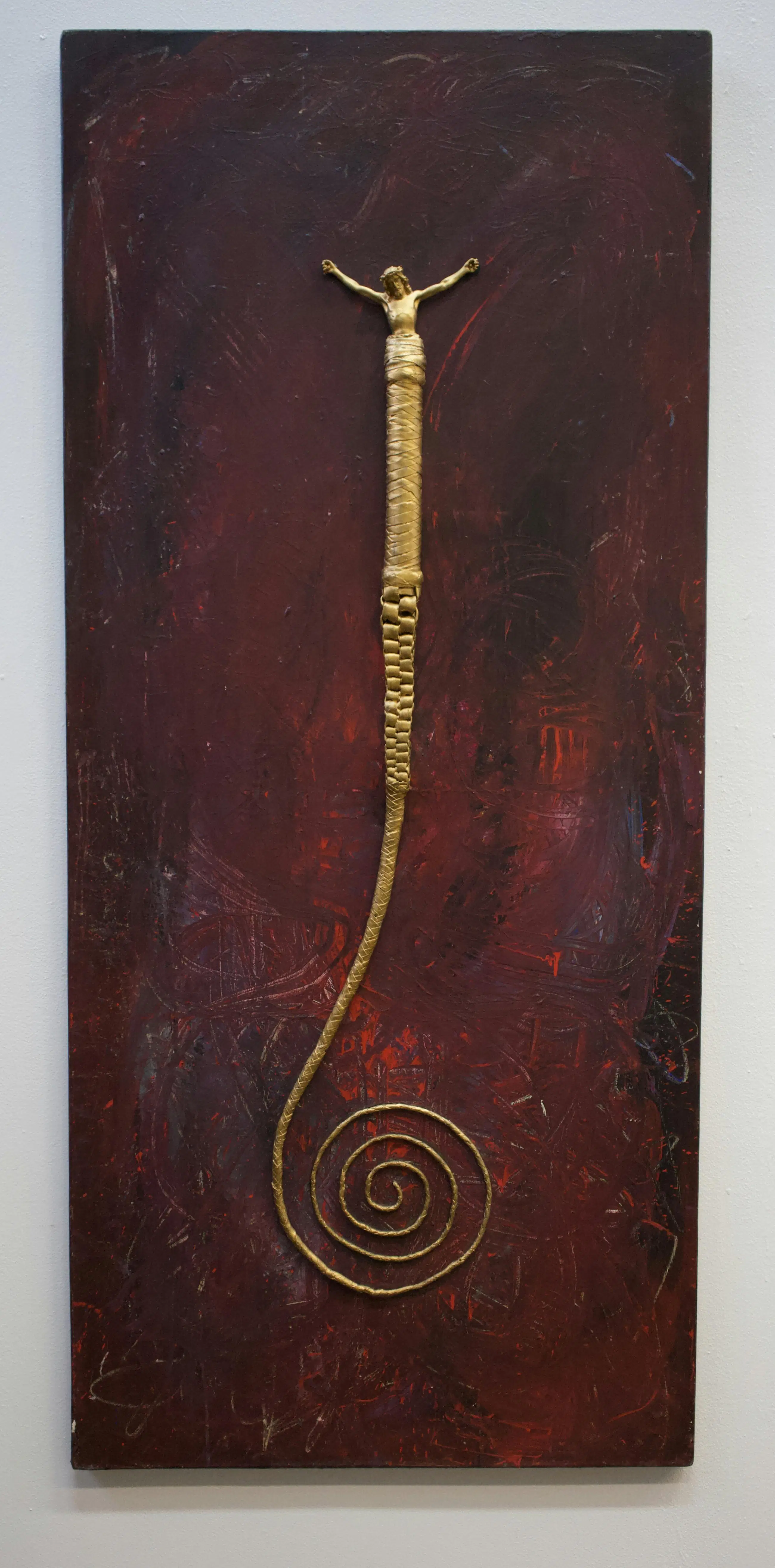 Acryl op doek met gemonteerde leren zweep en gipsen Christus beeldje Rudolf Holleman vond de zweep op straat en sloeg de verf ermee op het doek. De krul/spiraal van de zweep lijkt de weg van het leven en lijdensweg te symboliseren. Jezus lijkt uit het handvat te verrijzen.