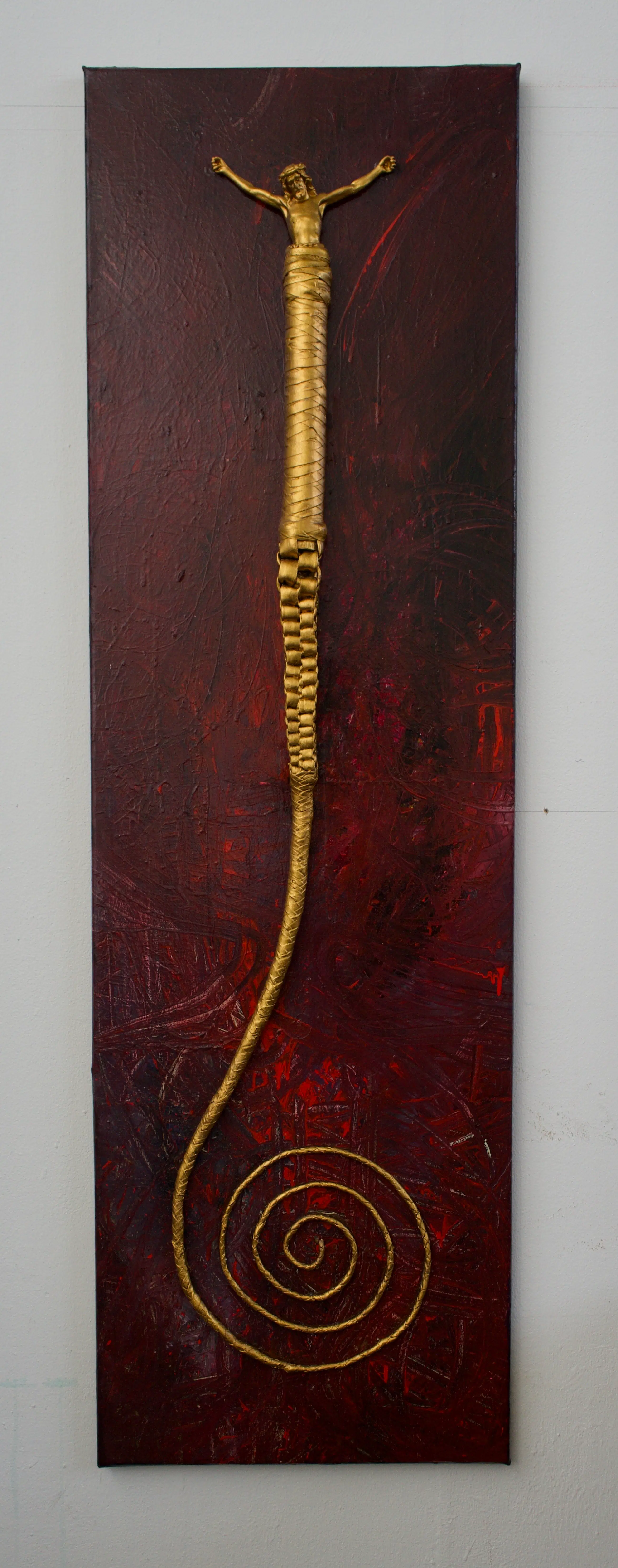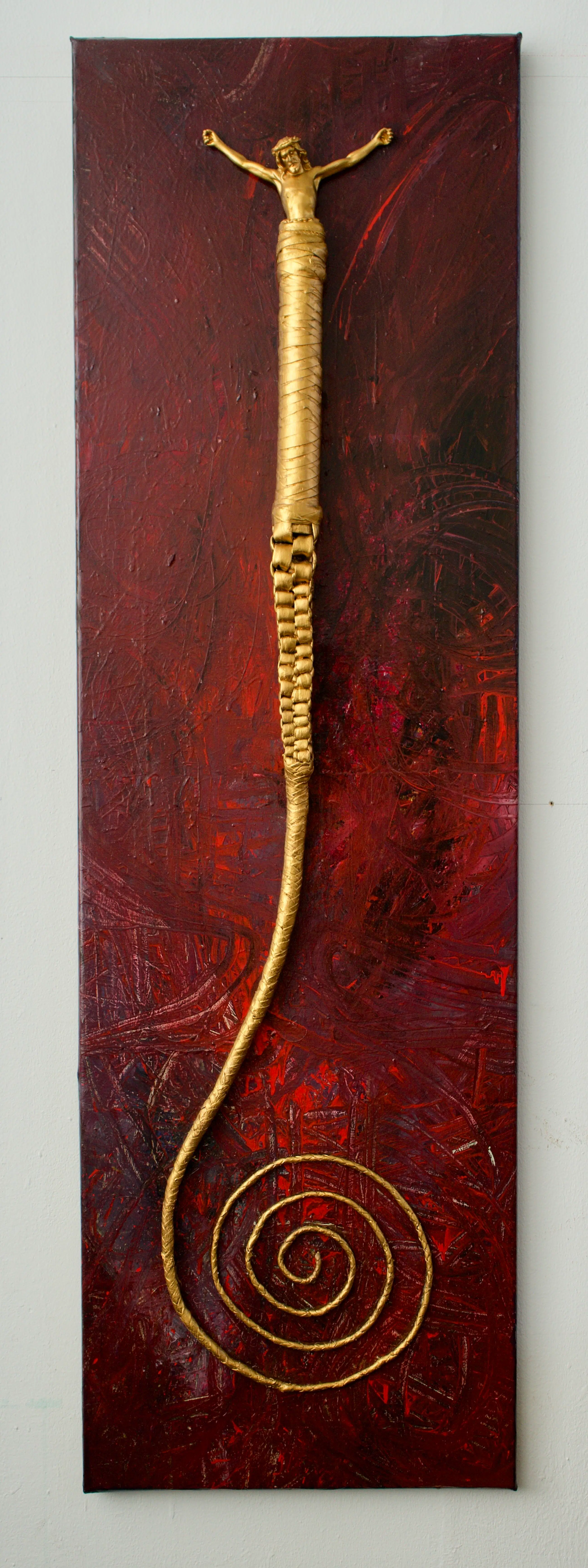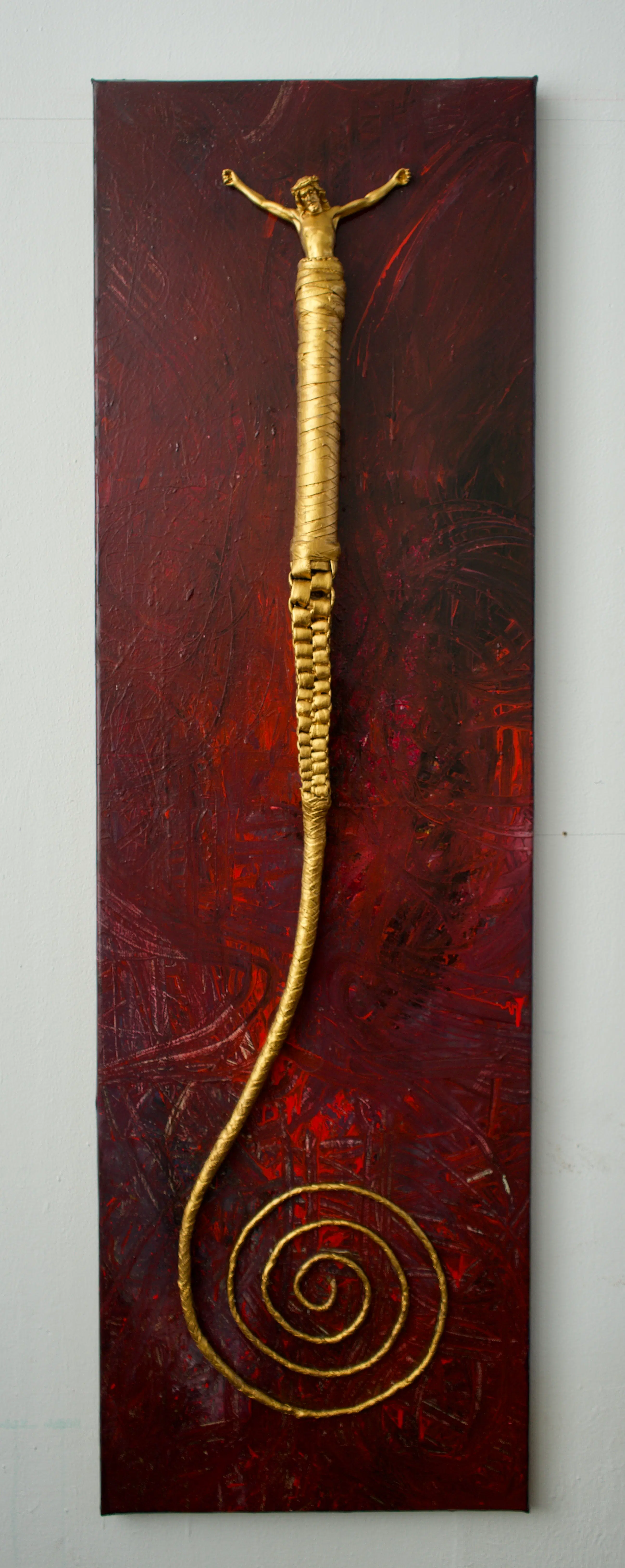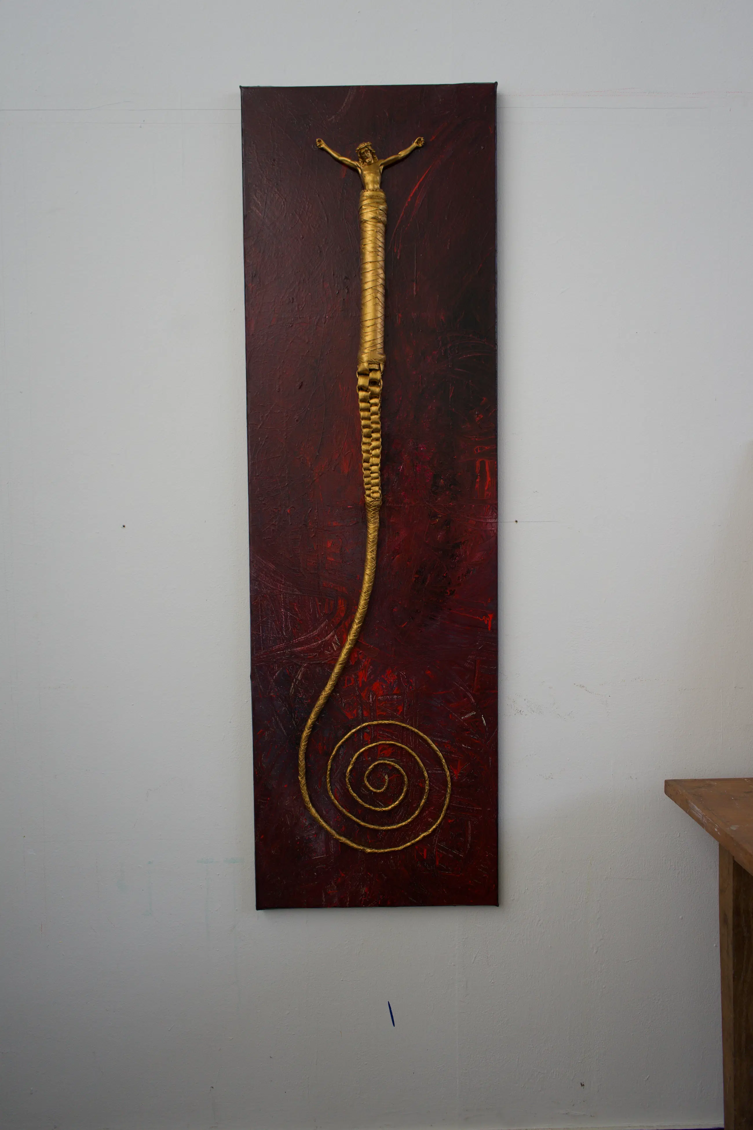 Acryl op doek met gemonteerde leren zweep en gipsen Christus beeldje Rudolf Holleman vond de zweep op straat en sloeg de verf ermee op het doek. De krul/spiraal van de zweep vormt de weg van het leven en lijdensweg. Jezus verrijst uit de zweep. Rudolf Holleman exposeerde, met zijn Hedendaagse Religieuze Kunstwerken, onder meer in het Museum voor Religieuze Kunst te Uden en deed mee aan de Exposities: 1 ‚Eeuwig Kwetsbaar’ 1998 (Hedendaagse Kunst en Religie) deze expositie reisde door de Benelux en Duitsland 2. ‚Het Jezus Mysterie’ 1999 ( Kunstenaars en visies over de man die tweeduizend jaar de westerse beschaving een gezicht gaf) 3 ‚Verspijkerd en verzaagd’ 2017 ( Hergebruik van heiligenbeelden in de Nederlandse beeldhouwkunst)