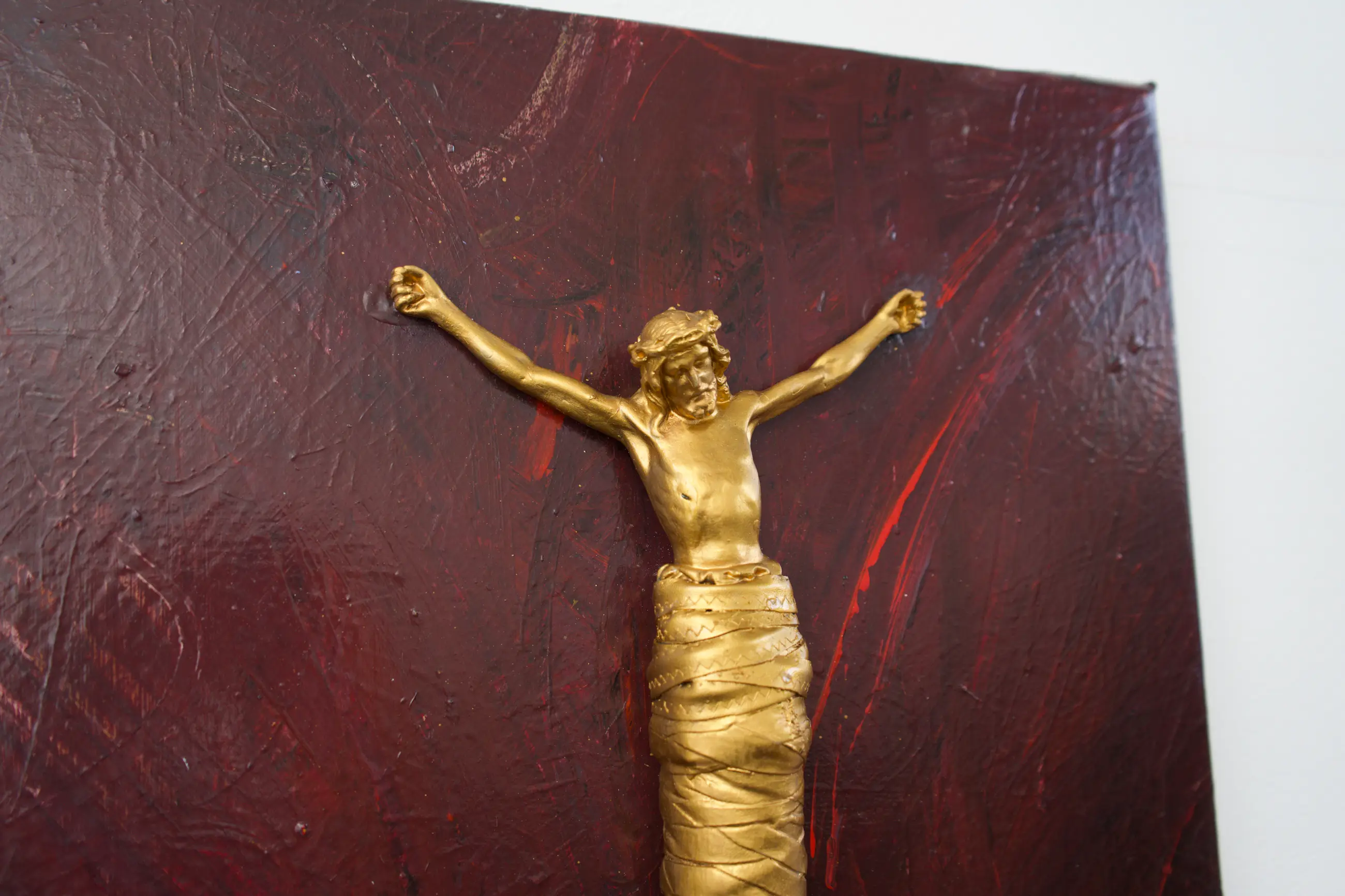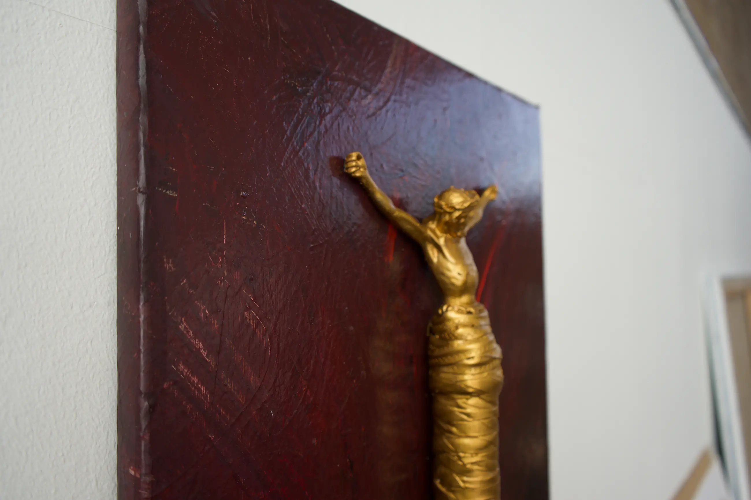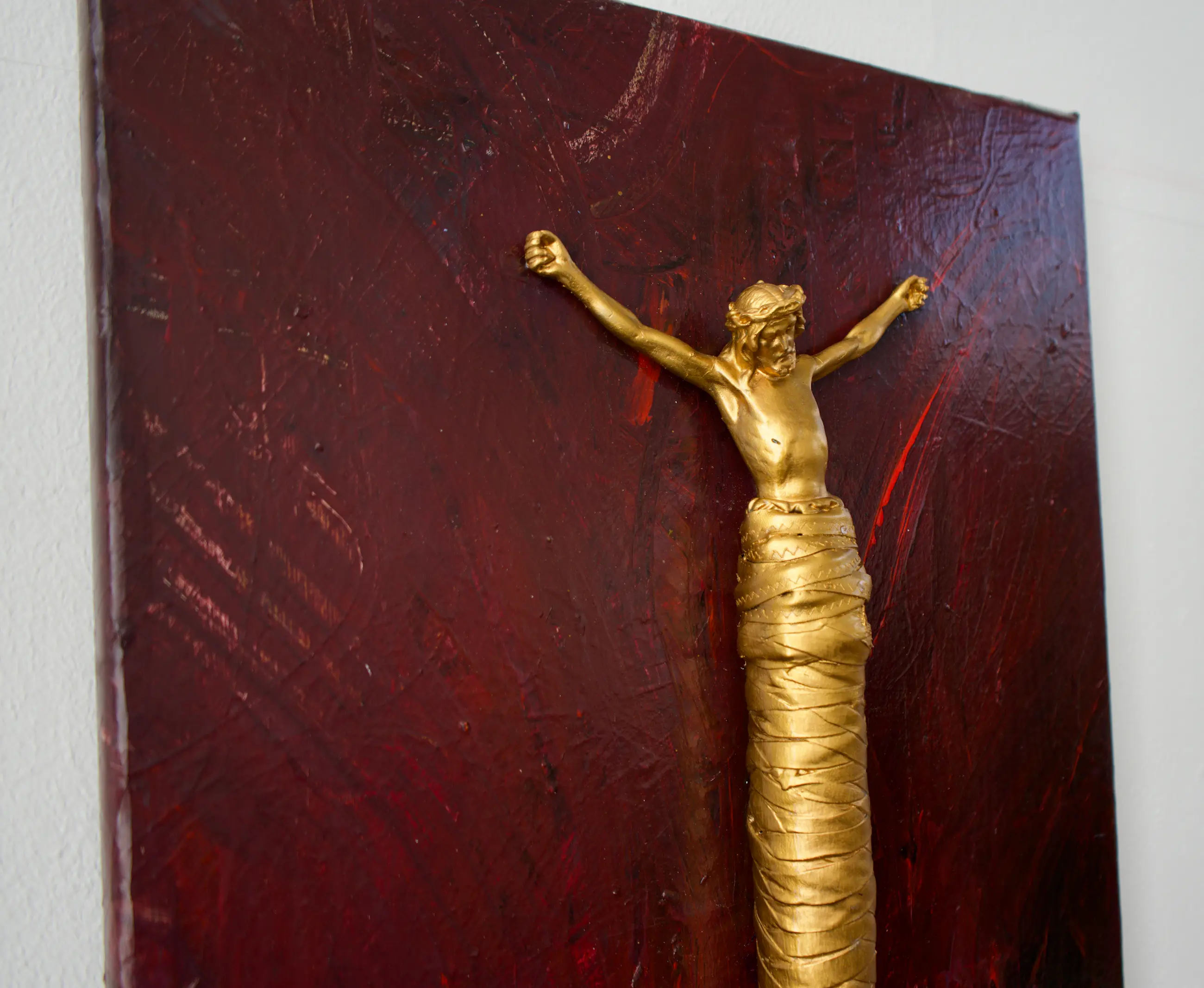 Acryl op doek met gemonteerde leren zweep en gipsen Christus beeldje Rudolf Holleman vond de zweep op straat en sloeg de verf ermee op het doek. De krul/spiraal van de zweep vormt de weg van het leven en lijdensweg. Jezus verrijst uit de zweep. Rudolf Holleman exposeerde, met zijn Hedendaagse Religieuze Kunstwerken, onder meer in het Museum voor Religieuze Kunst te Uden en deed mee aan de Exposities: 1 ‚Eeuwig Kwetsbaar’ 1998 (Hedendaagse Kunst en Religie) deze expositie reisde door de Benelux en Duitsland 2. ‚Het Jezus Mysterie’ 1999 ( Kunstenaars en visies over de man die tweeduizend jaar de westerse beschaving een gezicht gaf) 3 ‚Verspijkerd en verzaagd’ 2017 ( Hergebruik van heiligenbeelden in de Nederlandse beeldhouwkunst)