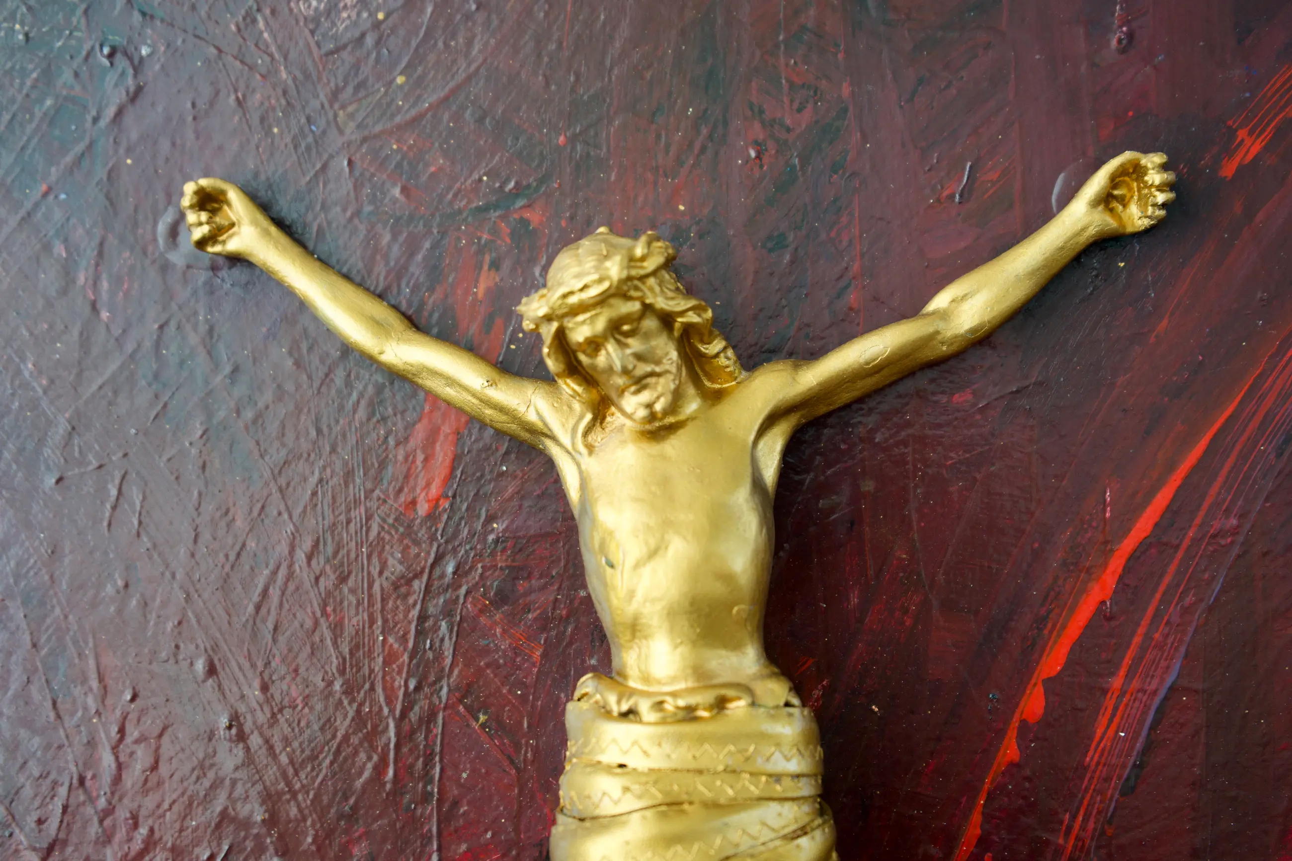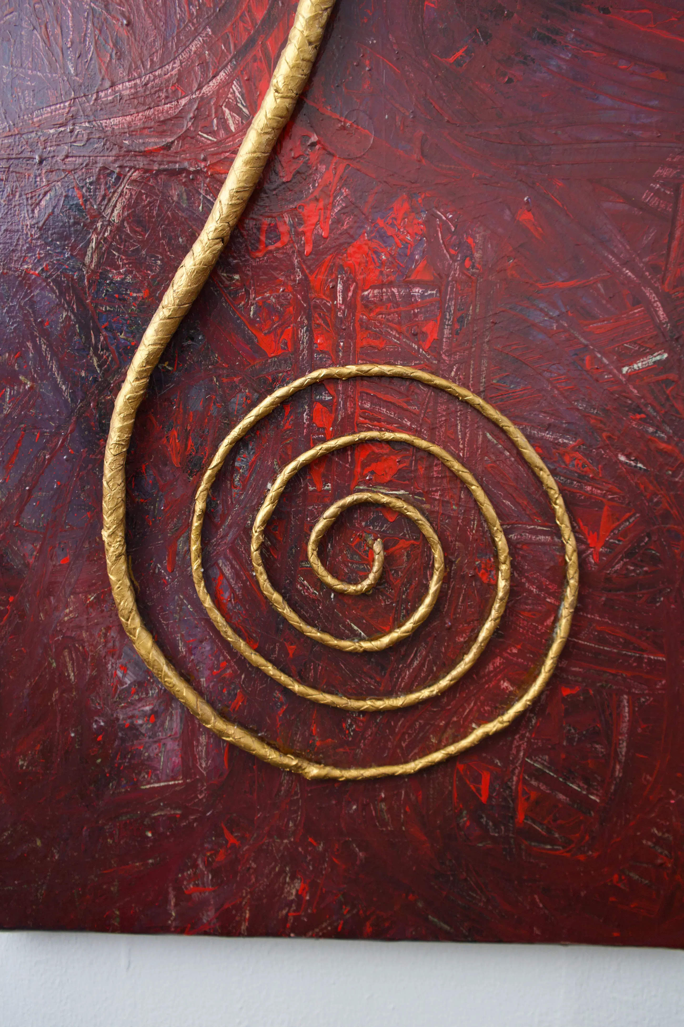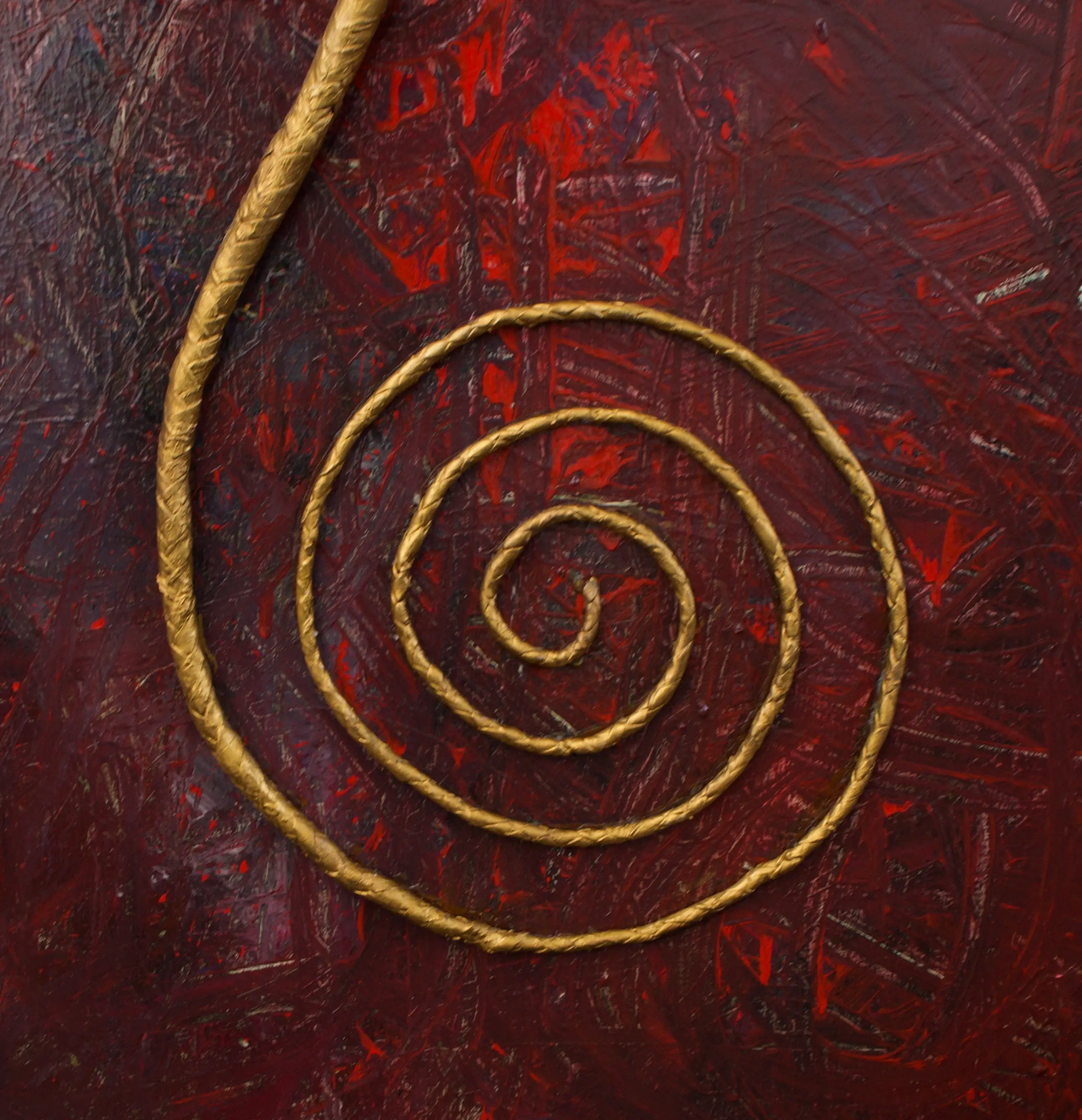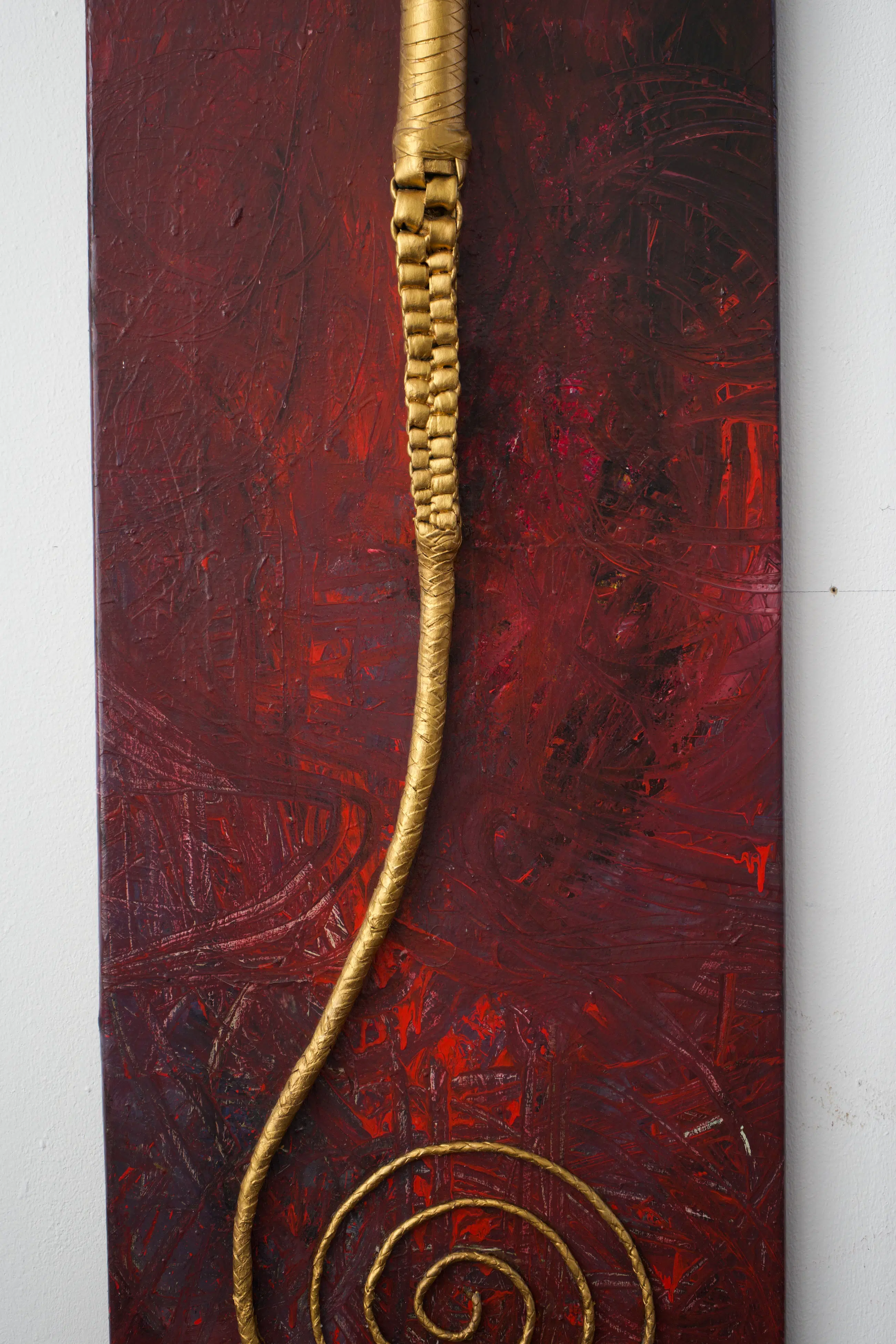 Acryl op doek met gemonteerde leren zweep en gipsen Christus beeldje Rudolf Holleman vond de zweep op straat en sloeg de verf ermee op het doek. De krul/spiraal van de zweep vormt de weg van het leven en lijdensweg. Jezus verrijst uit de zweep. Rudolf Holleman exposeerde, met zijn Hedendaagse Religieuze Kunstwerken, onder meer in het Museum voor Religieuze Kunst te Uden en deed mee aan de Exposities: 1 ‚Eeuwig Kwetsbaar’ 1998 (Hedendaagse Kunst en Religie) deze expositie reisde door de Benelux en Duitsland 2. ‚Het Jezus Mysterie’ 1999 ( Kunstenaars en visies over de man die tweeduizend jaar de westerse beschaving een gezicht gaf) 3 ‚Verspijkerd en verzaagd’ 2017 ( Hergebruik van heiligenbeelden in de Nederlandse beeldhouwkunst)